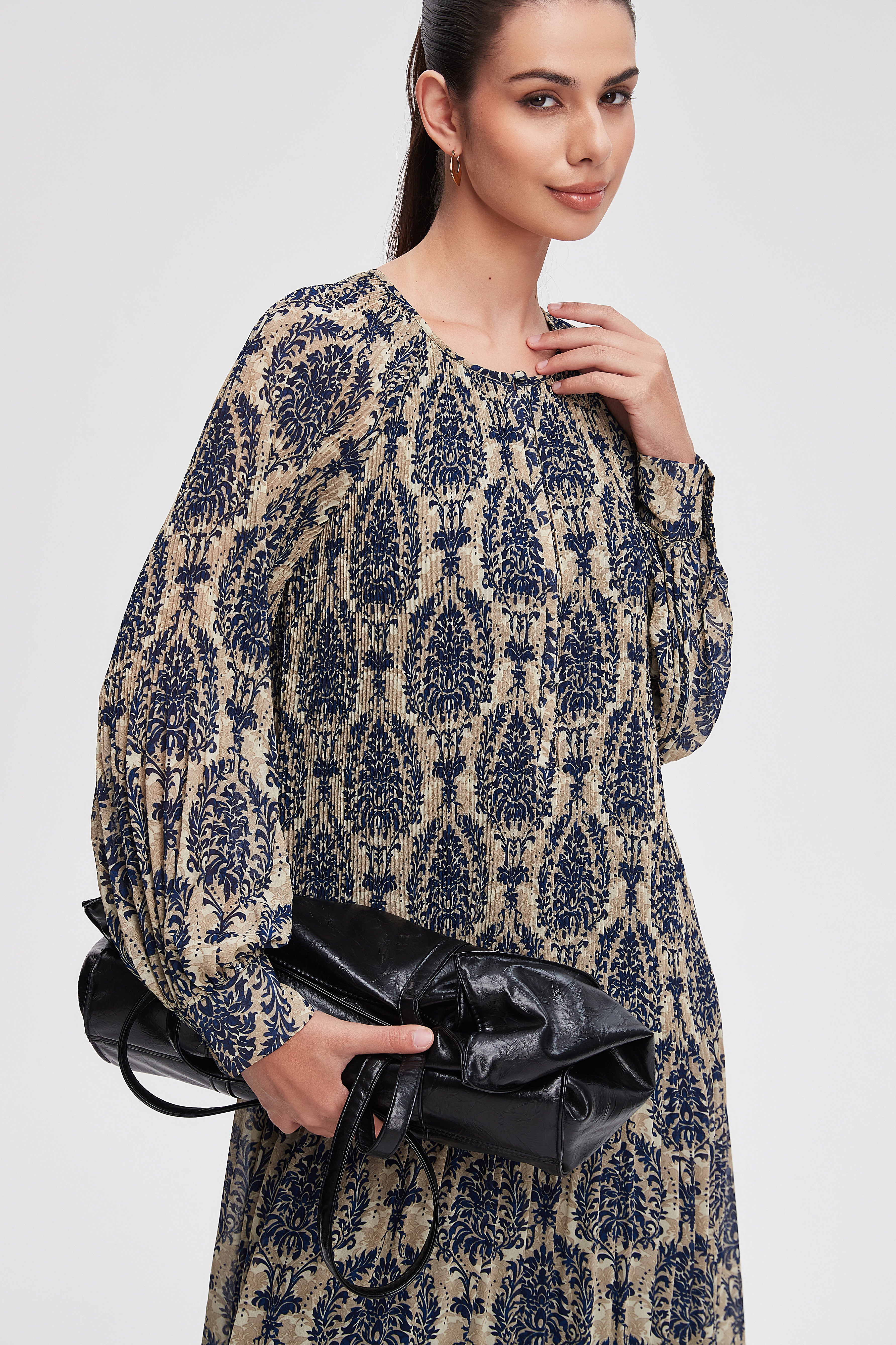 - ياقة مستديرة وأكمام طويلة لستايل مريح