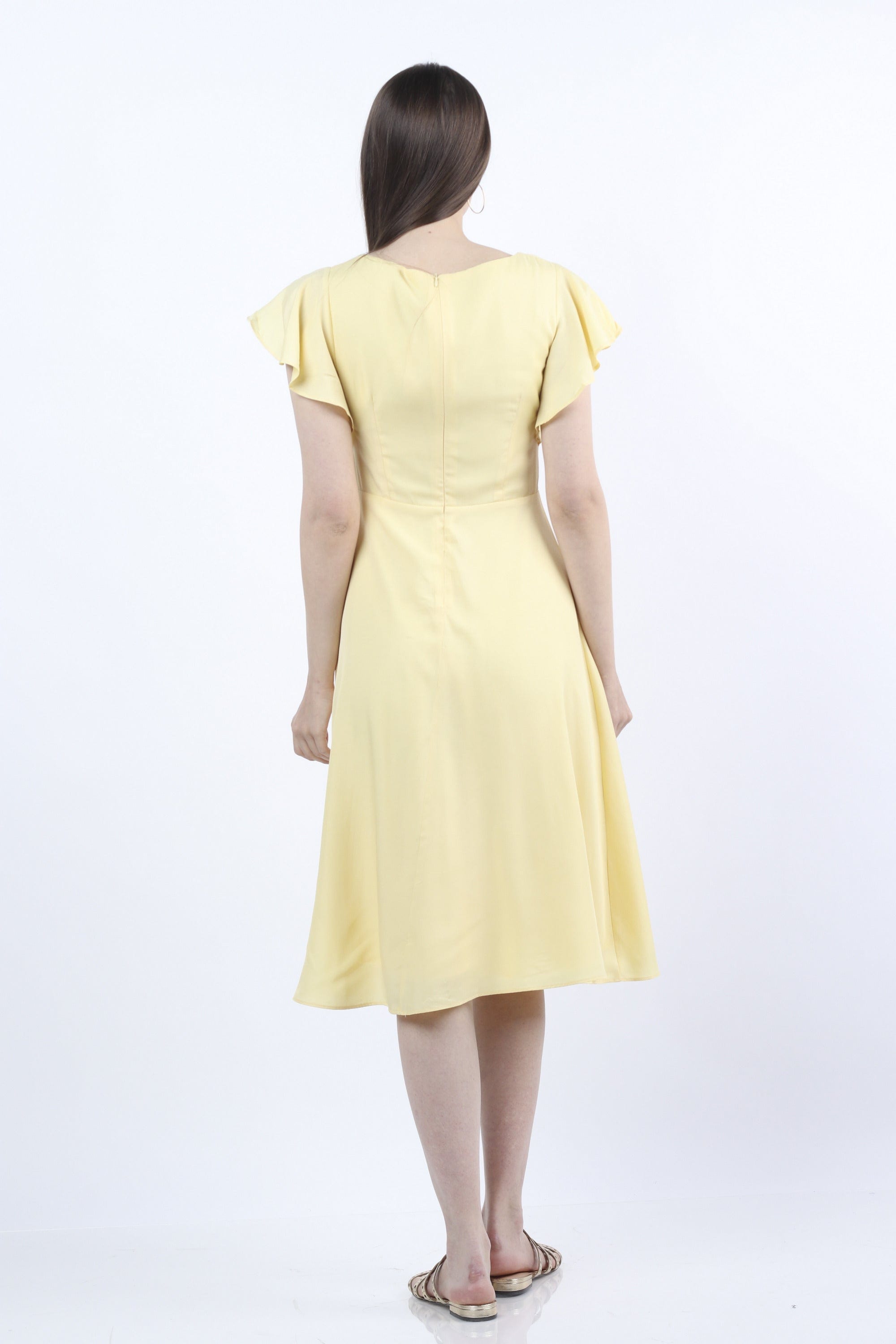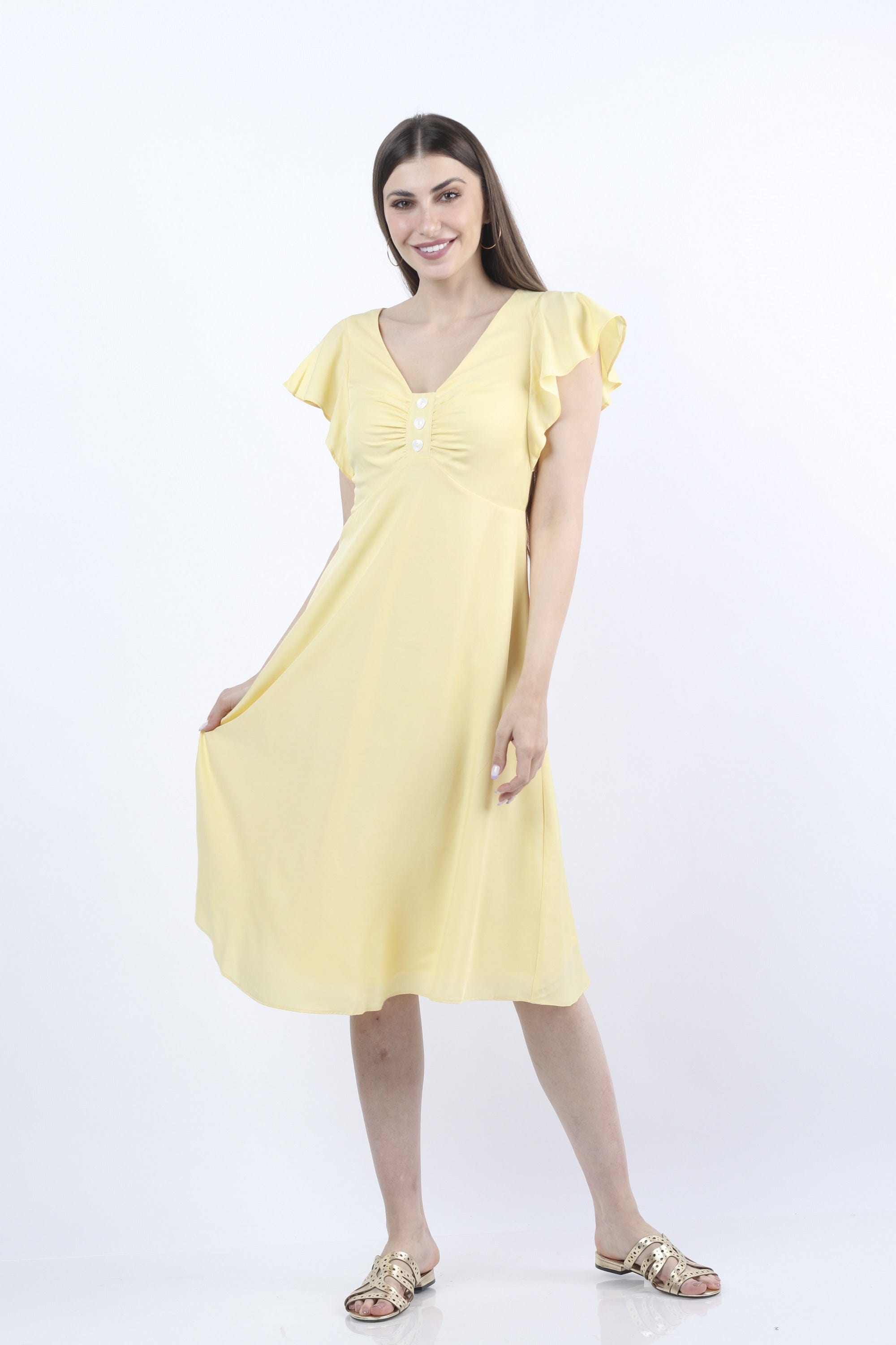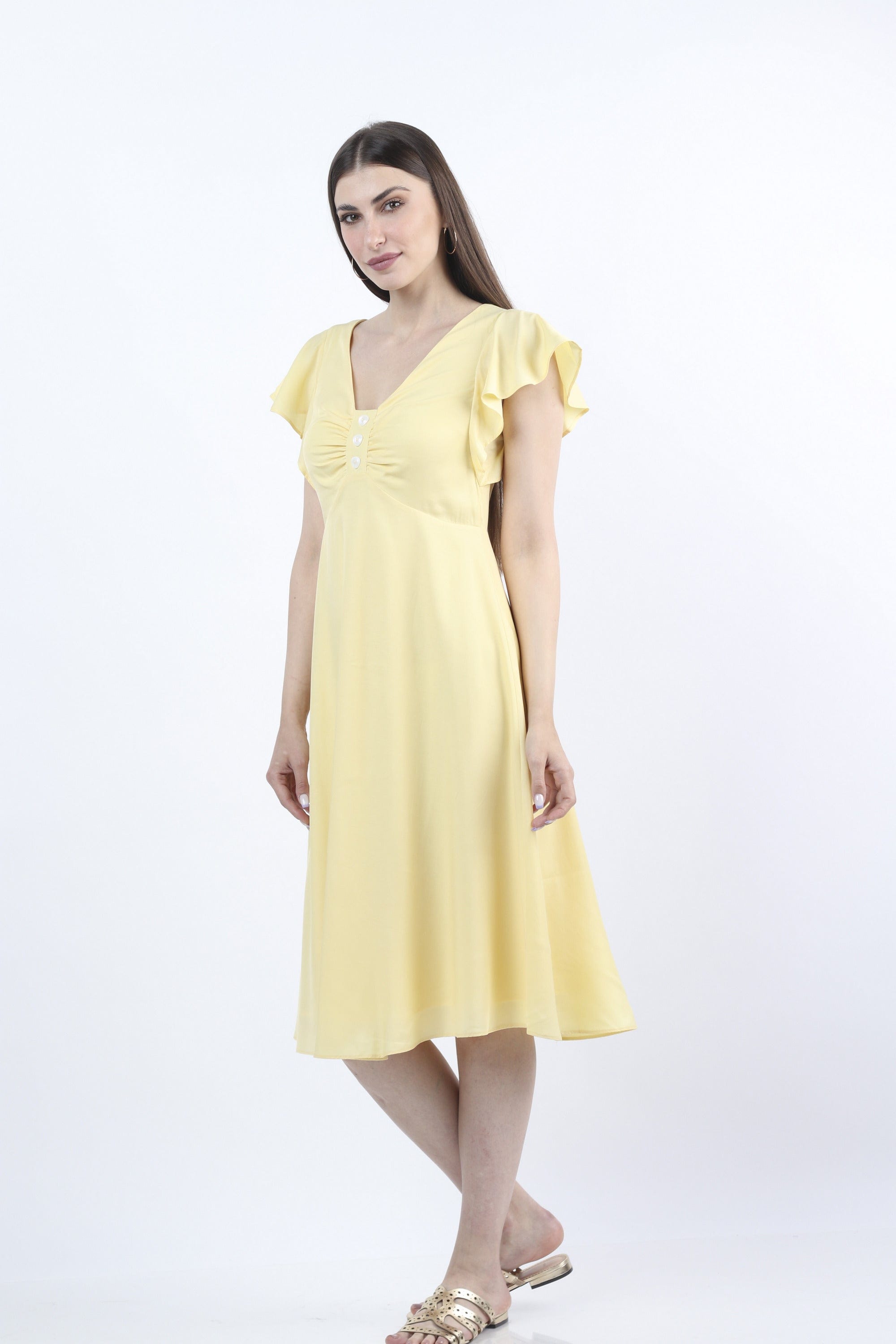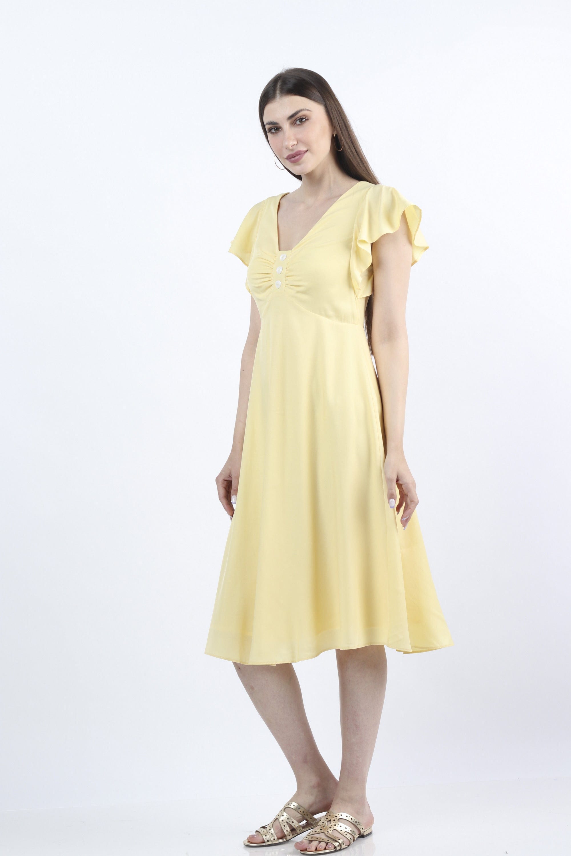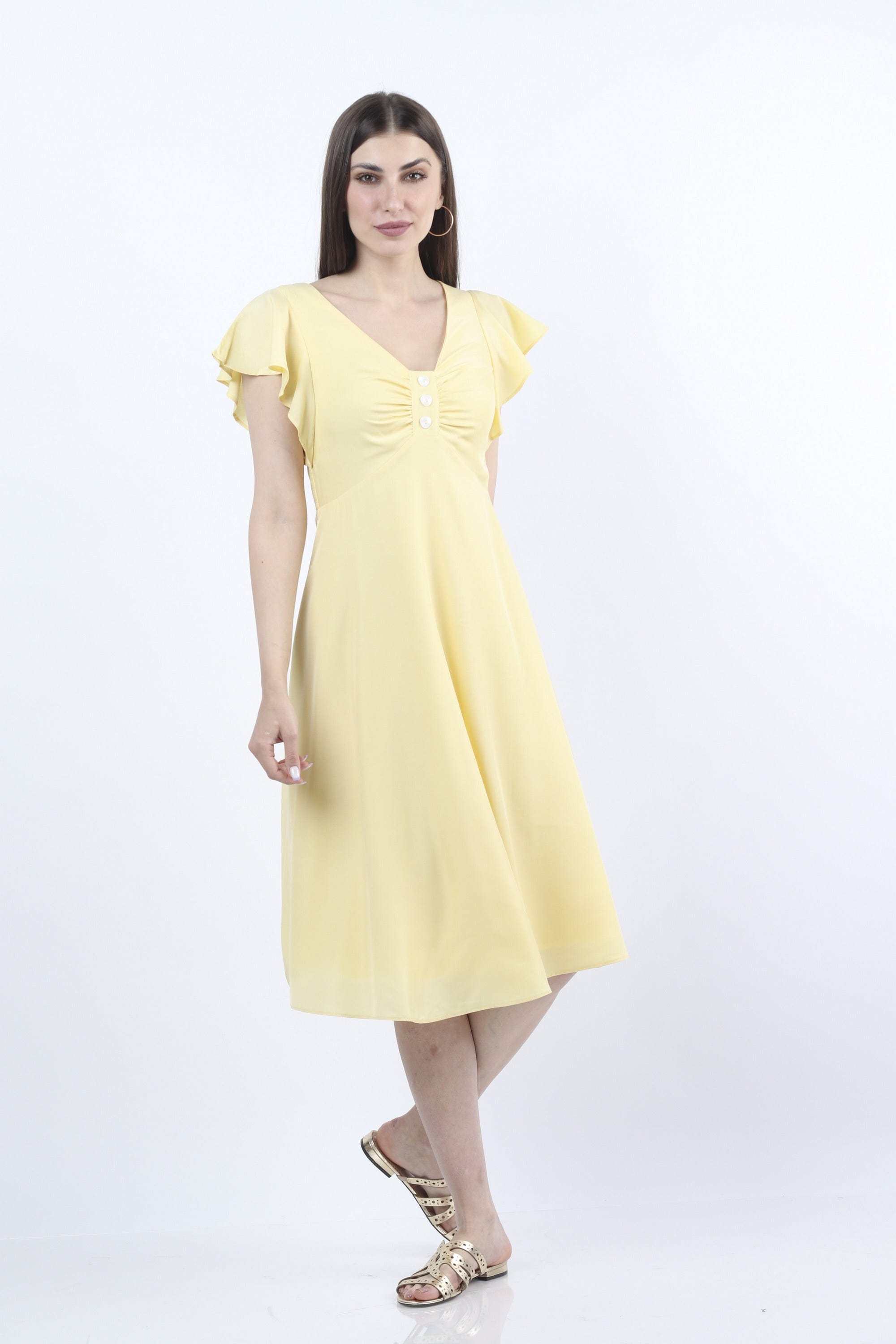 فستان ميدي سادة بأزرار على الصدر كم قصير مكشكش