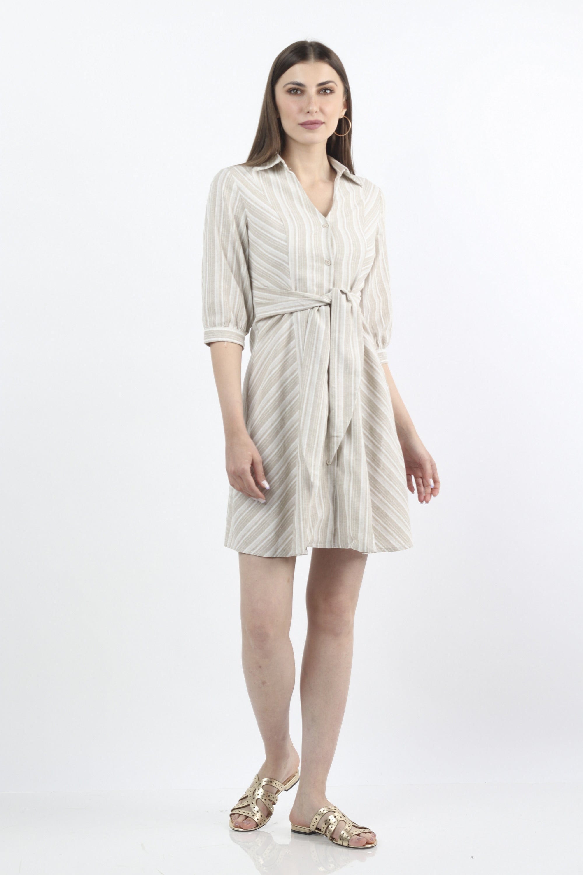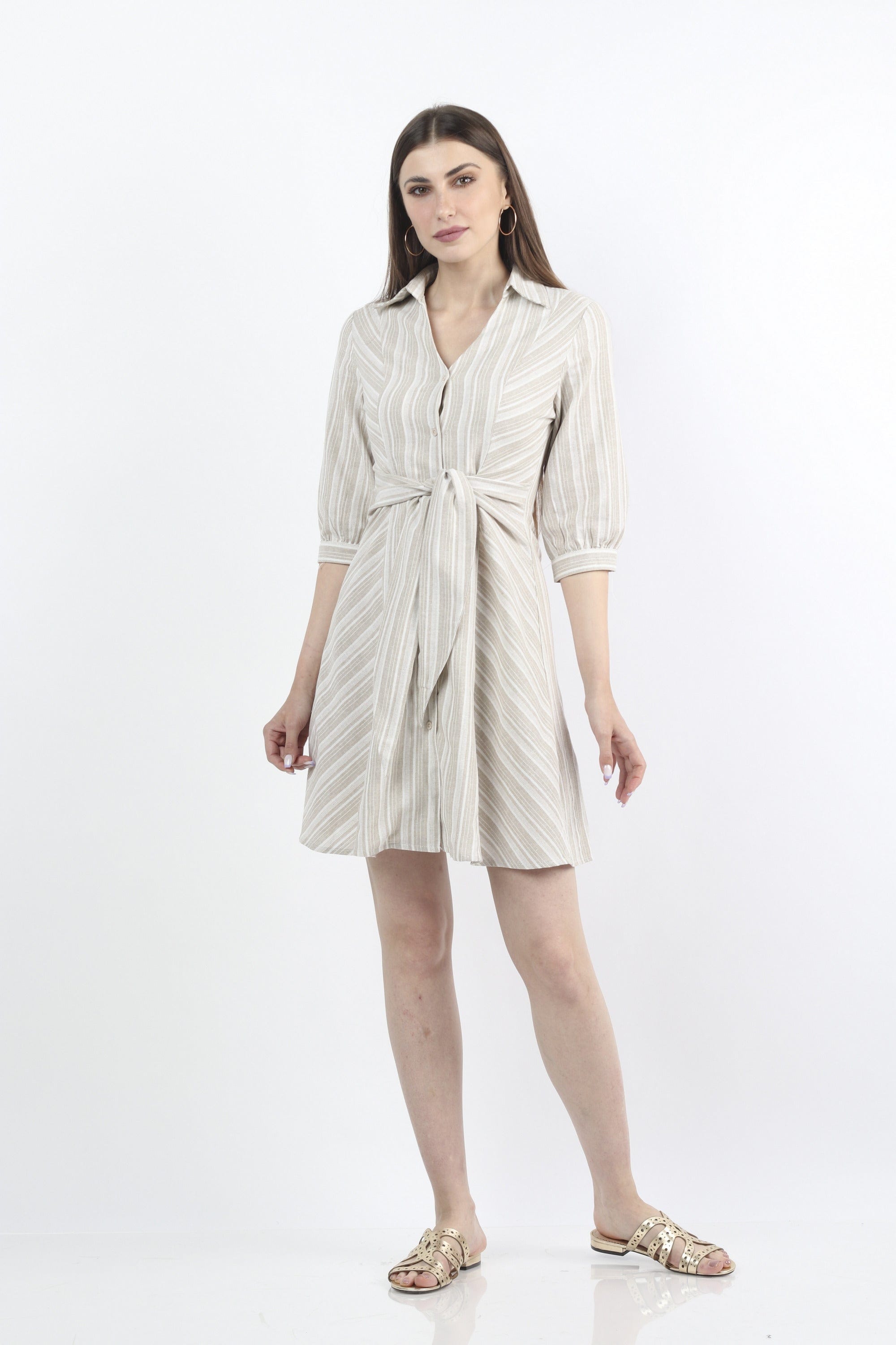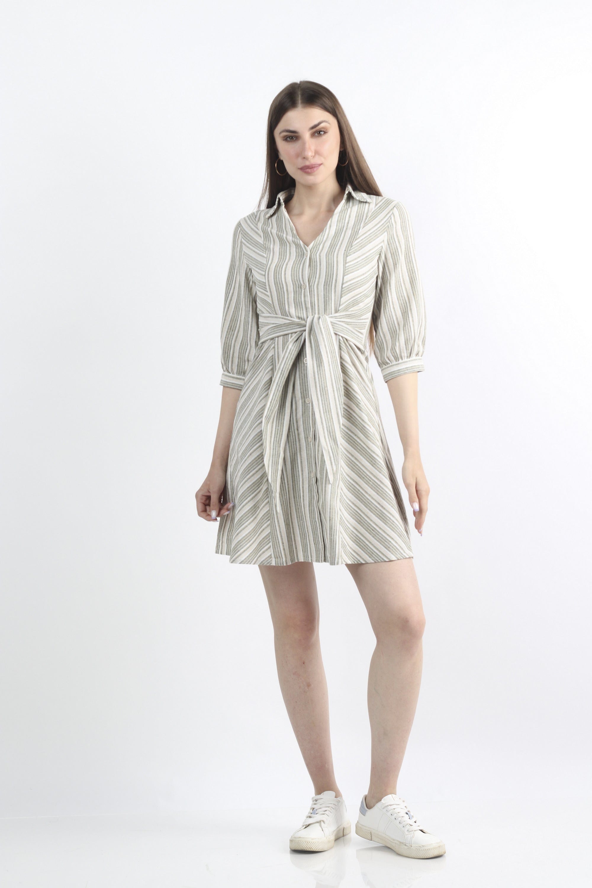 فستان ميدي مخطط برباط على الخصر 3/4 كم بف