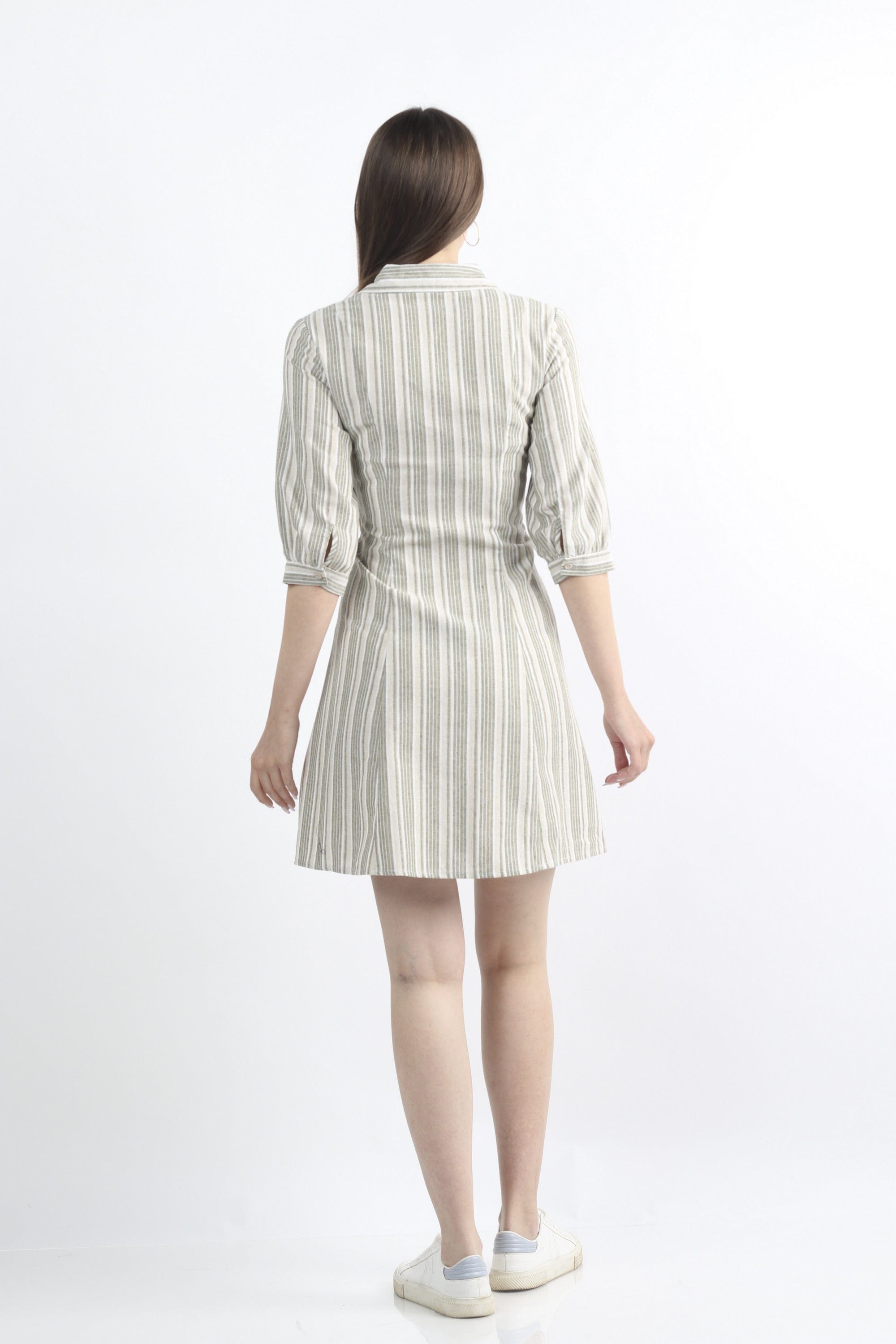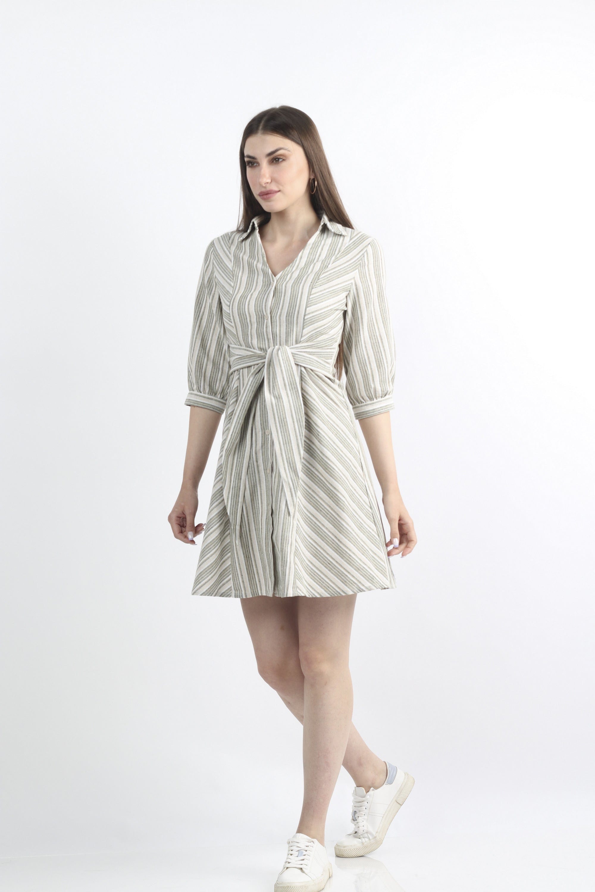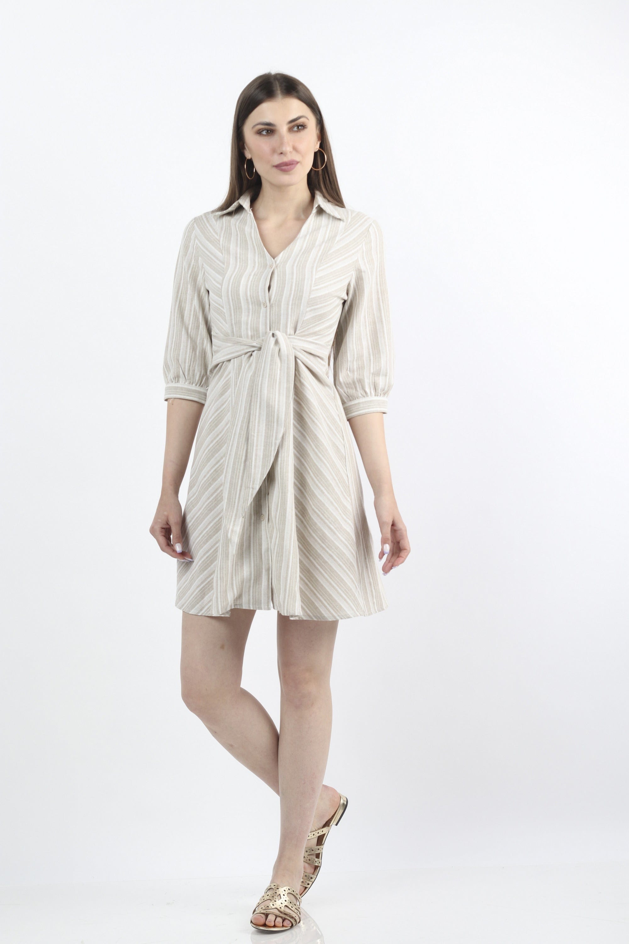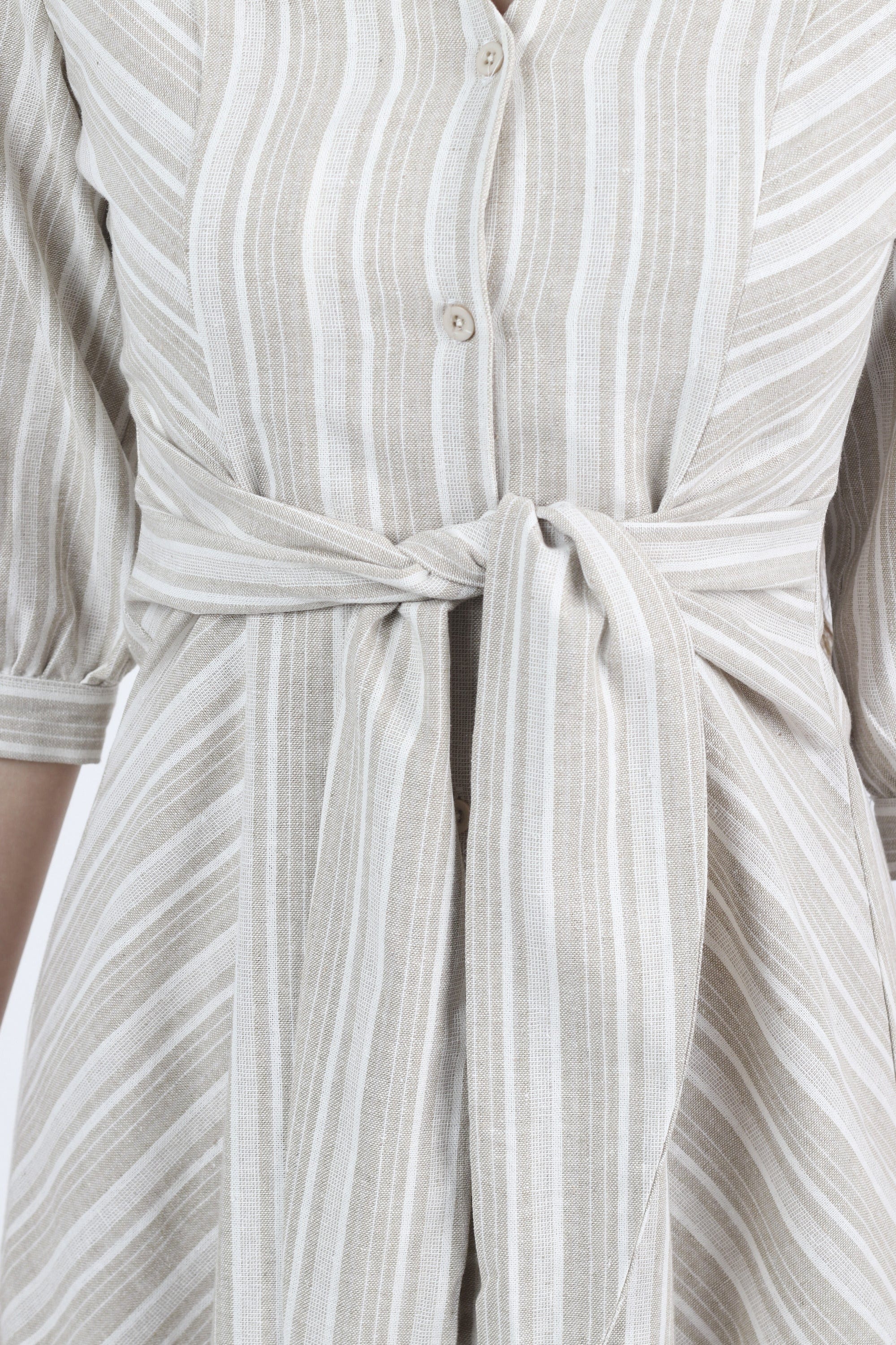 فستان ميدي مخطط برباط على الخصر 3/4 كم بف