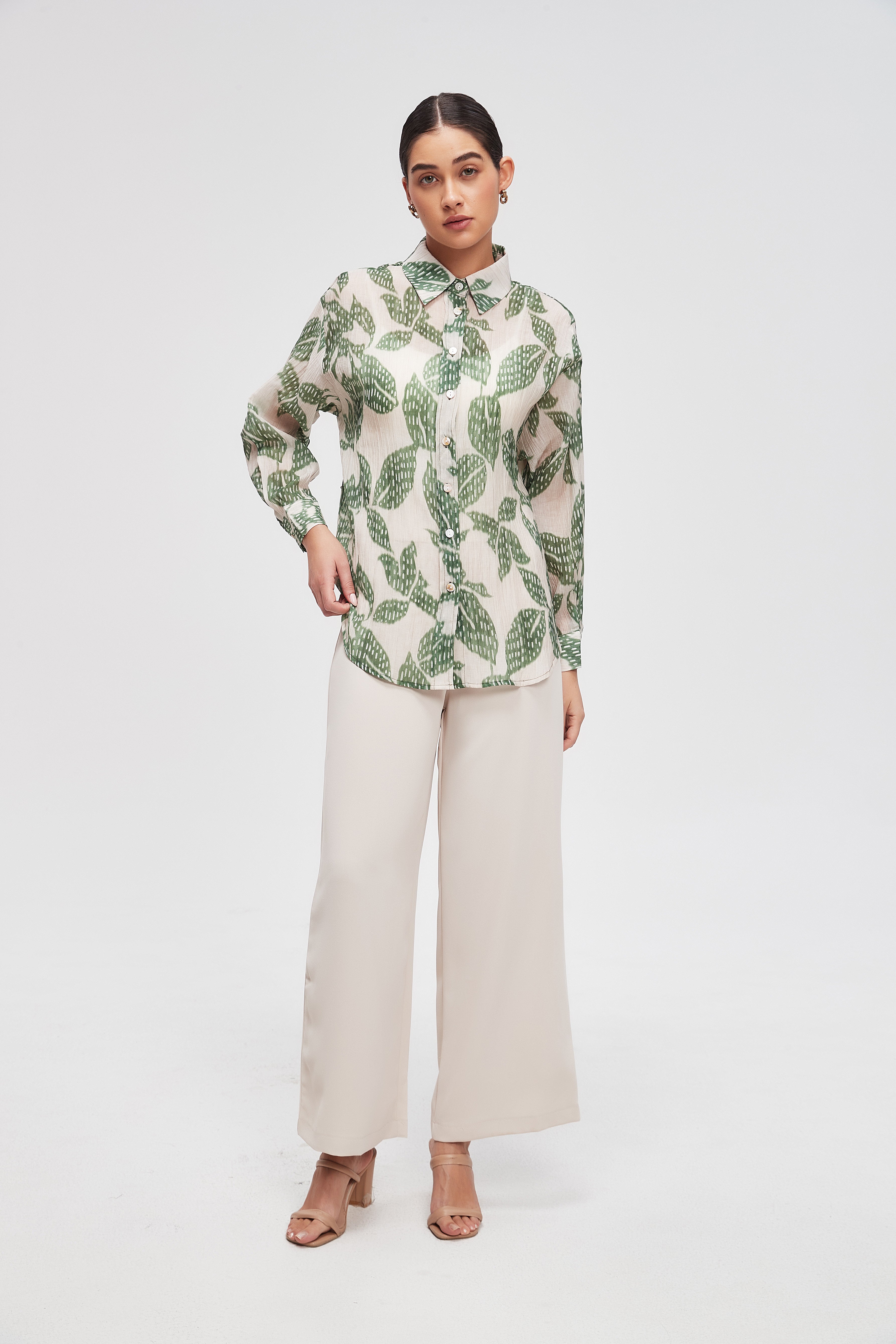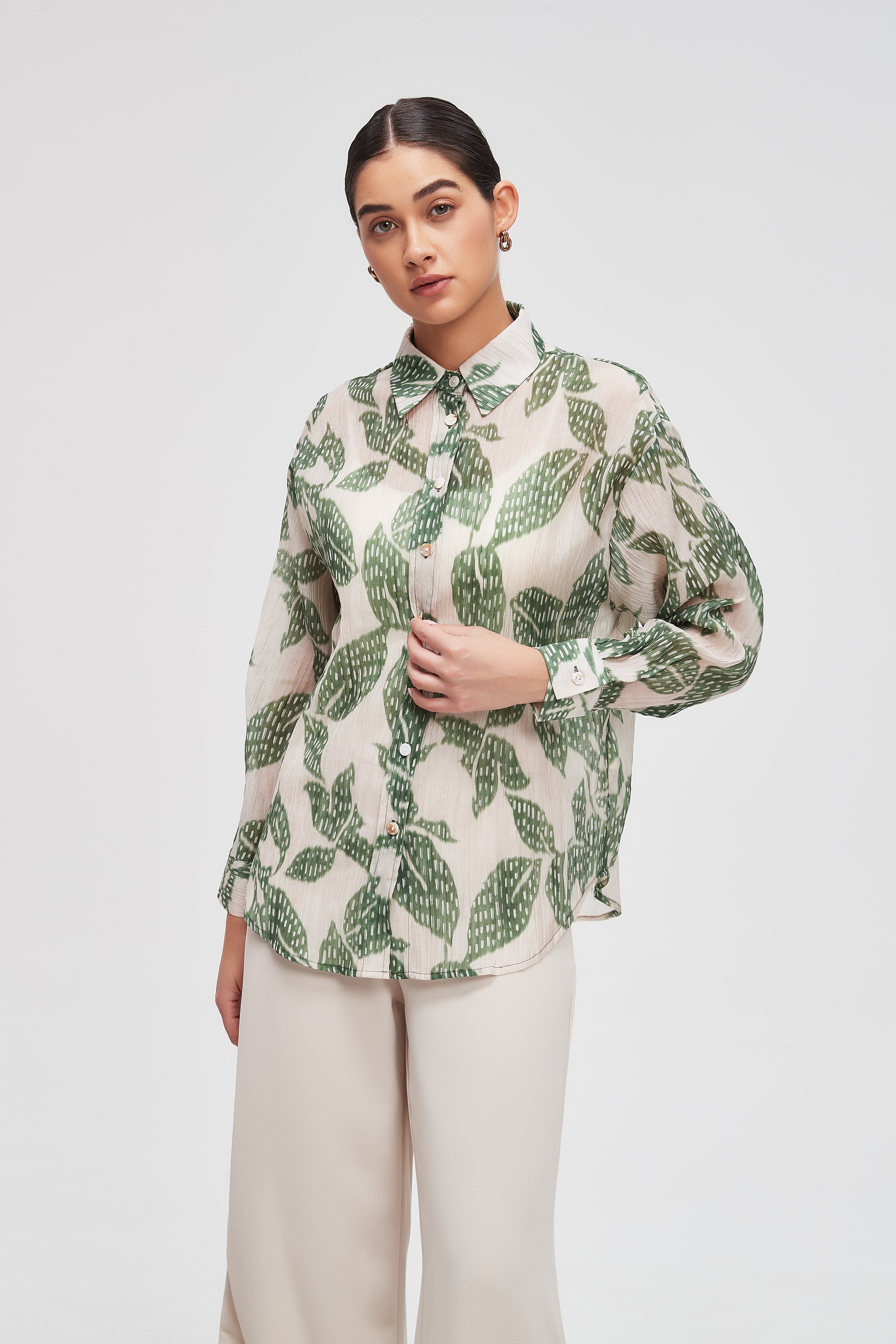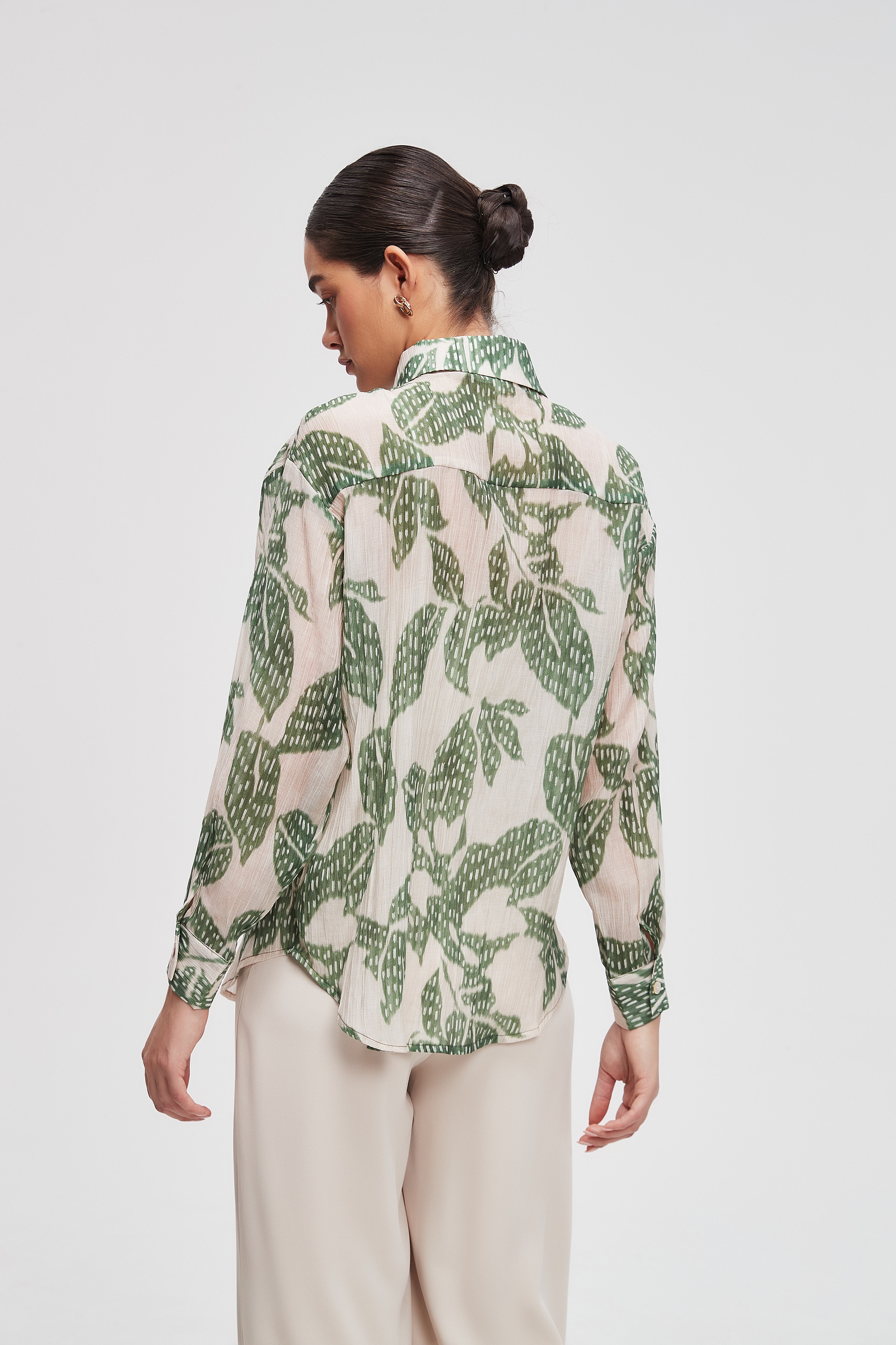 بلوزة بكم طويل بأوراق شجر وياقة قميص