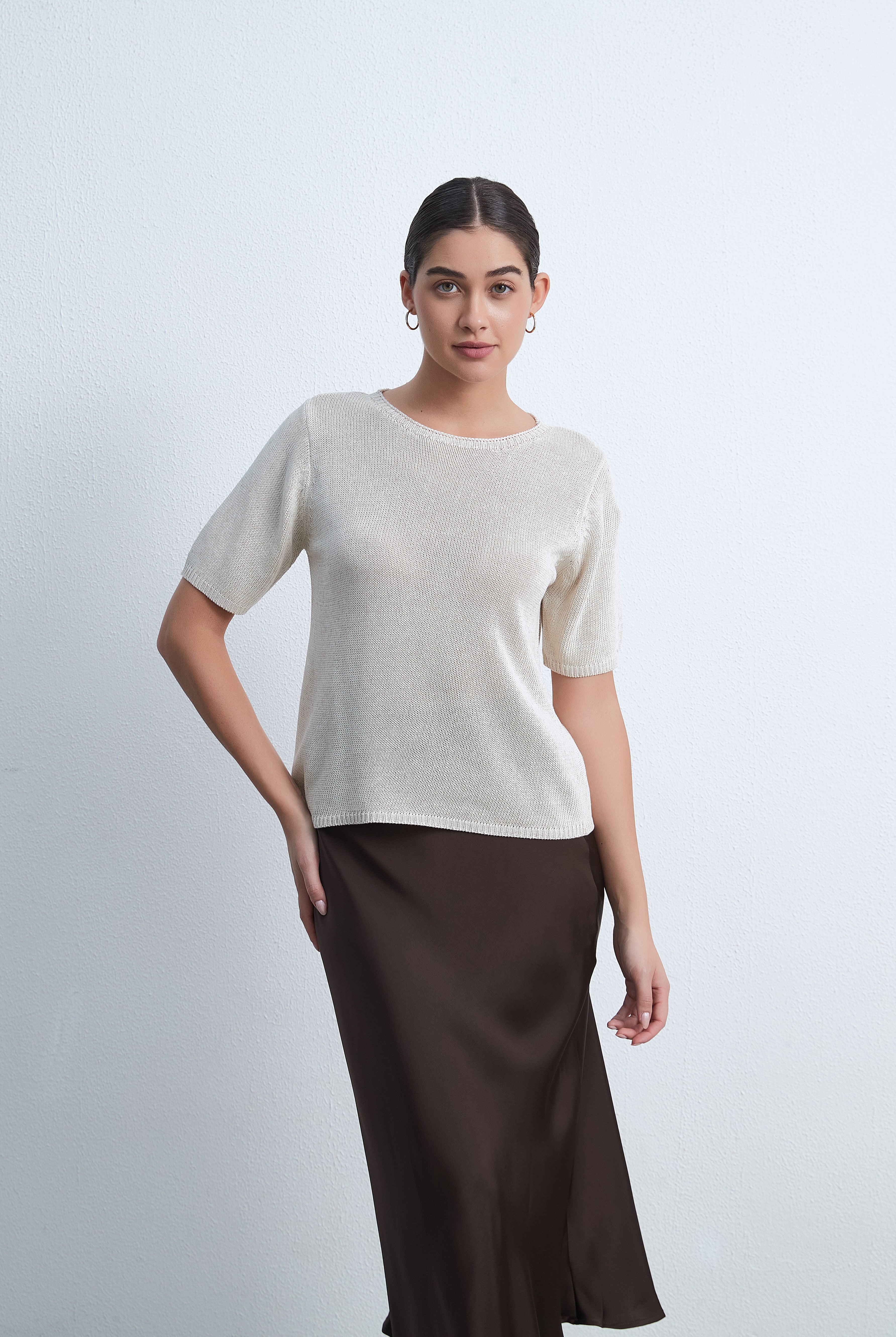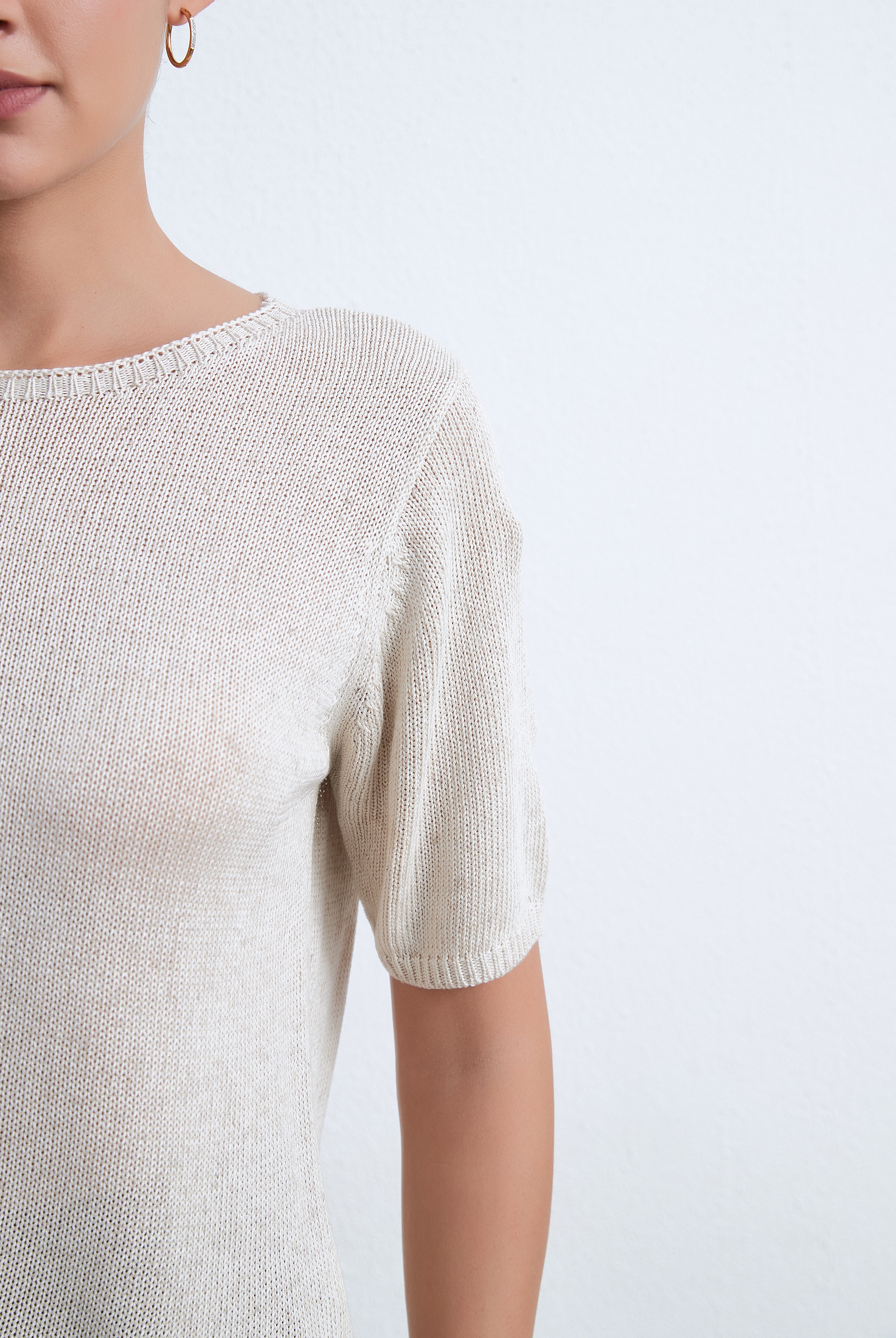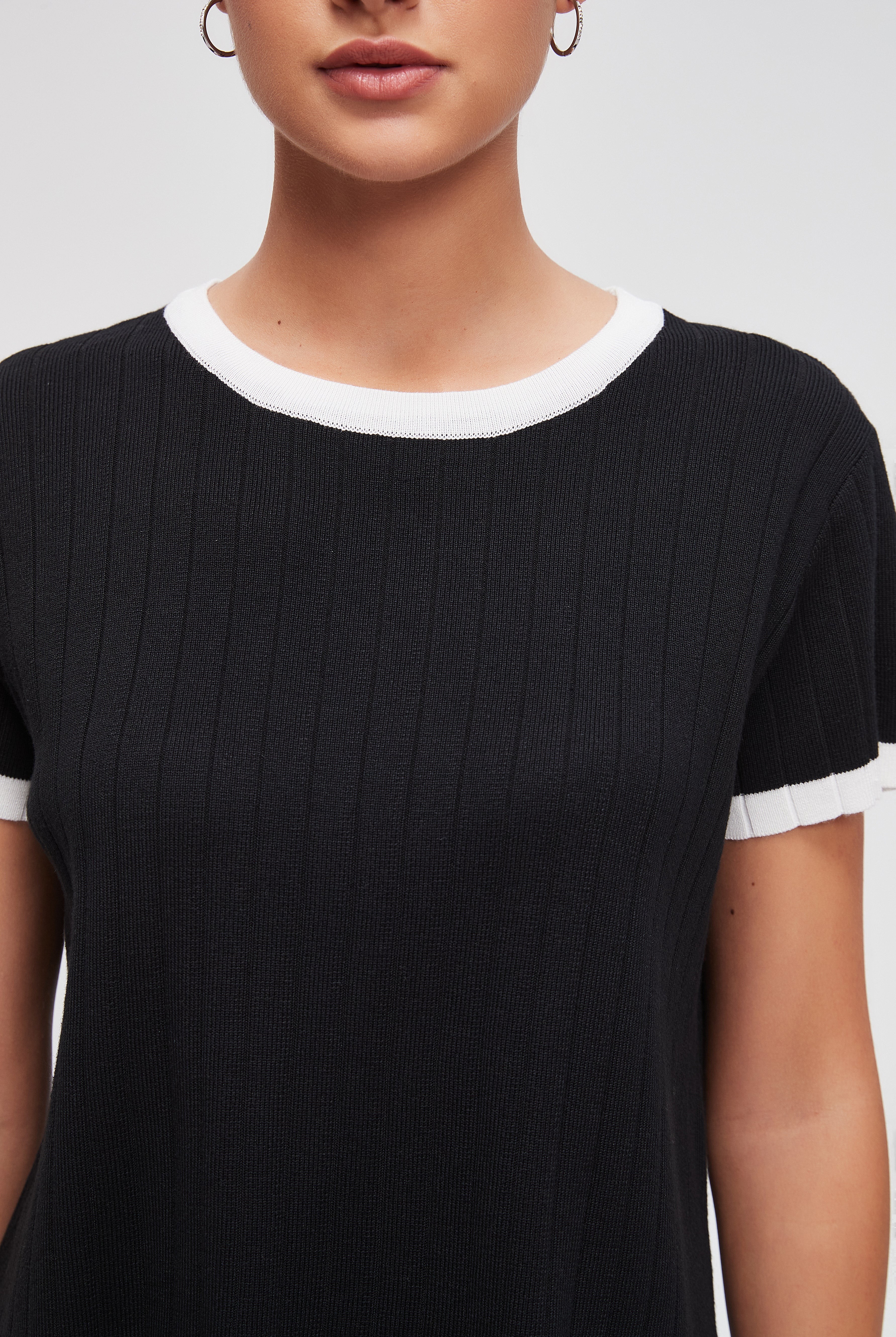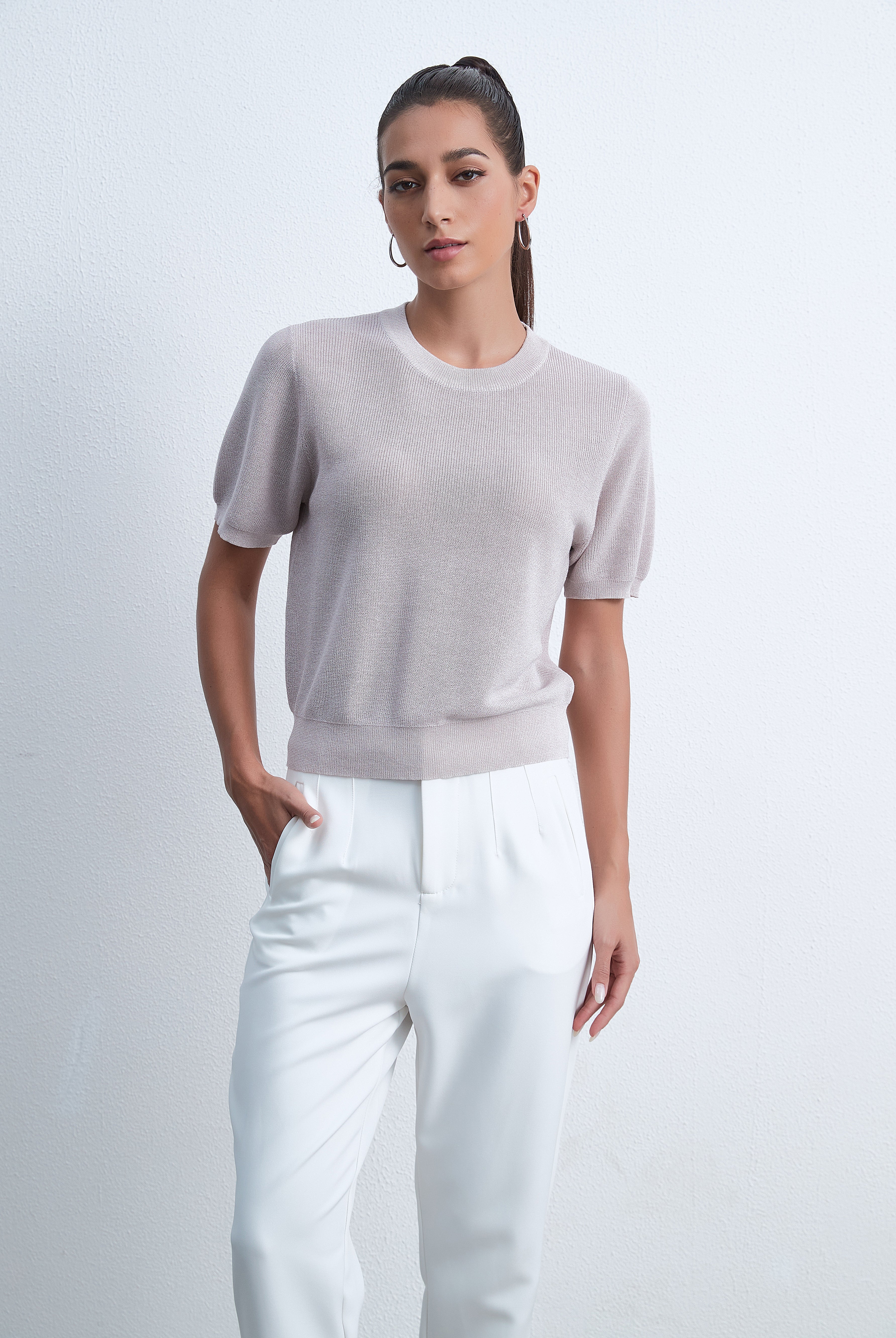 بلوزة نصف كم مضلعة بفتحة رقبة مستديرة