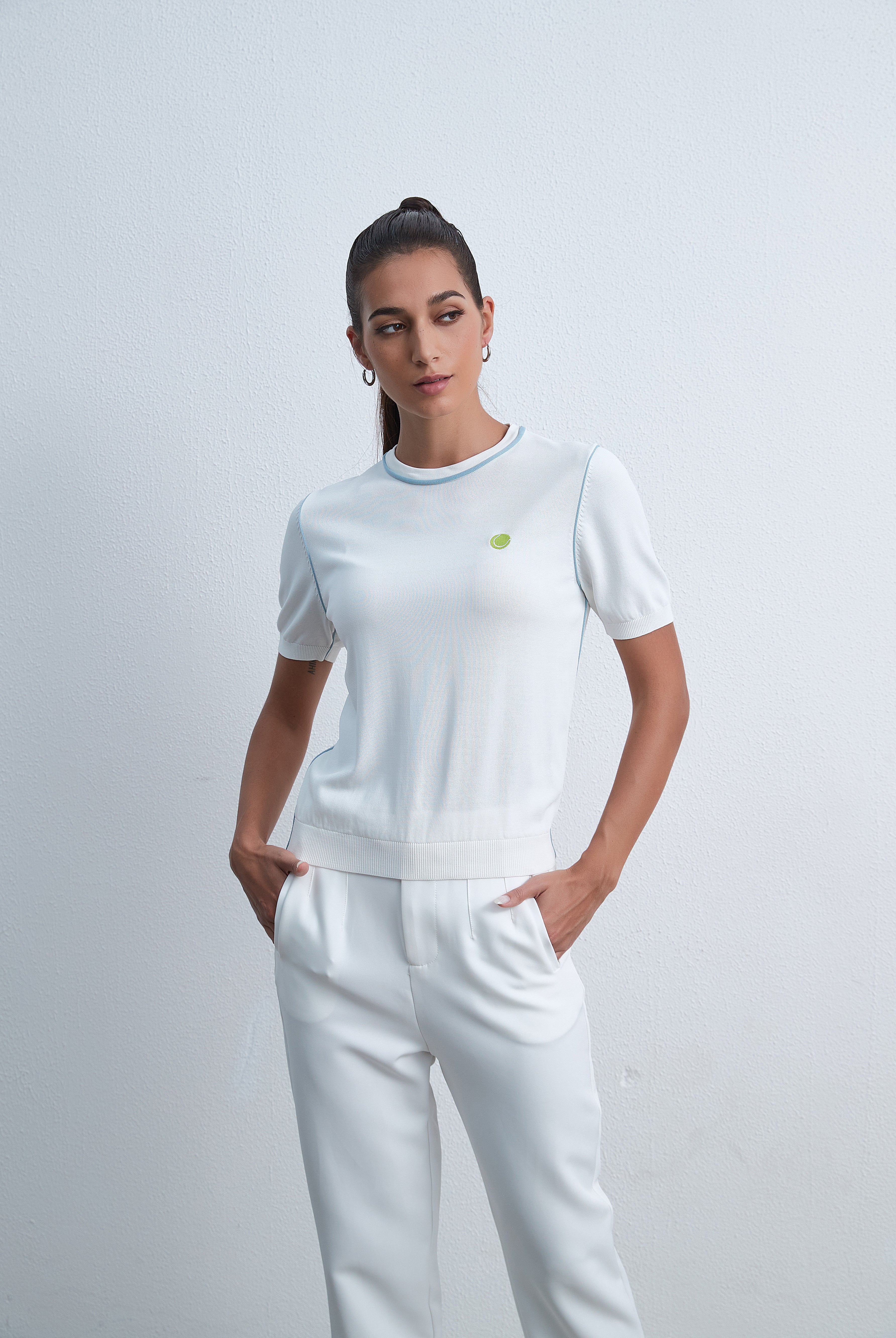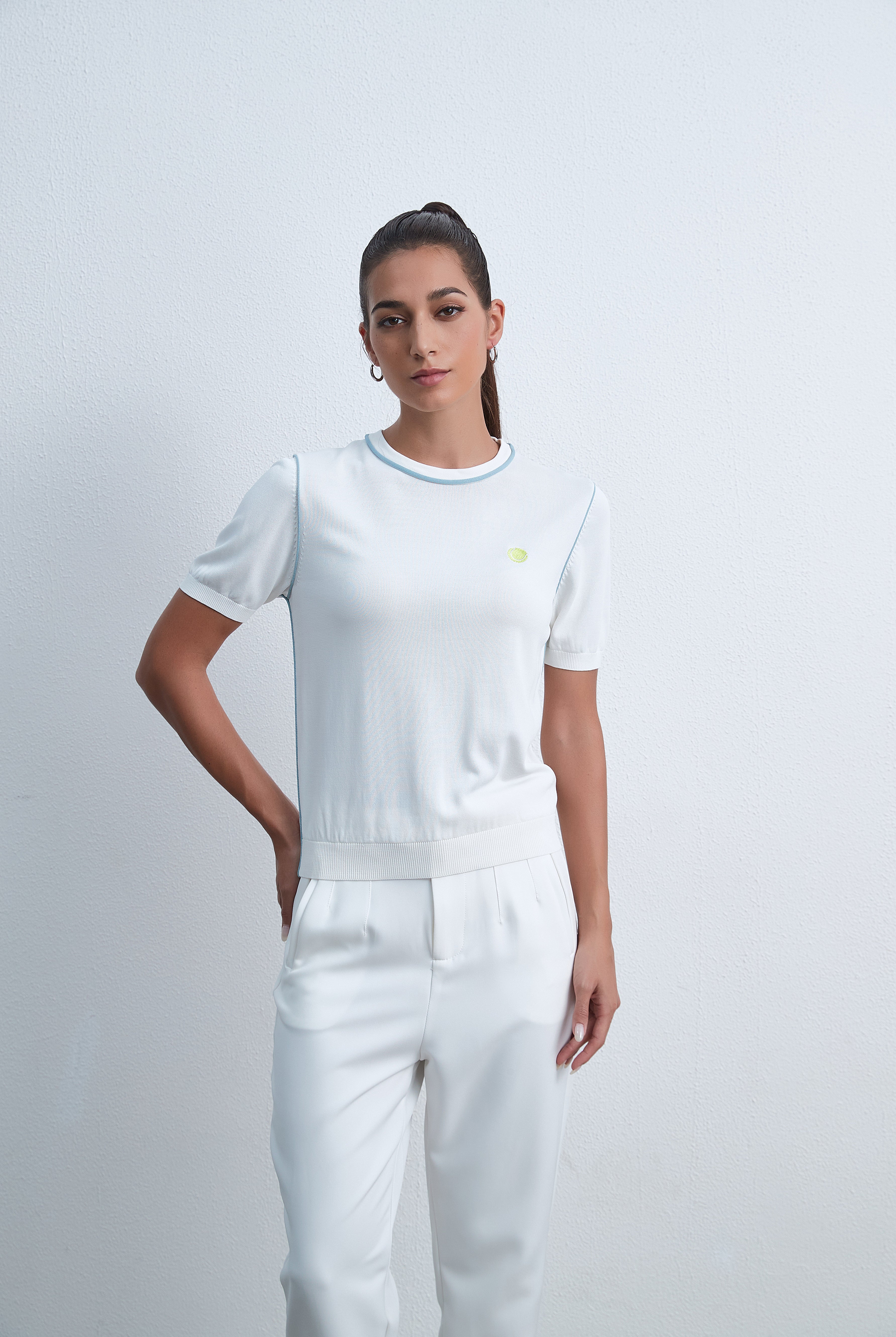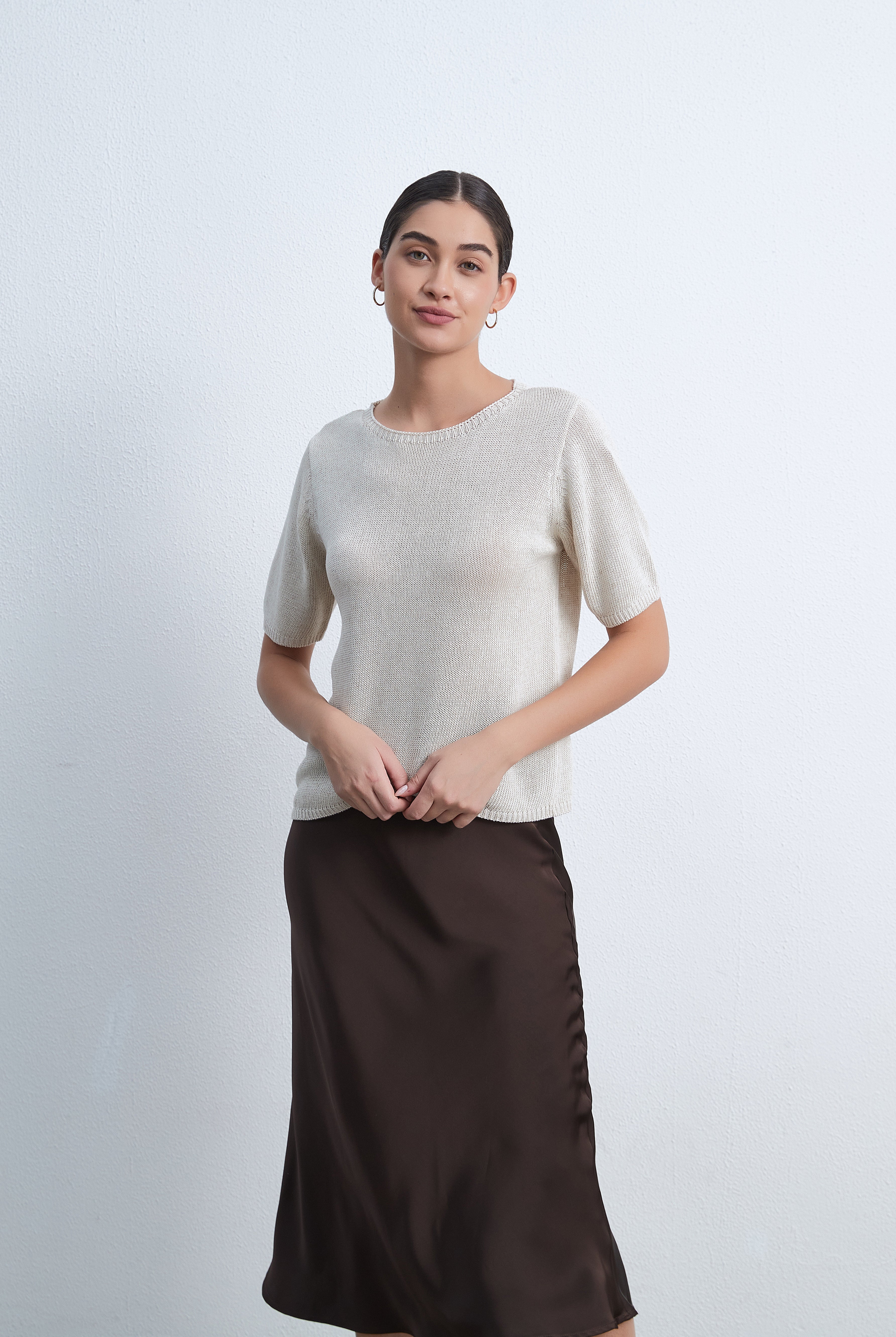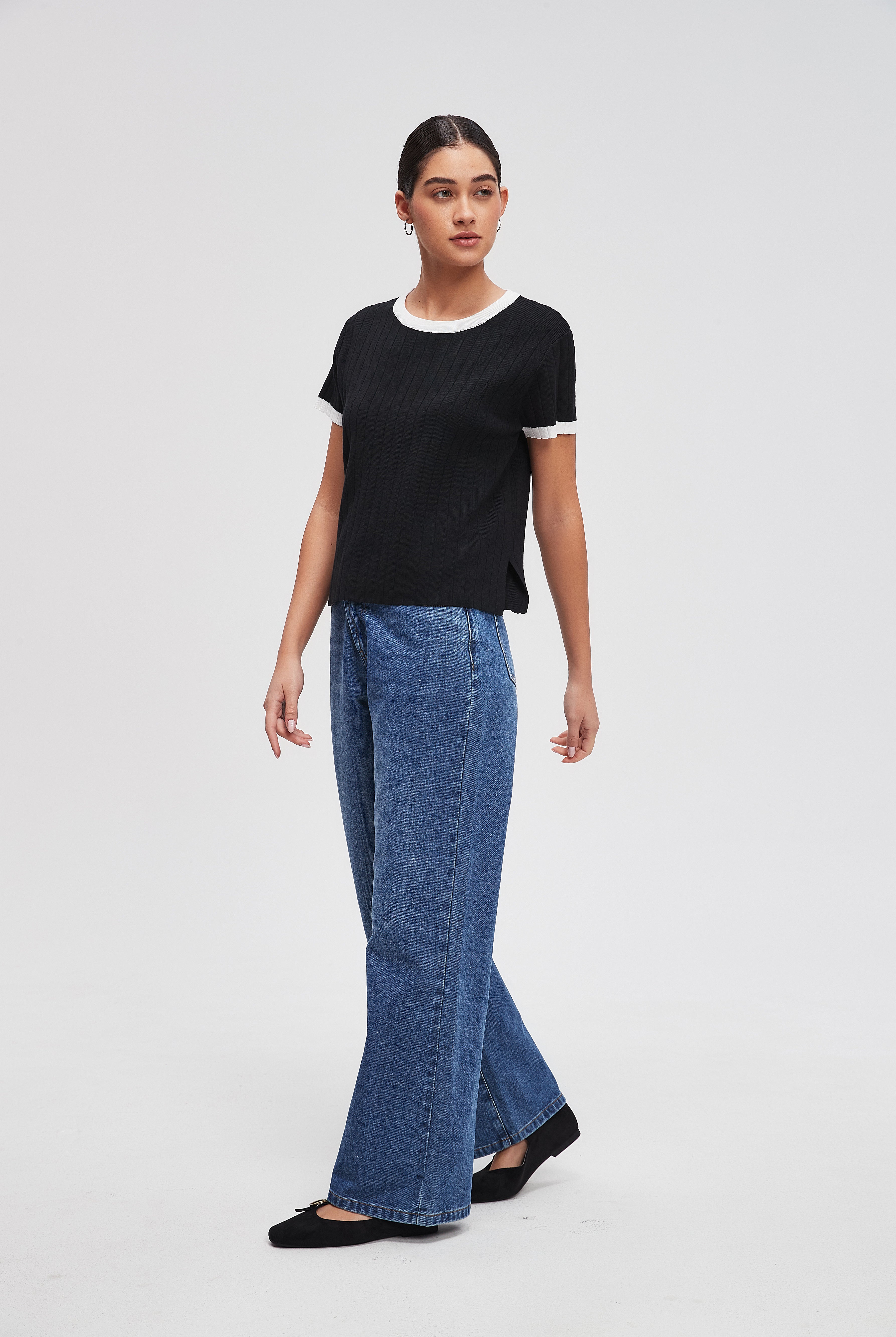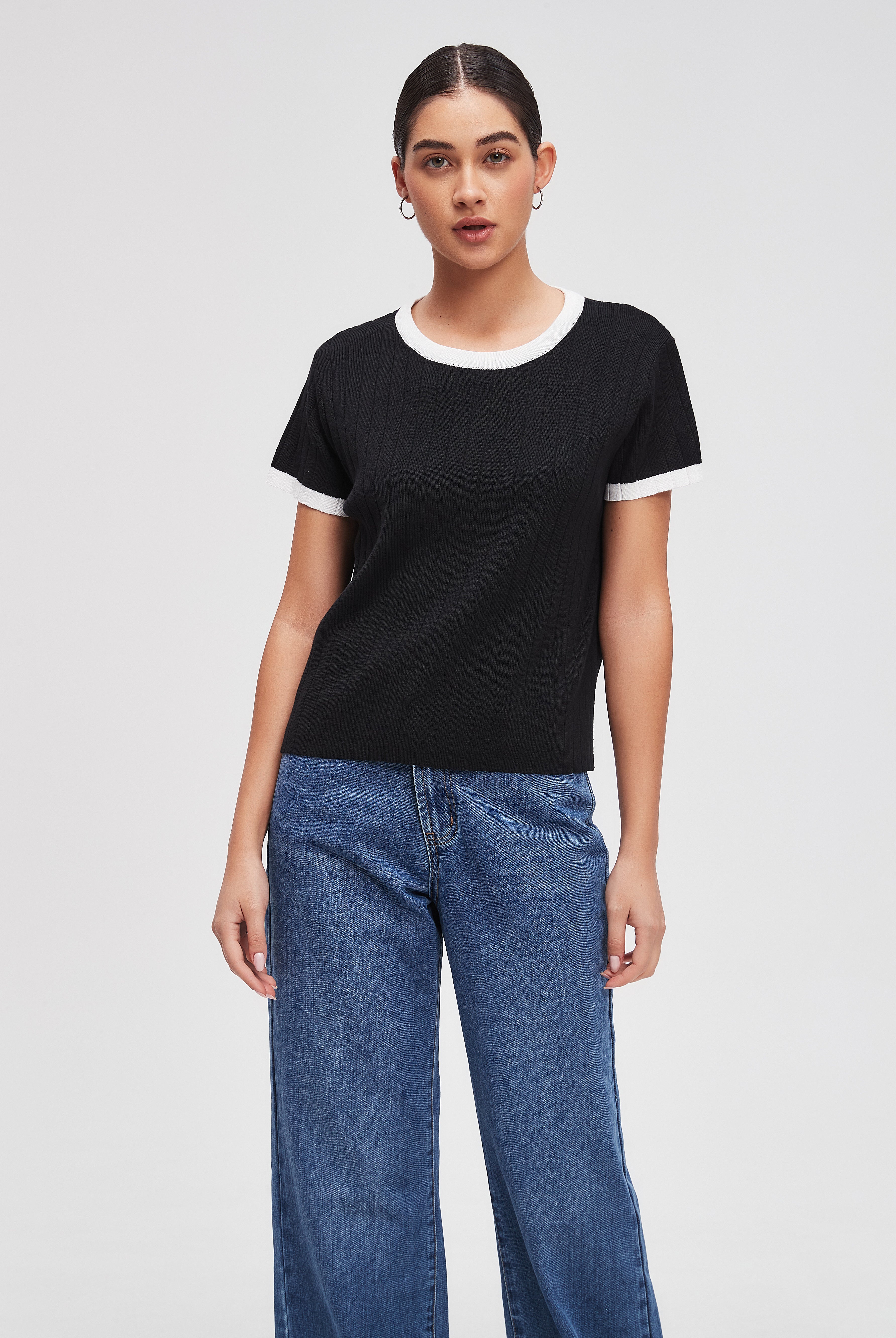 بلوزة نصف كم مضلعة بفتحة رقبة مستديرة