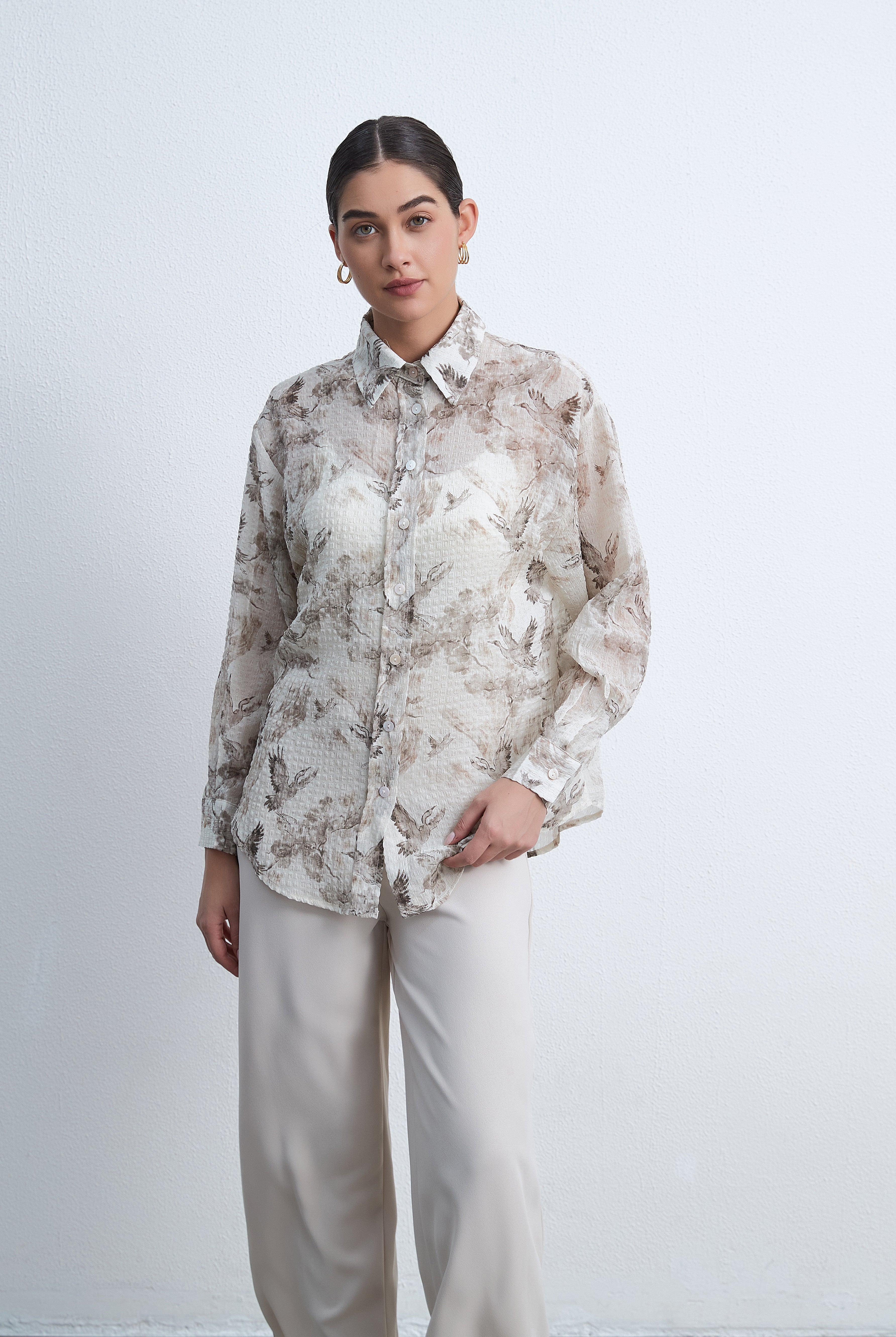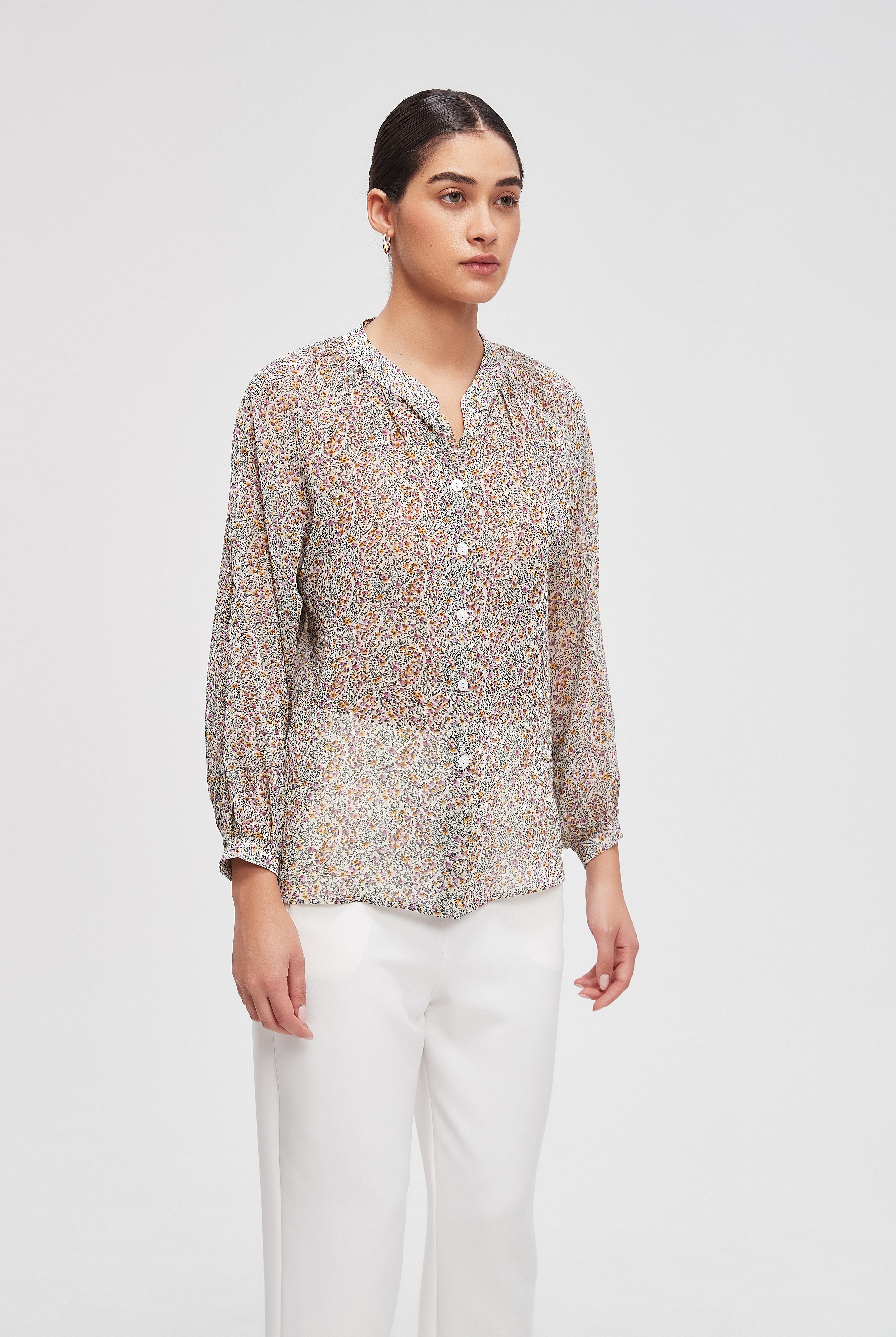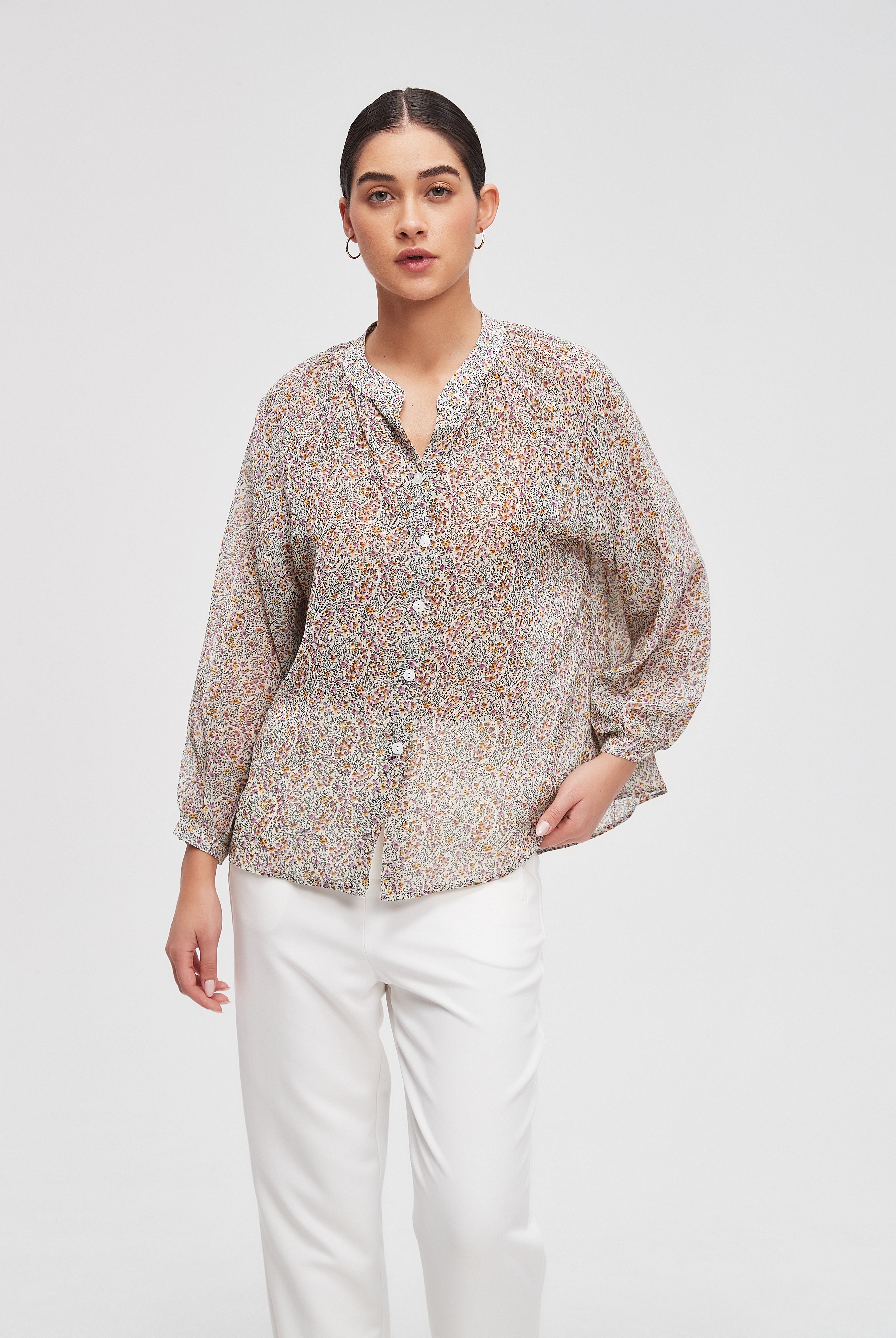 بلوزة منقوشة بكم طويل وأزرار أمامية