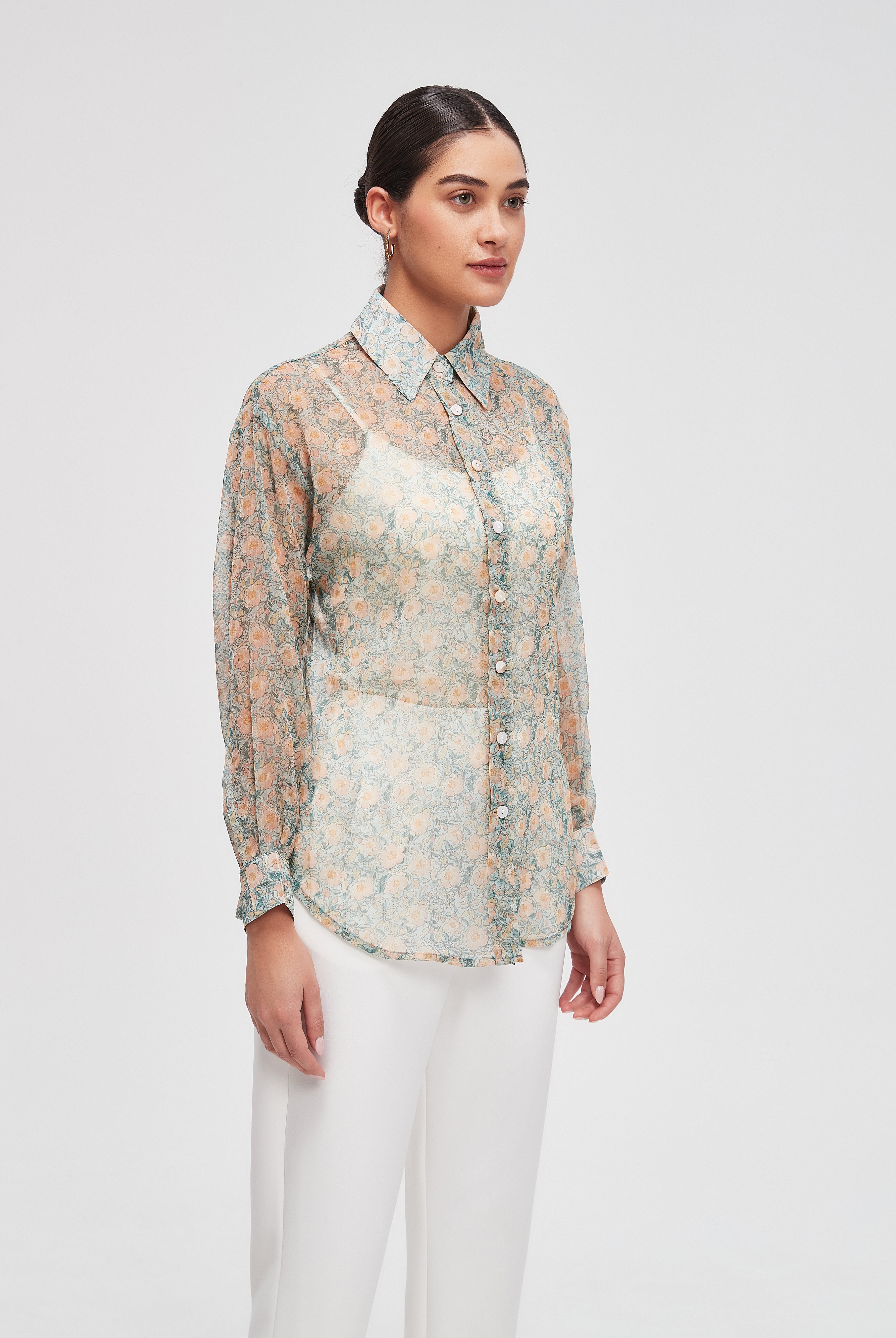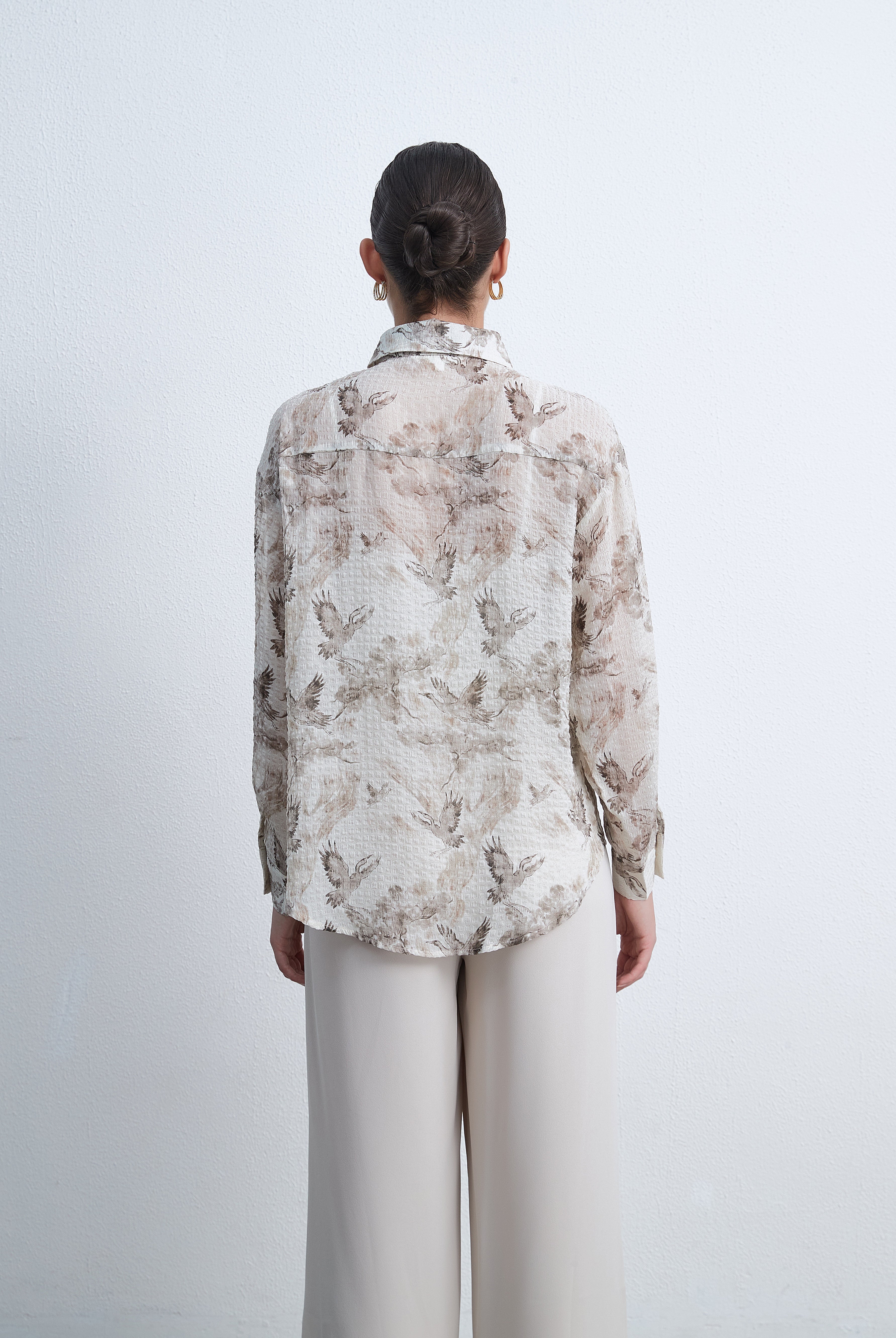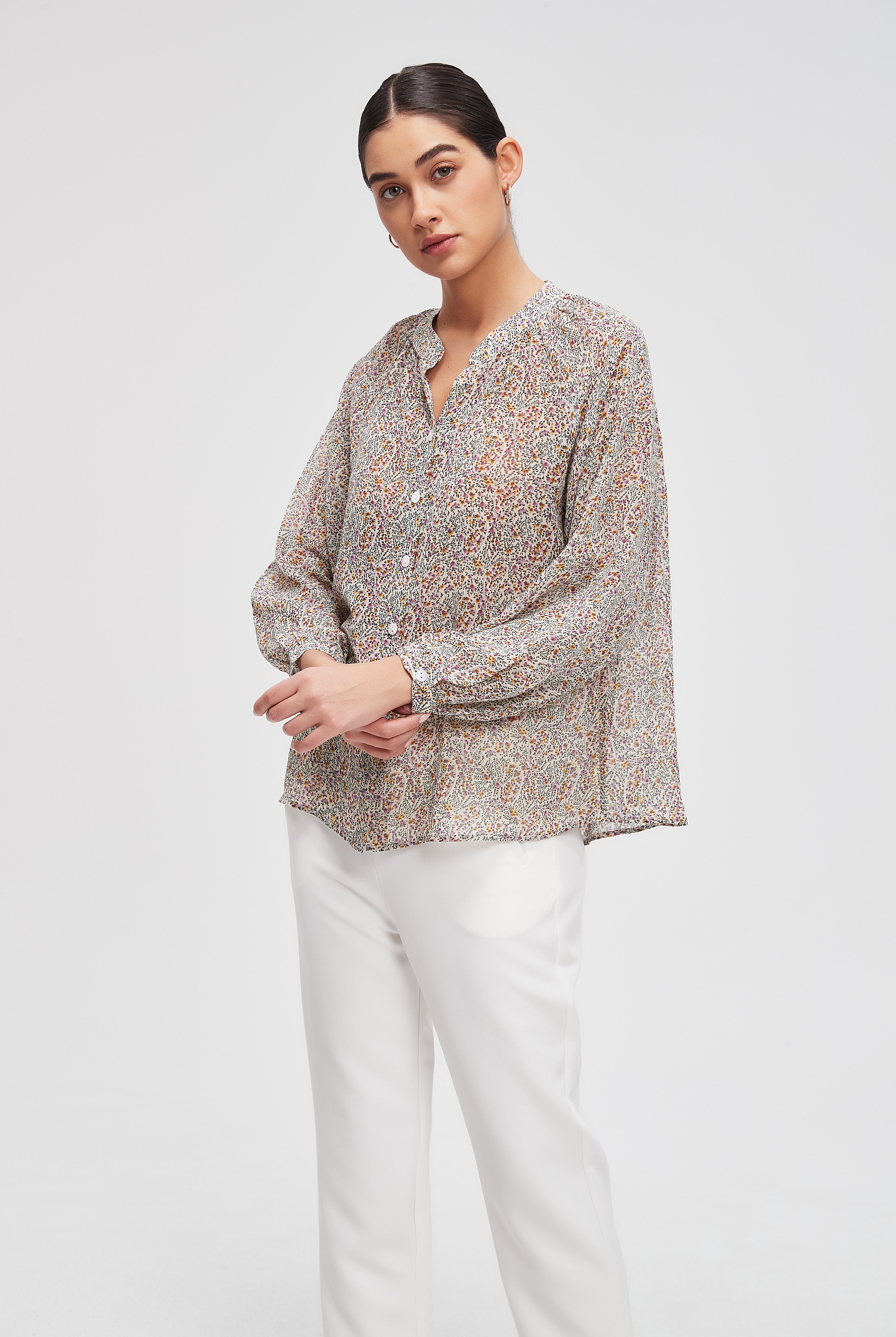 بلوزة منقوشة بكم طويل وأزرار أمامية