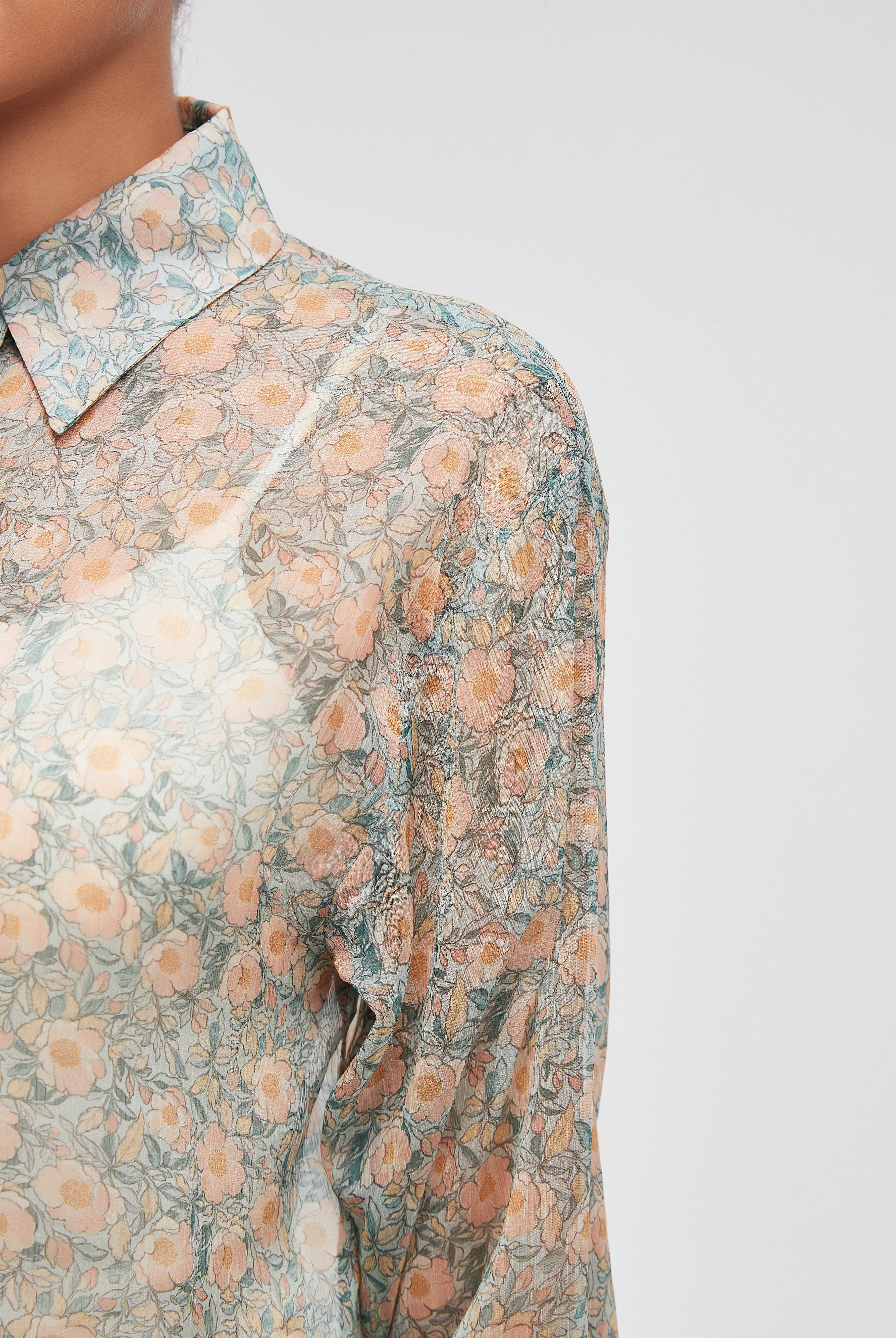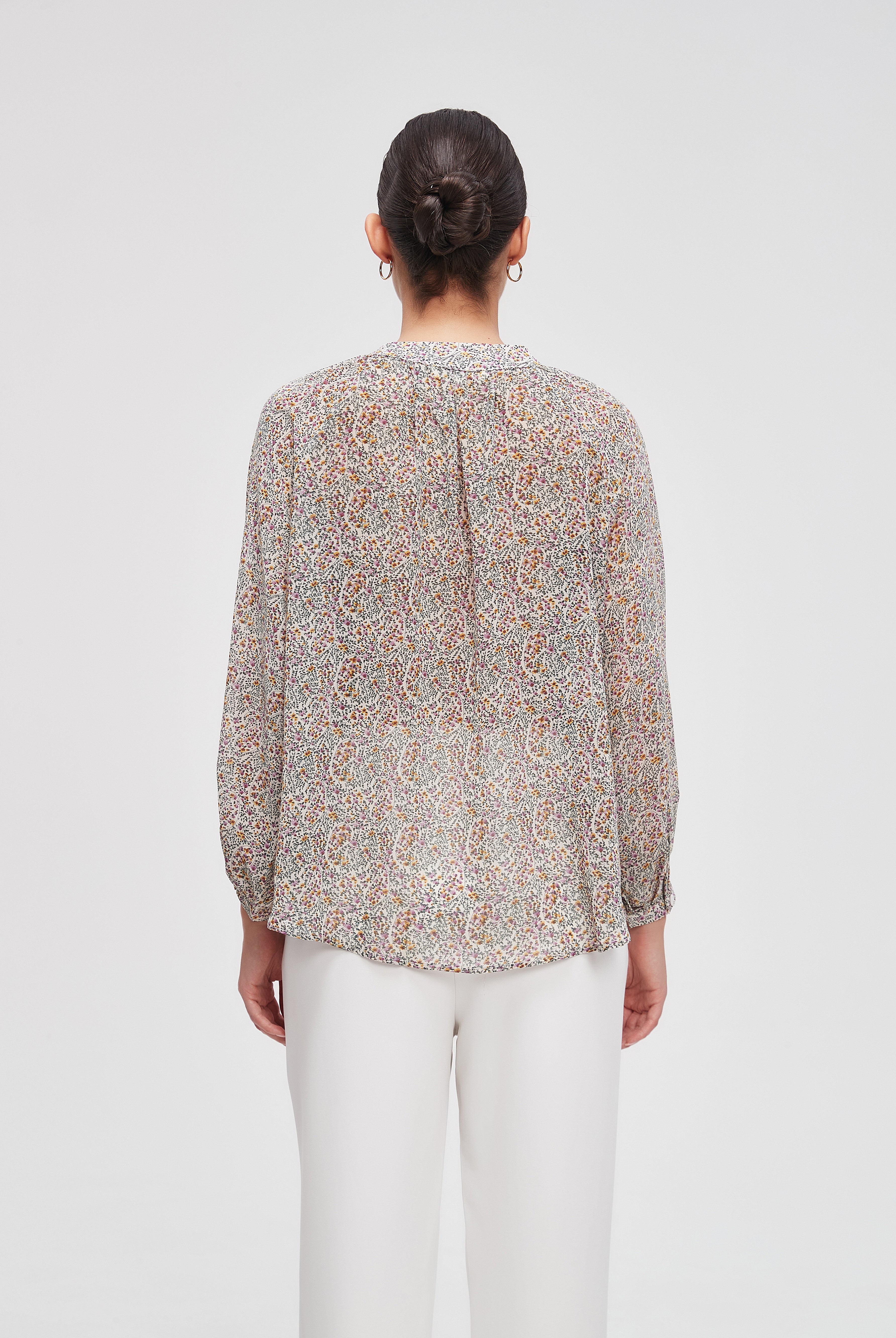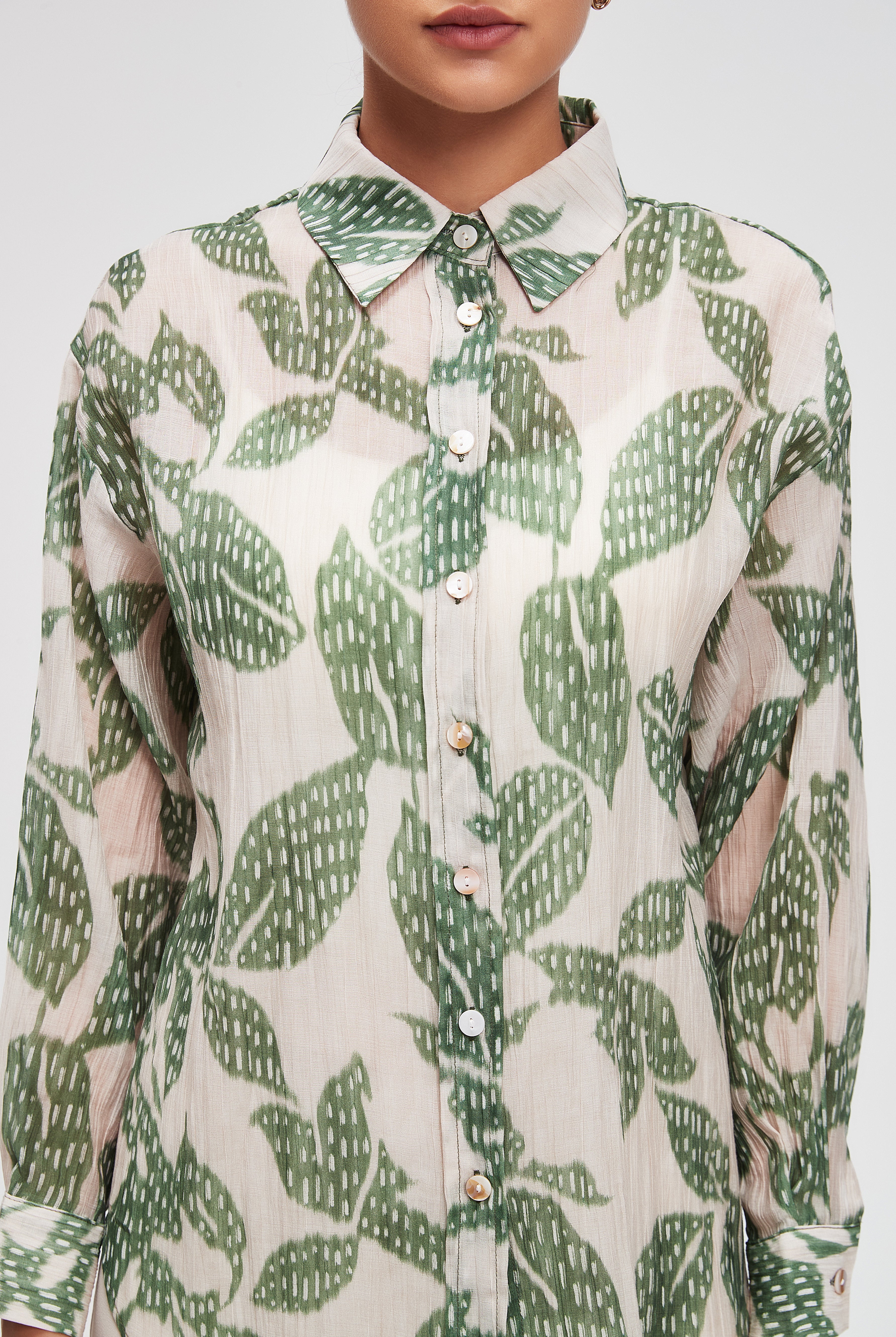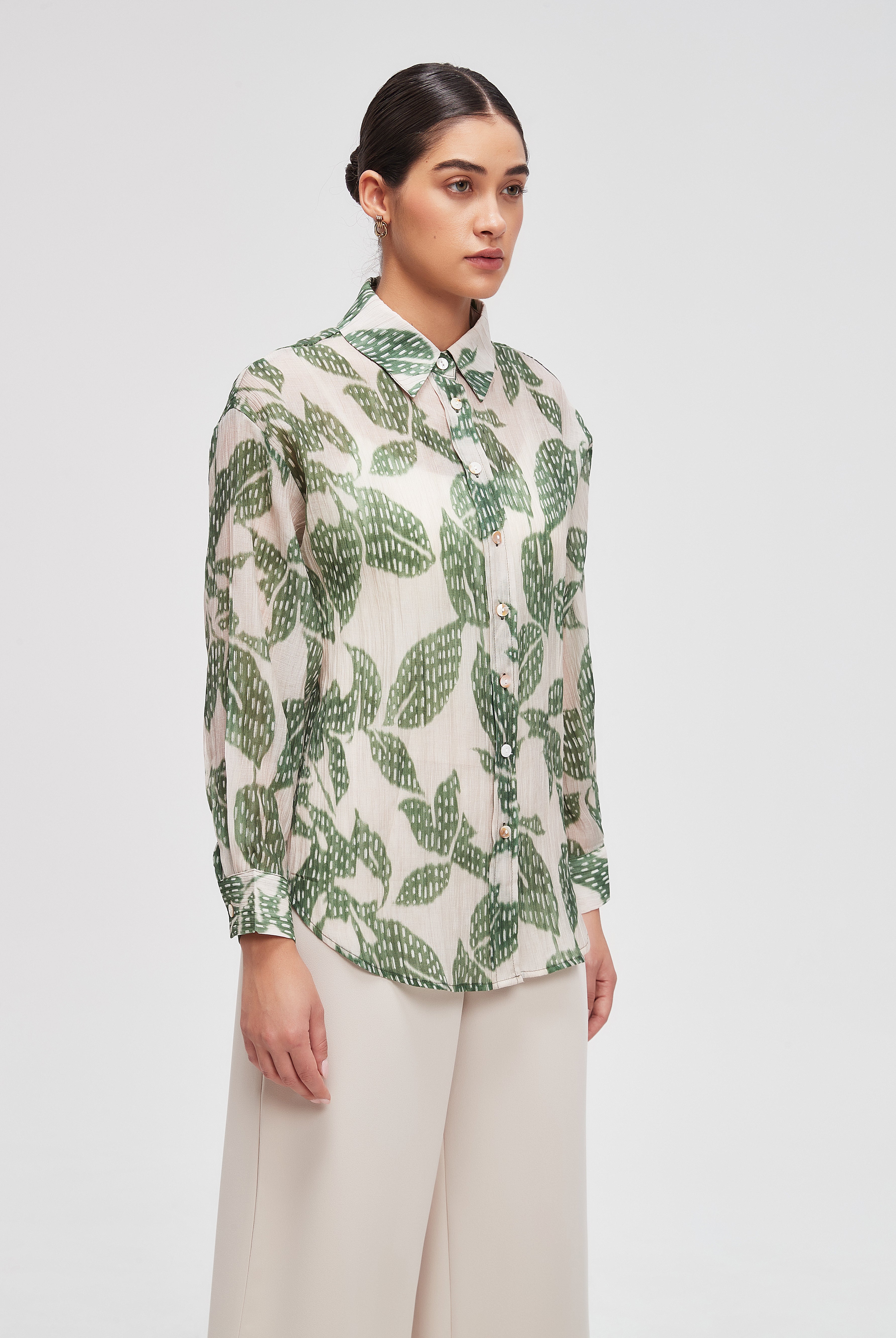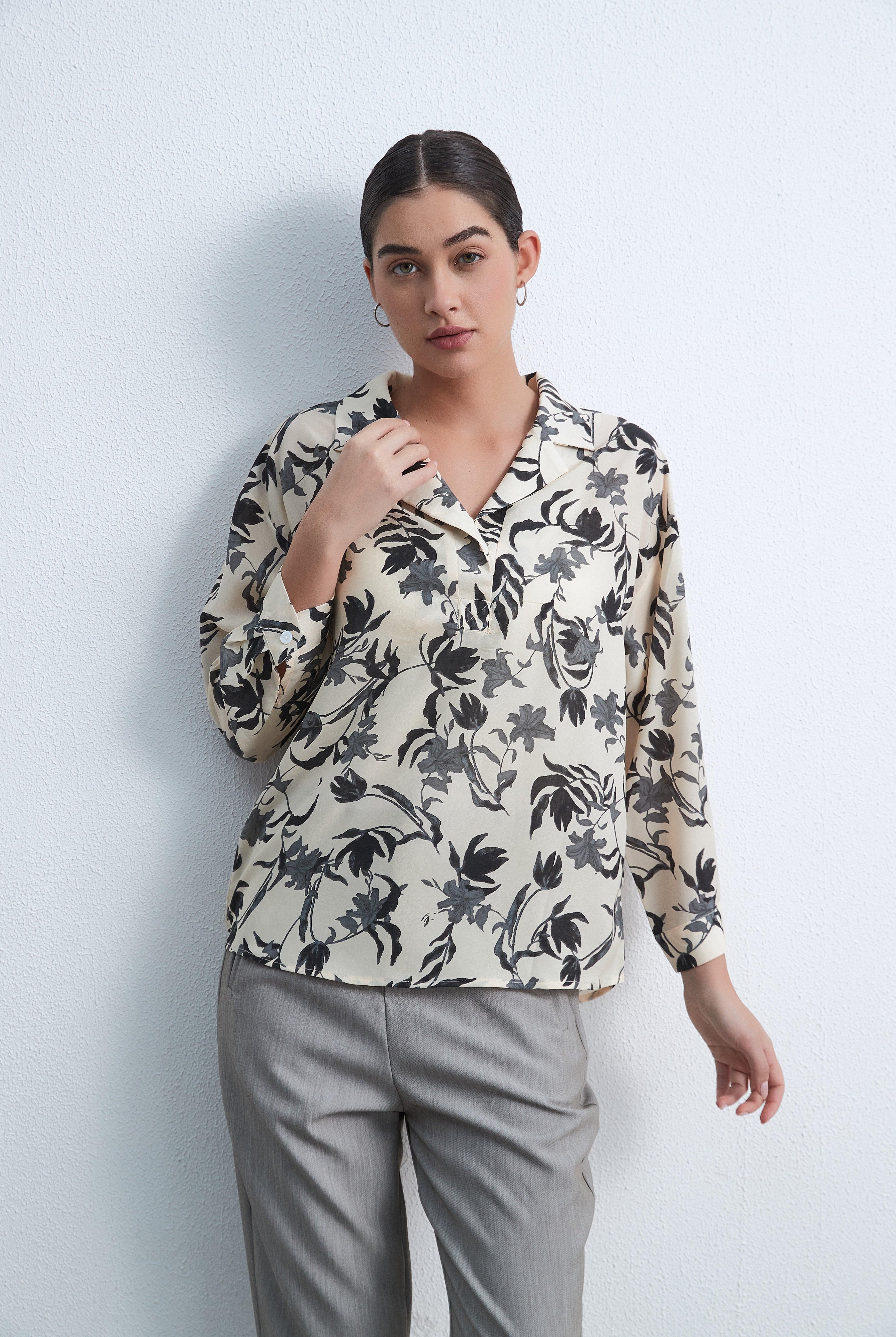 بلوزة بكم طويل بأوراق شجر وياقة قميص
