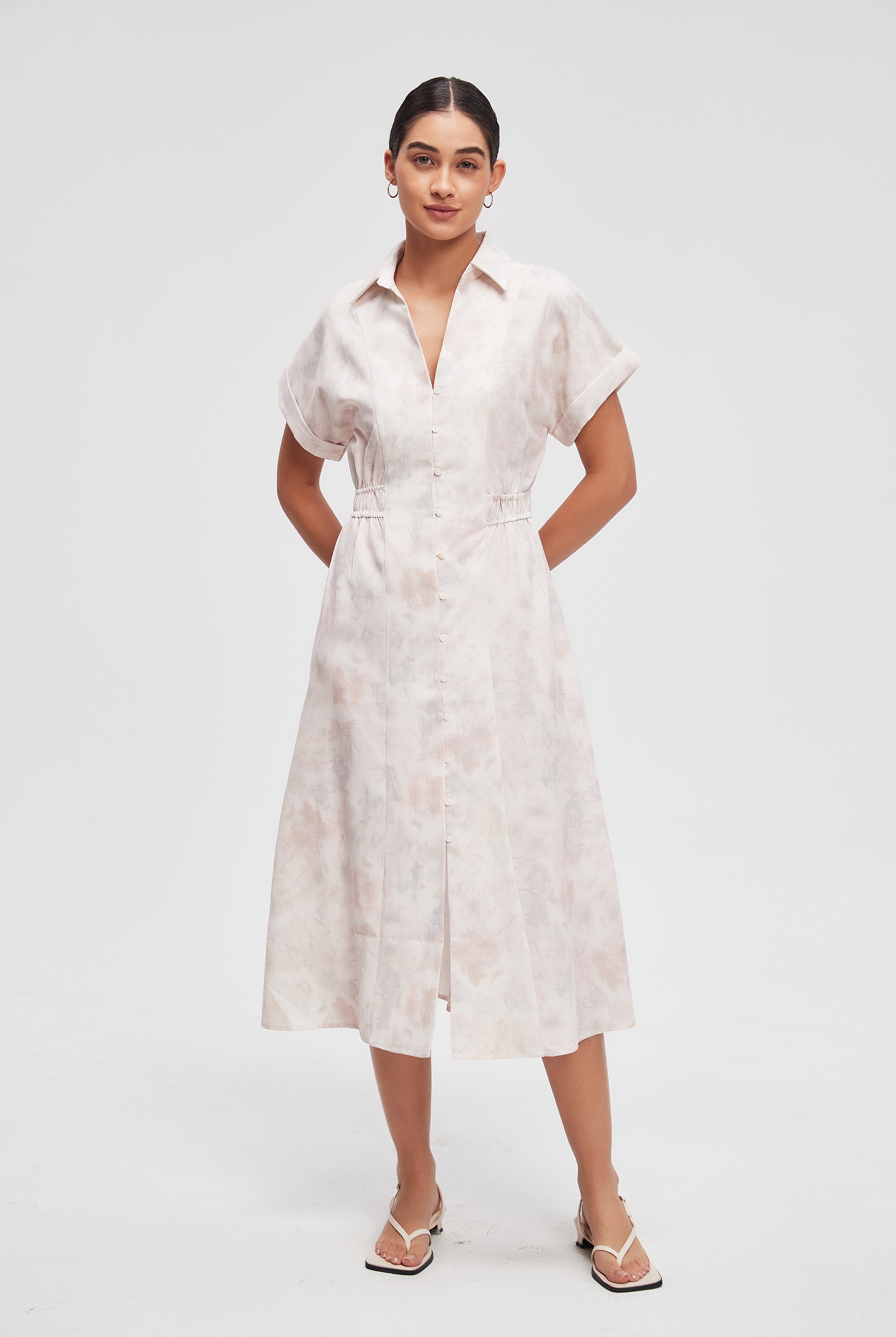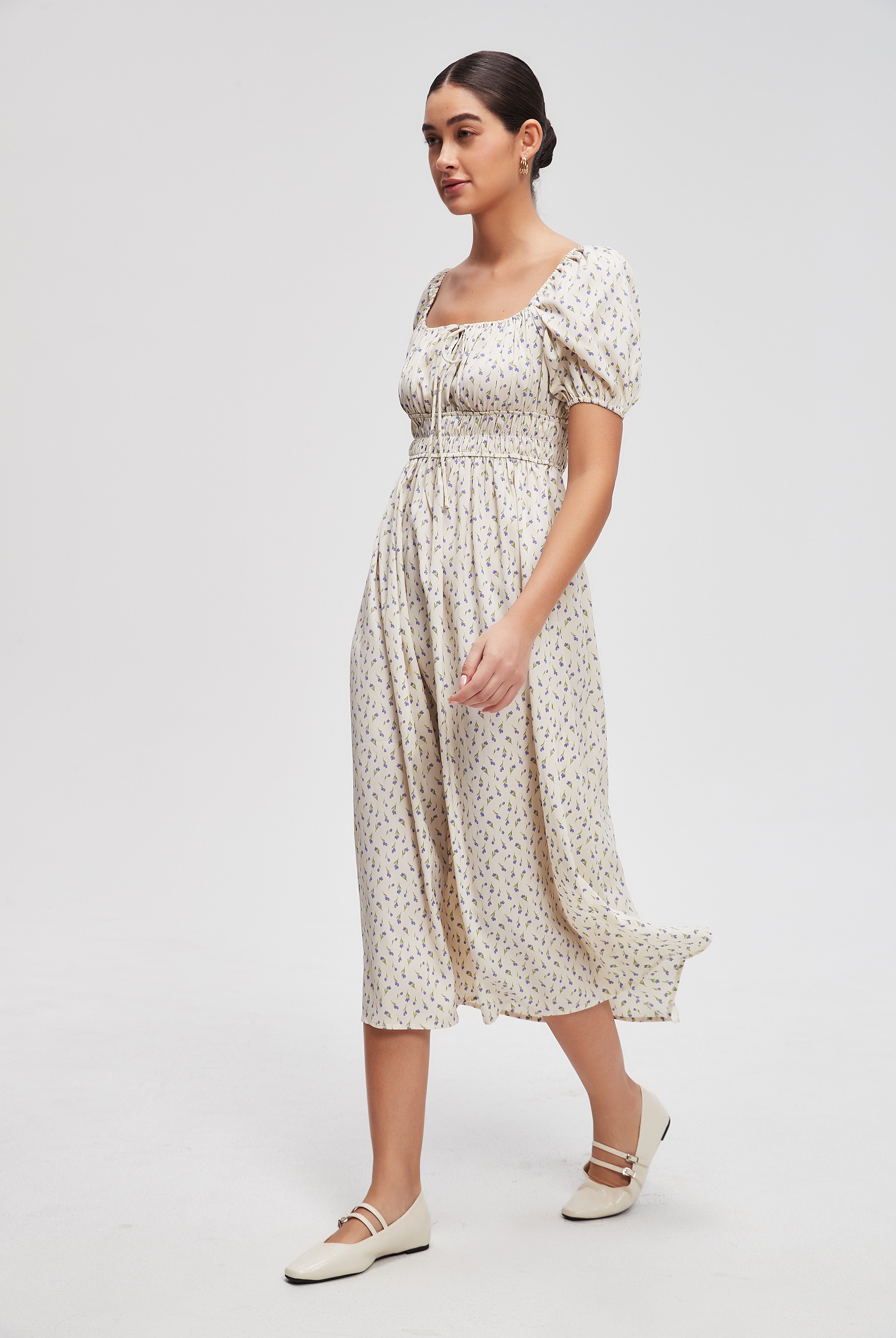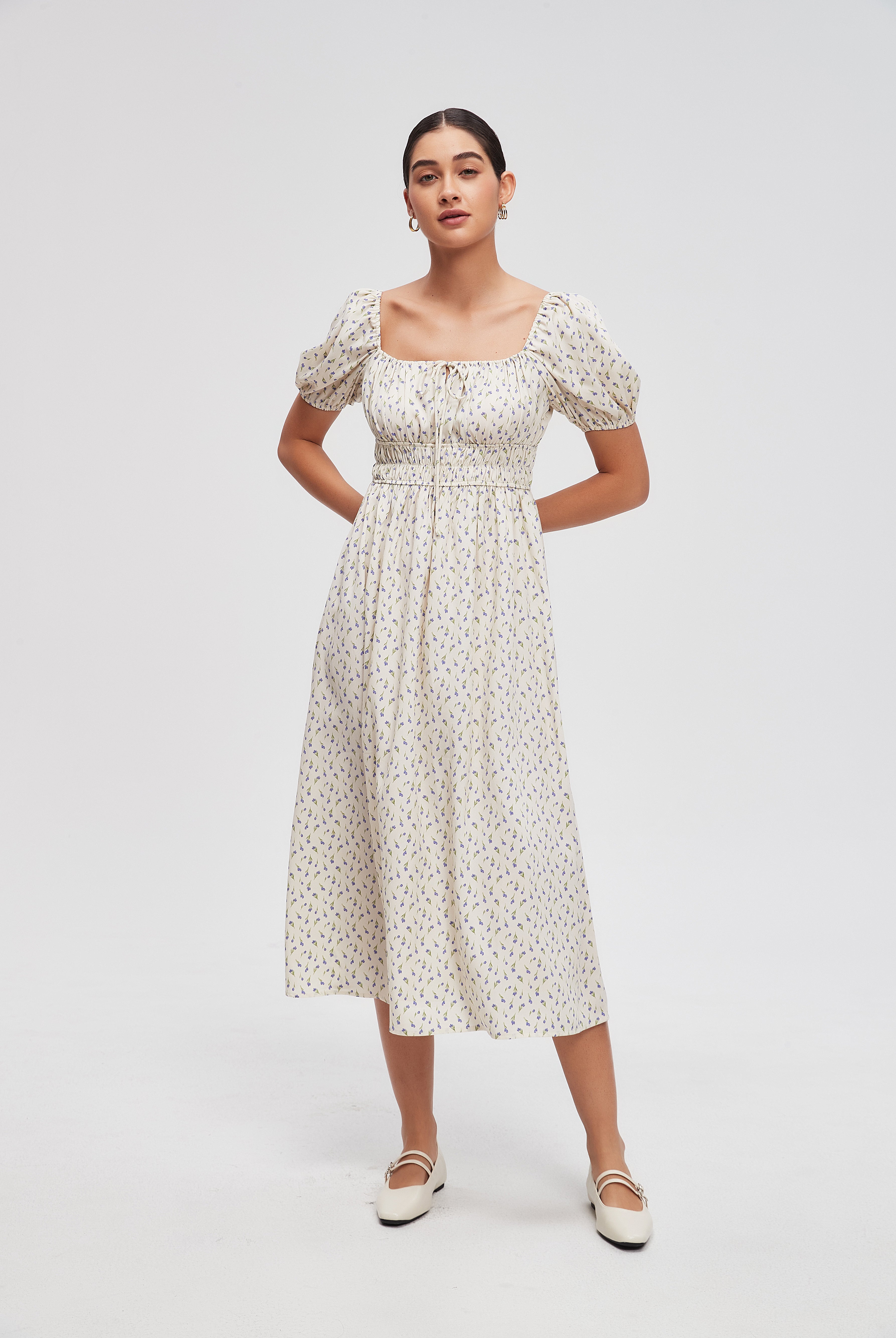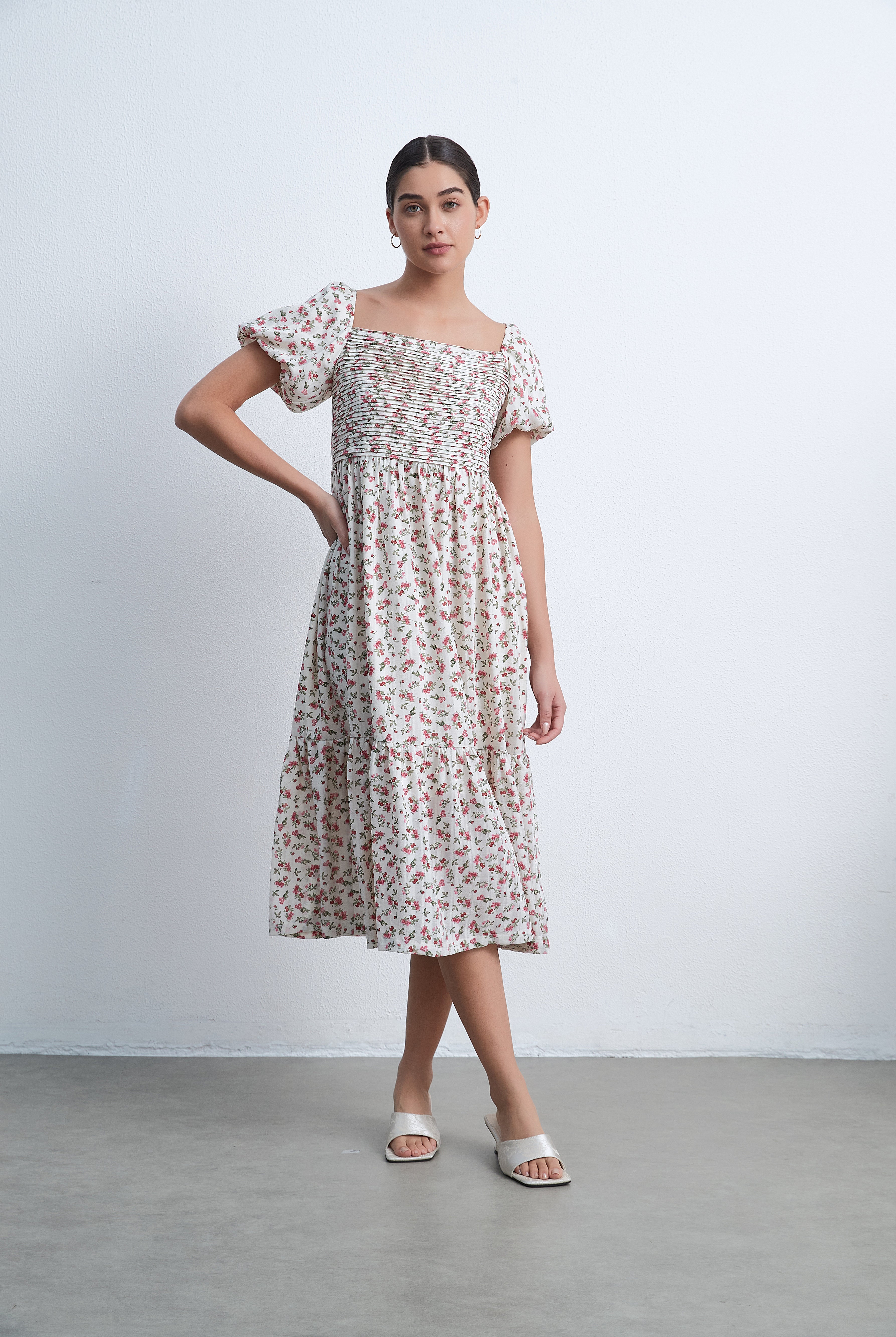 فستان ميدي بكم قصير منفوخ بقصة واسعة