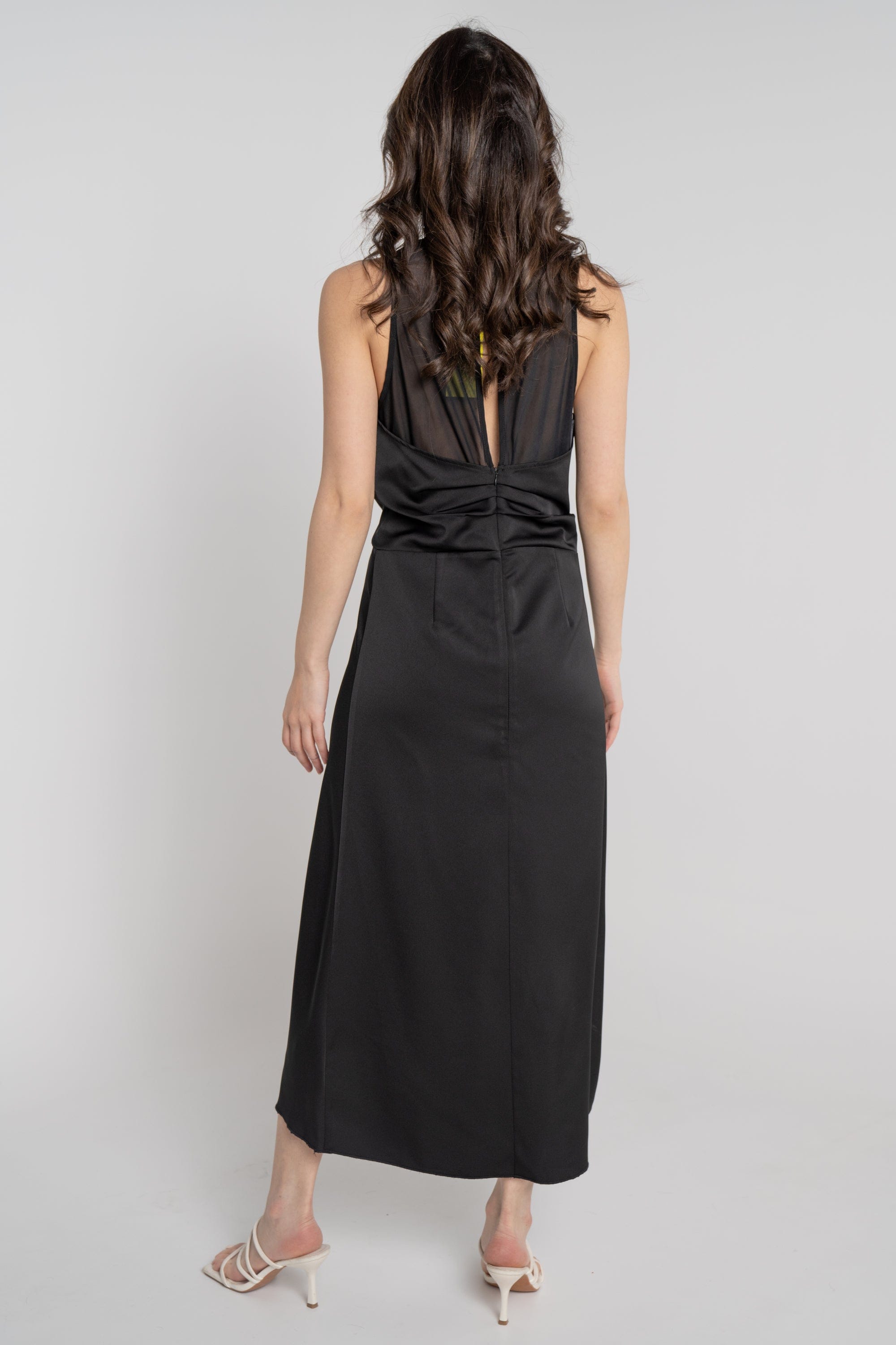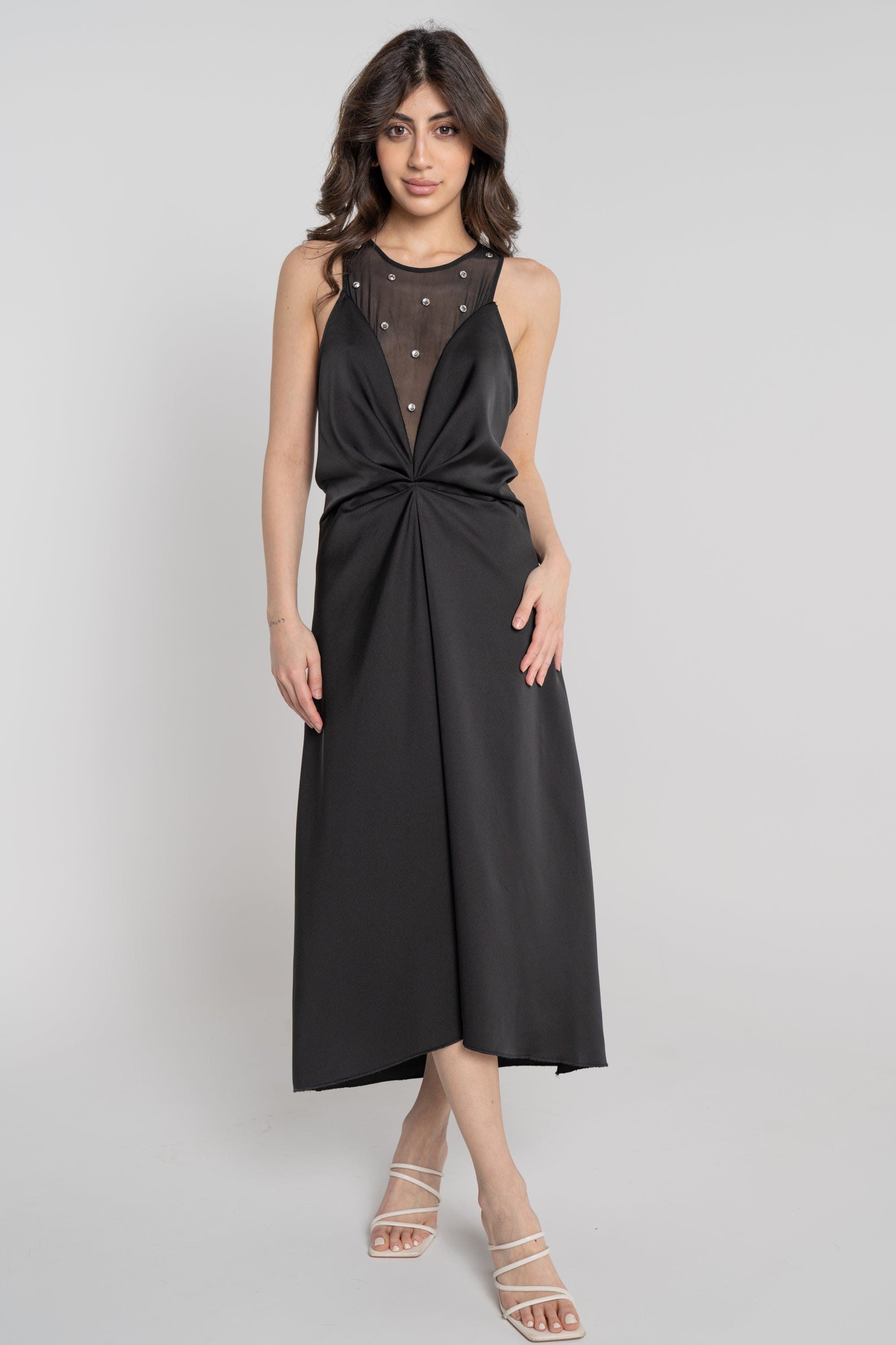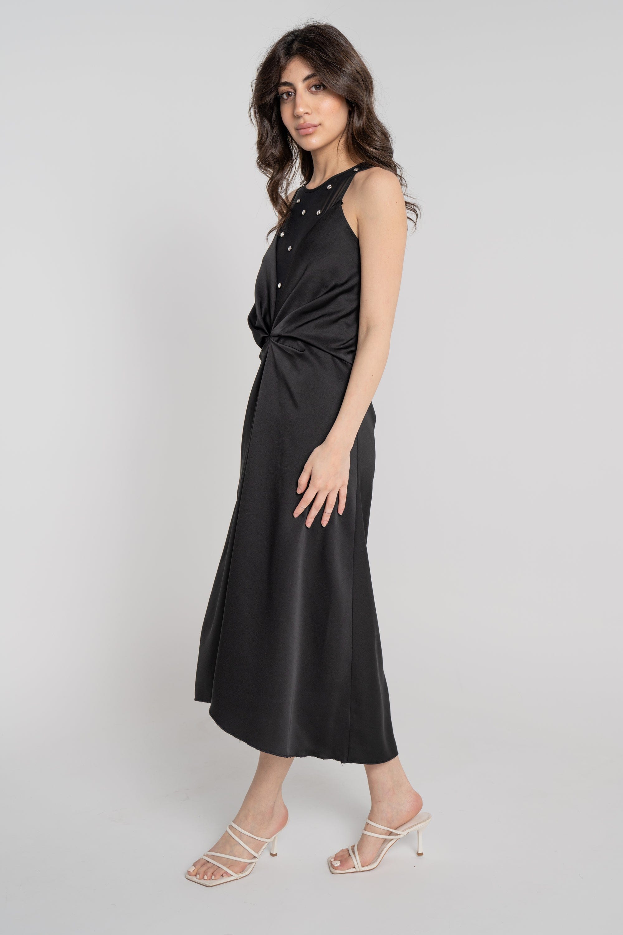 فستان ميدي بدون أكمام مخصر بفتحة صدر عميقة