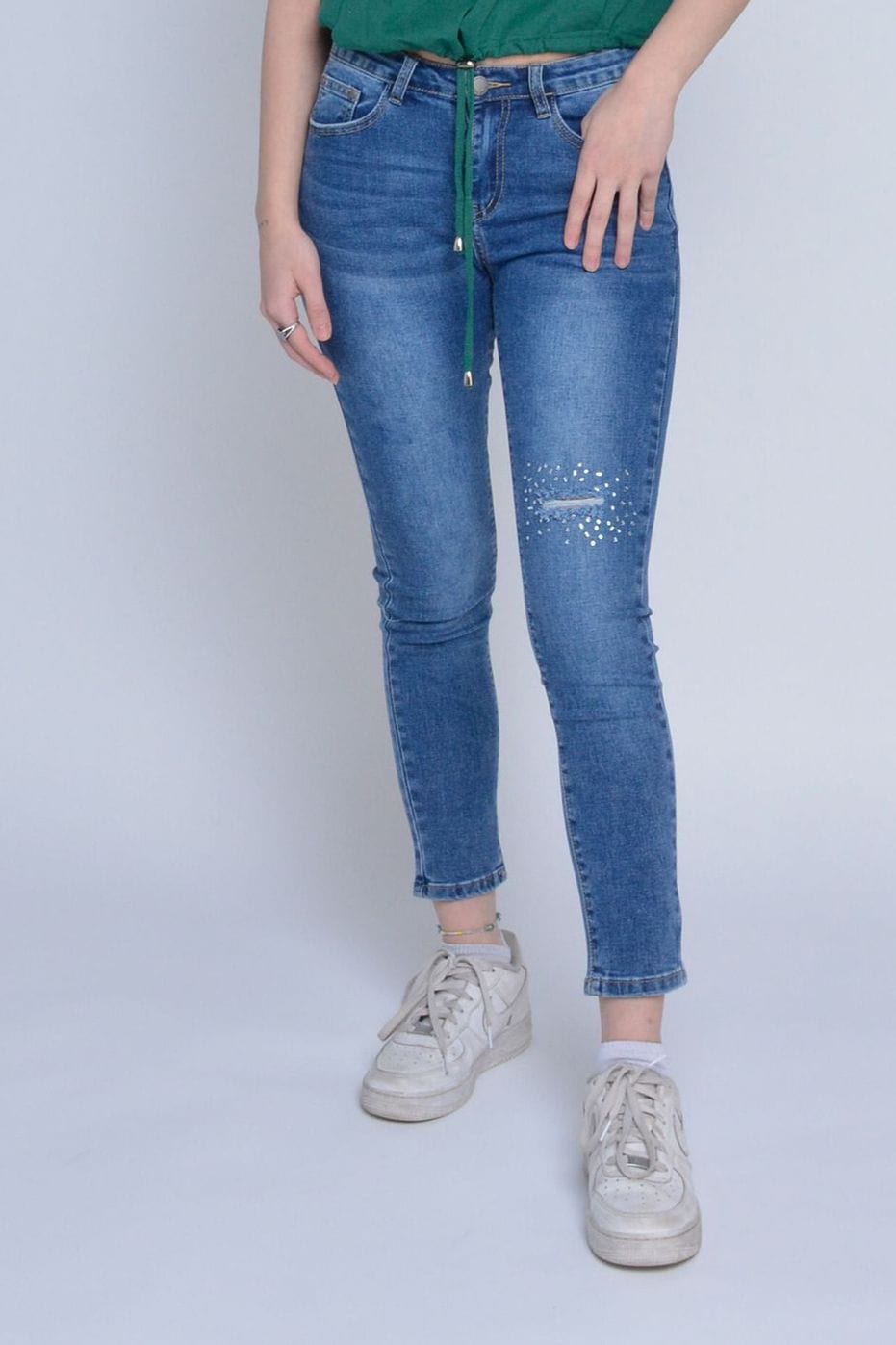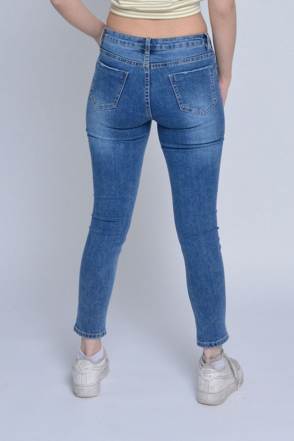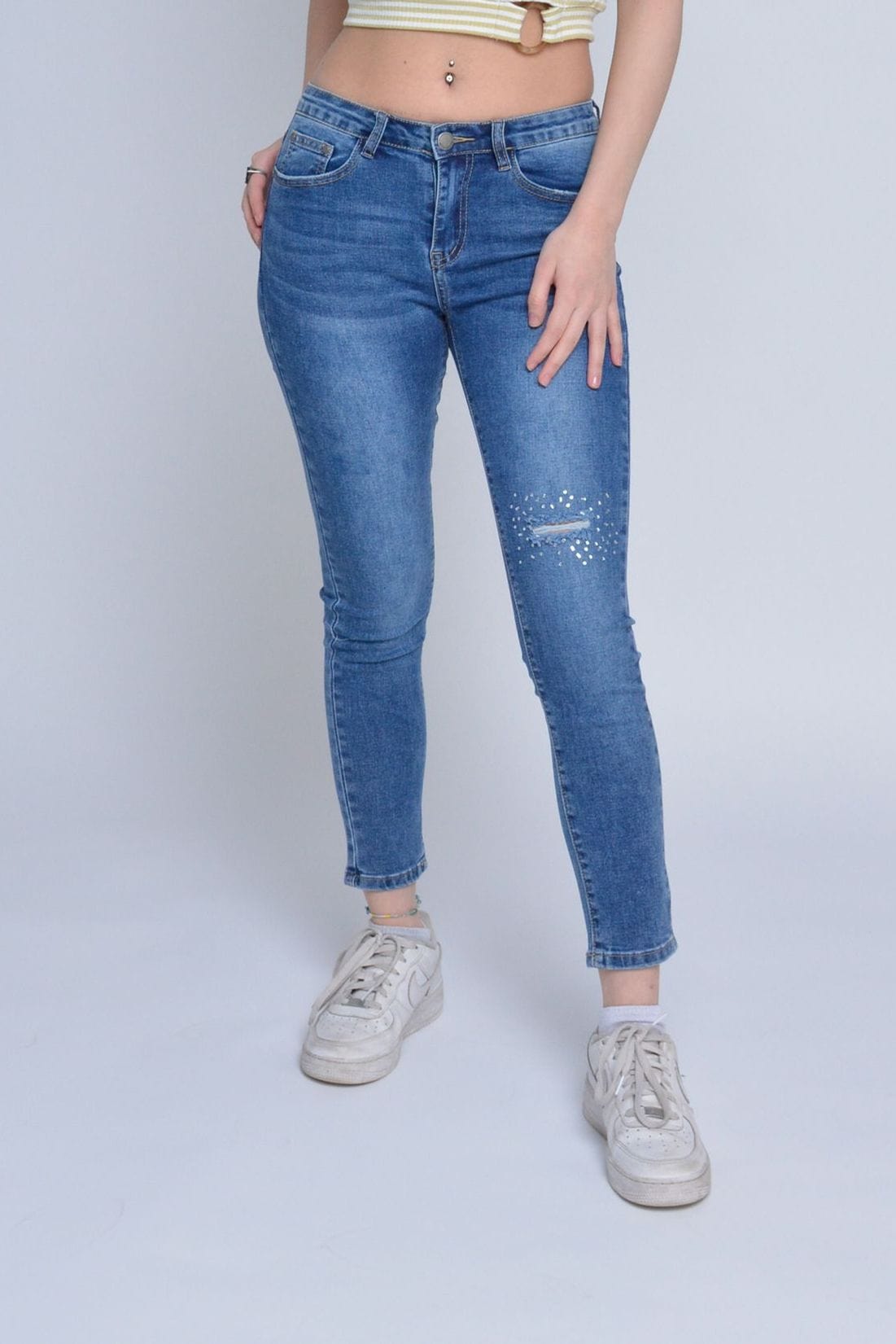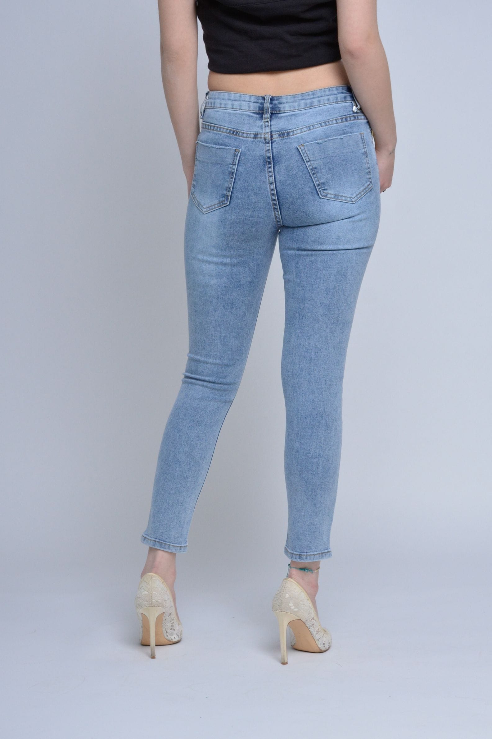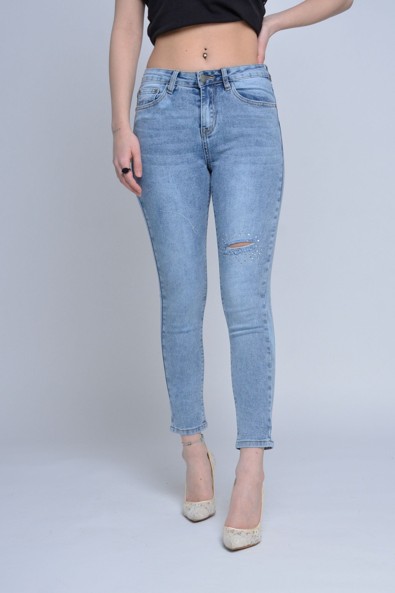 بنطلون جينز مقطع ومطرز بسحاب وزرار وجيوب طويل نسائي