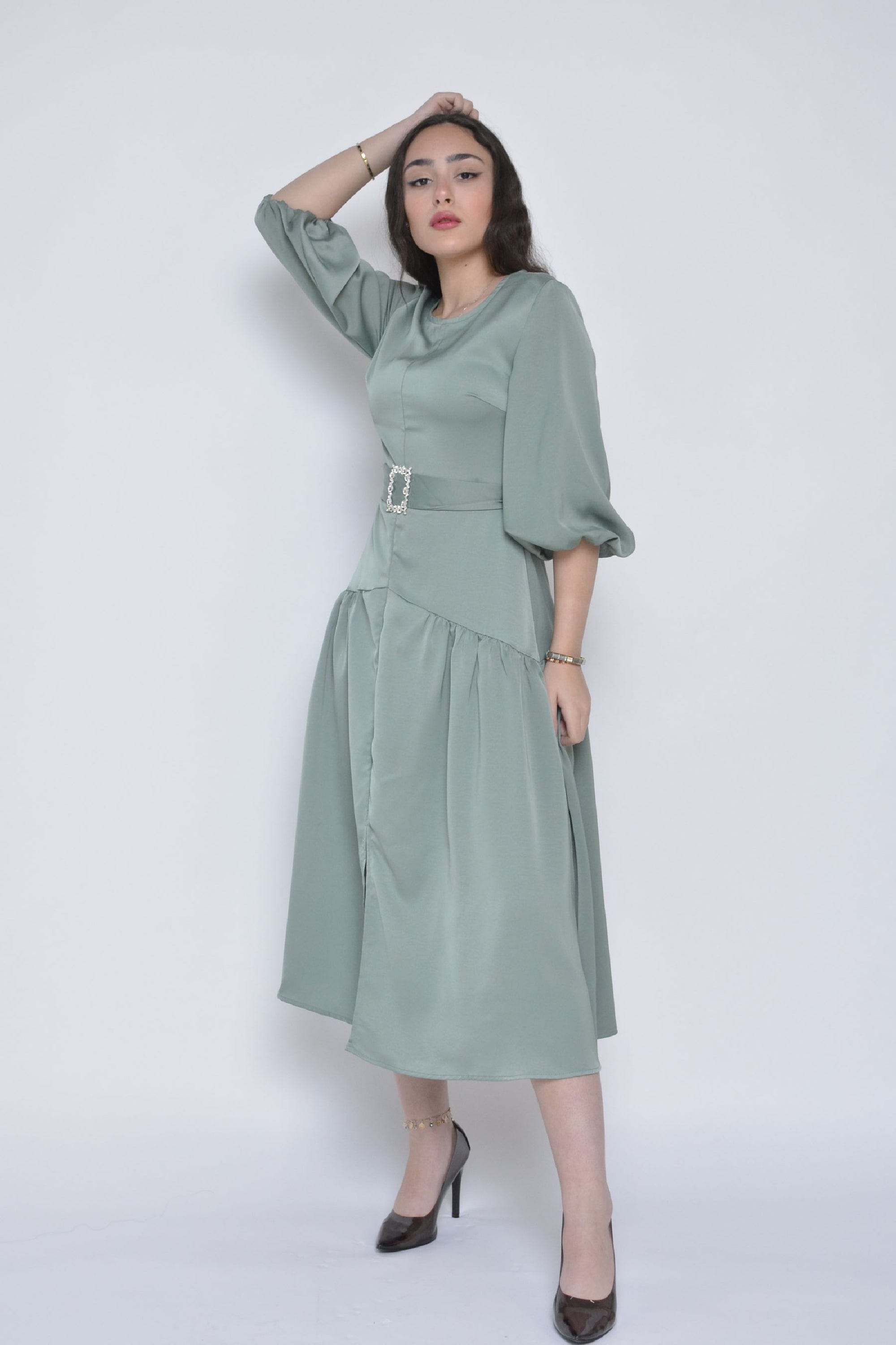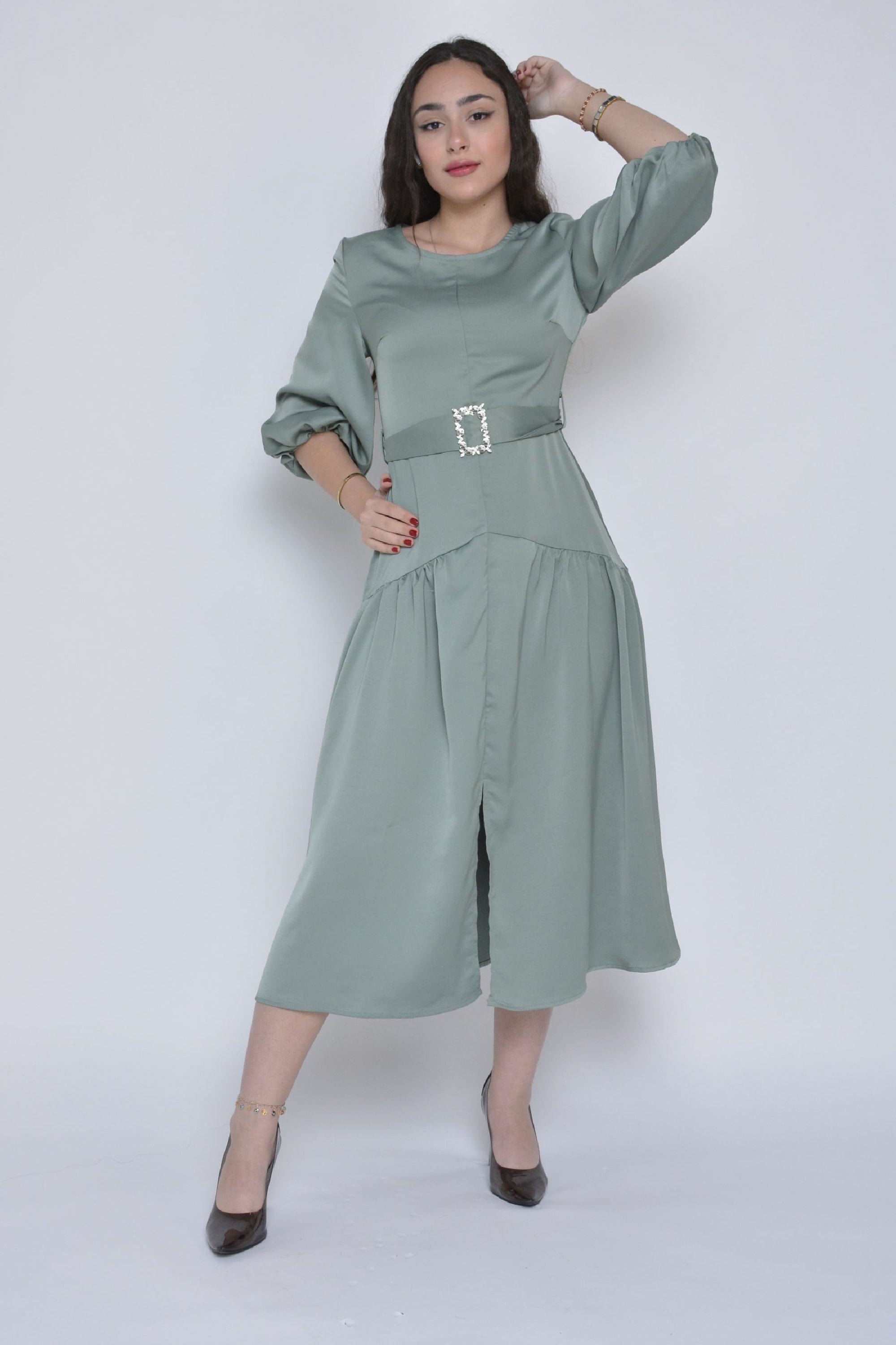 • تصميم سادة باللون الأخضر مع حزام مرفق لتحديد الخصر