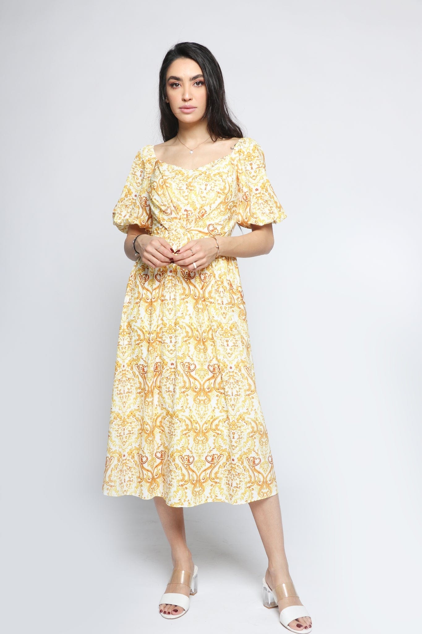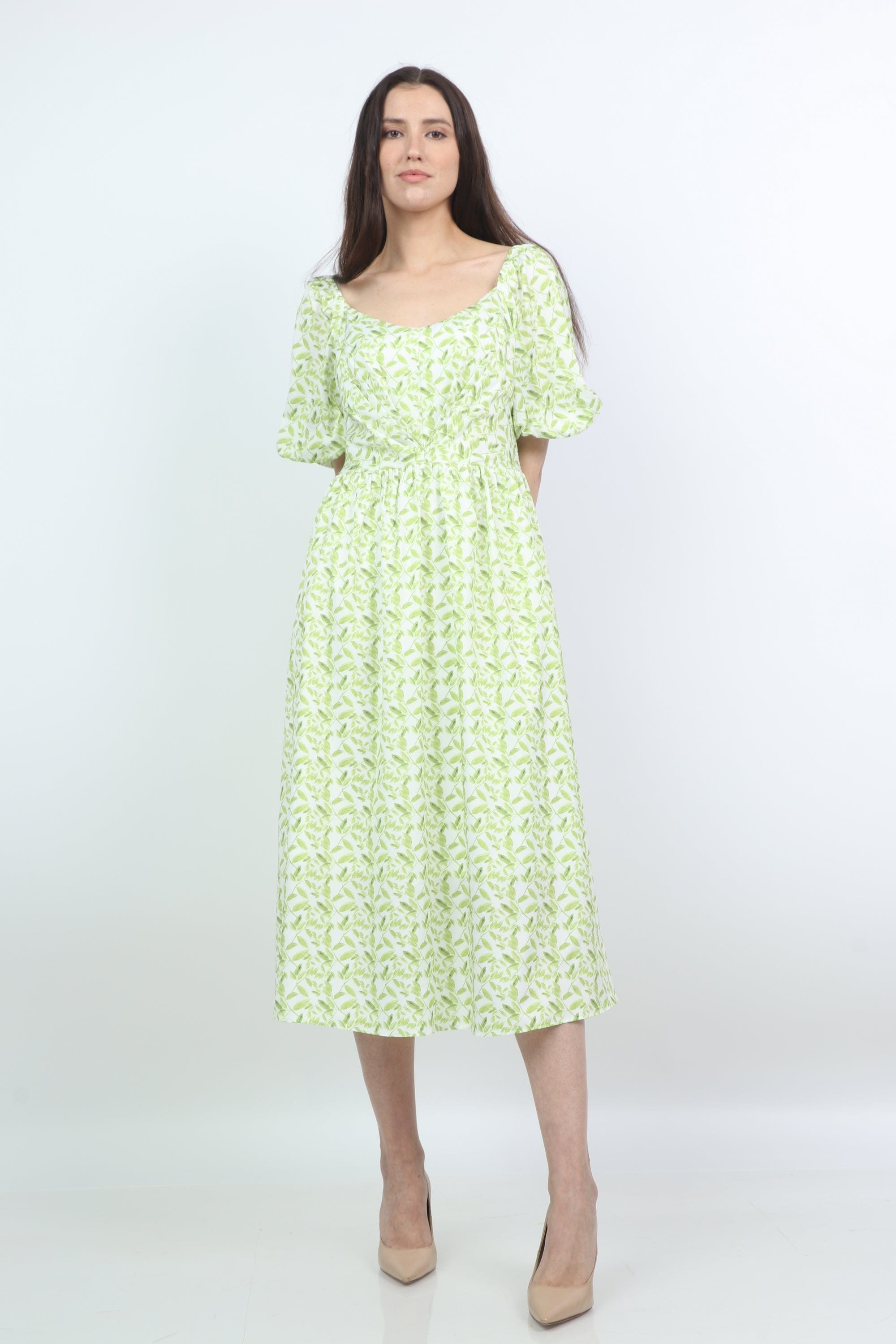 فستان ميدي بأكمام قصيرة مشجر بفتحة صدر عميقة
