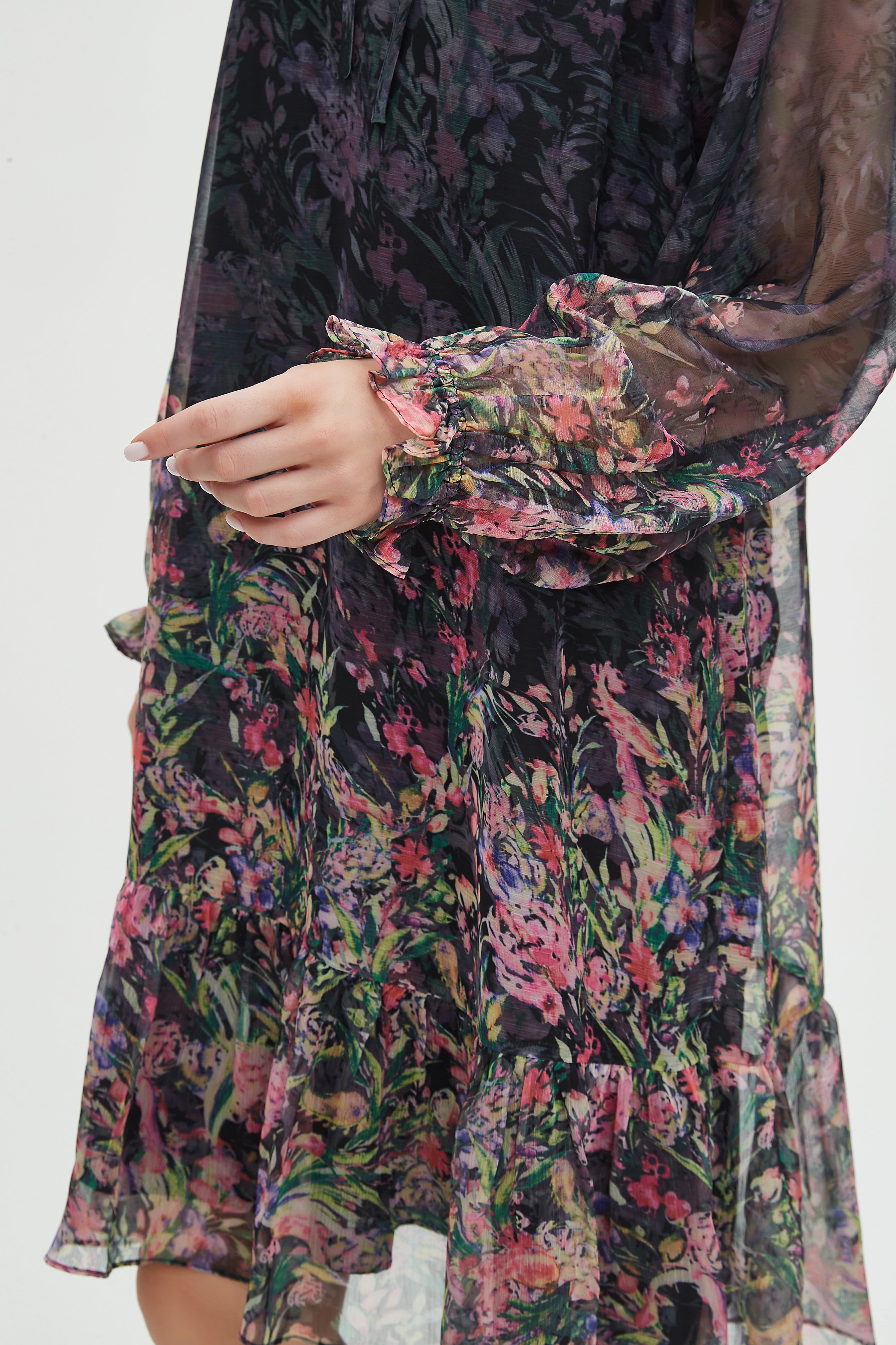 - التنسيق: نسقيه مع الصنادل للنهار أو حذاء سنيكر بسيط للخروجات الكاجوال، أضيفي كارديغان خفيف أو جاكيت جلد في الخريف، وحافظة مجوهرات بسيطة لإبراز النقشة الزهرية.