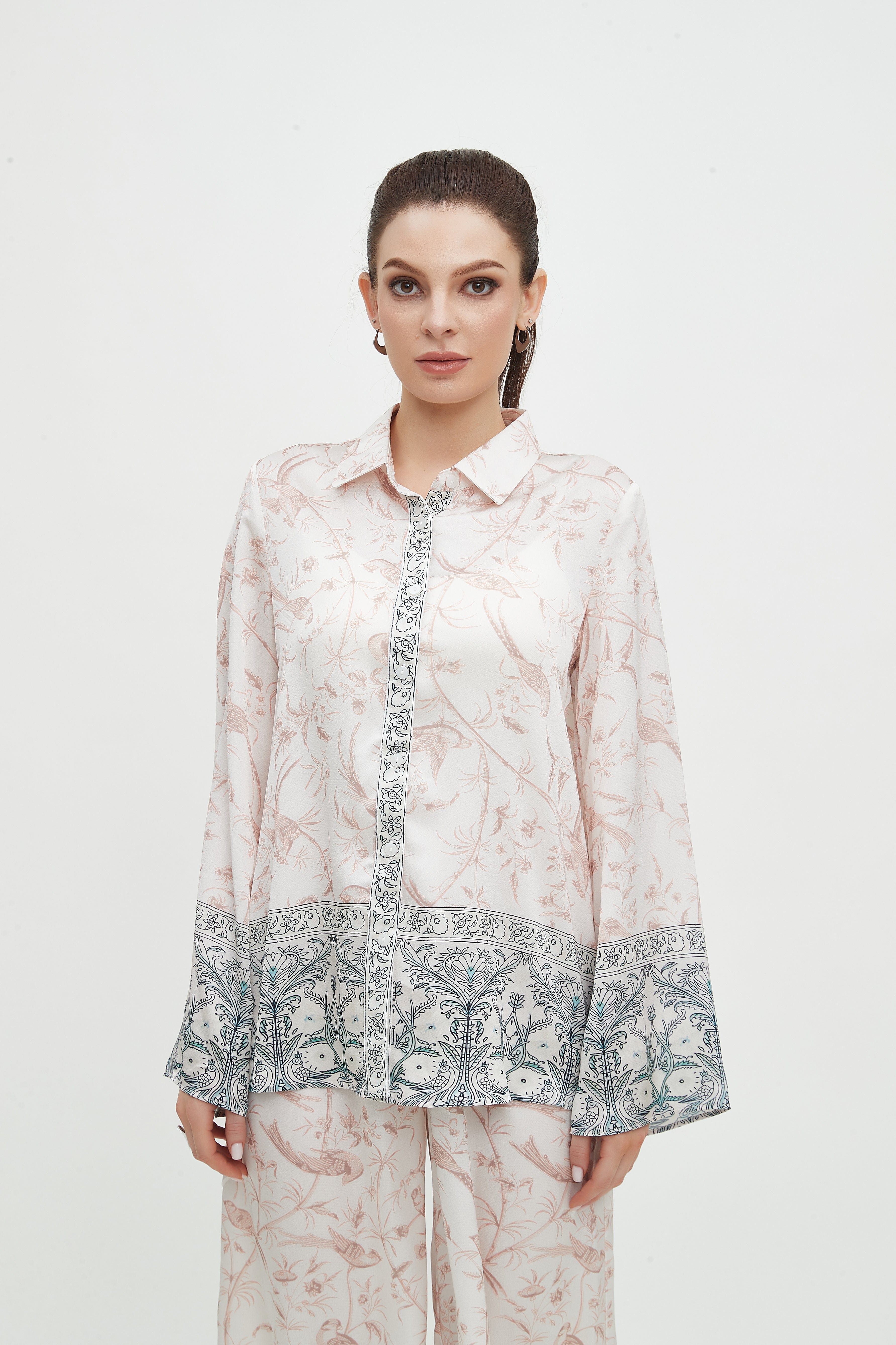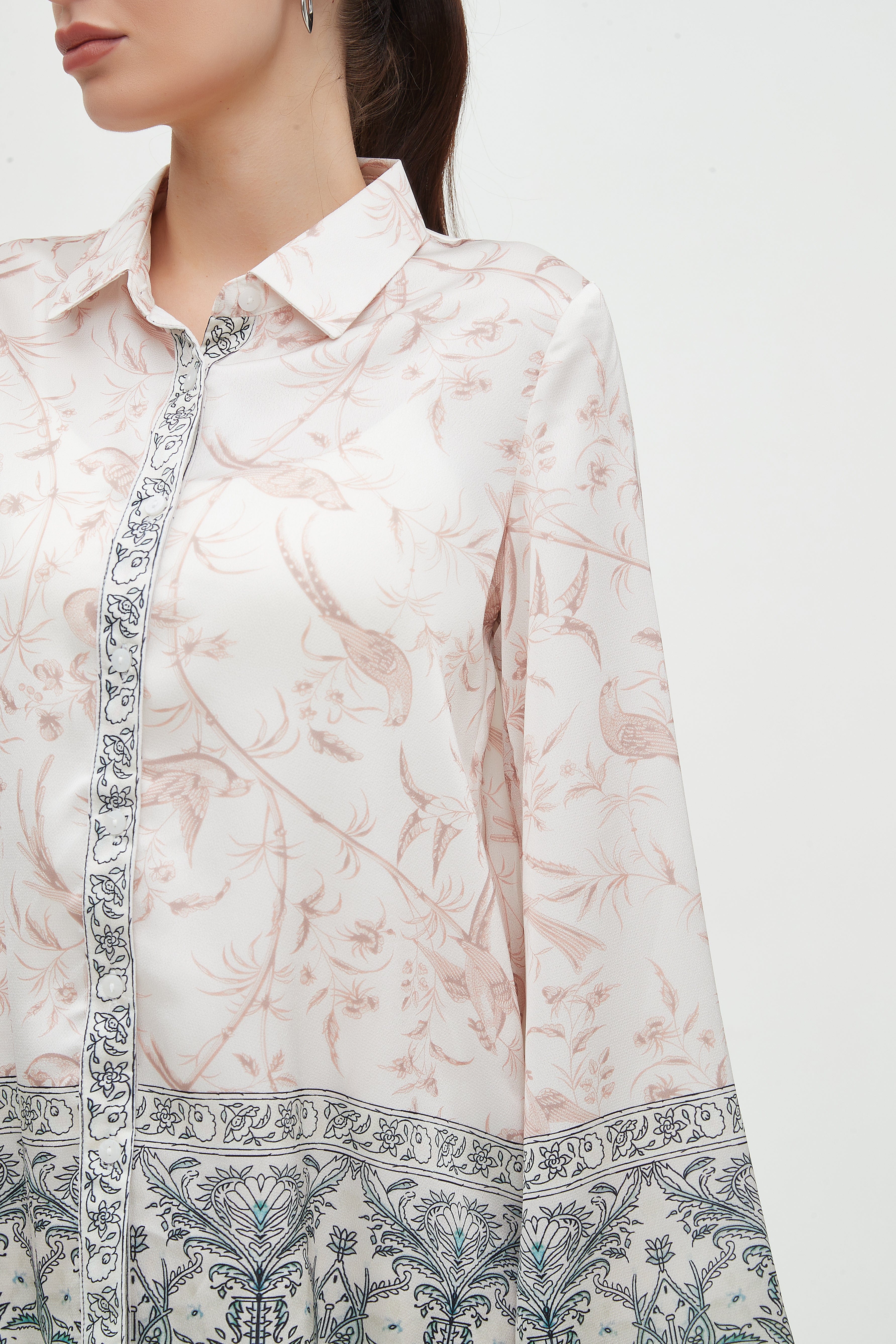بلوزة منقوشة بلوزة بطول الخصر بياقة قميص وأزرار