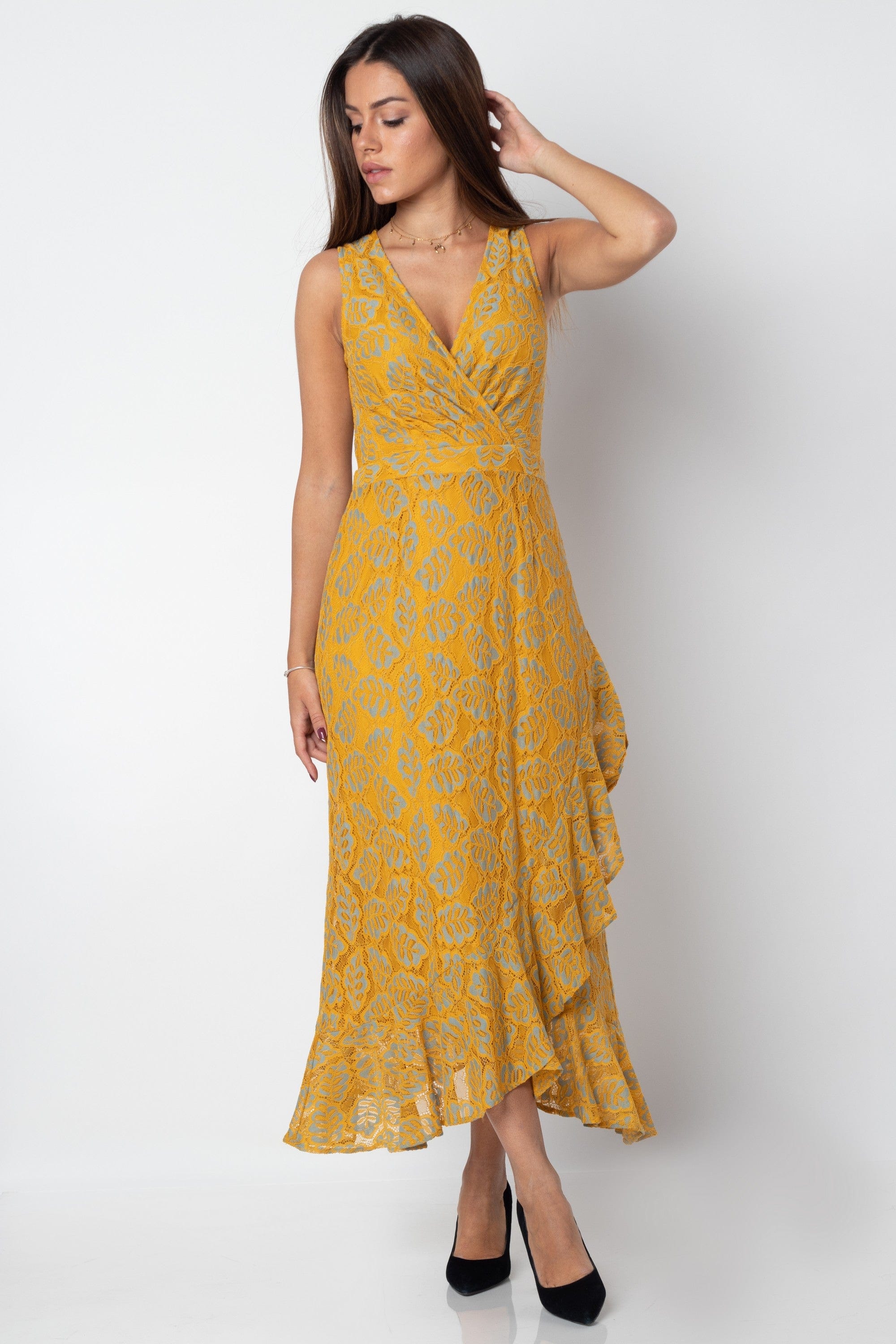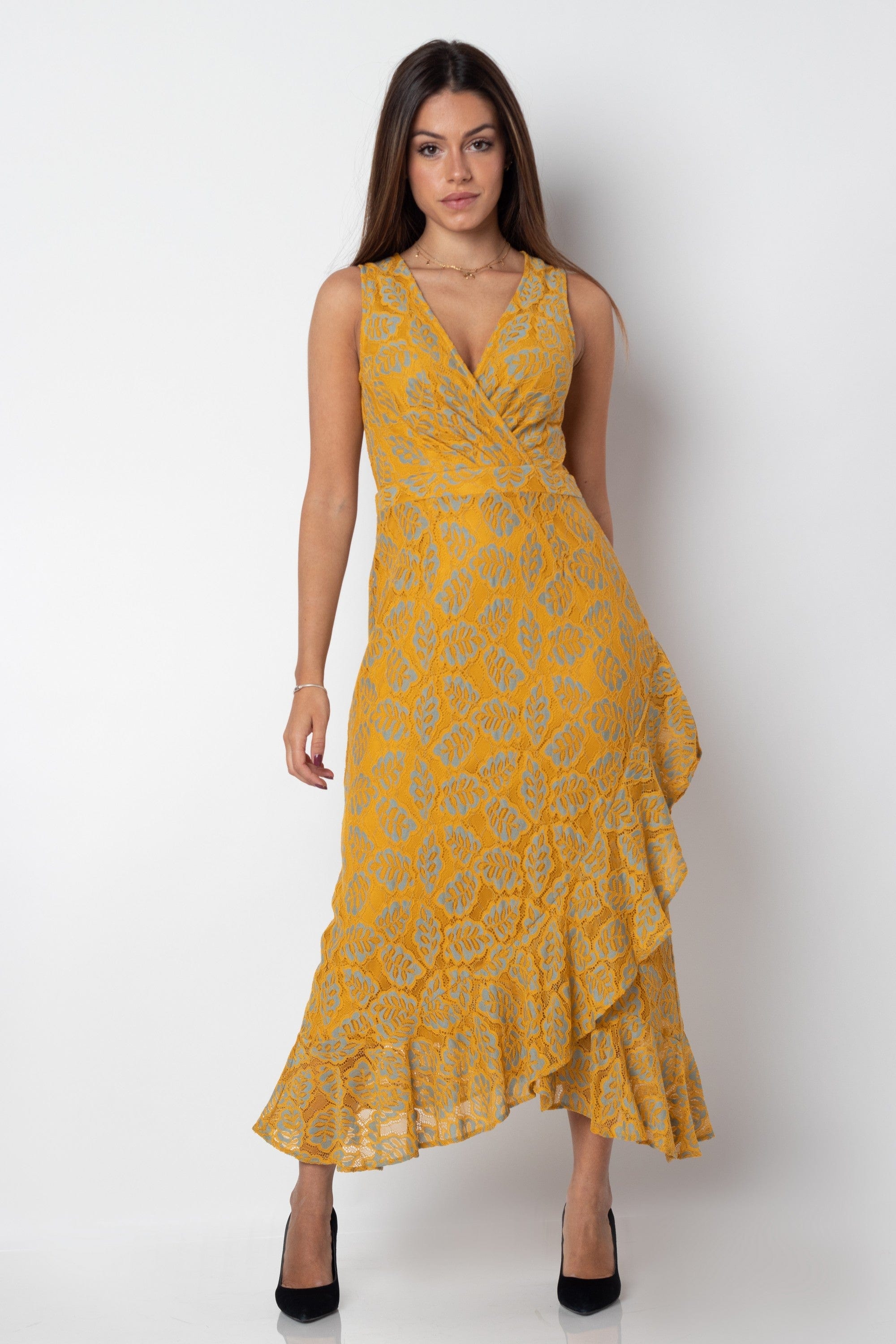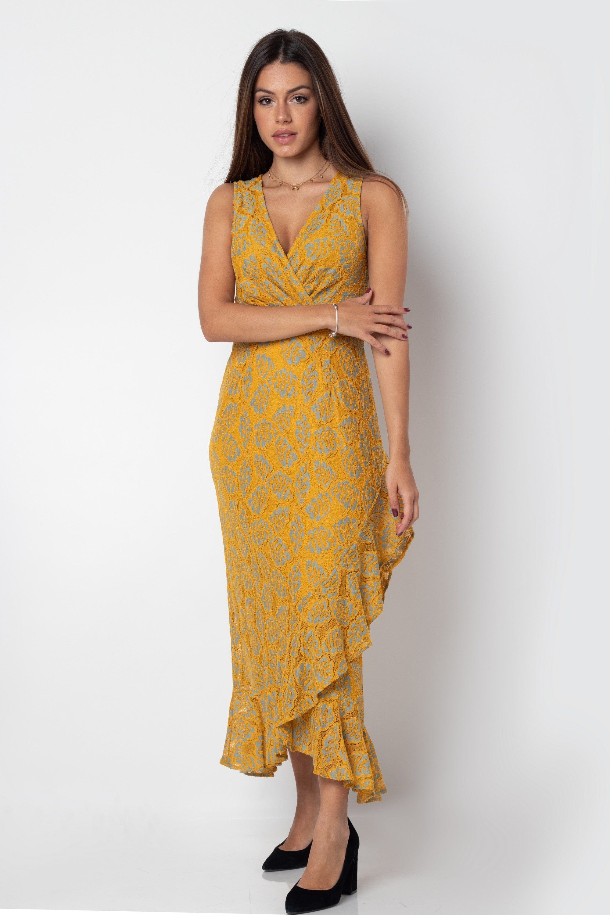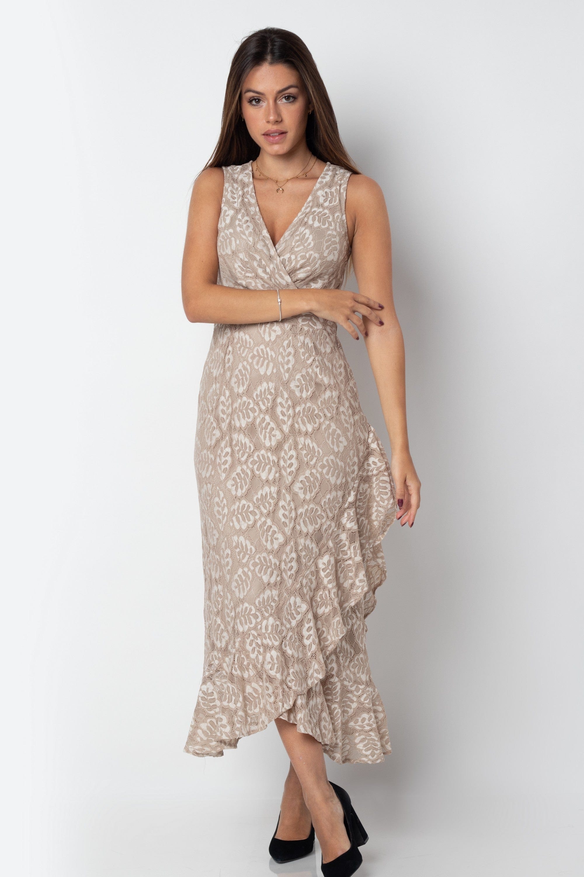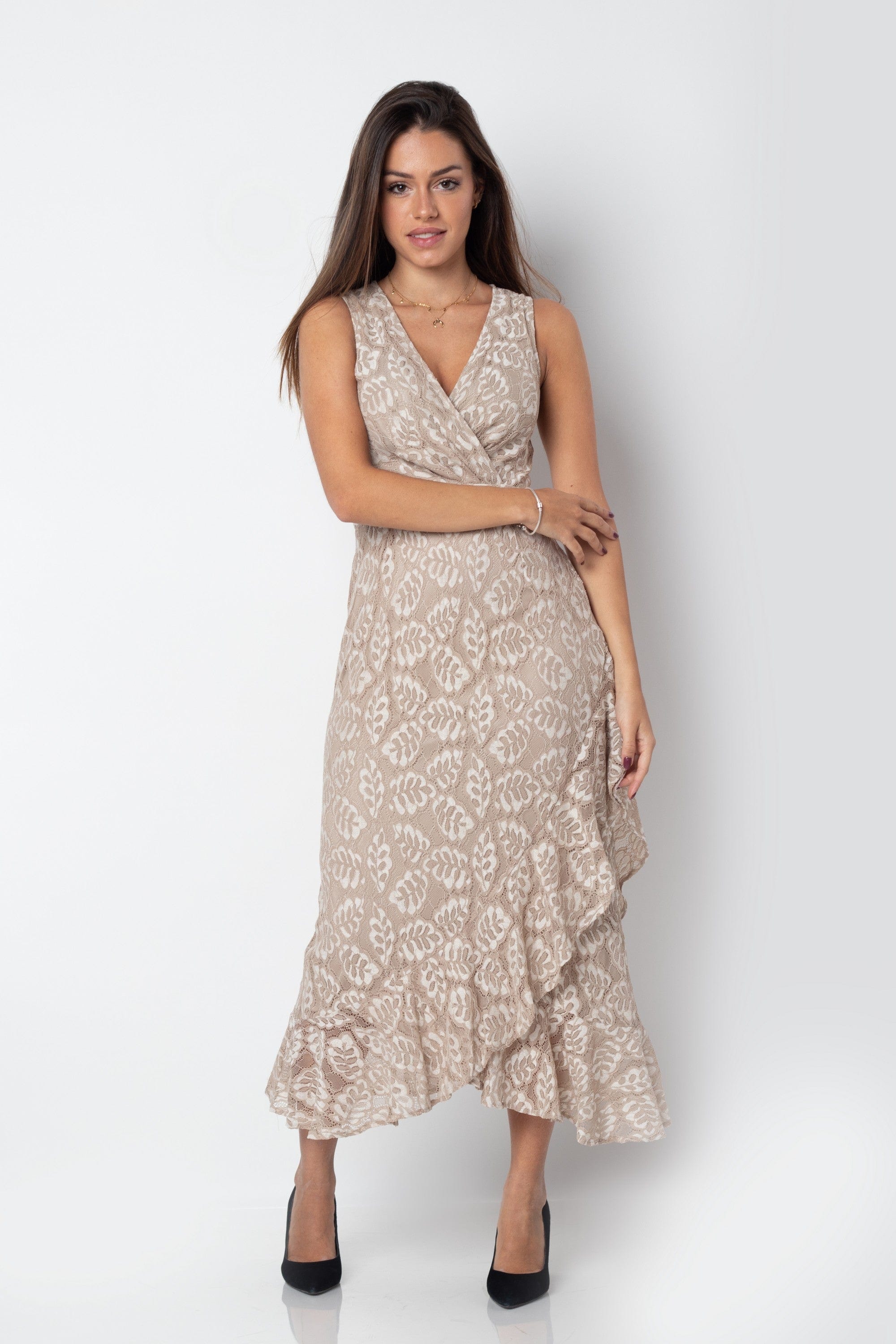 فستان ميدي ملفوف منقوش بفتحة صدر v بدون كم