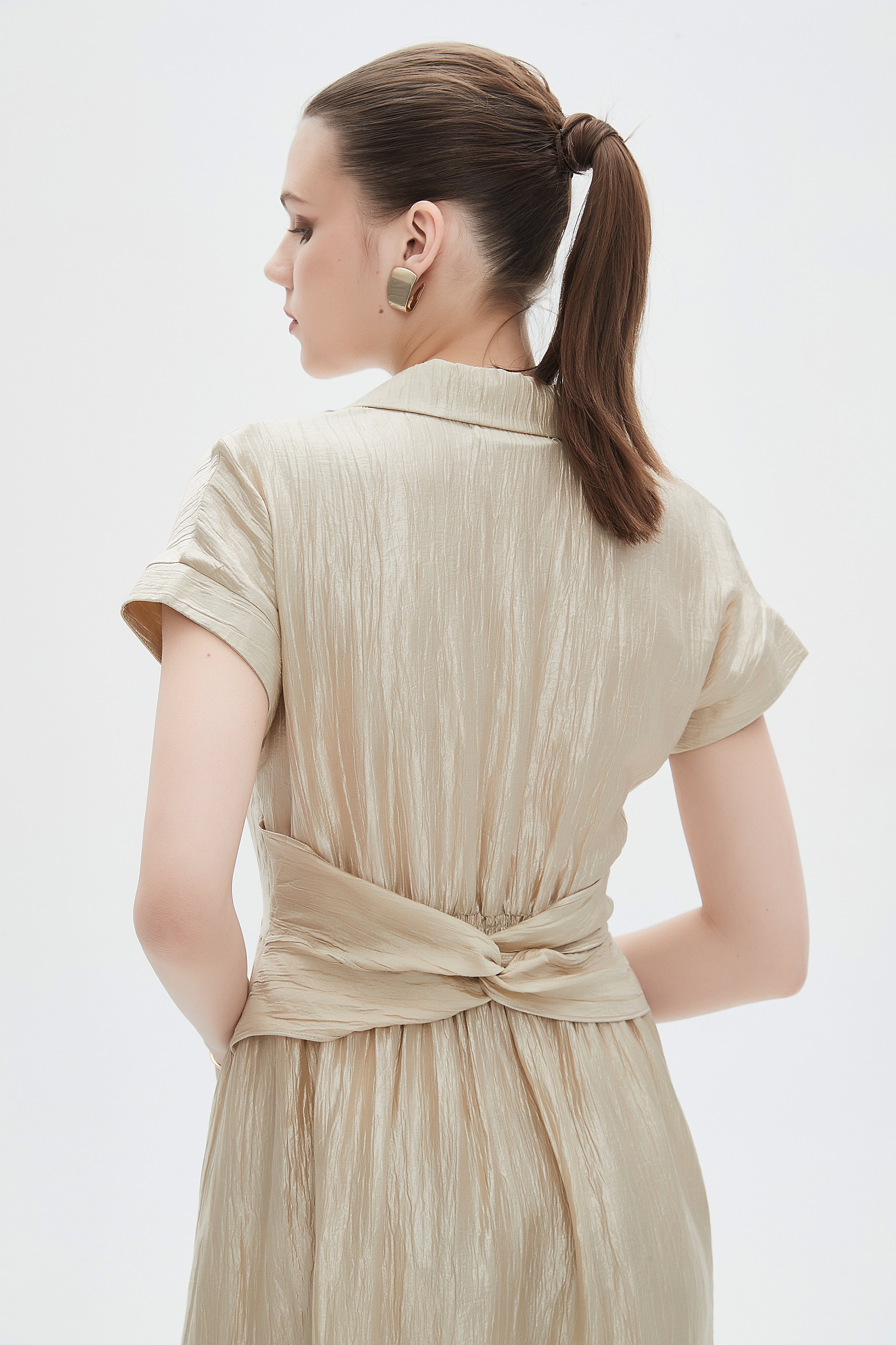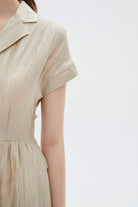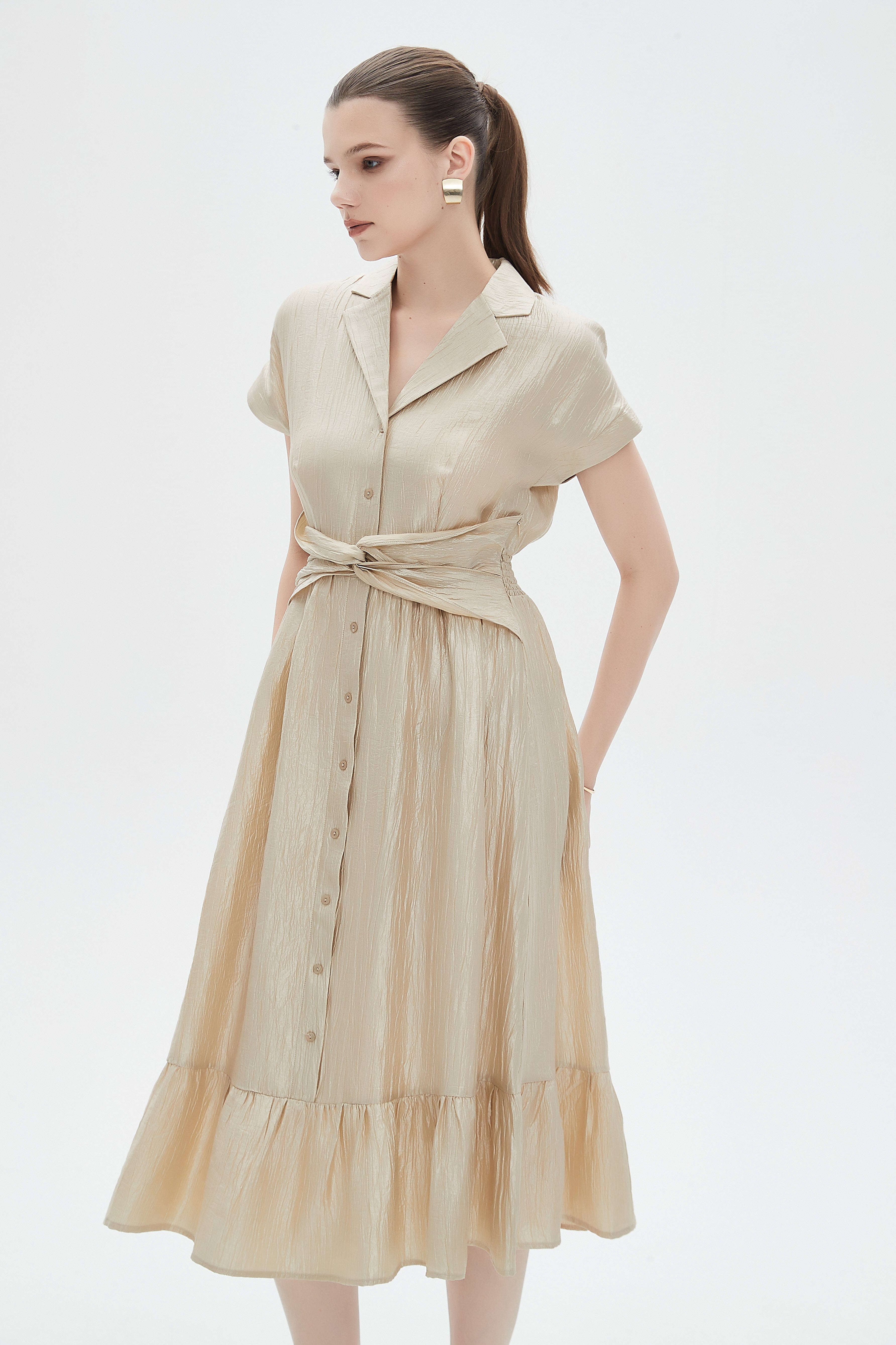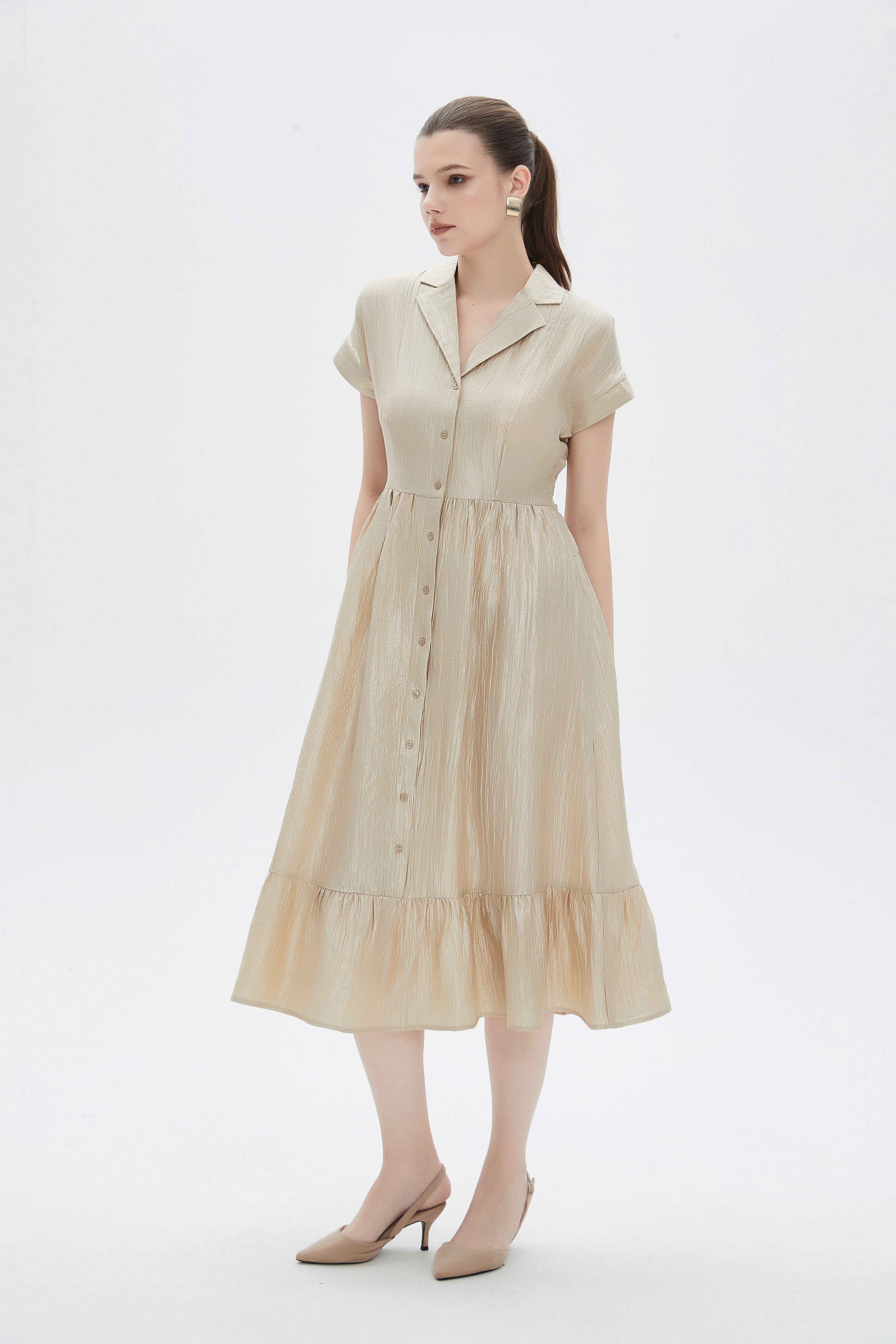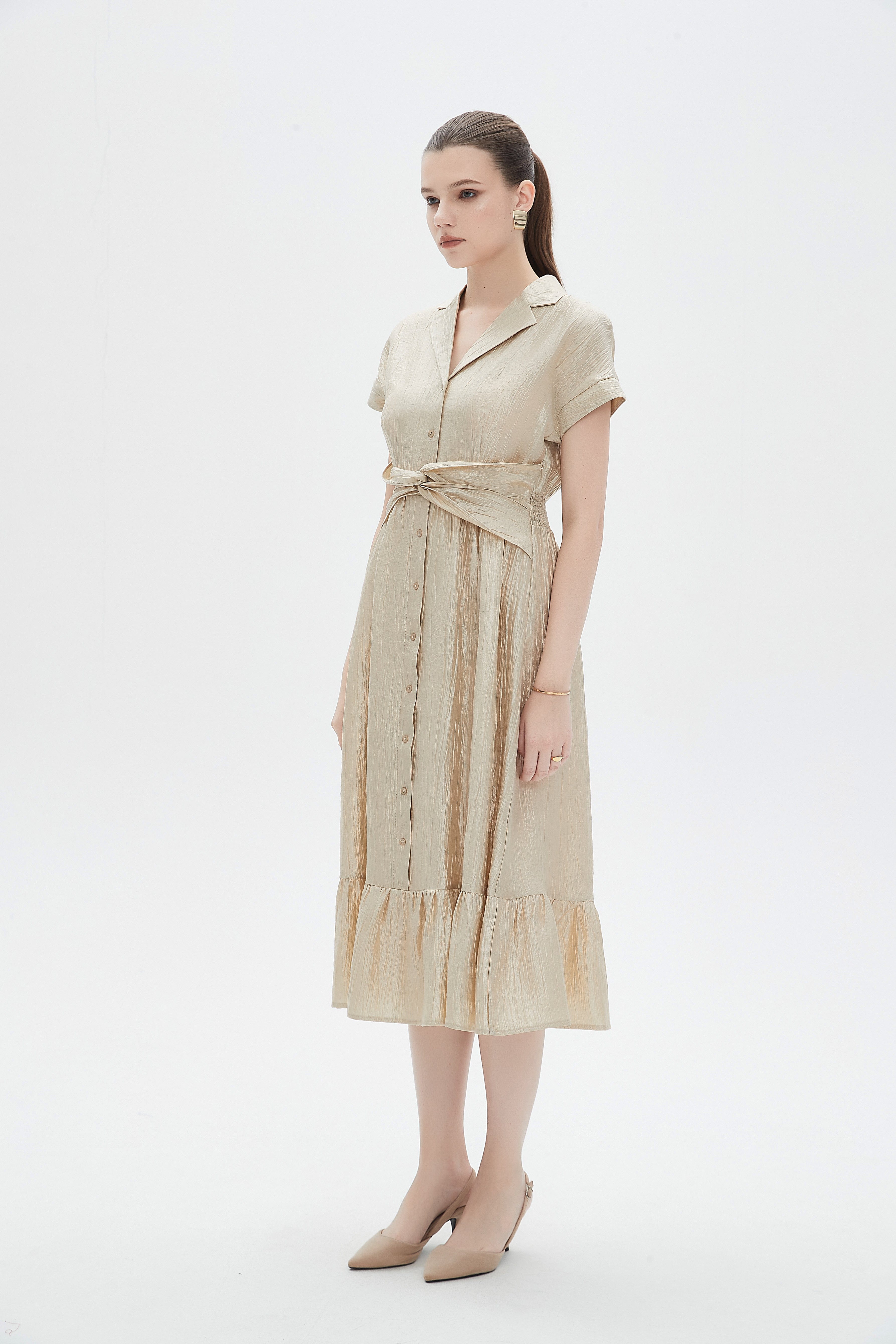 فستان نسائي ميدي بكم قصير مع ياقة قميص بتفاصيل كشكش