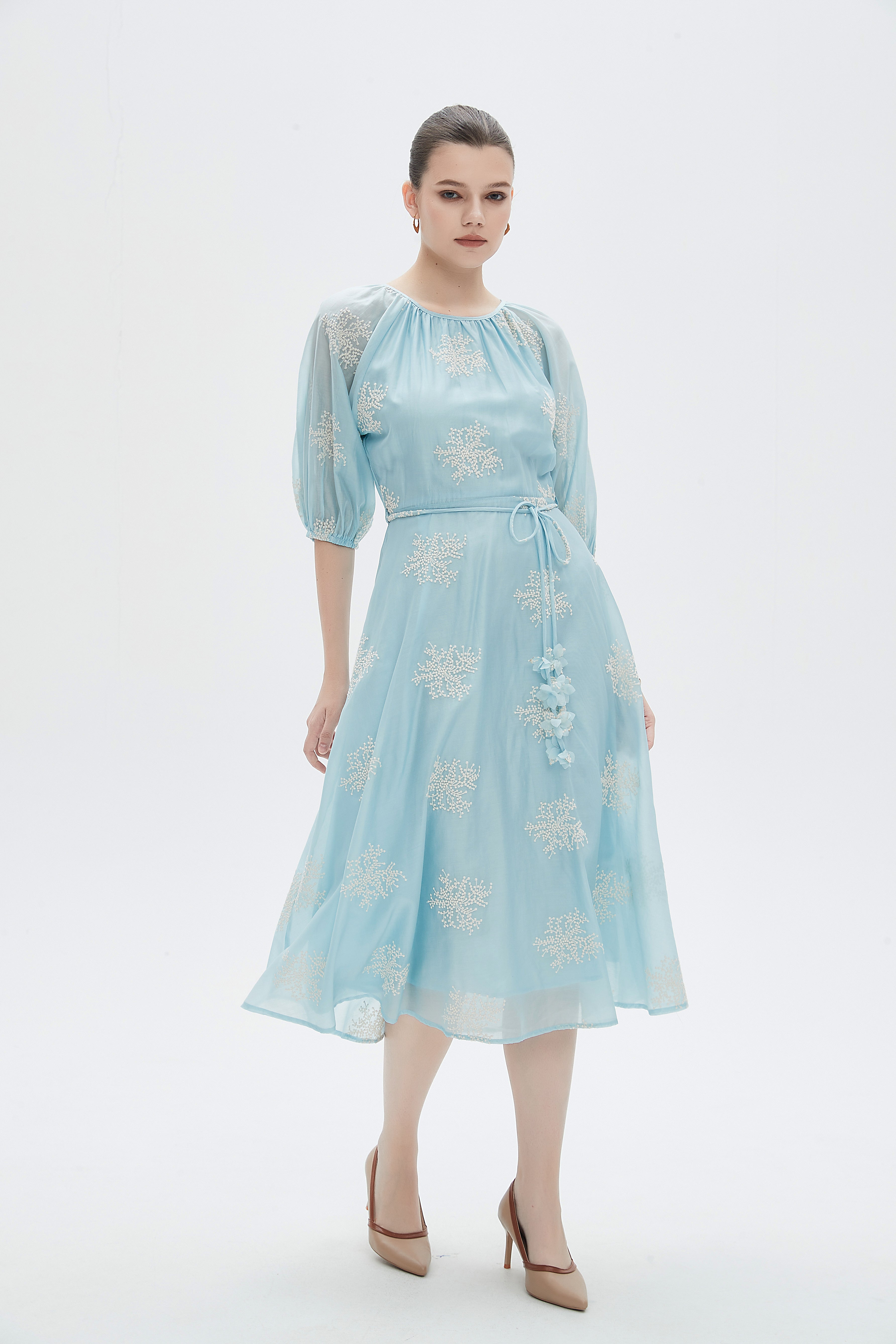 • العناية: اغسلي الفستان بالغسيل اليدوي أو بالغسالة على دورة لطيفة بماء بارد، استخدمي منظفًا خفيفًا، تجنبي المبيضات، لا تجففيه في النشاح وافرشيه مسطحًا أو علّقيه ليجف. اكوي على حرارة منخفضة مع وضع قطعة قماش بين المكواة والقماش بسبب التطريز.