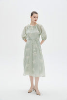 • ياقة مستديرة وأكمام منفوشة ثلاثة أرباع لإطلالة رومانسية