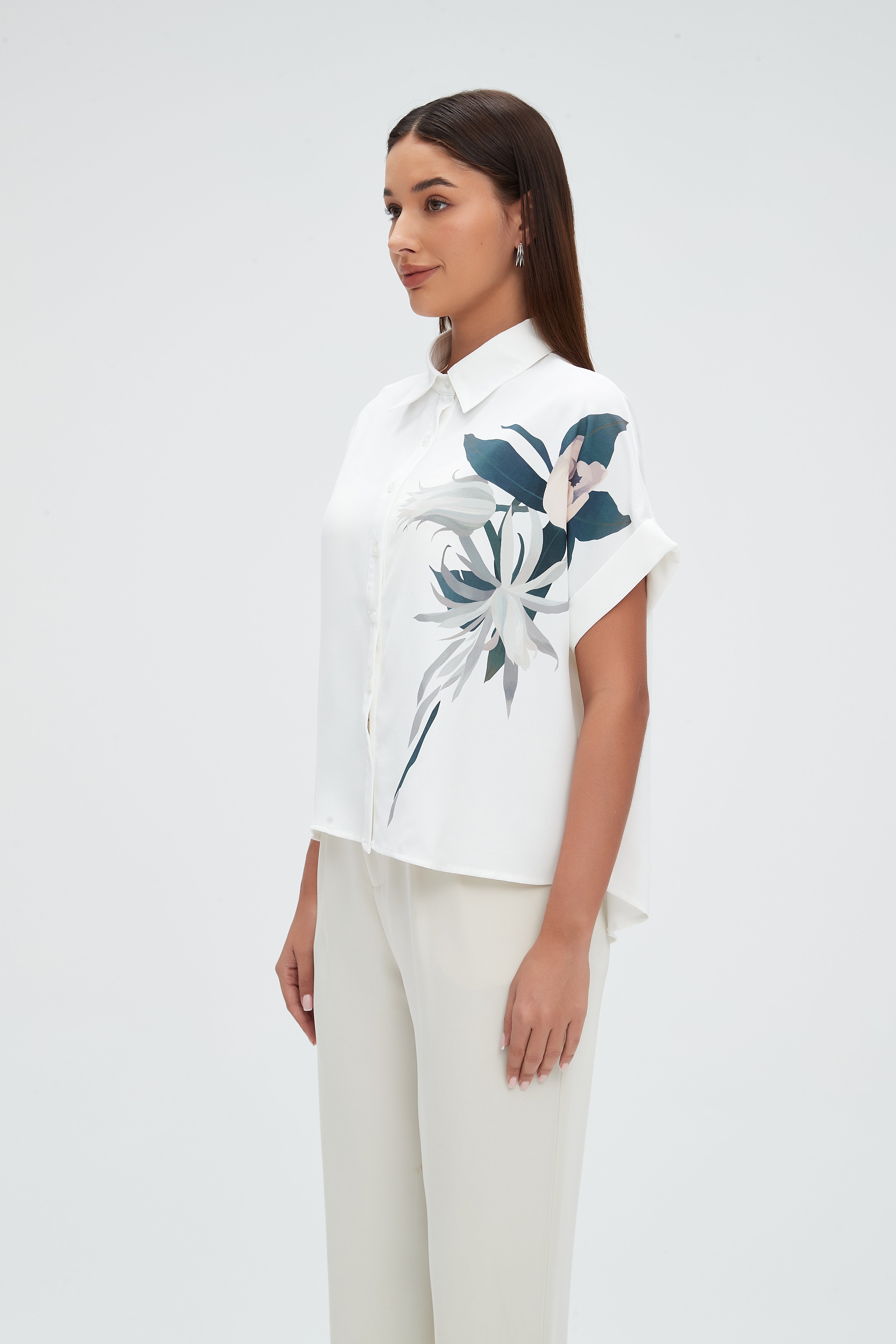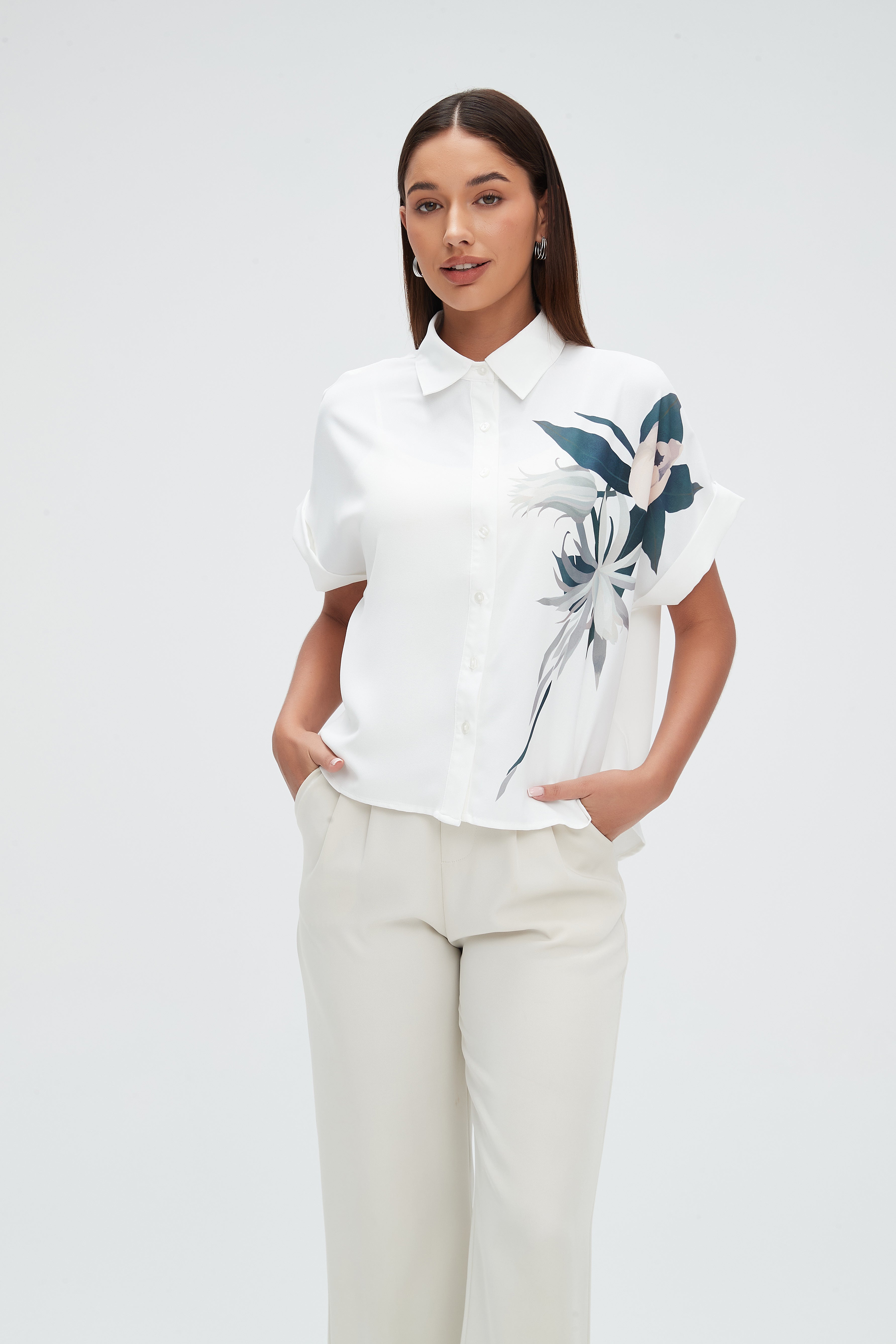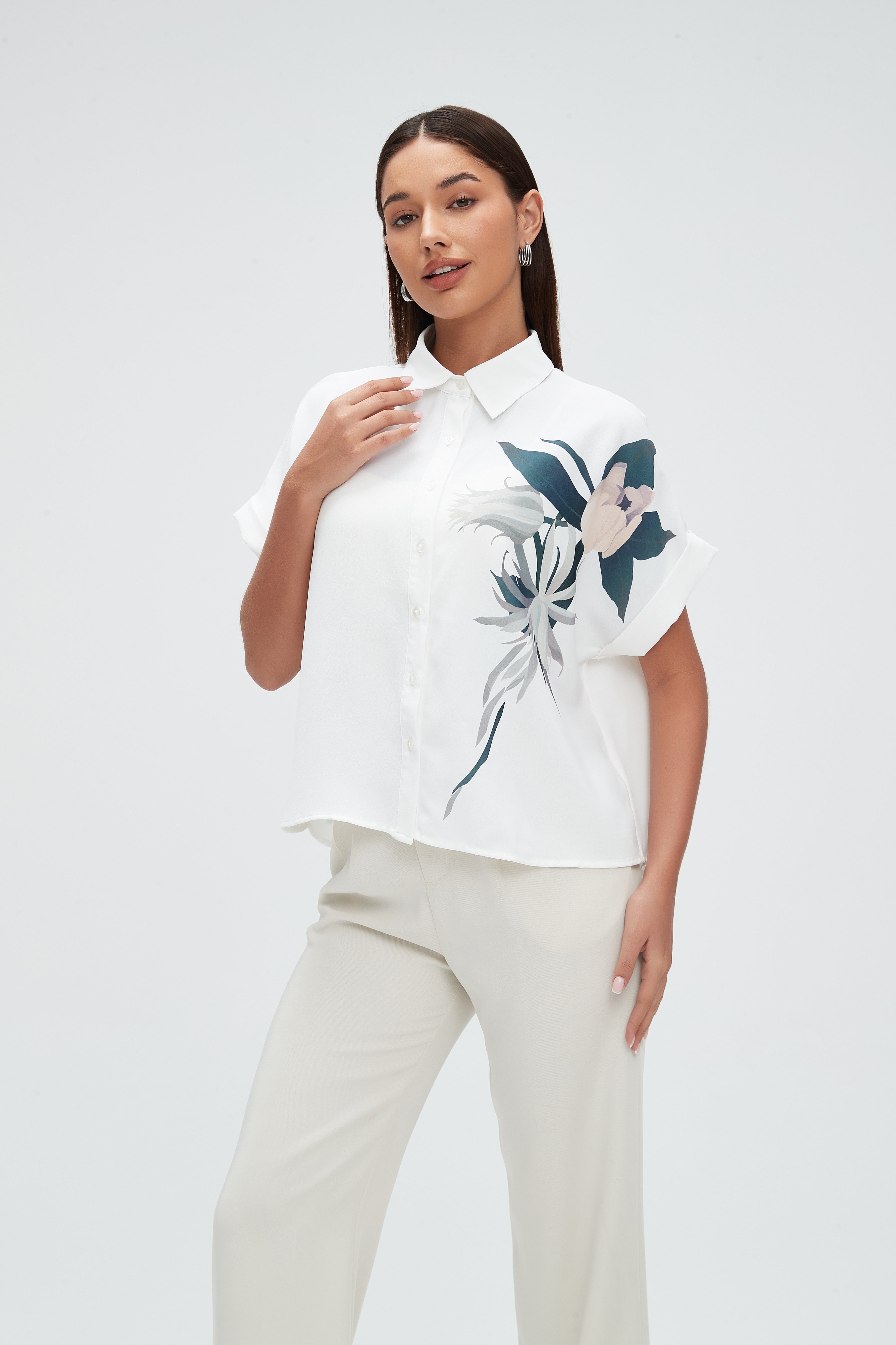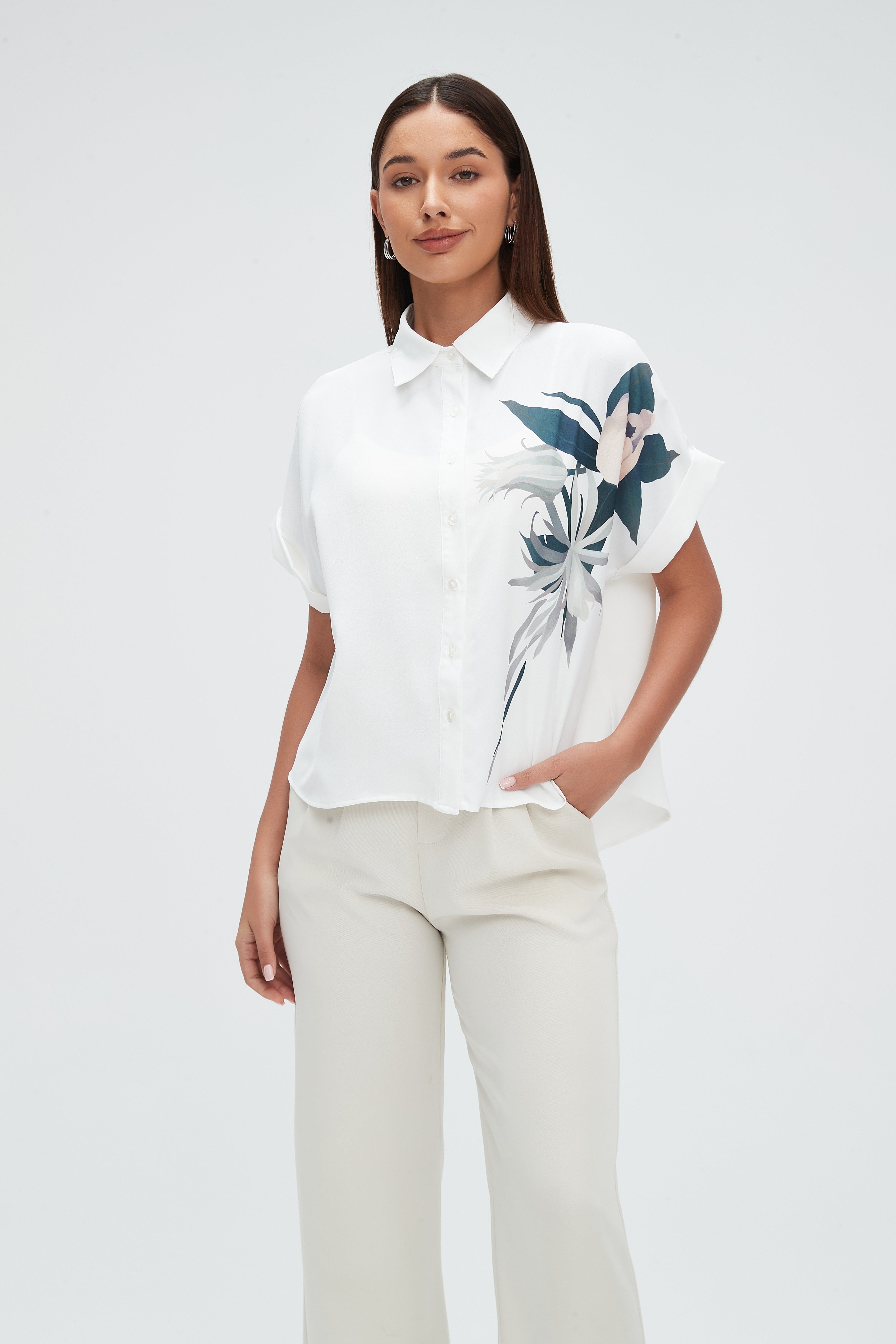بلوزة بطول الخصر واسعة موردة كم قصير