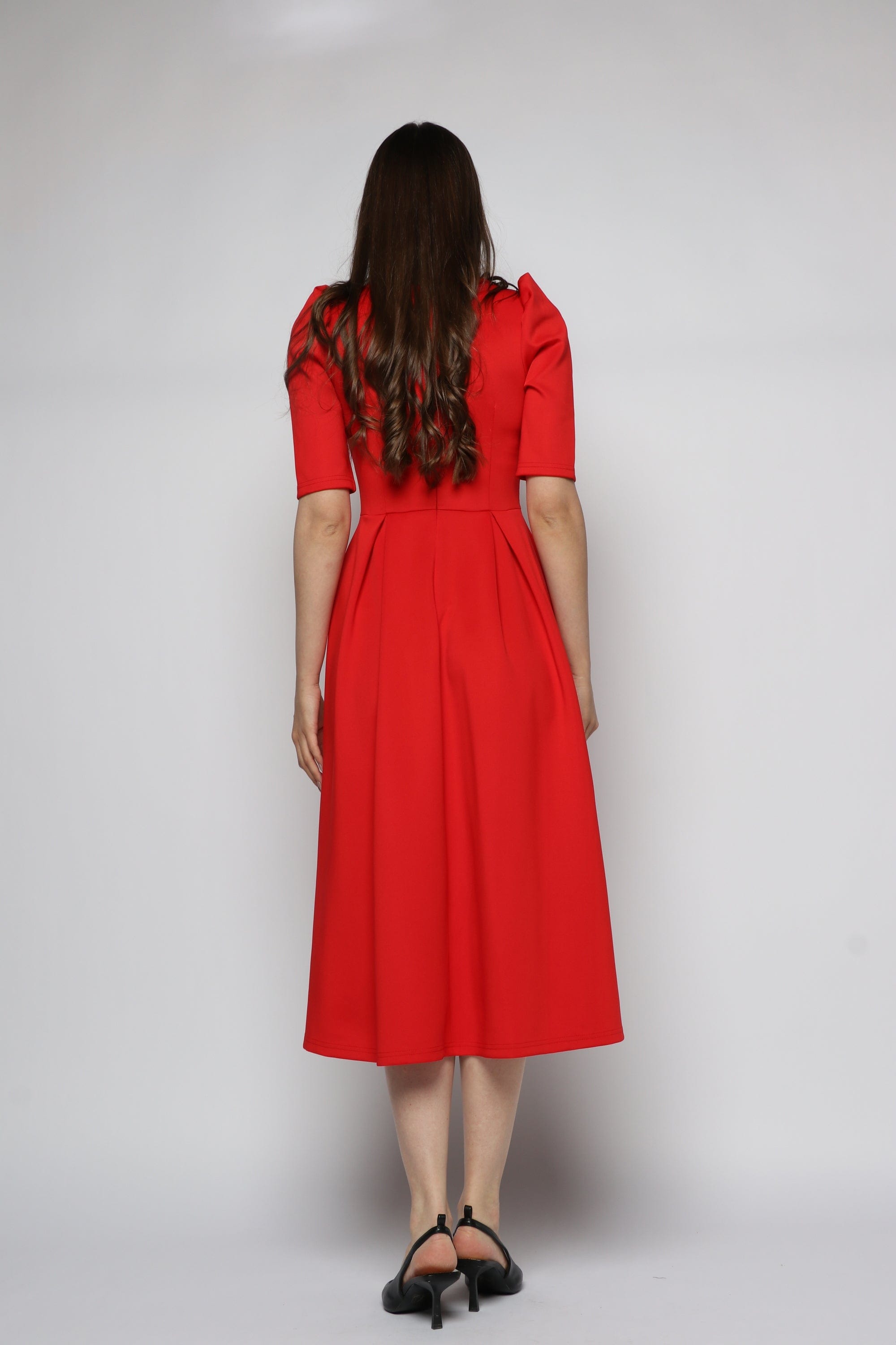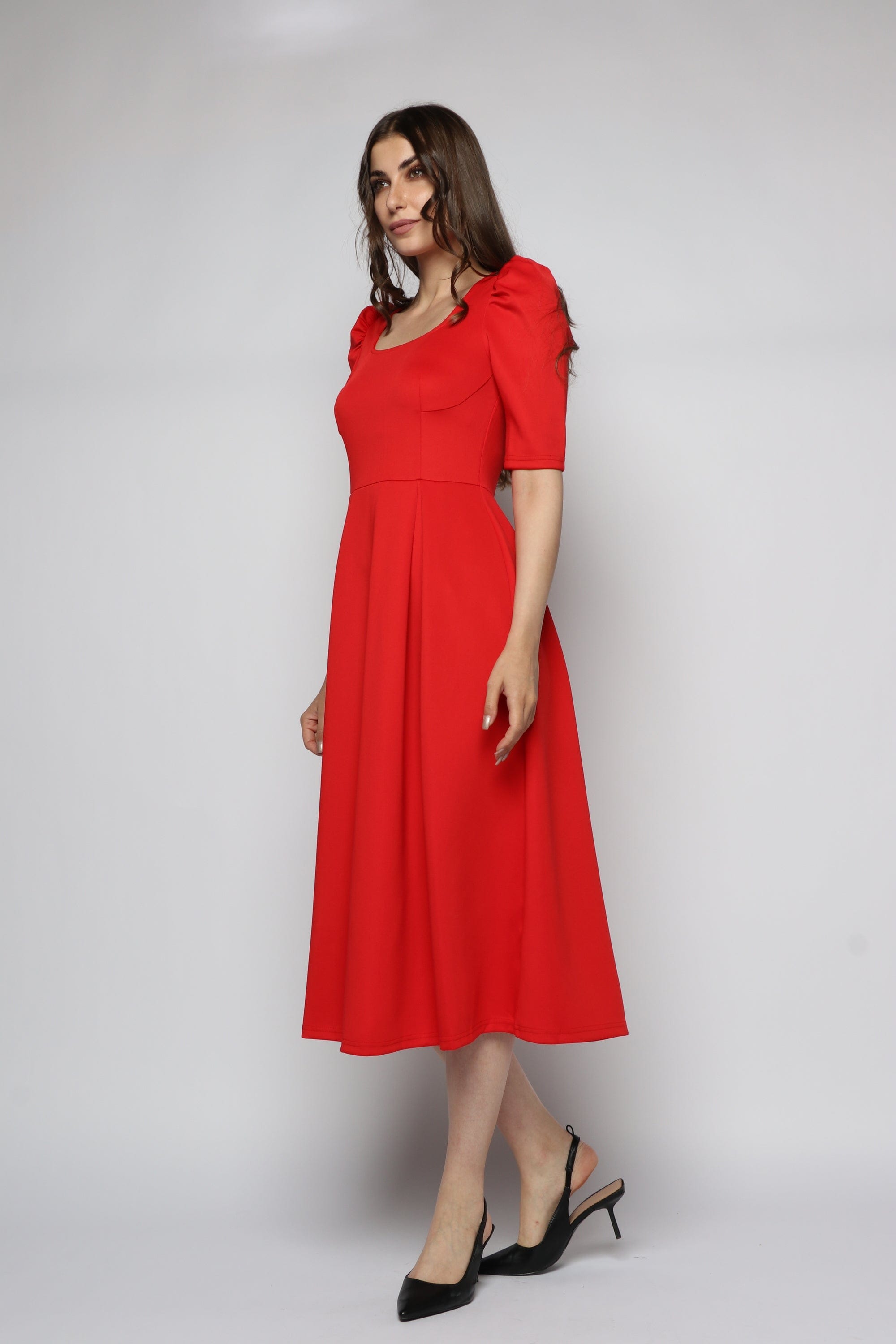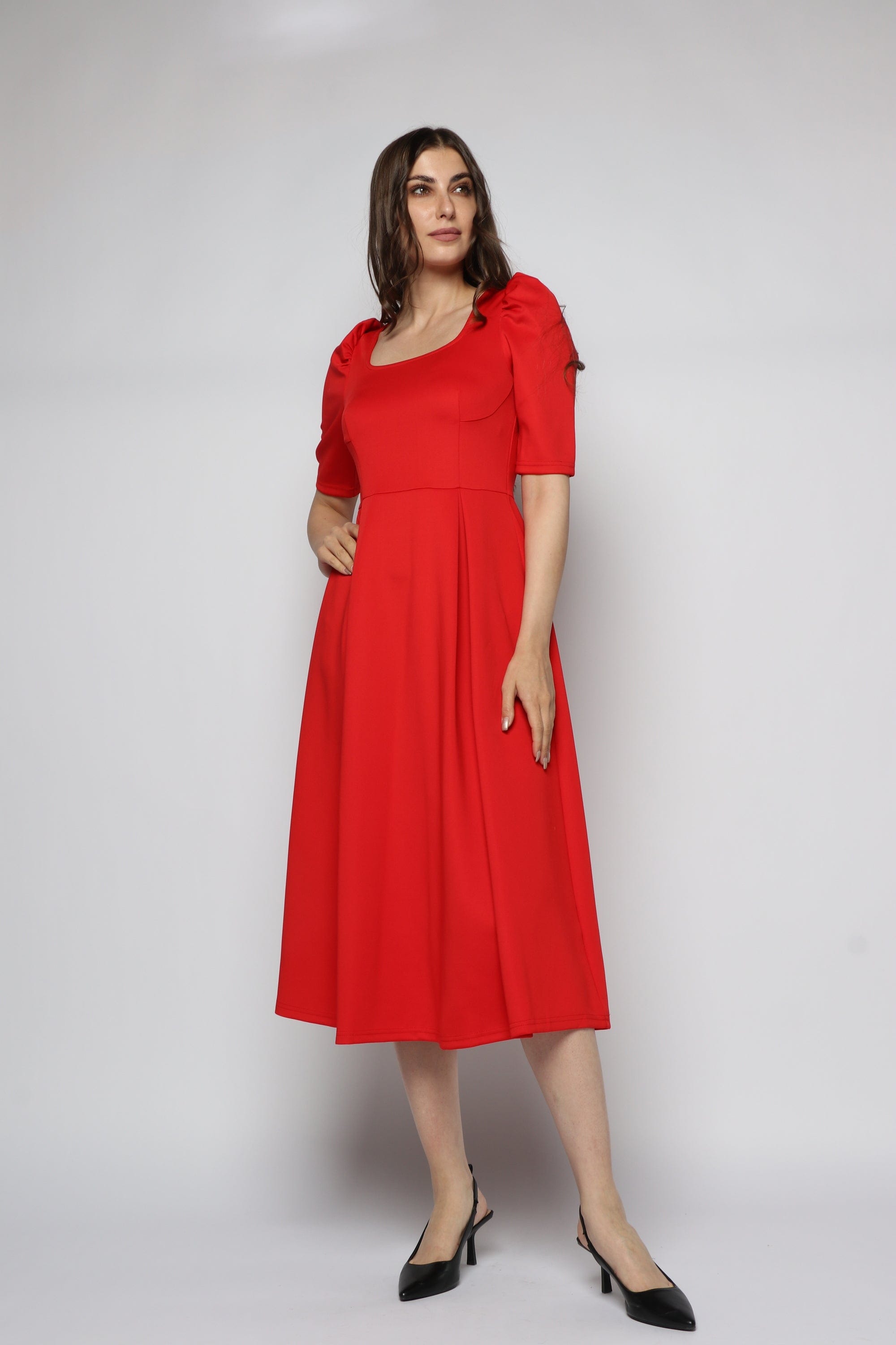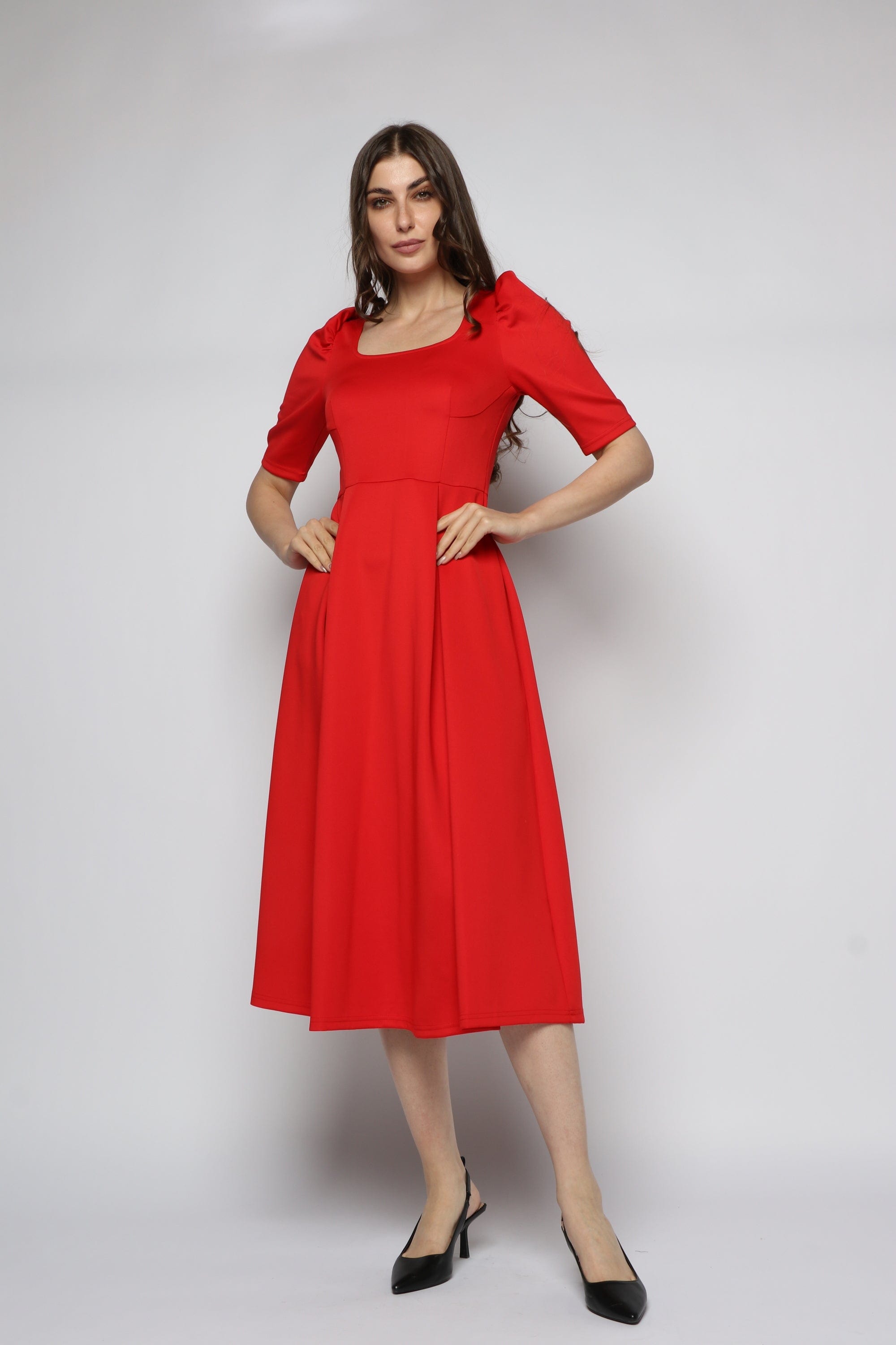 قد ترغبين في فستان أحمر يبرز أنوثتك دون مبالغة، وهذا الفستان رائع للخروجات اليومية والمناسبات الكاجوال. الخامة 92% بوليستر و8% إيلاستين تمنح مرونة وخفة في الحركة مع ثبات في الشكل ومقاومة لتجاعيد خفيفة، والسمك المتوسط يجعله مناسباً لكل المواسم. تصميمه بقصة A وقصة عادية يحدد الخصر وينساب بطول ميدي متوازن. ياقة مربعة تمنح لمسة عصرية وأكمام قصيرة تناسب الأيام الحارة أو التنسيق مع جاكيت خفيف. الفستان سادة وخالٍ من الطباعة، بدون بطانة وبدون جيوب وبدون حزام مرفق، ما يترك لك حرية إضافة إكسسواراتك. ستحبين كيف يتحرك معك هذا الفستان الأنثوي؛ مثالي للخروجات الرومانسية أو لقاءات الصباح. اعثري على مقاسك في فاشن السعودية وأضيفي هذه القطعة المتنوعة إلى خزانة ملابسك اليوم.
