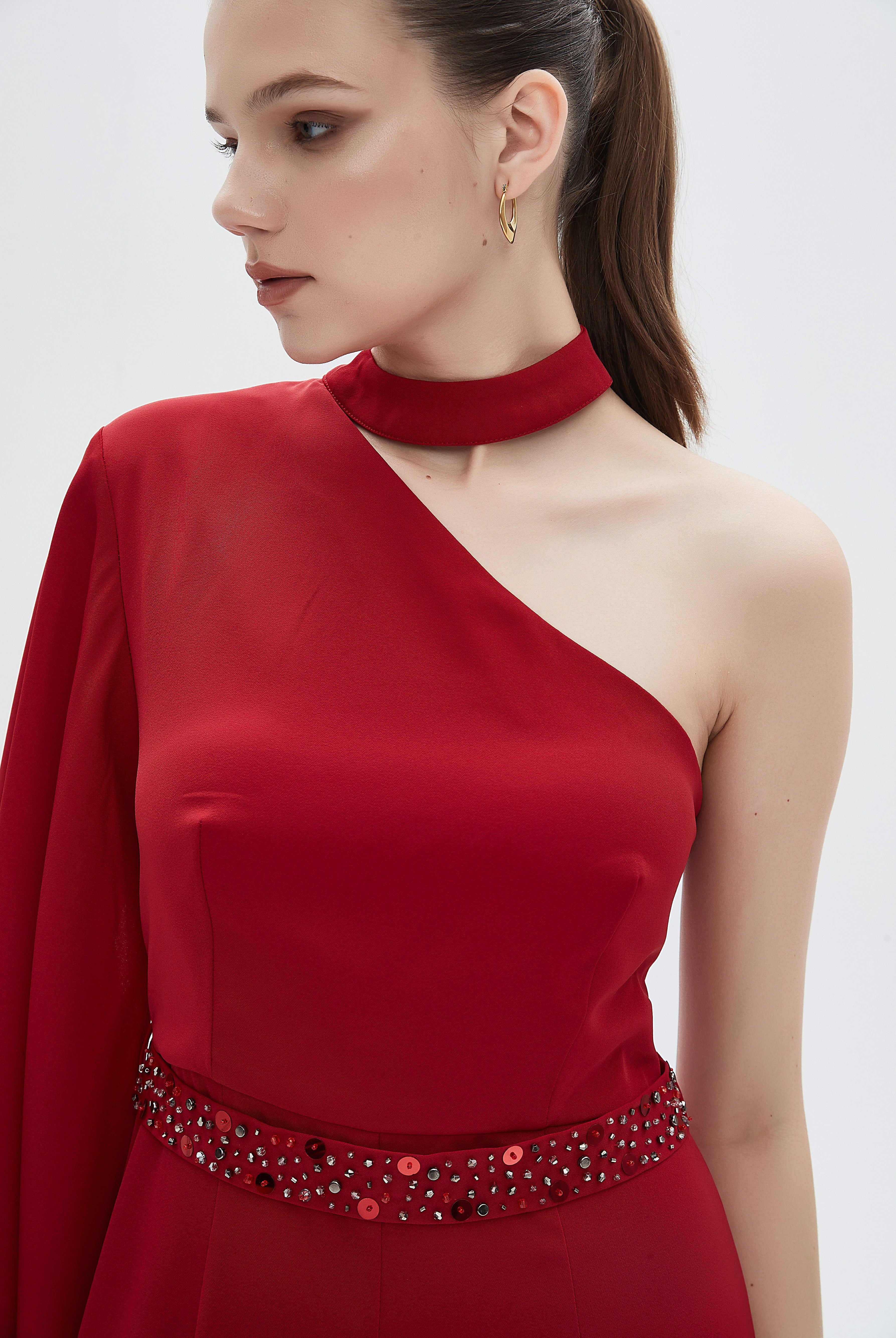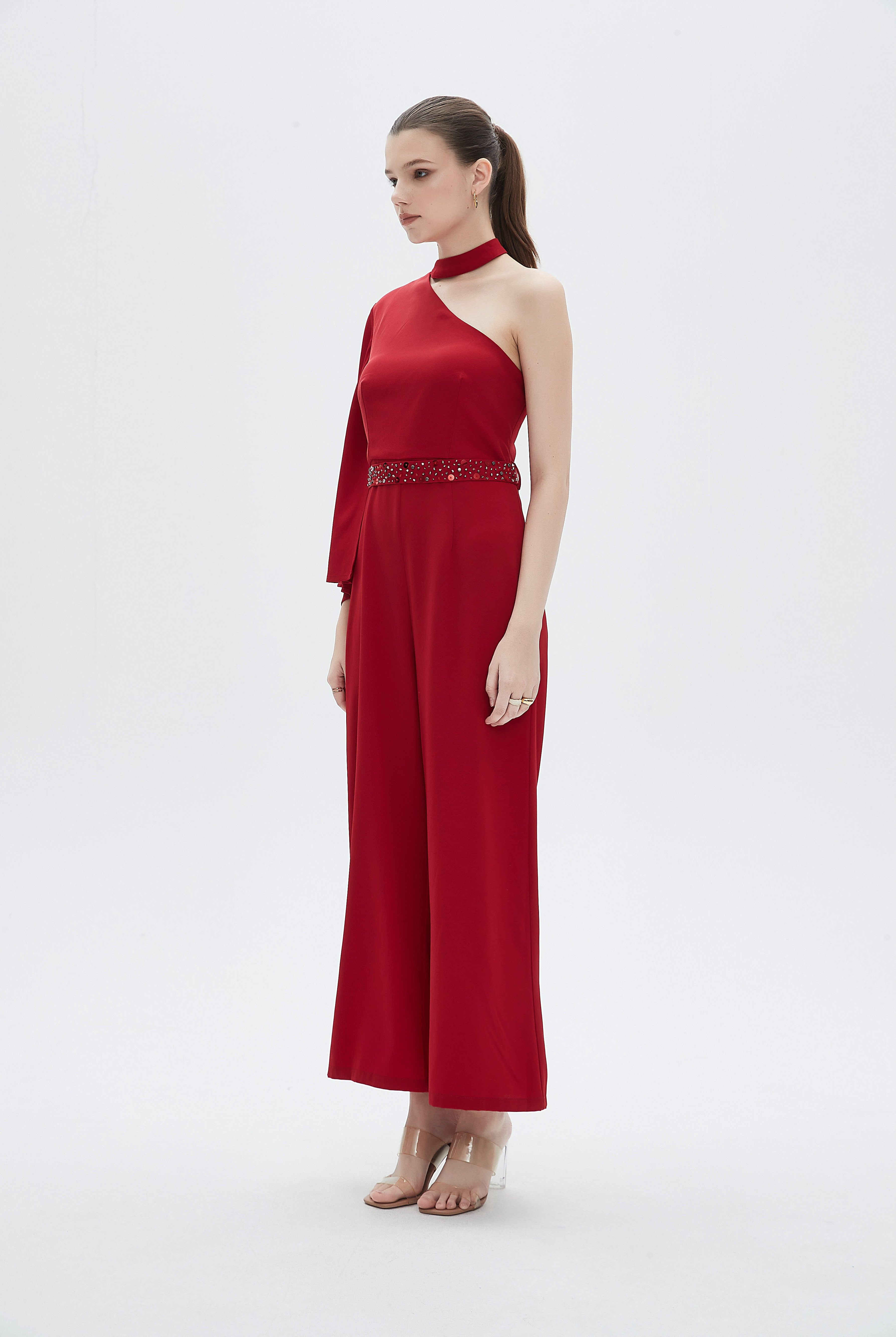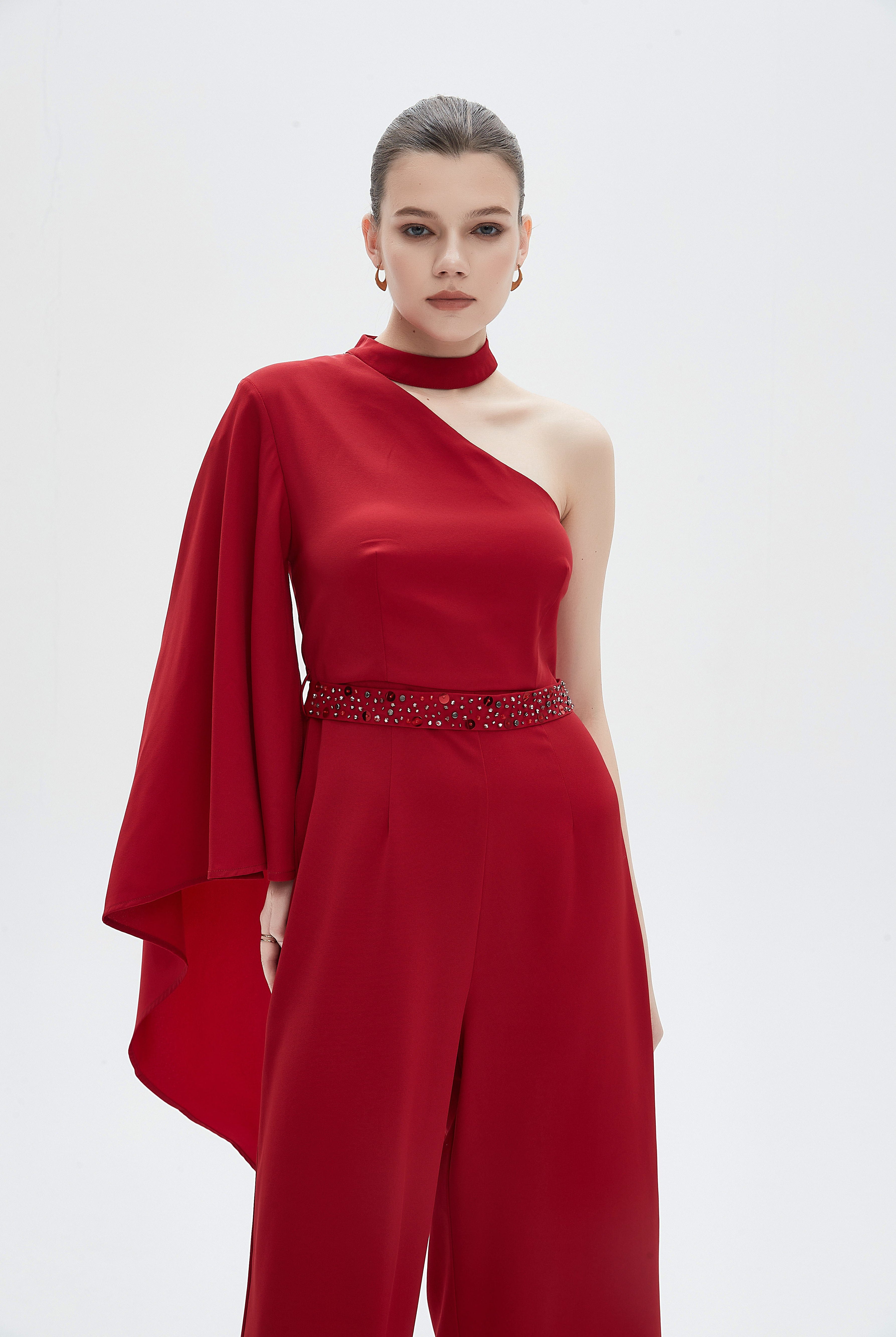 جمبسوت نسائية طويلة بكم واحد بتفاصيل معدنية على الخصر