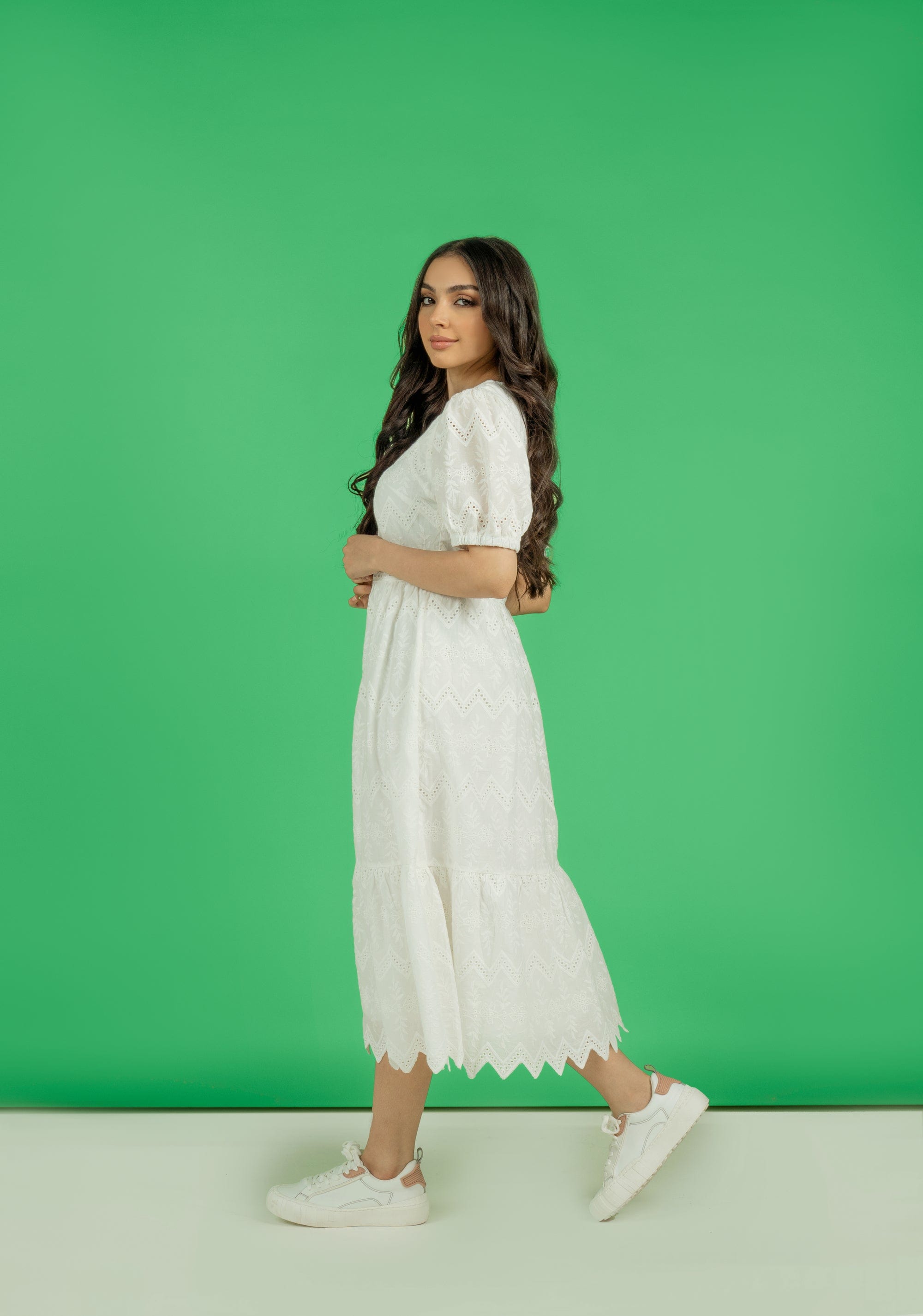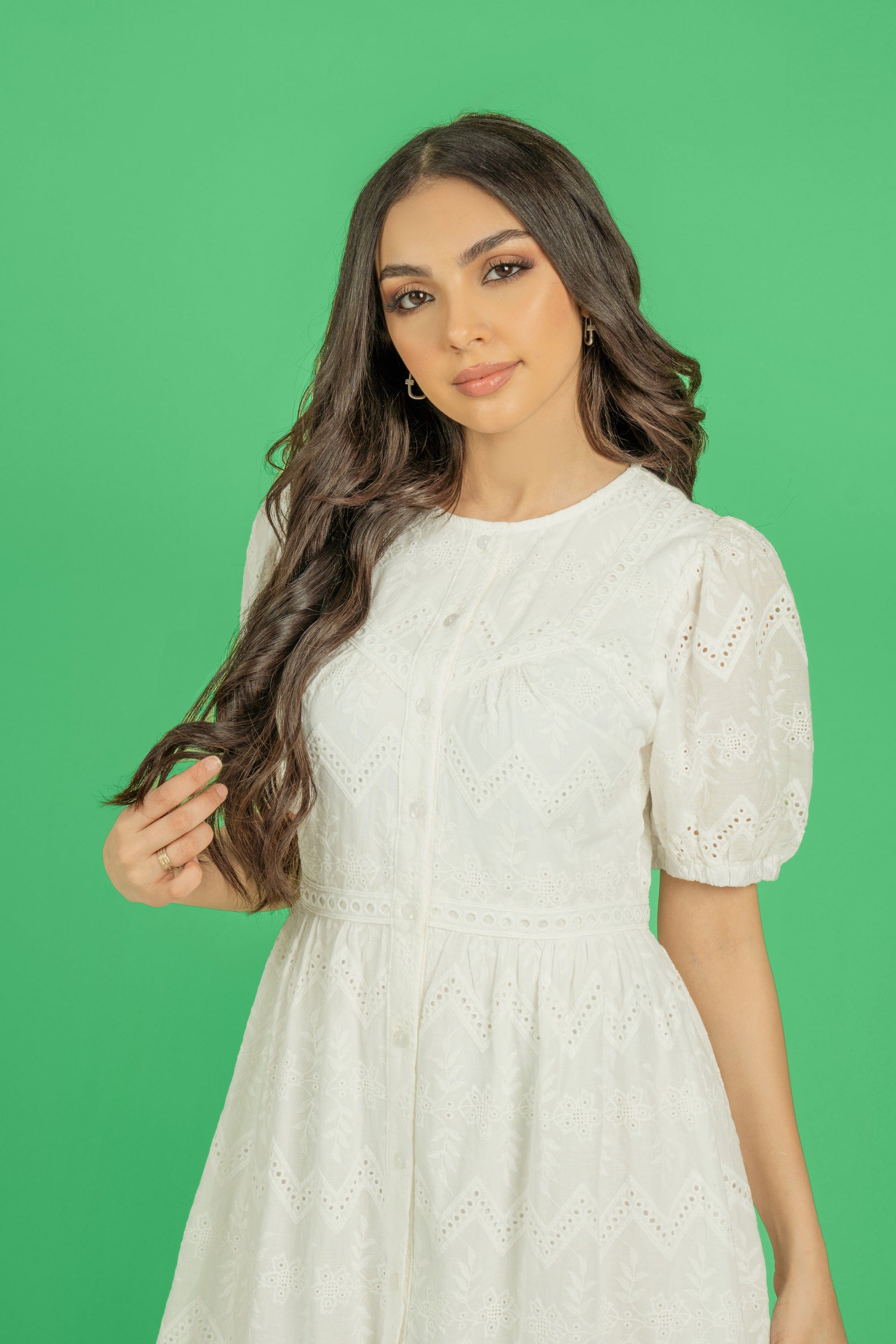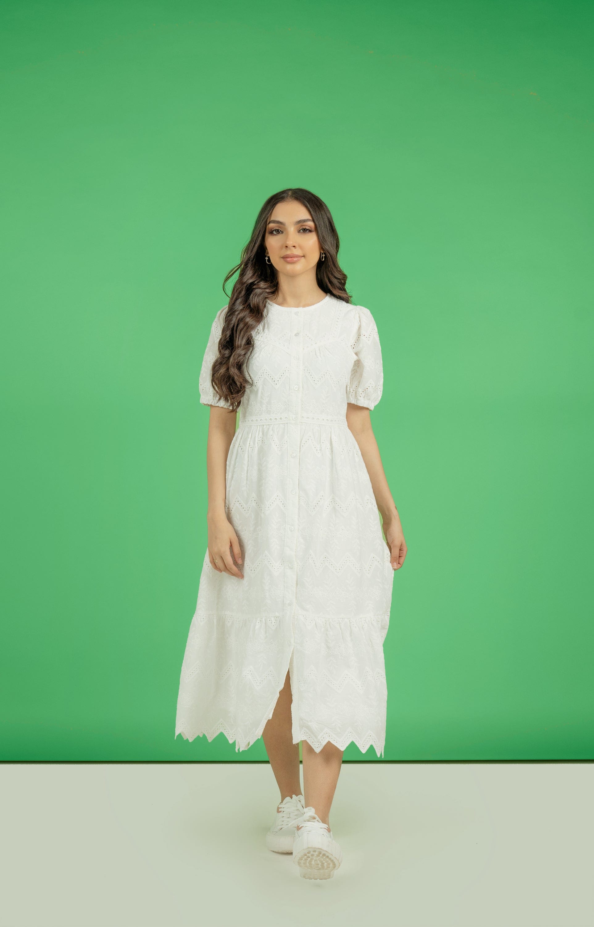 تحتاجين إلى فستان أبيض يمكن أن يدخل خزانة ملابسك لكل يوم؟ هذا الفستان الميدي بقصة A يمنحك المظهر الأنثوي دون تكلف. الخامة 100% قطن بسمك متوسط تجعله مريحاً ومناسباً لكل المواسم، والبطانة الداخلية من 100% بوليستر تمنح الثبات للشكل بينما يبدو التصميم الخارجي خفيفاً بلا بطانة ظاهرة. ياقة مستديرة بسيطة وأكمام قصيرة منقوشة تضيف لمسة حيوية، وطول الميدي يجعل الإطلالة أنيقة وعملية. يغلق بزر من الأمام ليمنحك سهولة ارتداء، ويأتي بدون جيوب أو حزام للحفاظ على سلاسة الخطوط. مثالي للخروجات الرومانسية والنهارية الكاجوال، وستحبين كيف يتحرك معك أثناء التنقل. اعثري على مقاسك في فاشن السعودية وأضيفي هذه القطعة المتنوعة إلى خزانة ملابسك اليوم.