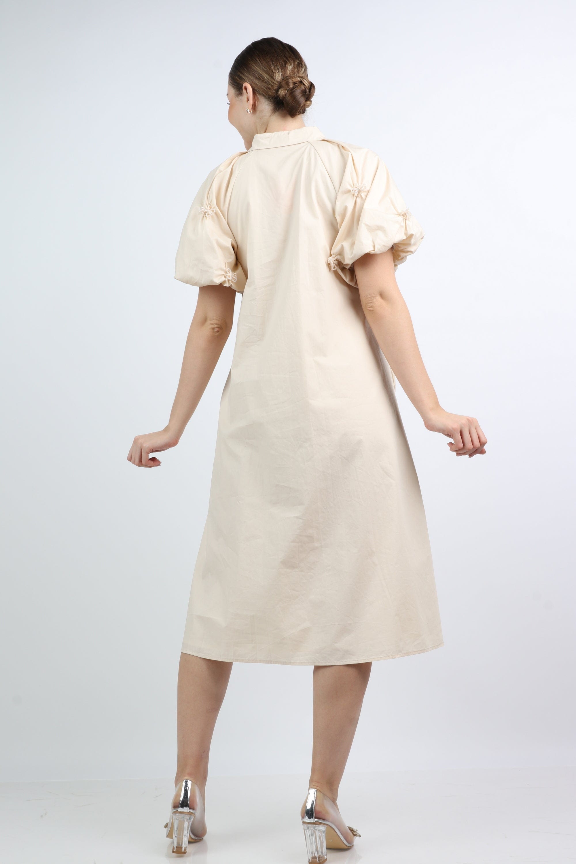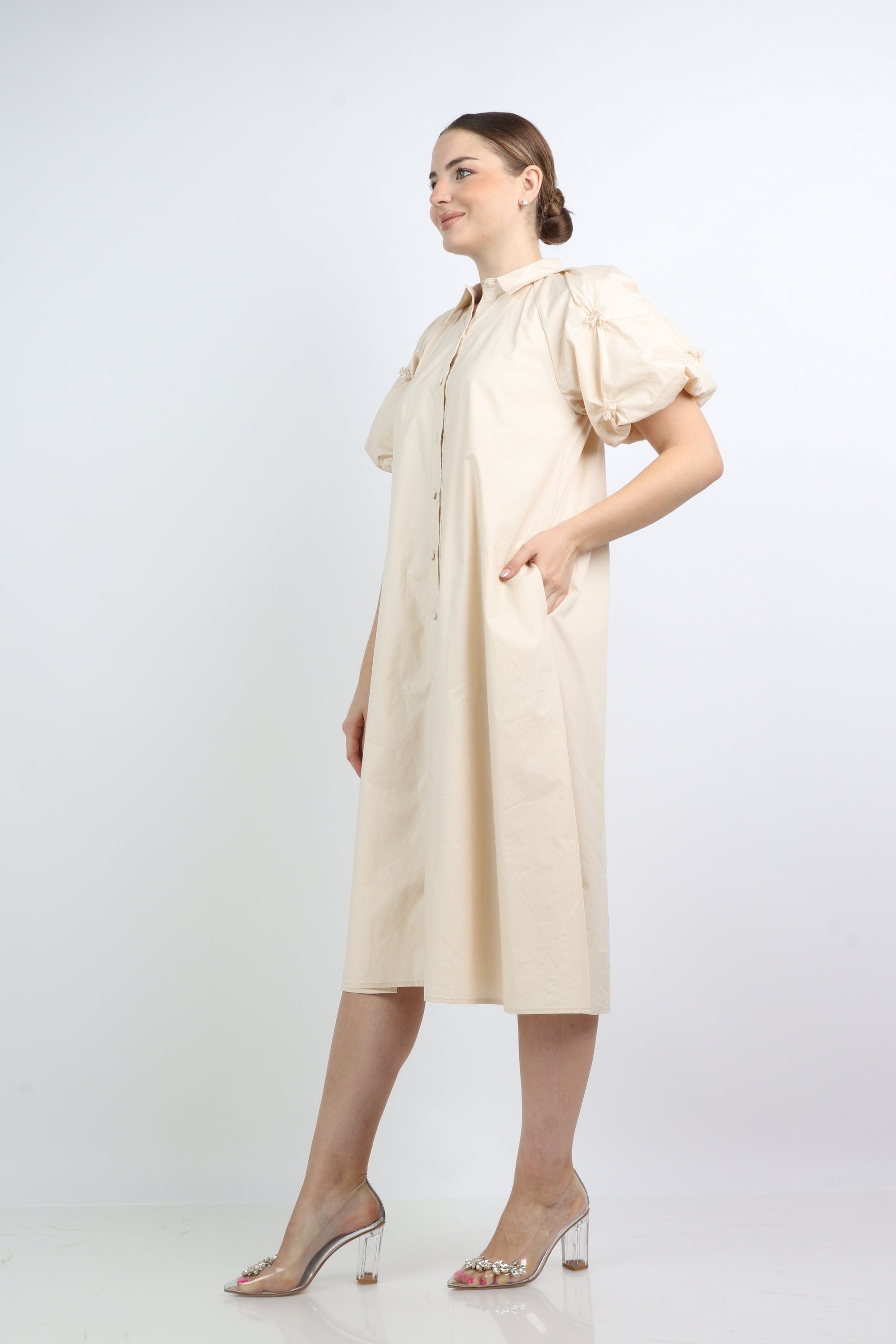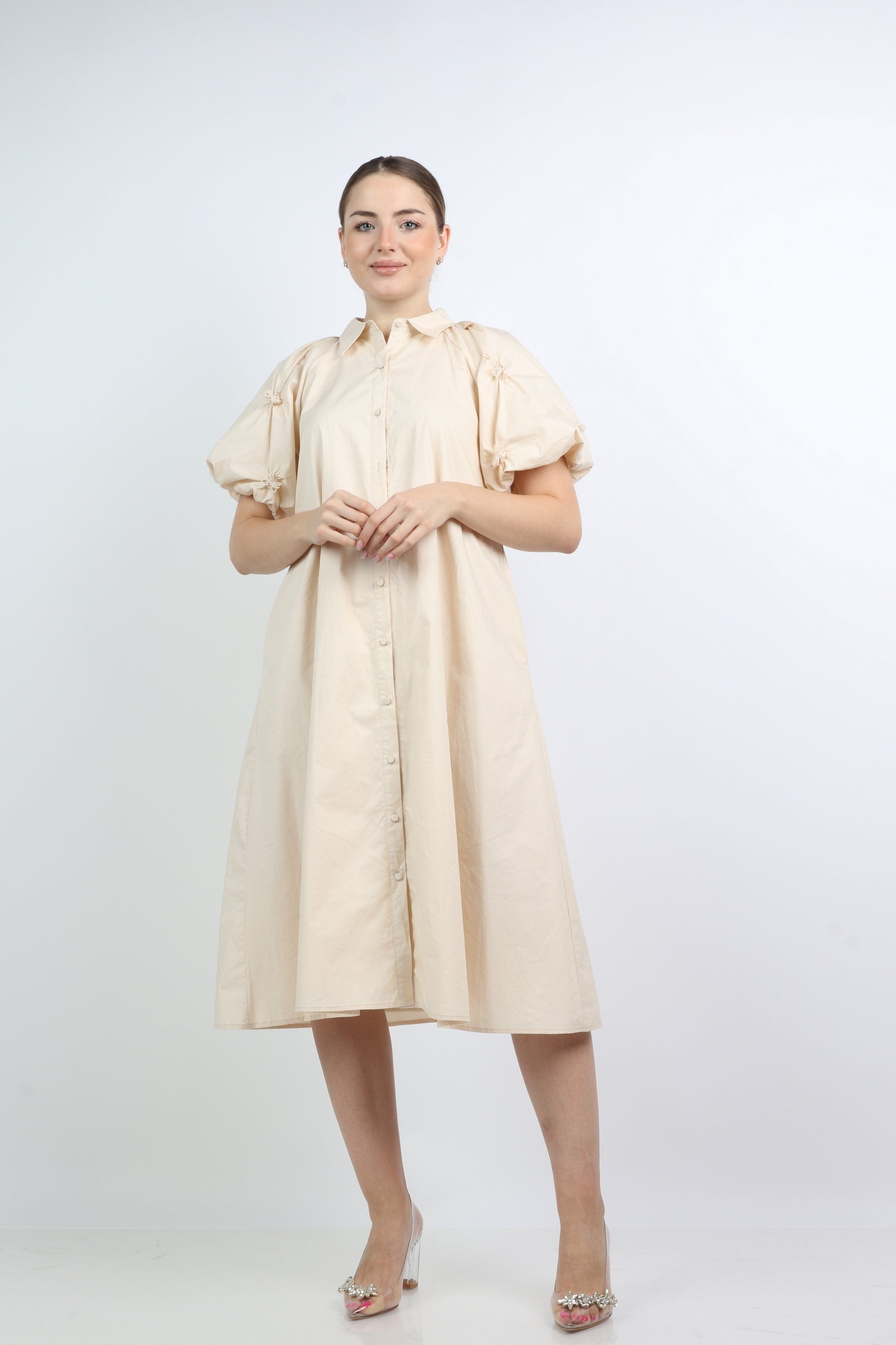 لما تبحثين عن فستان يوازن بين الراحة والمظهر اليومي، هذا الفستان خيار رائع. مصنوع من قطن 100% لياحة تنفسية ونعومة طبيعية، مع سماكة متوسطة تناسب كل المواسم. قصة A ميدي تمنحه حركة أنثوية دون مبالغة، وياقة قميص تضيف لمسة كلاسيكية، والكم المنفوش القصير يمنح لمسة عصرية محببة. الفستان سادة باللون البيج، دون بطانة ولذلك خفيف ويجف سريعاً، مع إغلاق بأزرار وجيب مخفي عملي، وقصة عادية تناسب معظم الأجسام. مثالي للخروجات الكاجوال، للمشي مع الأصدقاء أو لموعد رومانسي بسيط، وستحبين كيف يتحرك معك ويشعرك بالراحة طوال اليوم. اعثري على مقاسك في فاشن السعودية وأضيفي هذه القطعة المتنوعة إلى خزانة ملابسك اليوم.