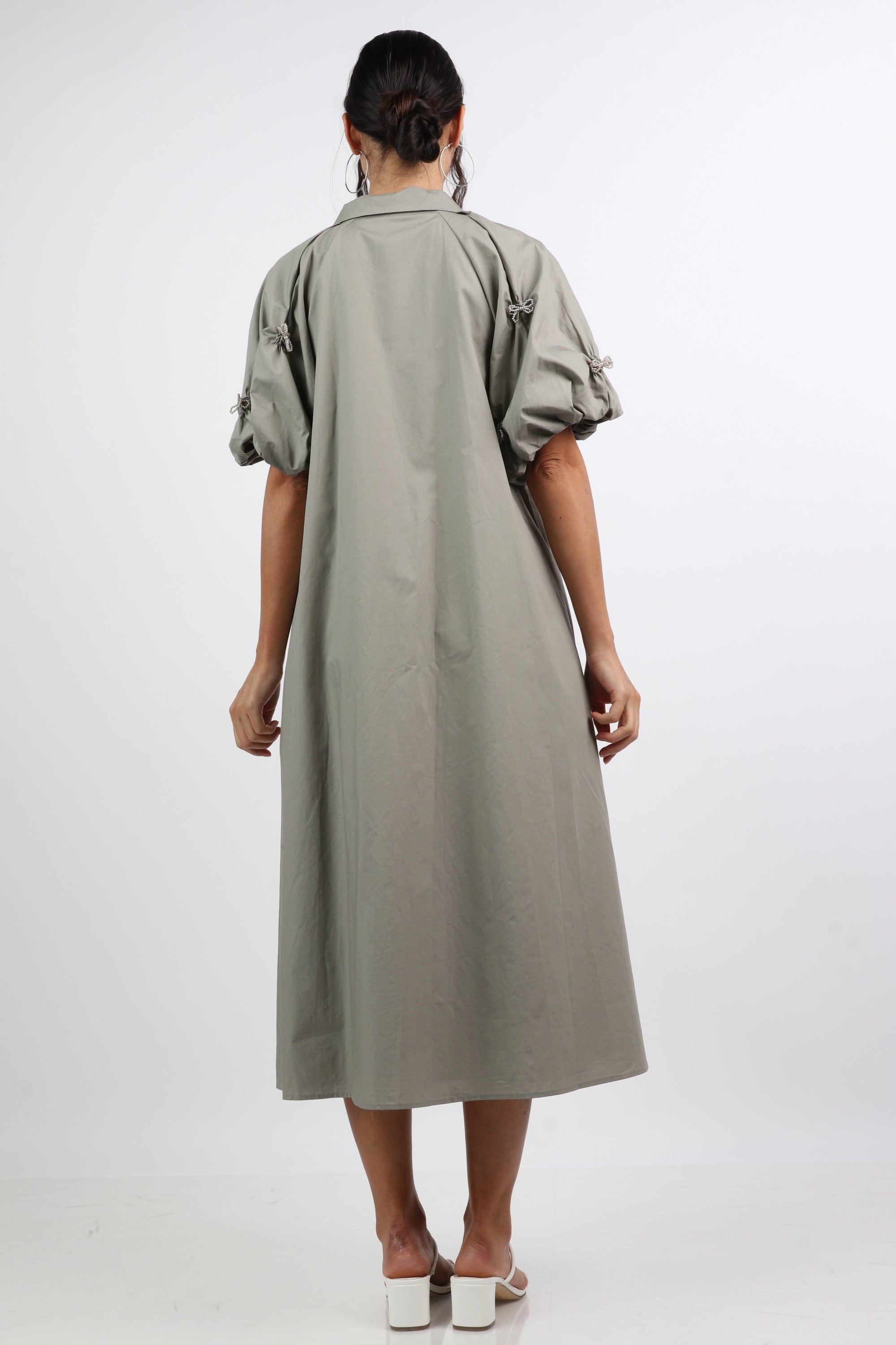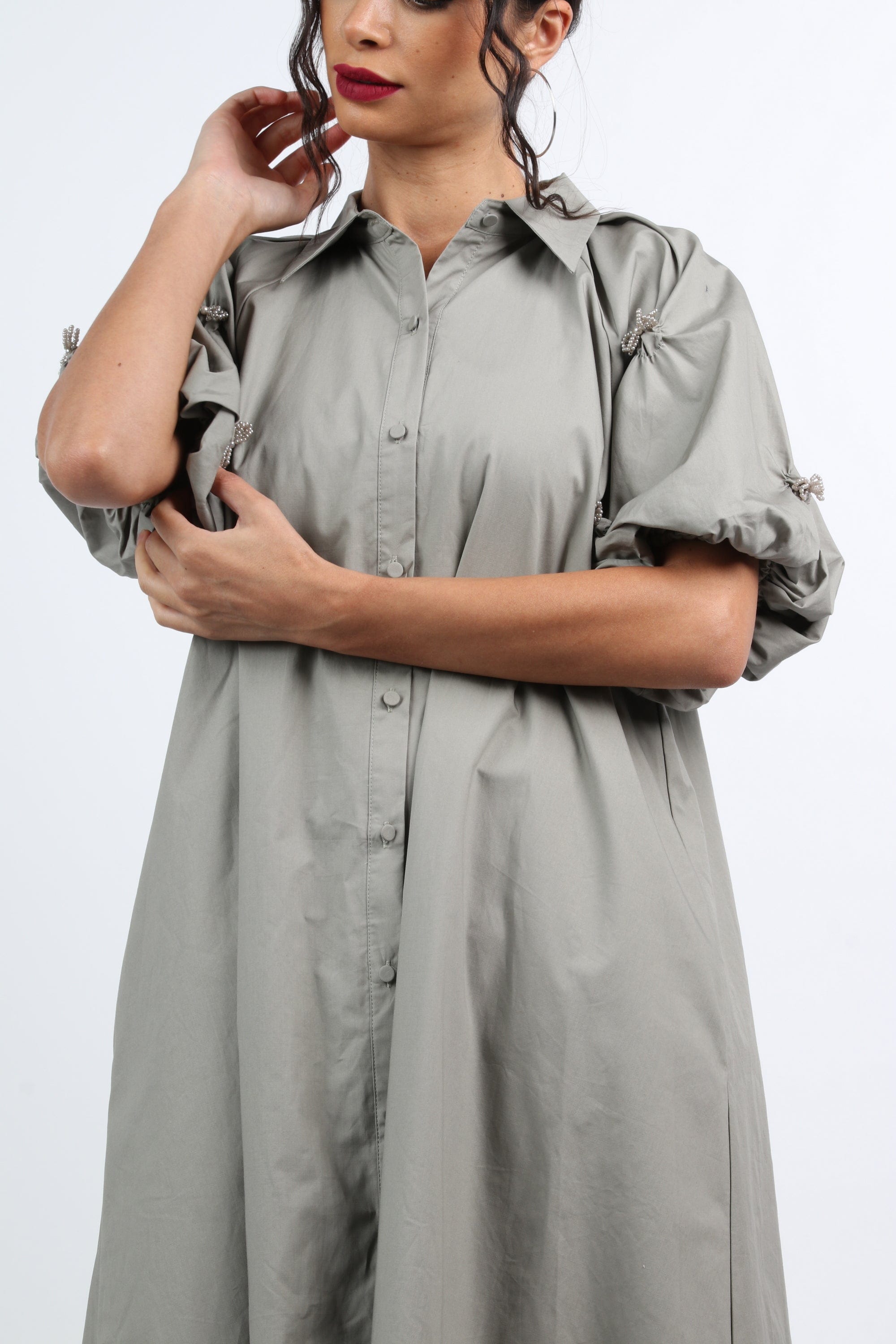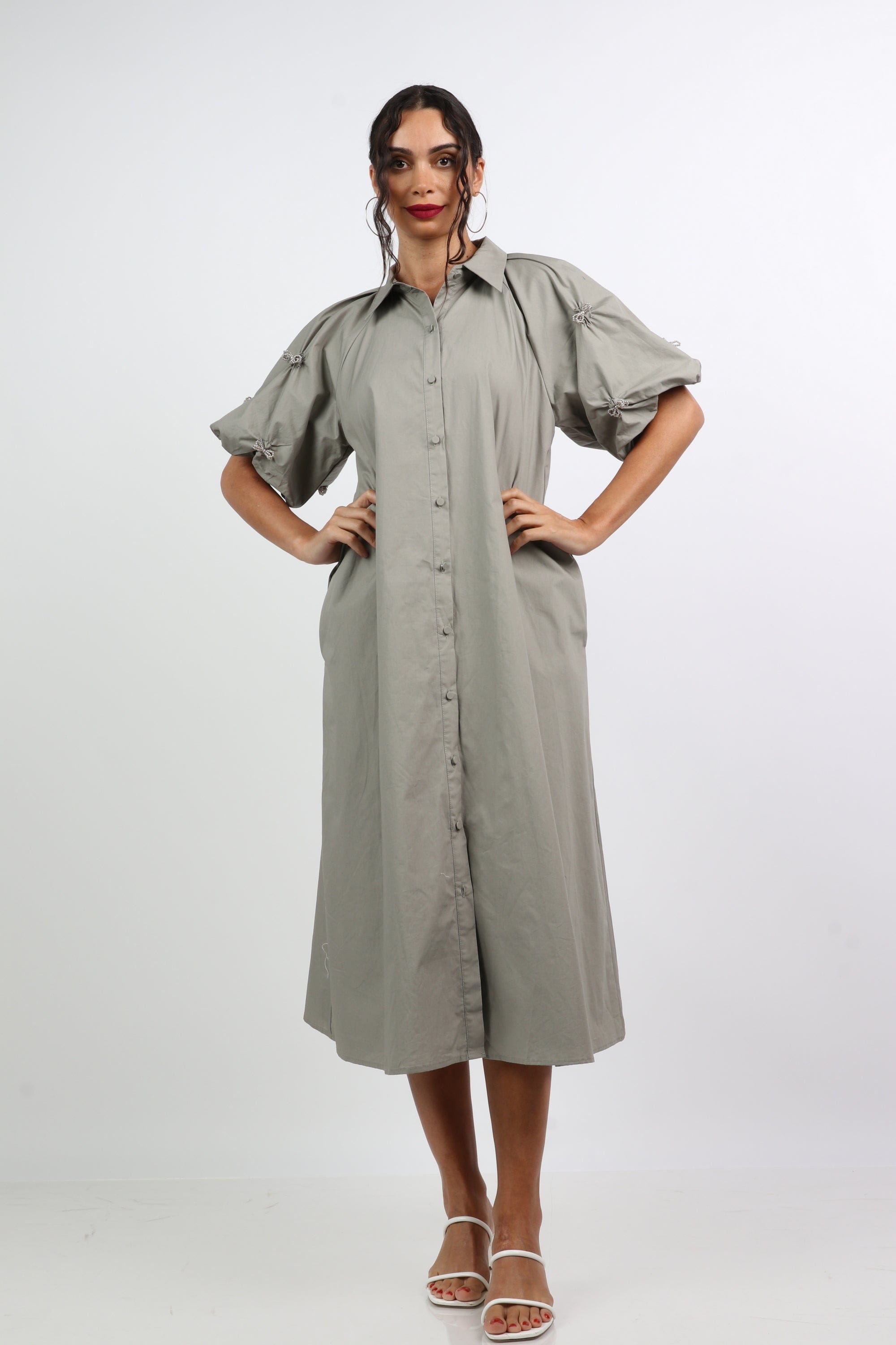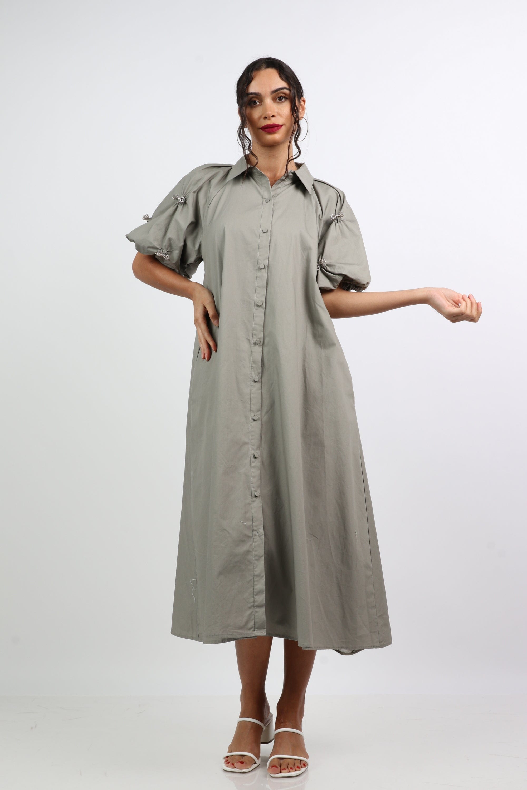 لما تبحثين عن فستان يوازن بين الراحة والمظهر اليومي، هذا الفستان خيار رائع. مصنوع من قطن 100% لياحة تنفسية ونعومة طبيعية، مع سماكة متوسطة تناسب كل المواسم. قصة A ميدي تمنحه حركة أنثوية دون مبالغة، وياقة قميص تضيف لمسة كلاسيكية، والكم المنفوش القصير يمنح لمسة عصرية محببة. الفستان سادة باللون البيج، دون بطانة ولذلك خفيف ويجف سريعاً، مع إغلاق بأزرار وجيب مخفي عملي، وقصة عادية تناسب معظم الأجسام. مثالي للخروجات الكاجوال، للمشي مع الأصدقاء أو لموعد رومانسي بسيط، وستحبين كيف يتحرك معك ويشعرك بالراحة طوال اليوم. اعثري على مقاسك في فاشن السعودية وأضيفي هذه القطعة المتنوعة إلى خزانة ملابسك اليوم.