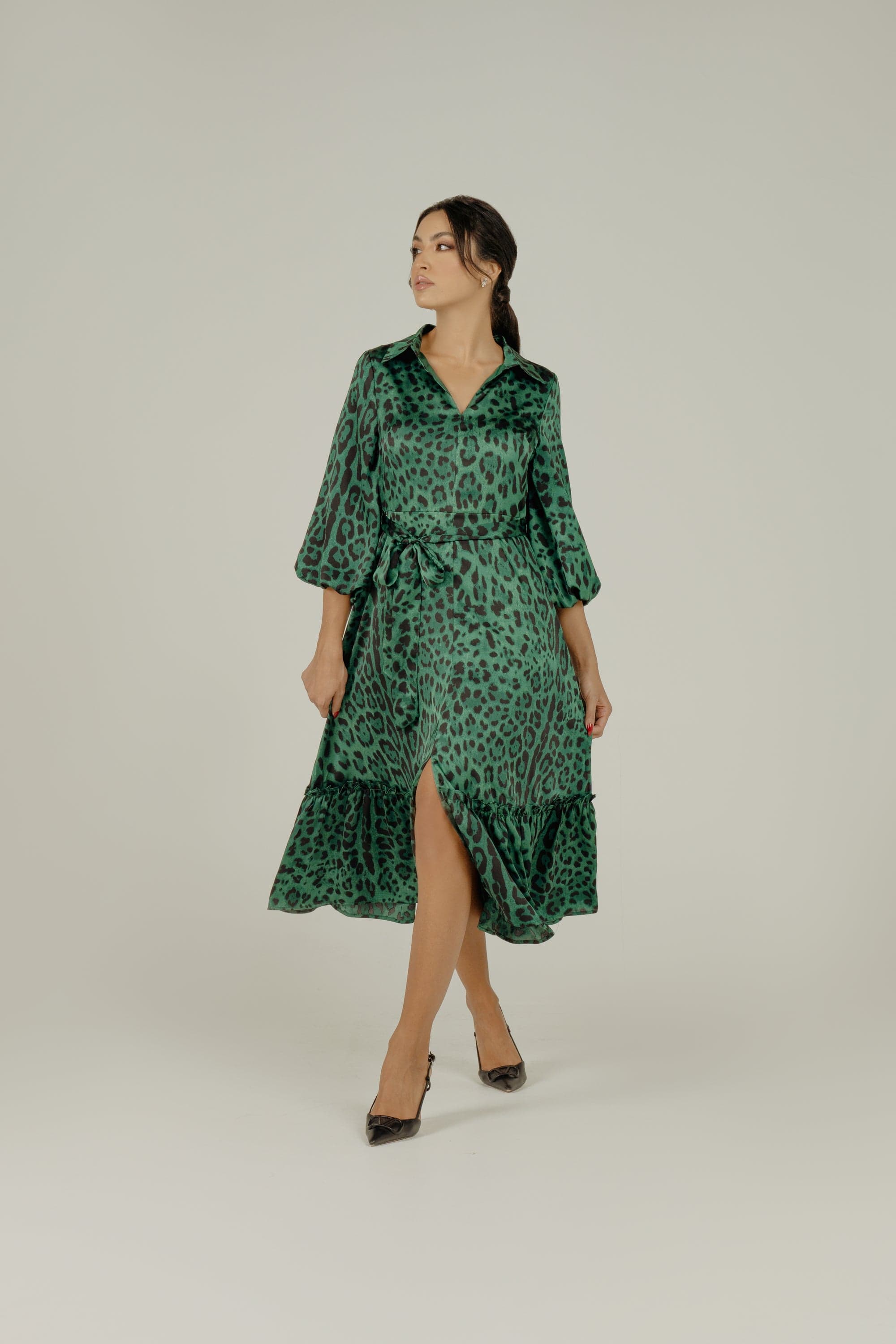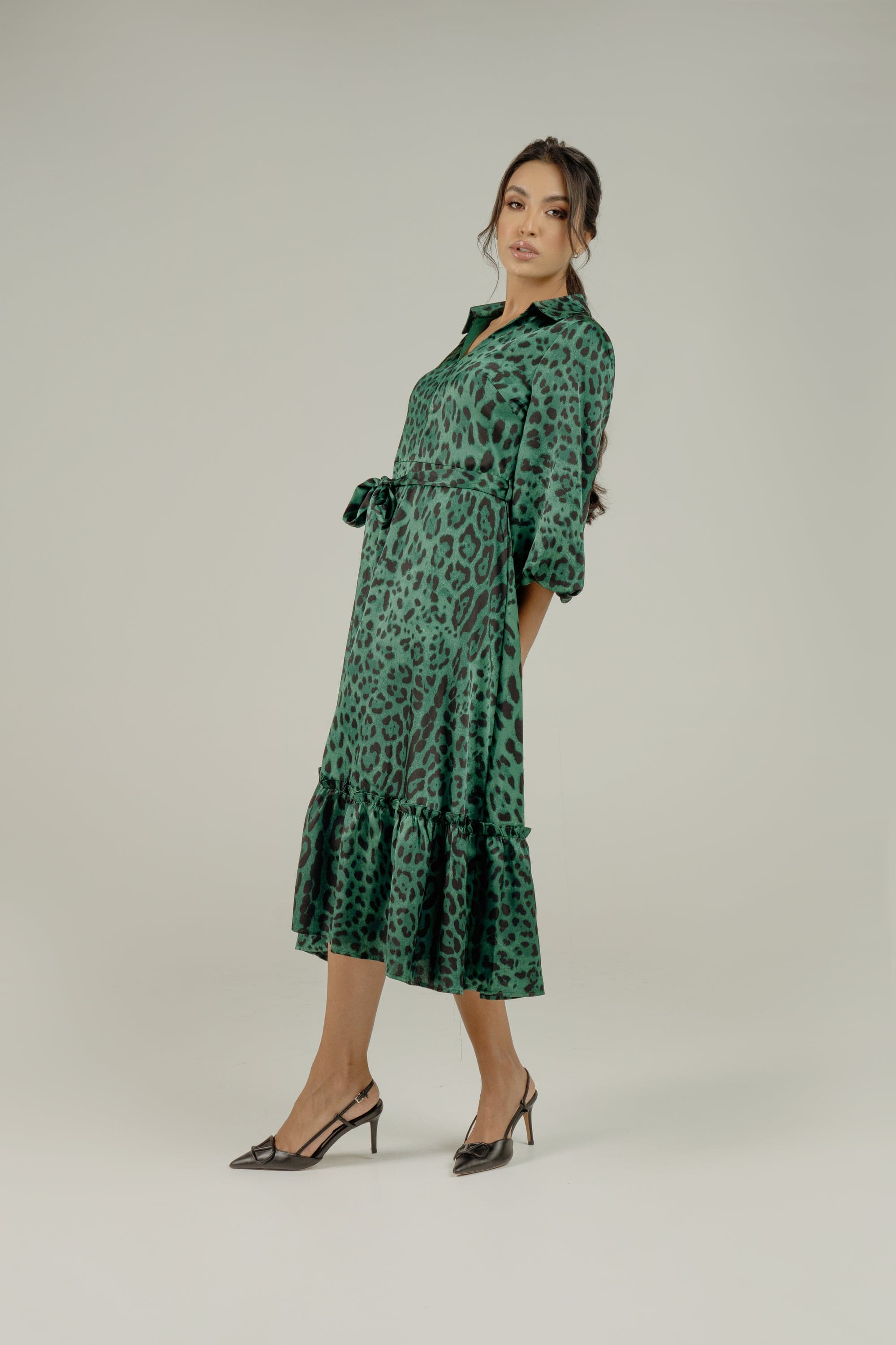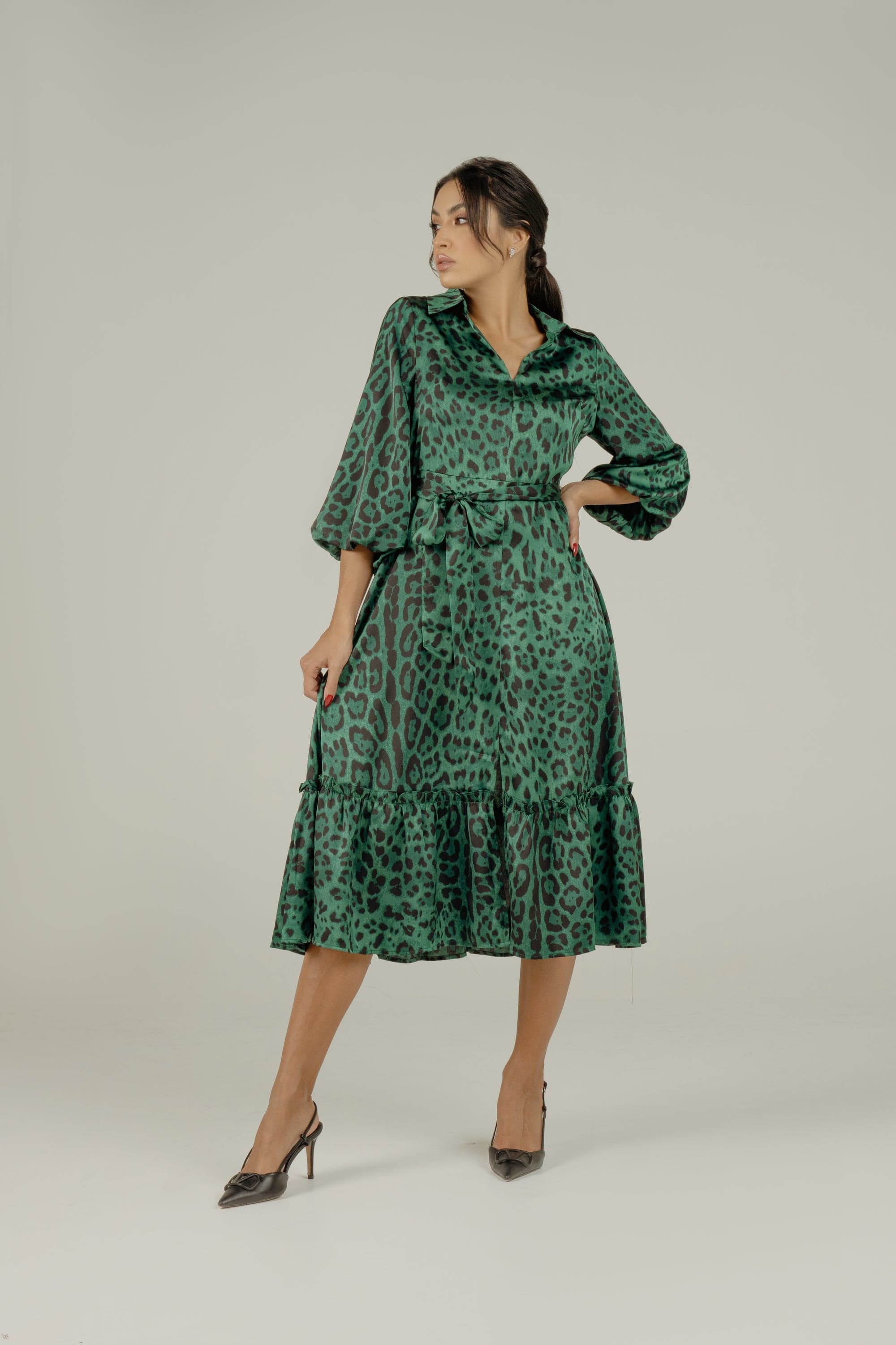 لما تبغين فستان يجمع بين لمسة جريئة ومظهر يومي أنيق، هذا الفستان رائع لملفك. قماش بوليستر 100% يمنحه ملمس متين وسهل العناية، بسمك متوسط يناسب كل المواسم. قصة A الميدي تعطي حركة أنثوية ومظهر موازن، والياقة القميص تمنحه طابع مرتب بينما الأكمام ثلاثة أرباع تضيف لمسة عملية. طبعة حيوانات باللون الأخضر تلفت الأنظار بدون مبالغة، والأزرار الأمامية مع الحزام المرفق تسمح بتحديد الخصر حسب المزاج. بدون بطانة أو جيوب لخط نظيف وخفيف على الجسم. مناسب للخروجات الرومانسية، النزهات النهارية، أو لمظهر كاجوال أنيق في العمل غير الرسمي. ستحبين كيف يتحرك معك وكيف يمكنك تنسيقه بسهولة لمناسبات مختلفة. اعثري على مقاسك في فاشن السعودية وأضيفي هذه القطعة المتنوعة إلى خزانة ملابسك اليوم.