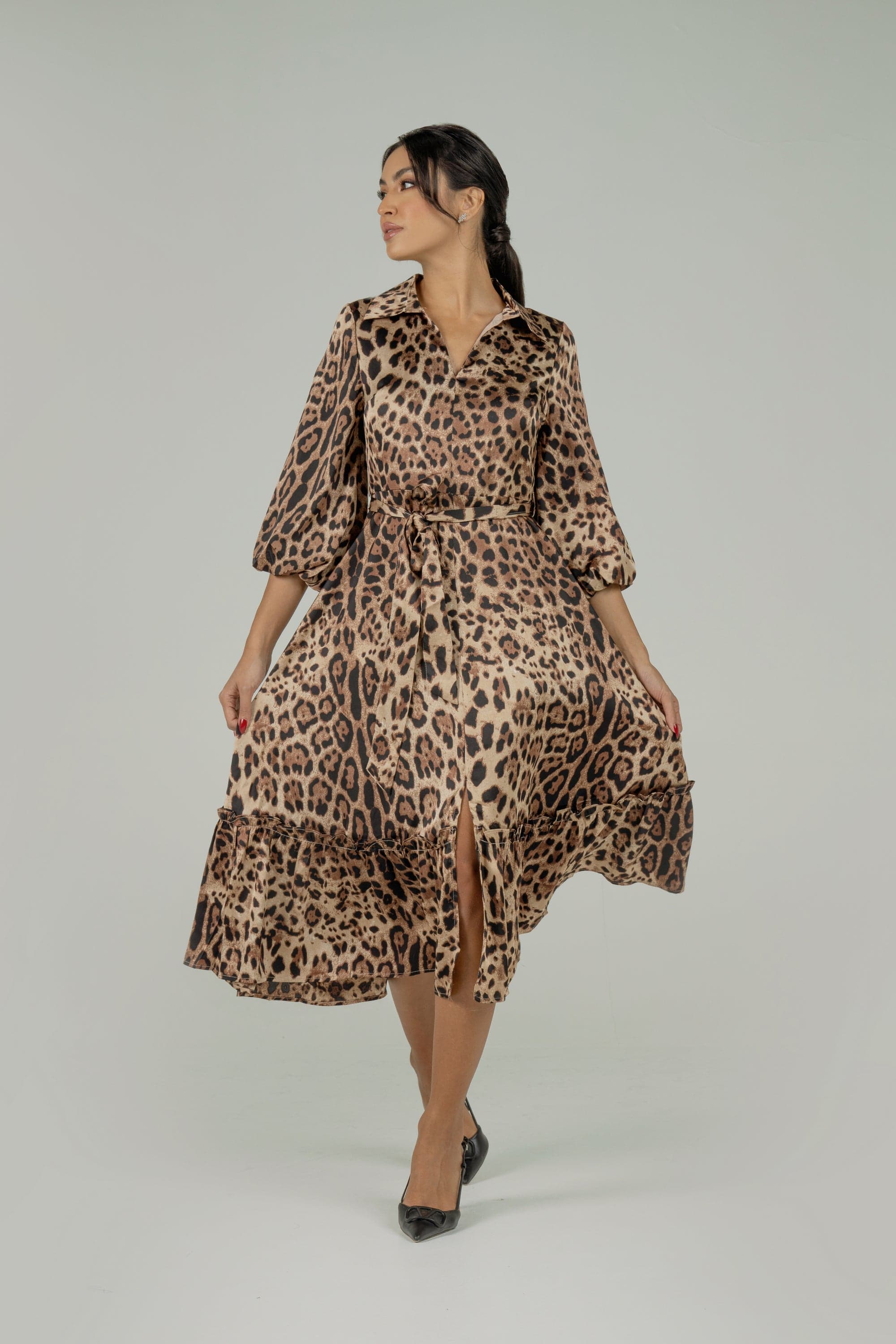 فستان نمري ميدي بفتحة أمامية مكشكش من تحت بأكمام 4/3