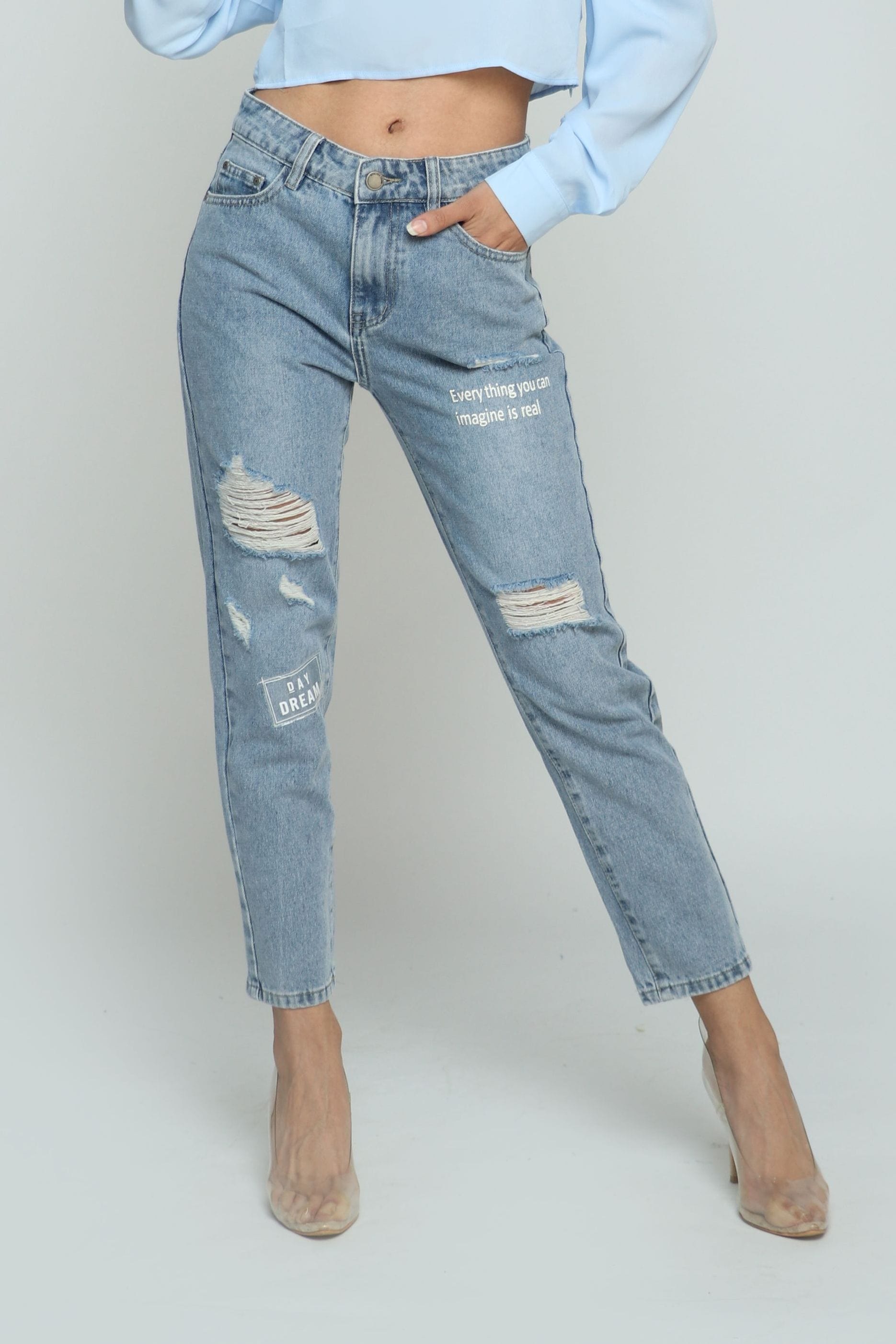 بنطلون بوي فريند مقطع مع بادج طويل نسائي