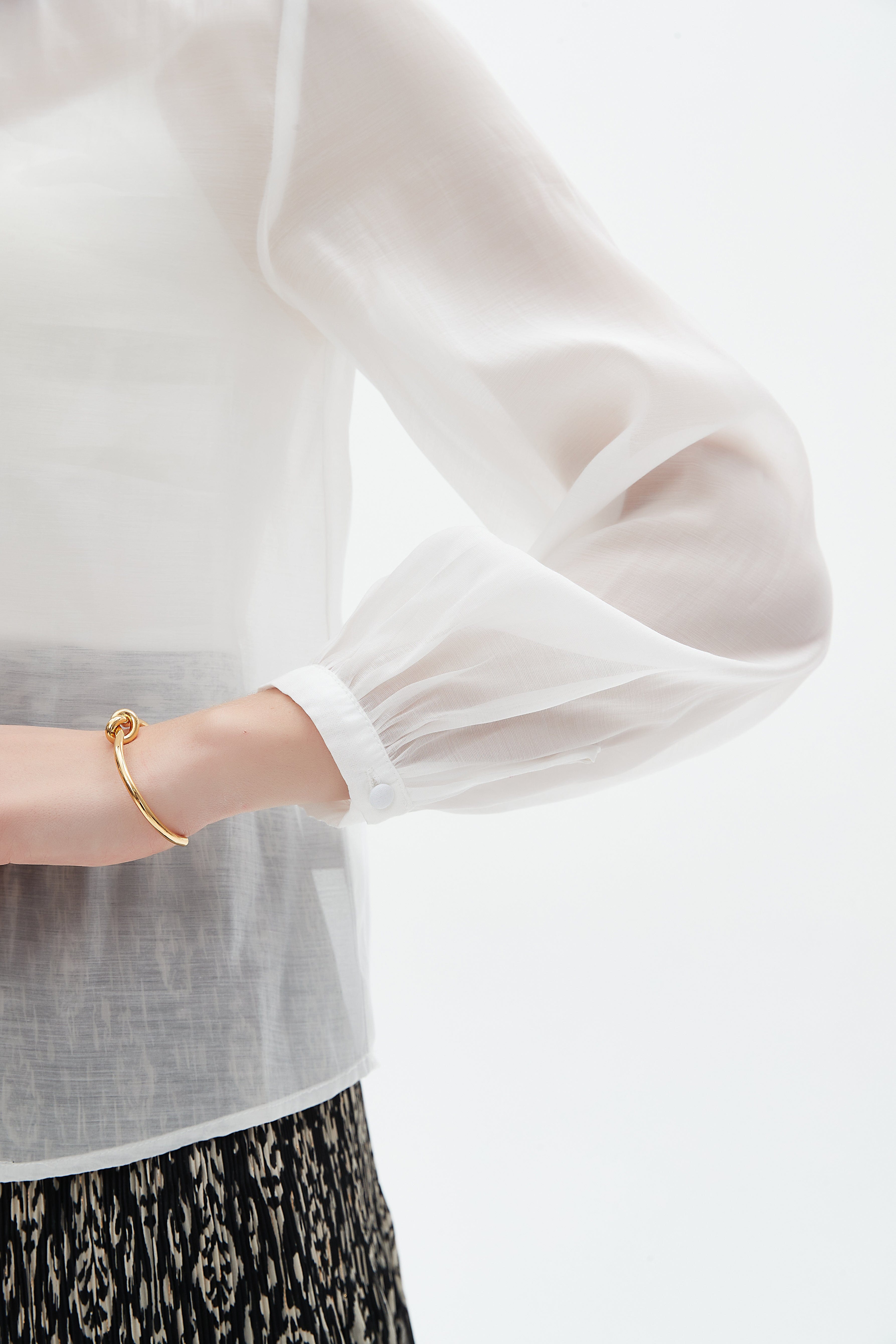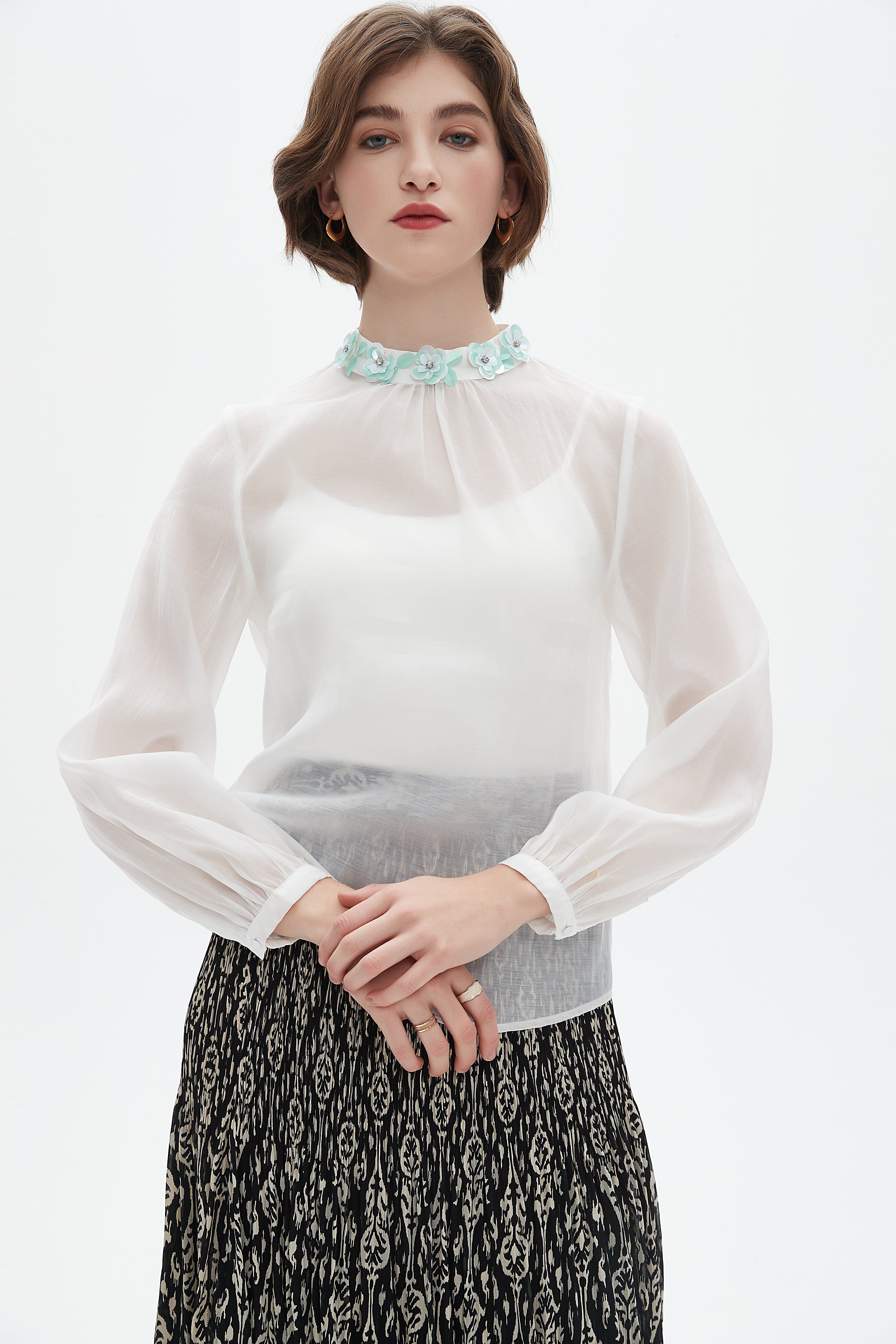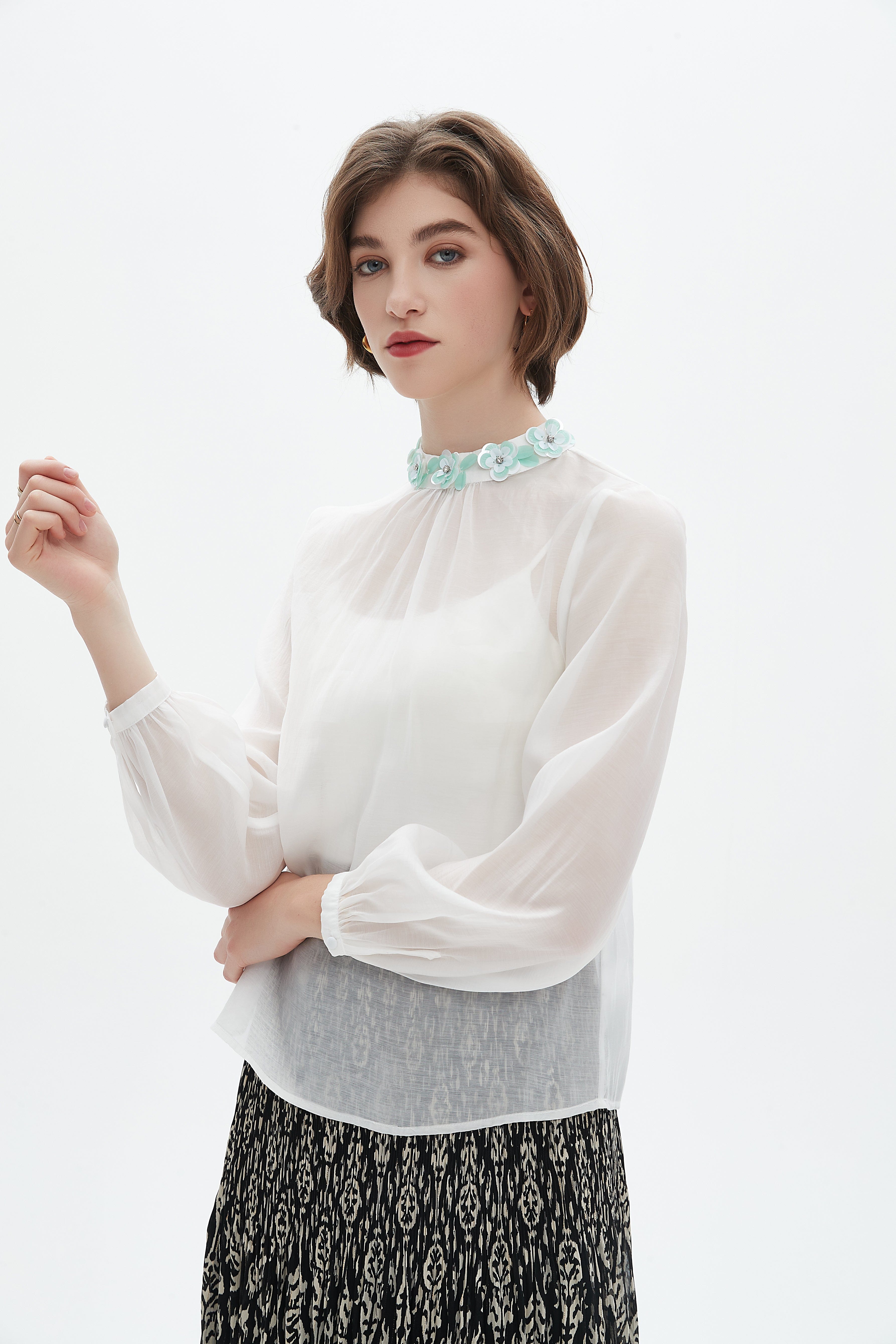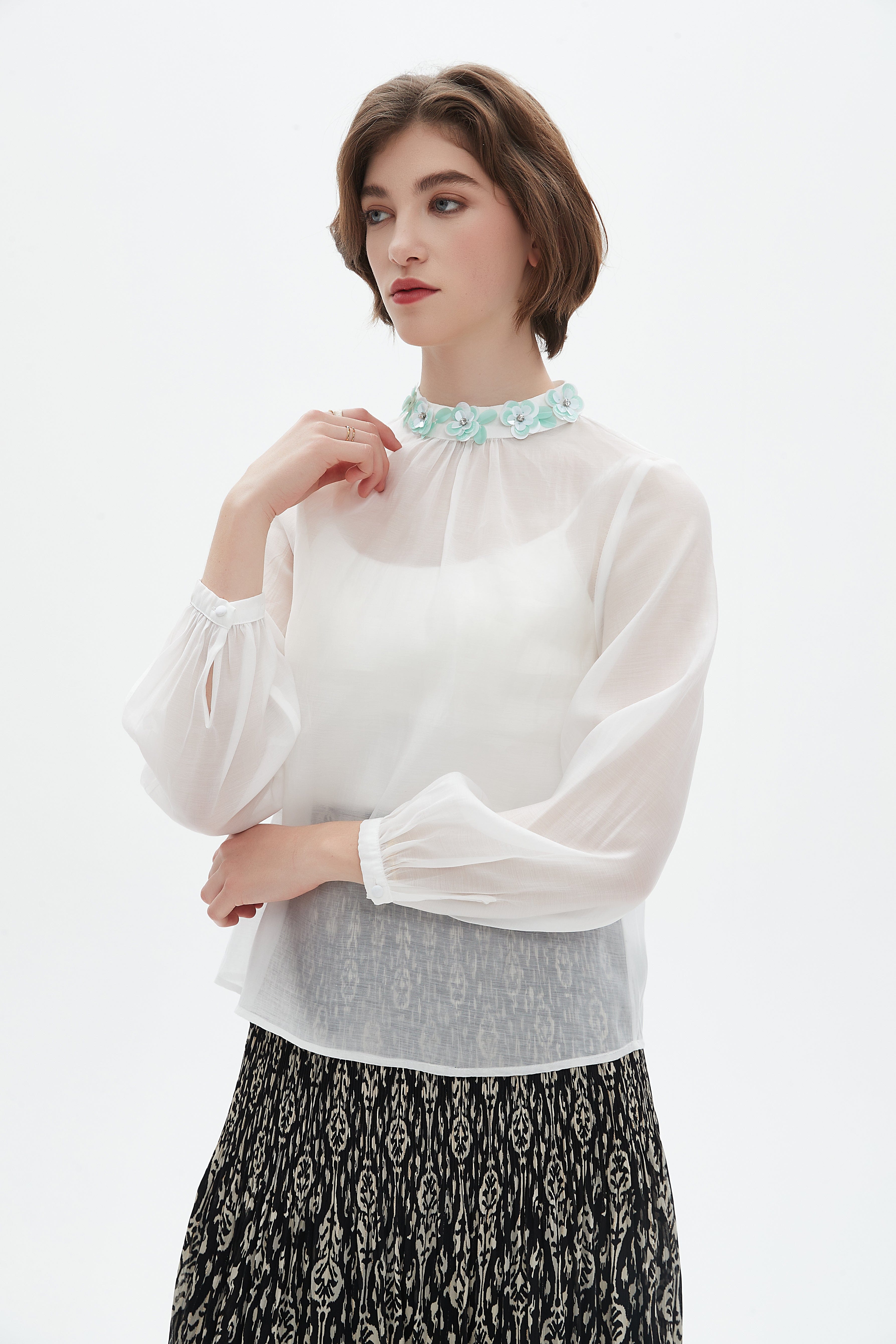 بلوزة بأكمام طويلة ورقبة مدورة بطوق ورود حول الياقة