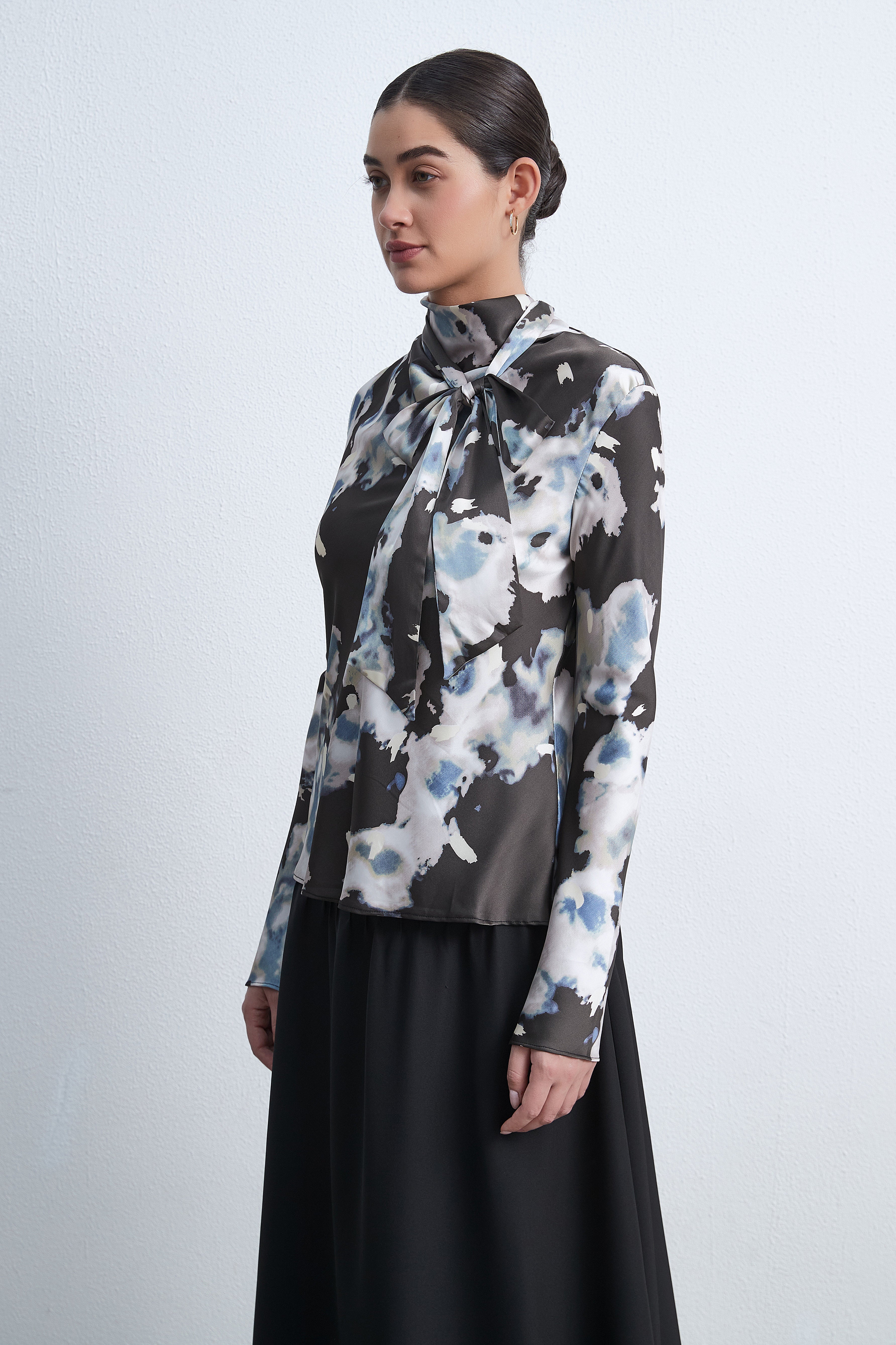 بلوزة مطبوعة بكم طويل بفتحة رقبة مرتفعة