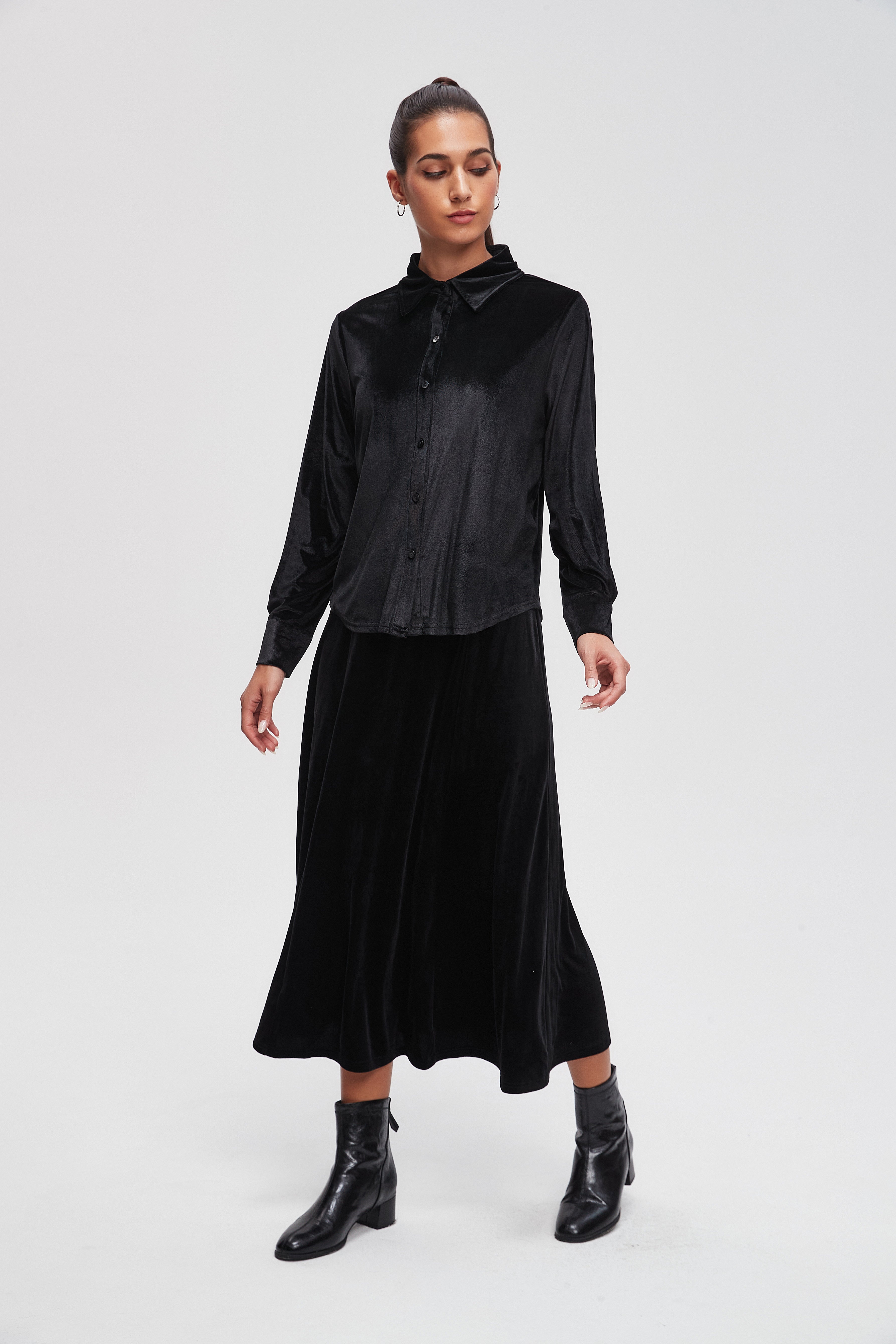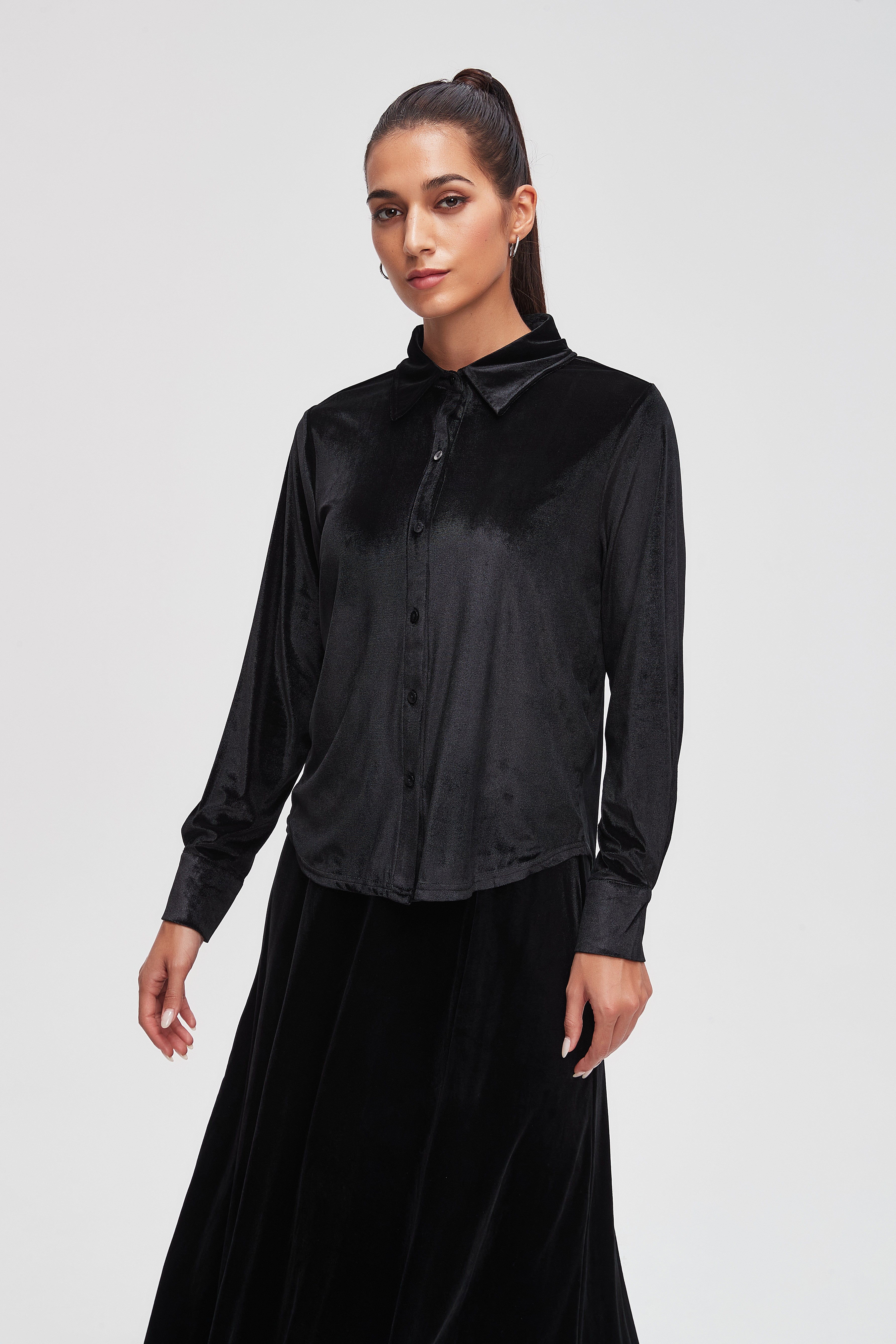بلوزة بطول الخصر بكم طويل ورقبة مستديرة
