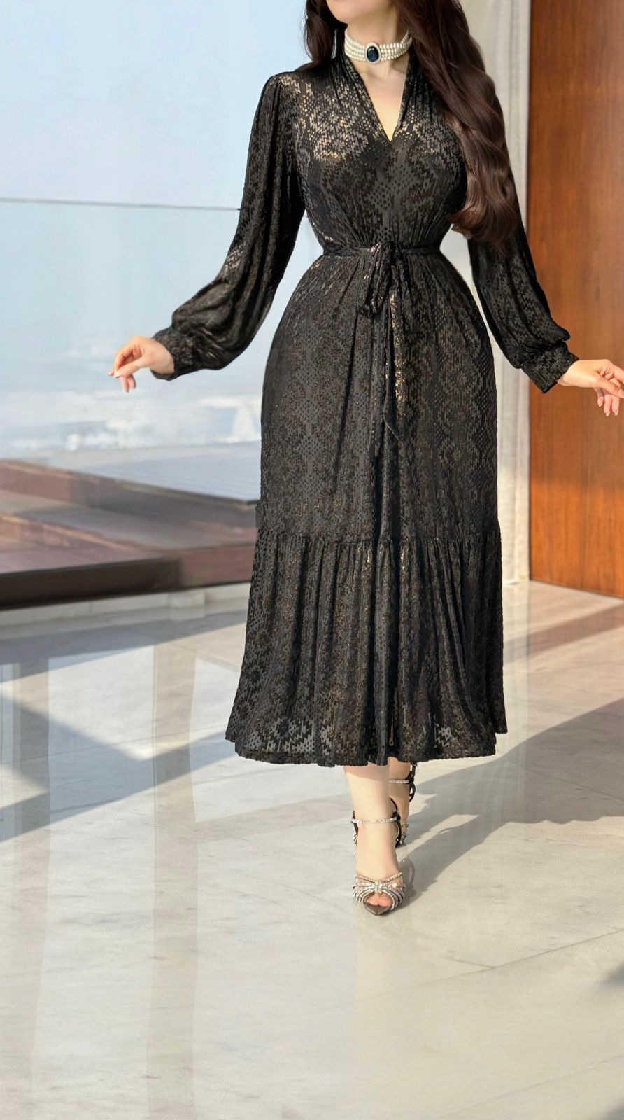 فستان ميدي بأكمام طويله بربطه من الخصر