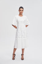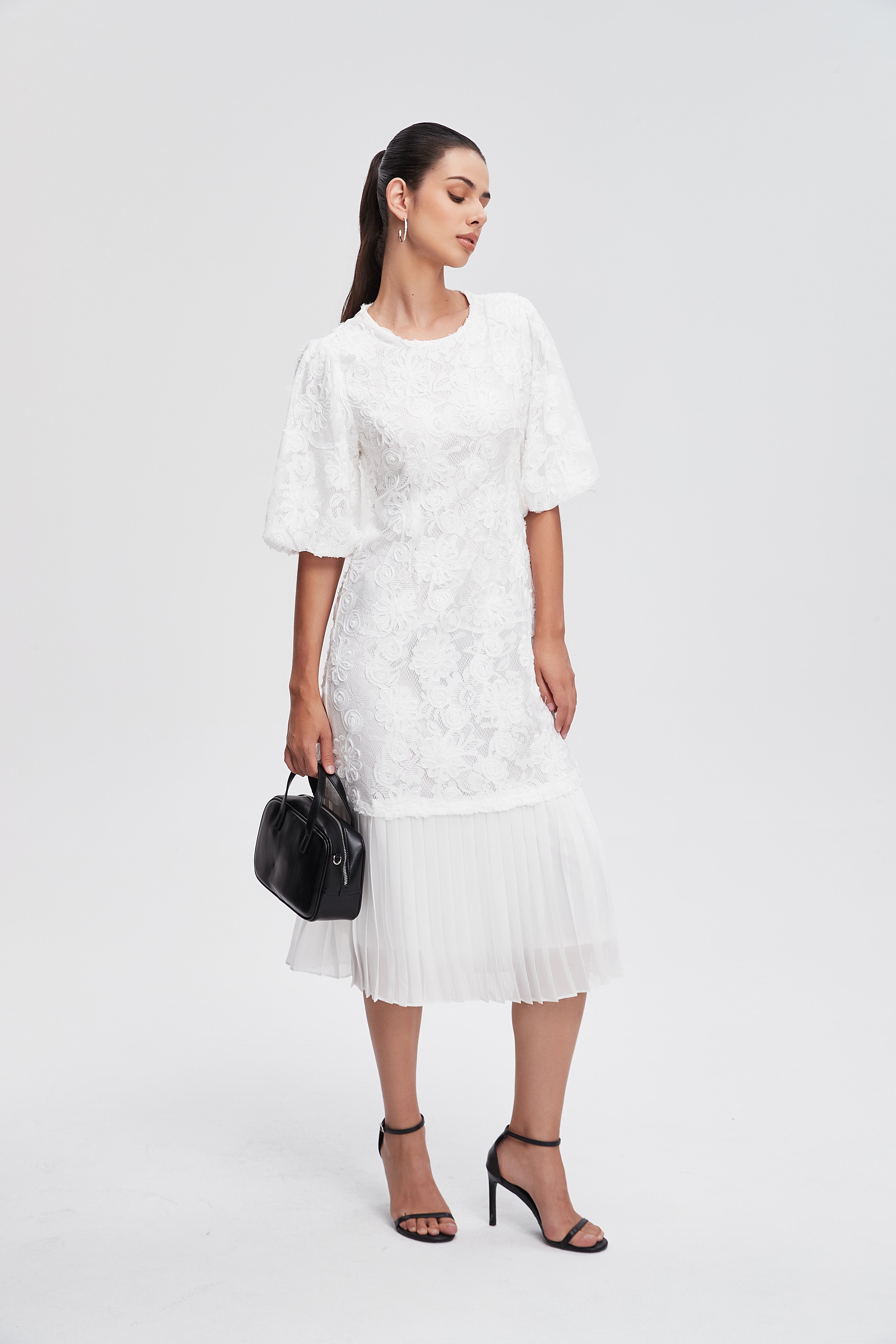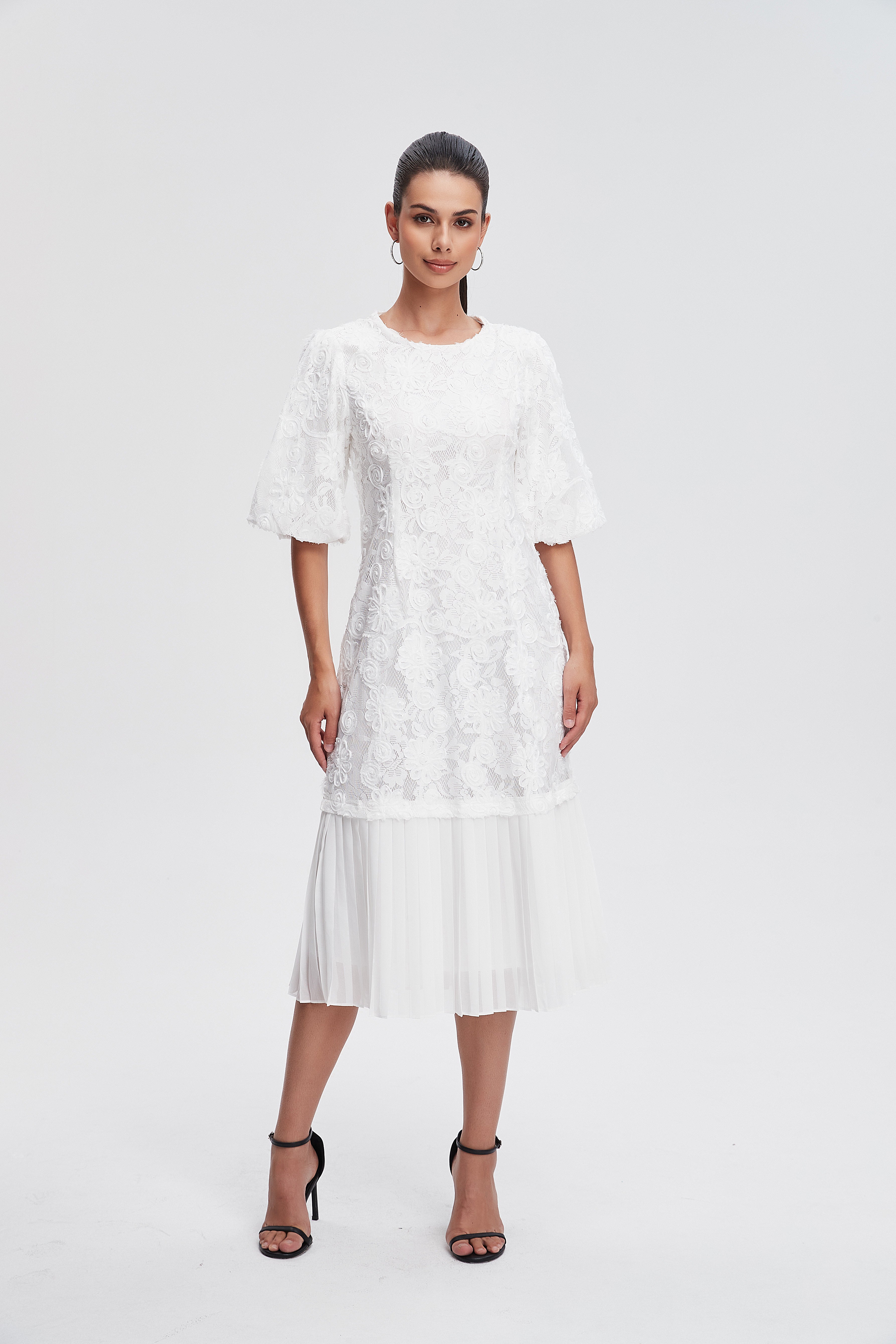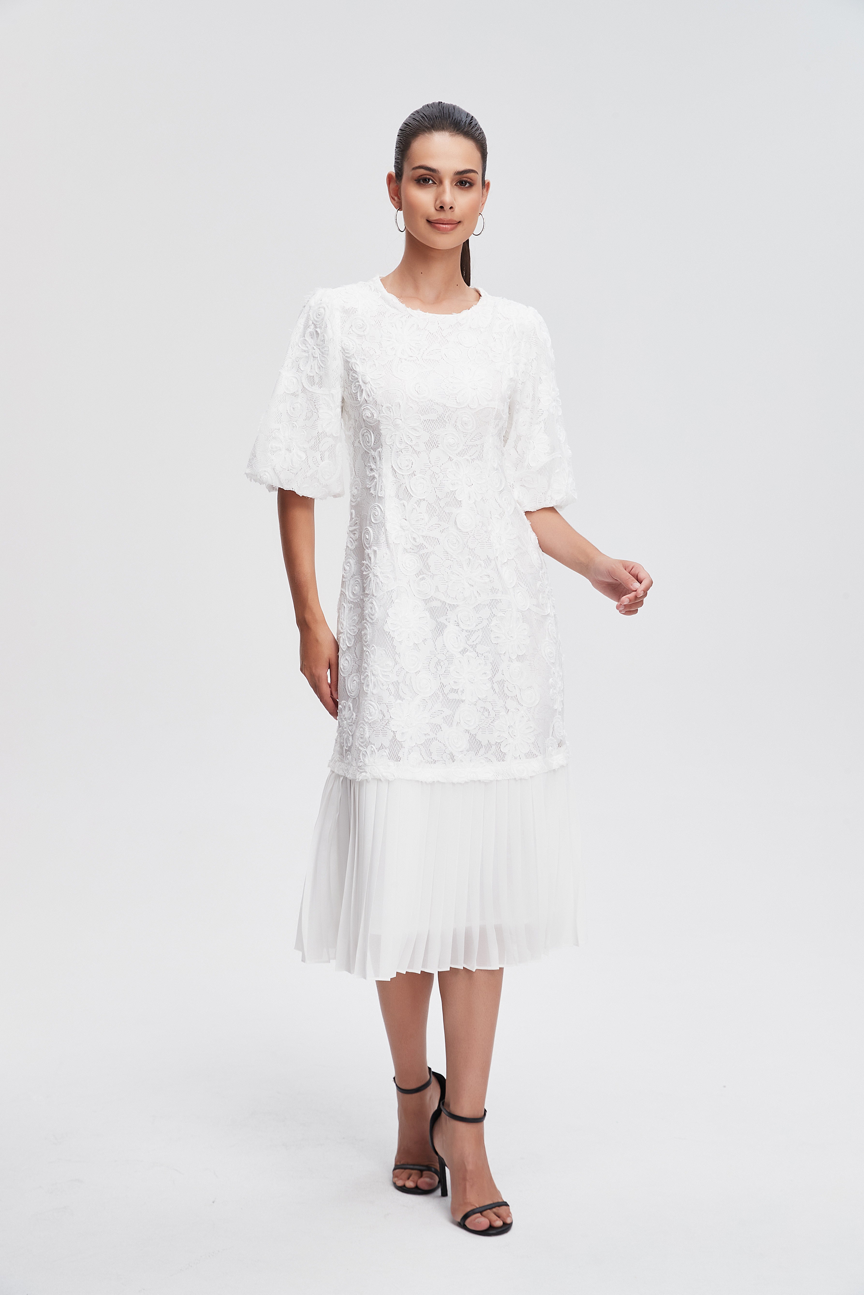 - ياقة مستديرة وأكمام منفوشة قصيرة تضيف حركة