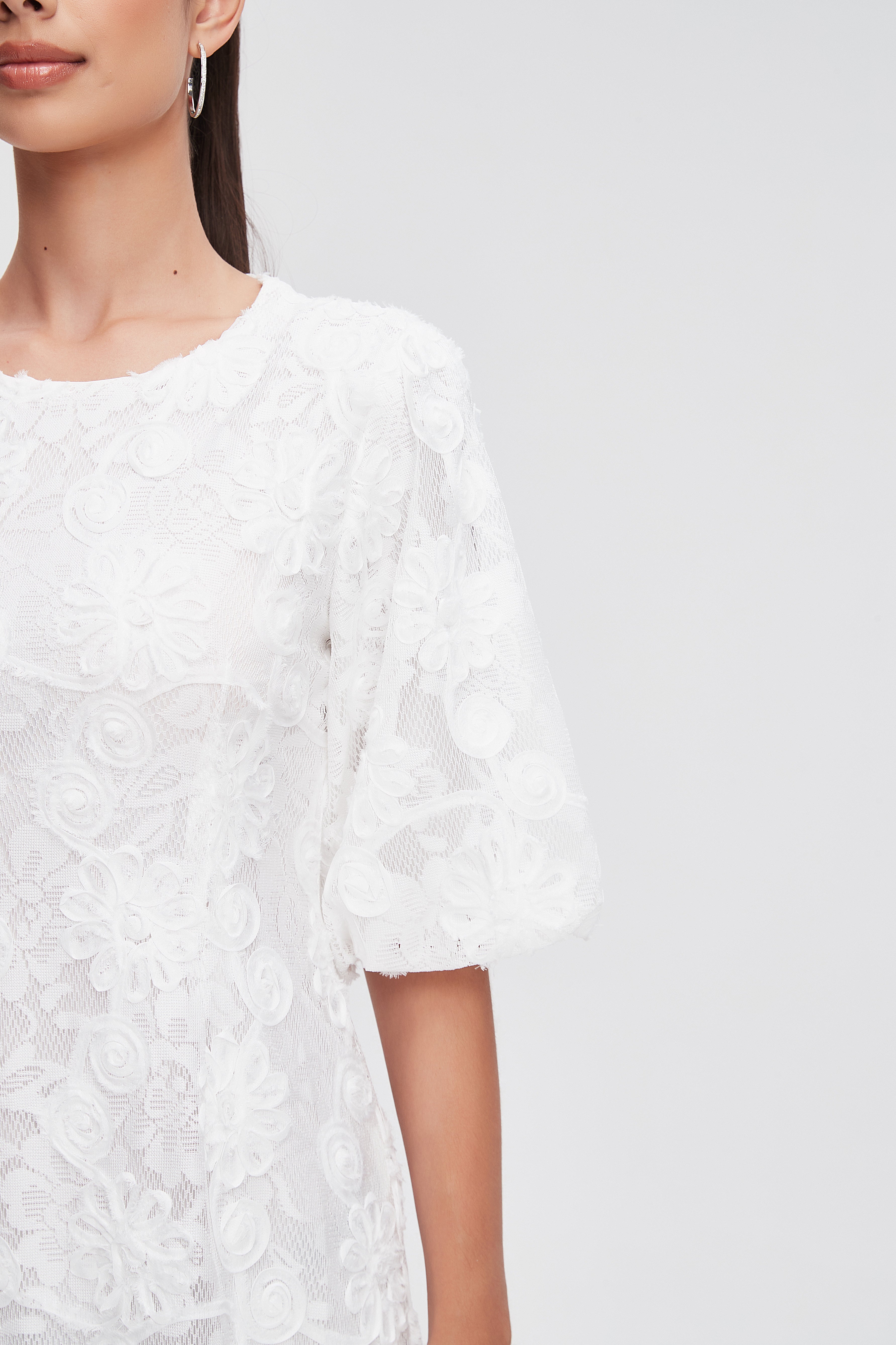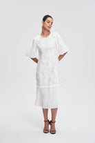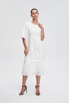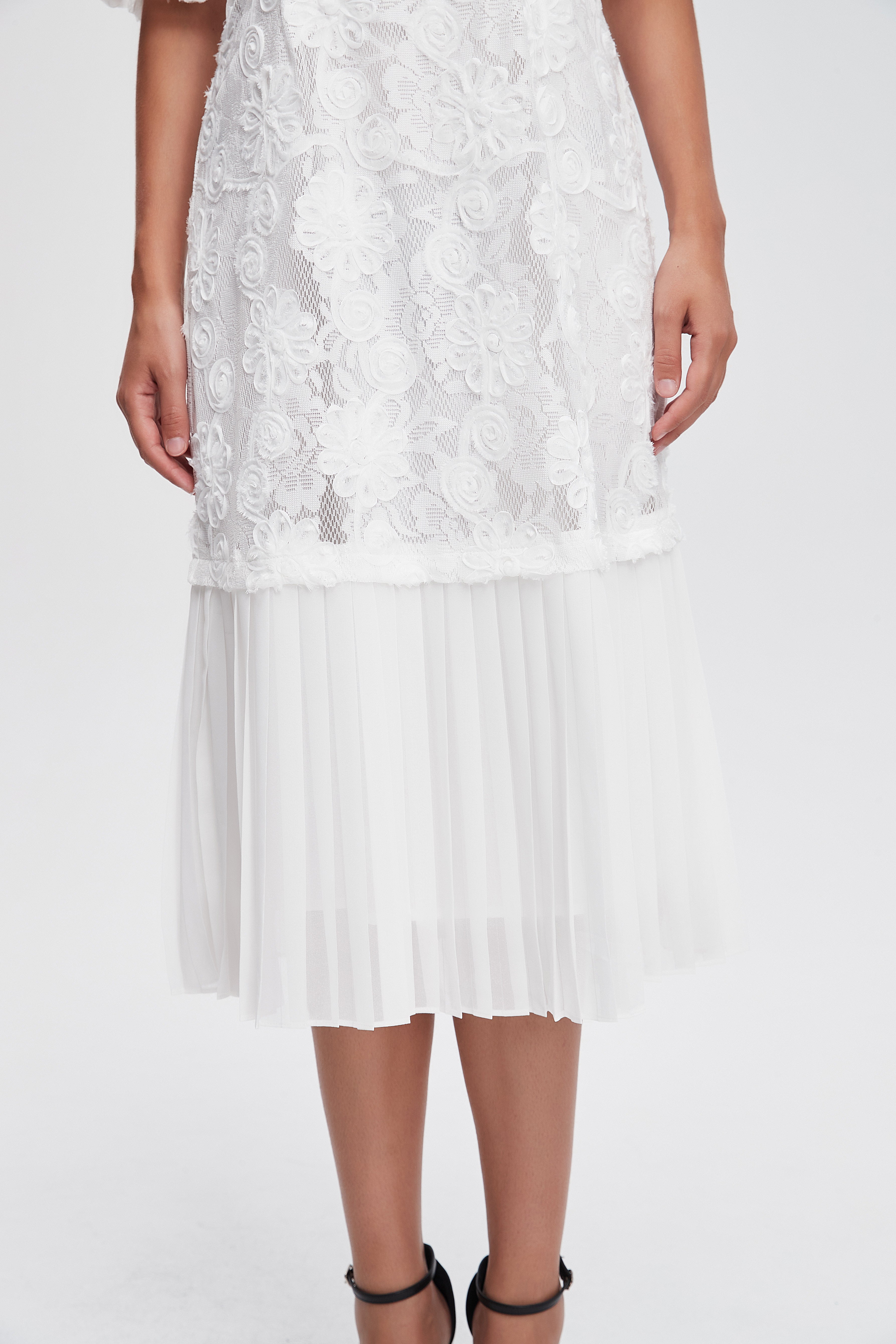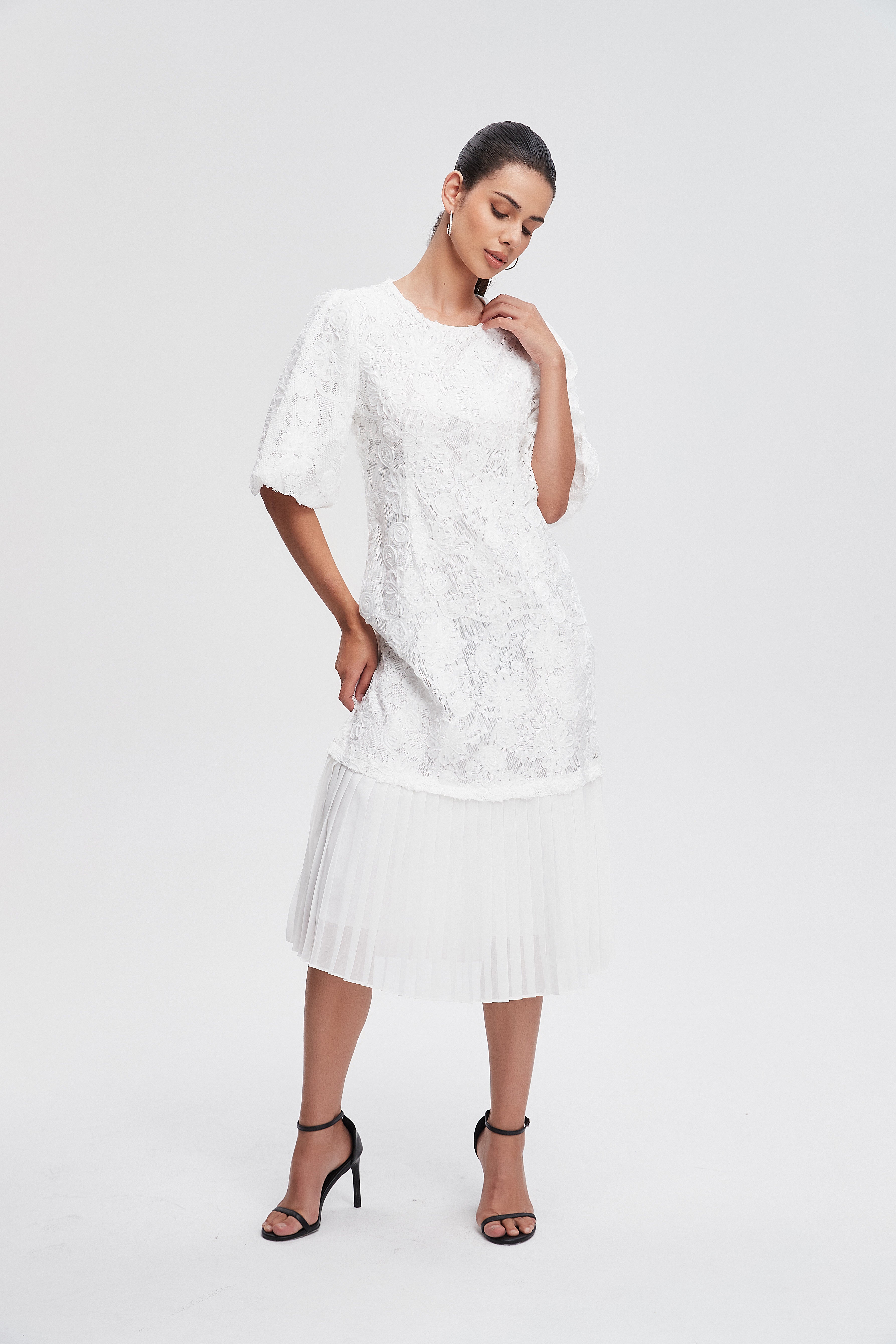 - ياقة مستديرة وأكمام منفوشة قصيرة تضيف حركة