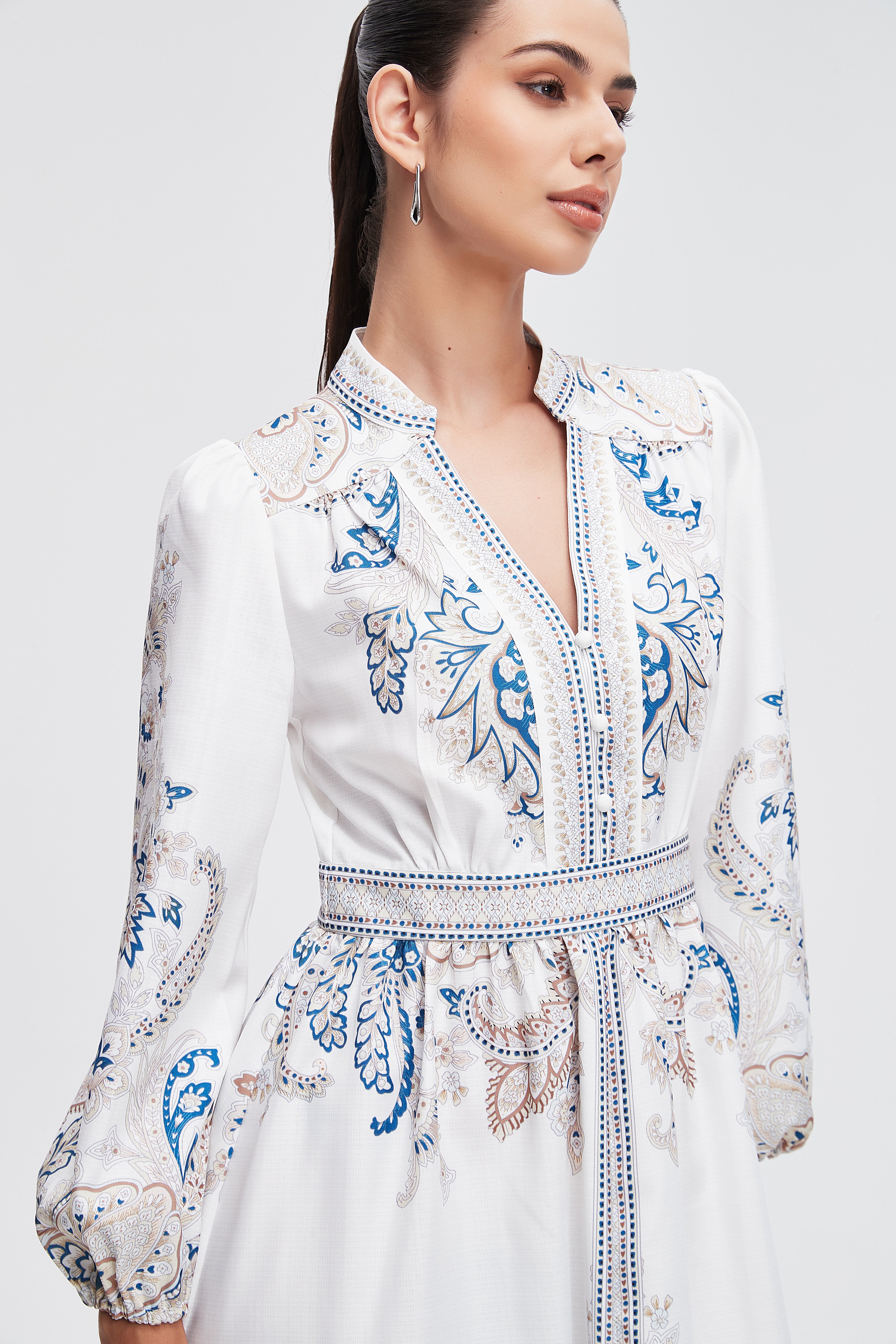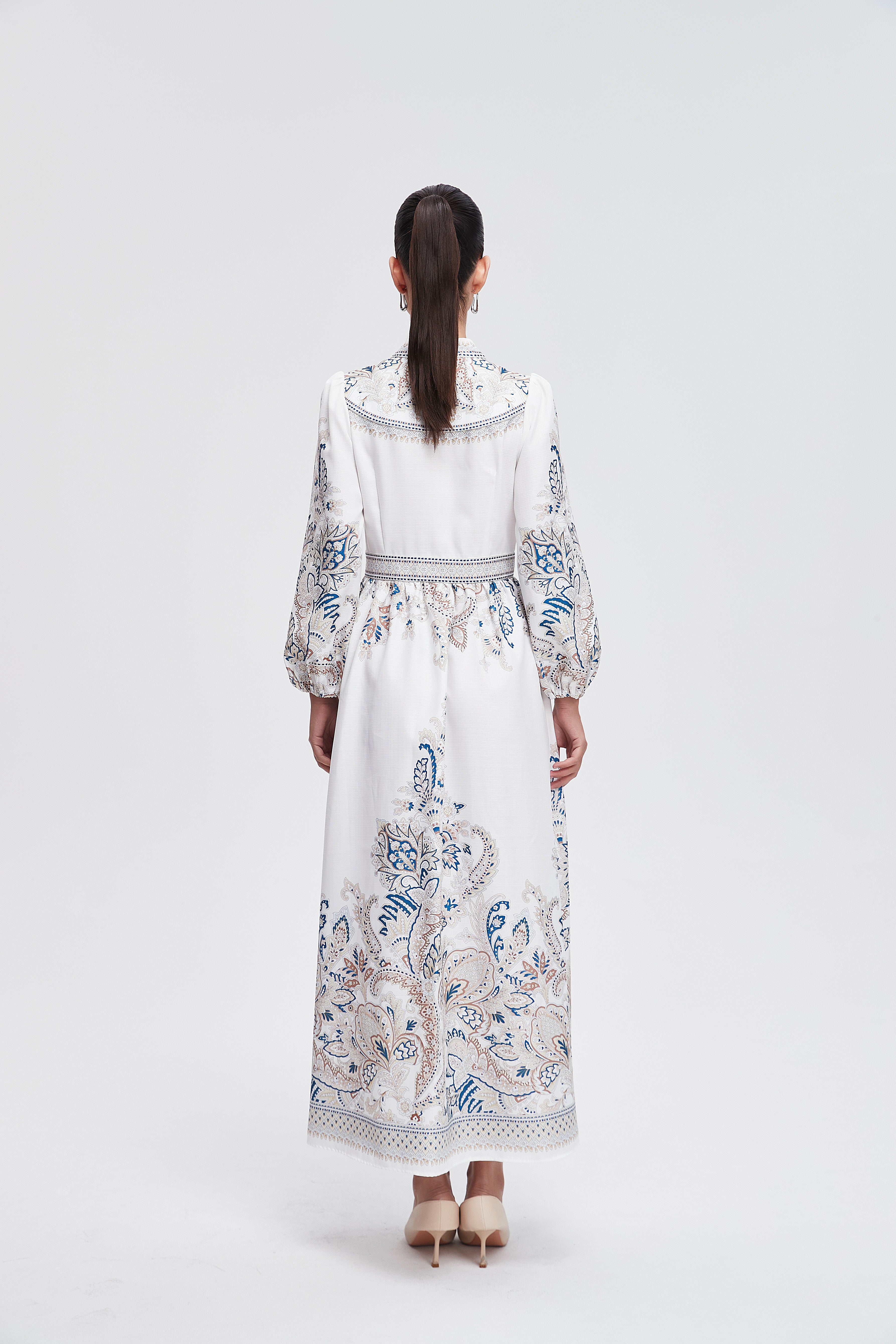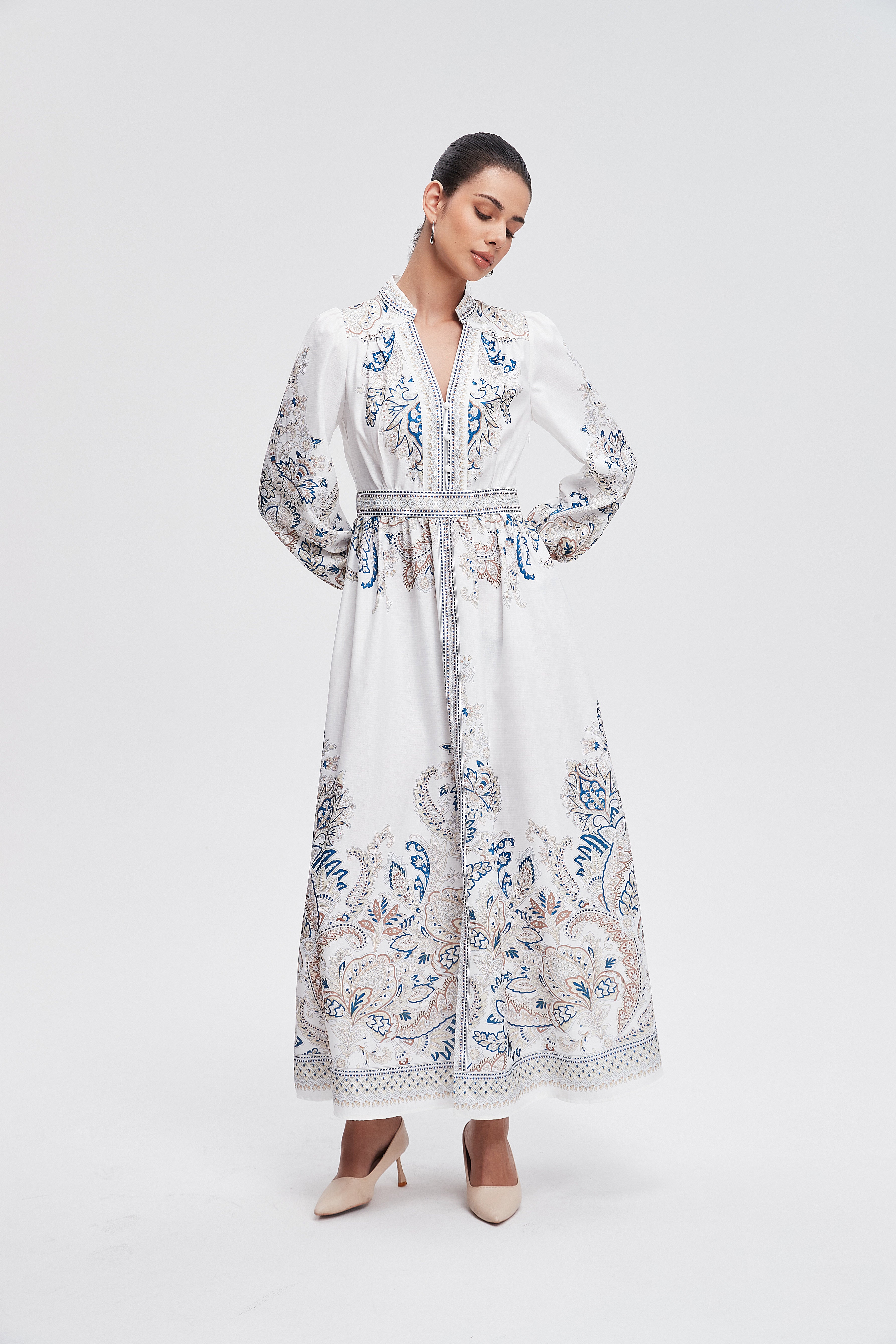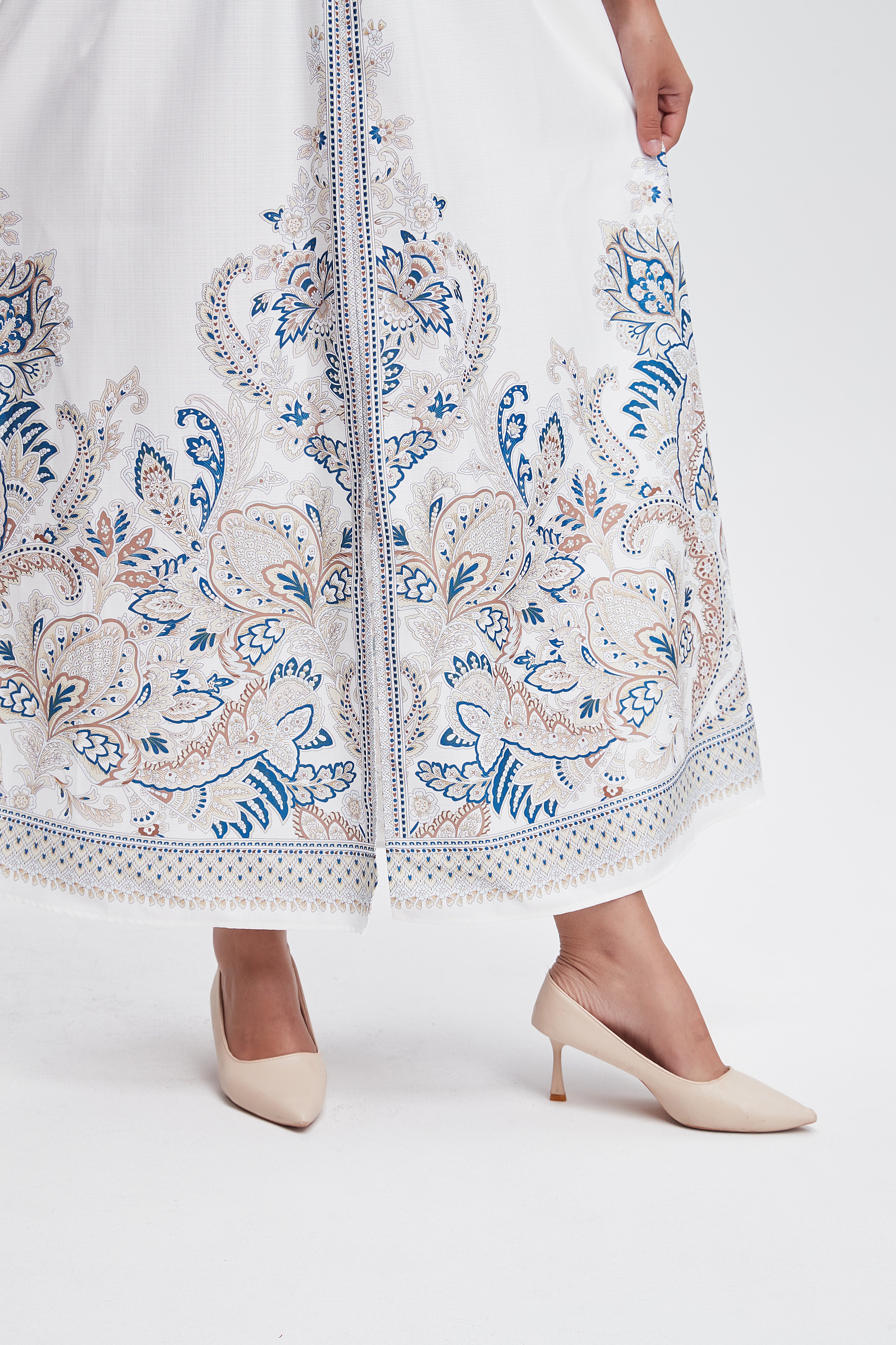 • العناية: غسلي الفستان على دورة باردة أو لطيفة للحفاظ على نقشه، استخدمي منظف معتدل، تجنبي المبيضات، يفضل التجفيف بالهواء أو على حرارة منخفضة ومكواة خفيفة عند الحاجة.