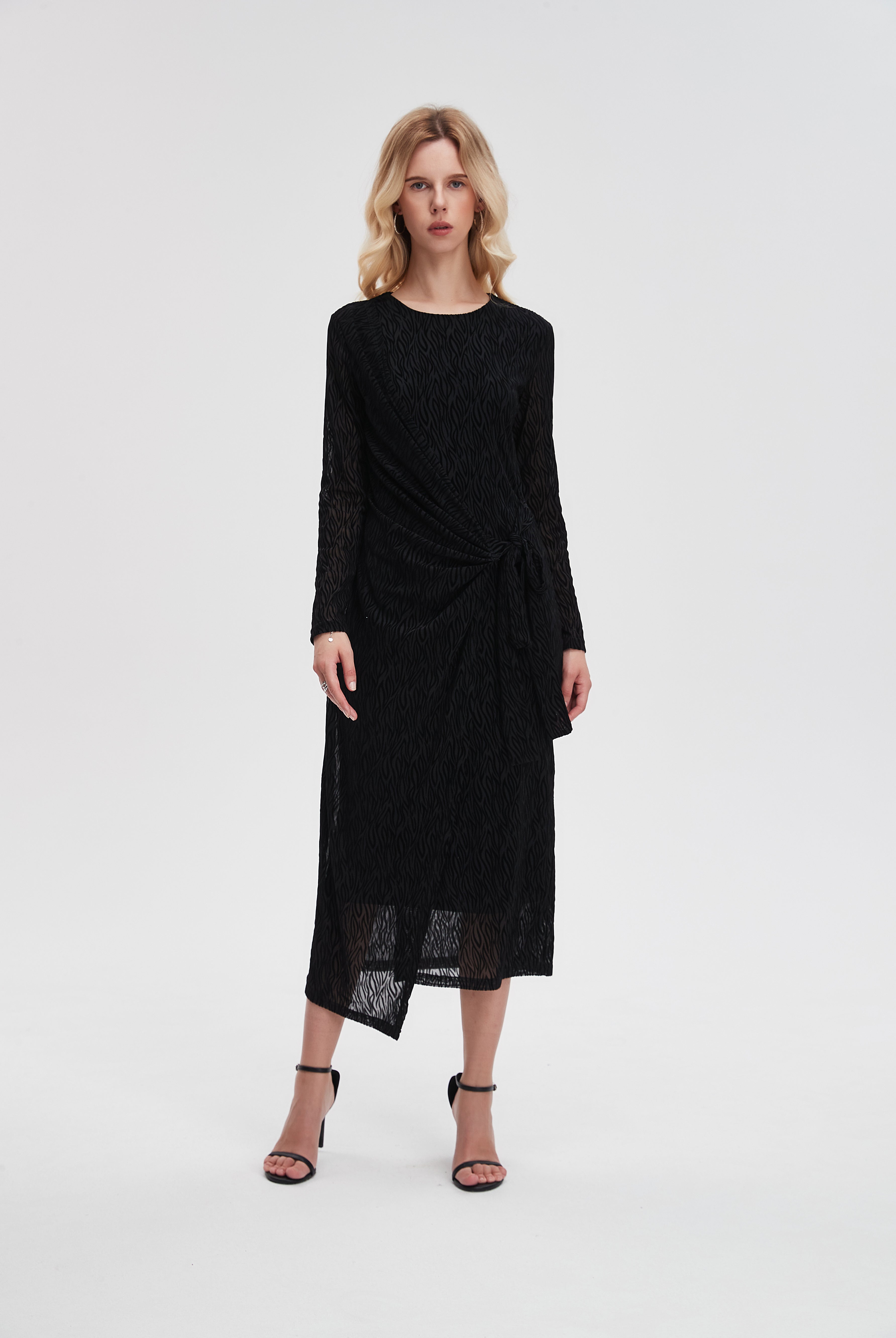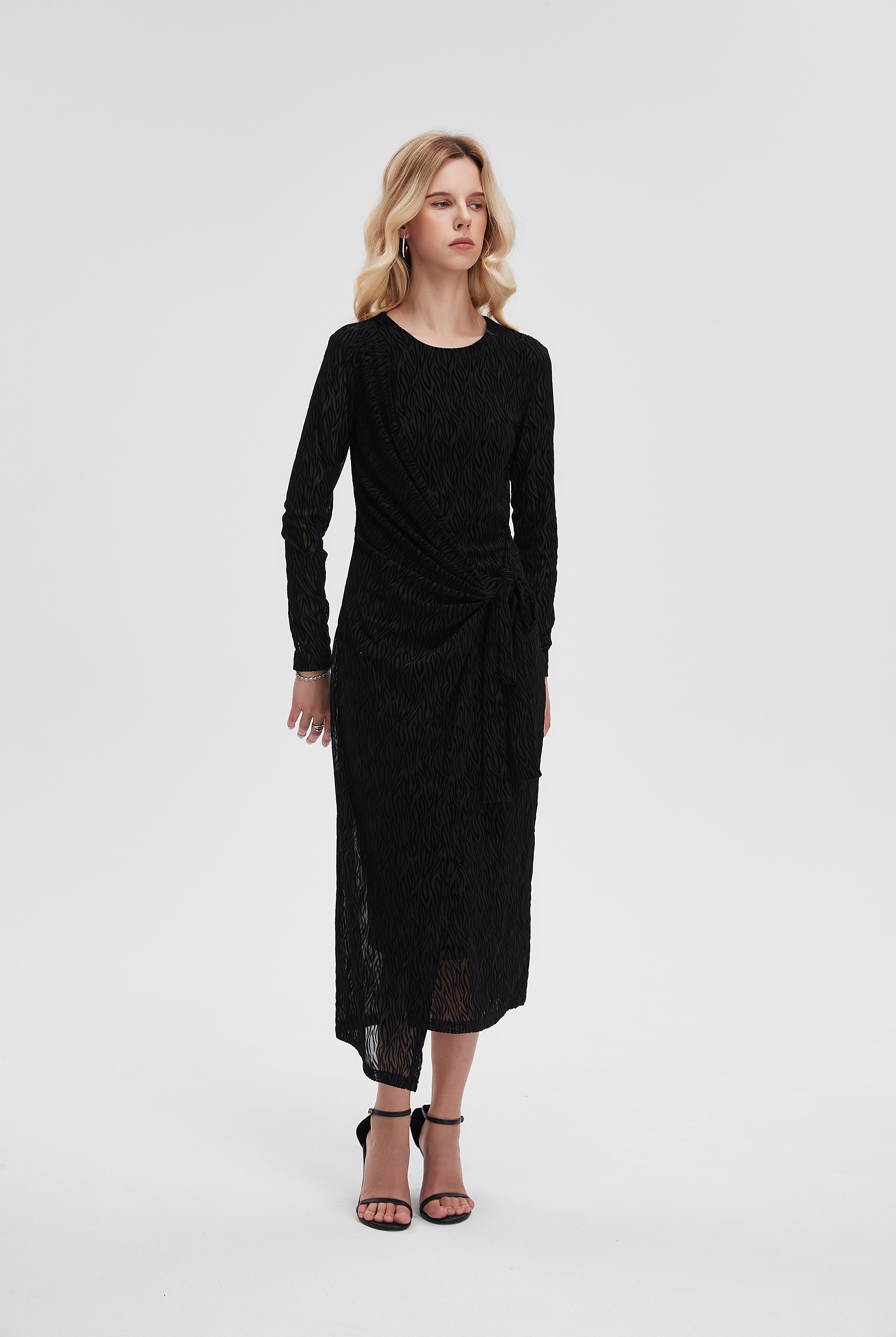فستان ميدي بأكمام طويله بربطه من الخصر