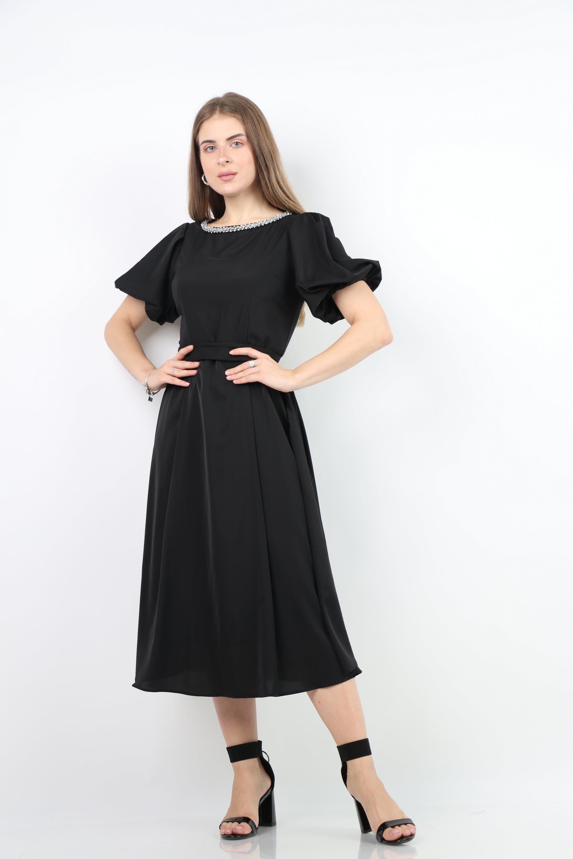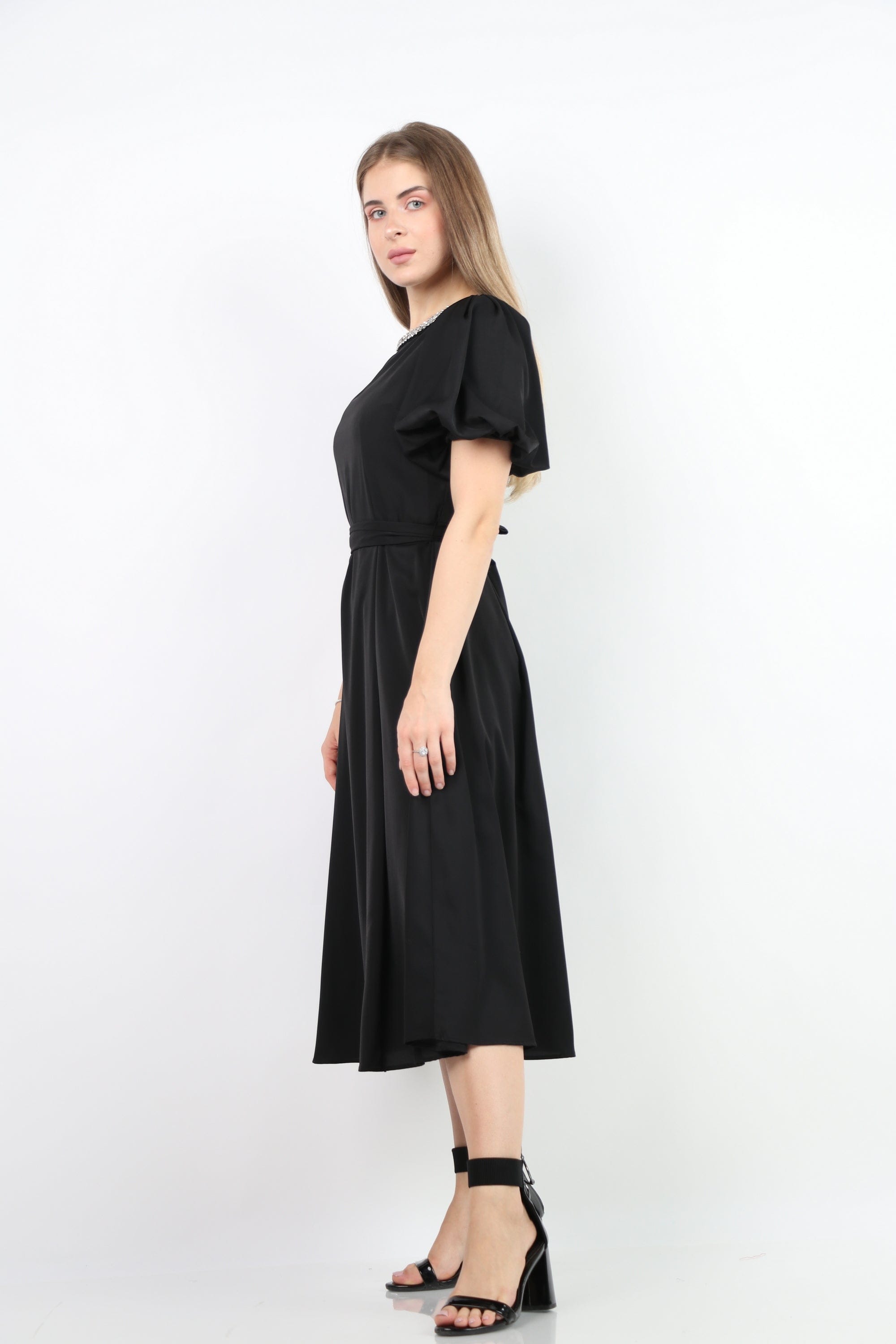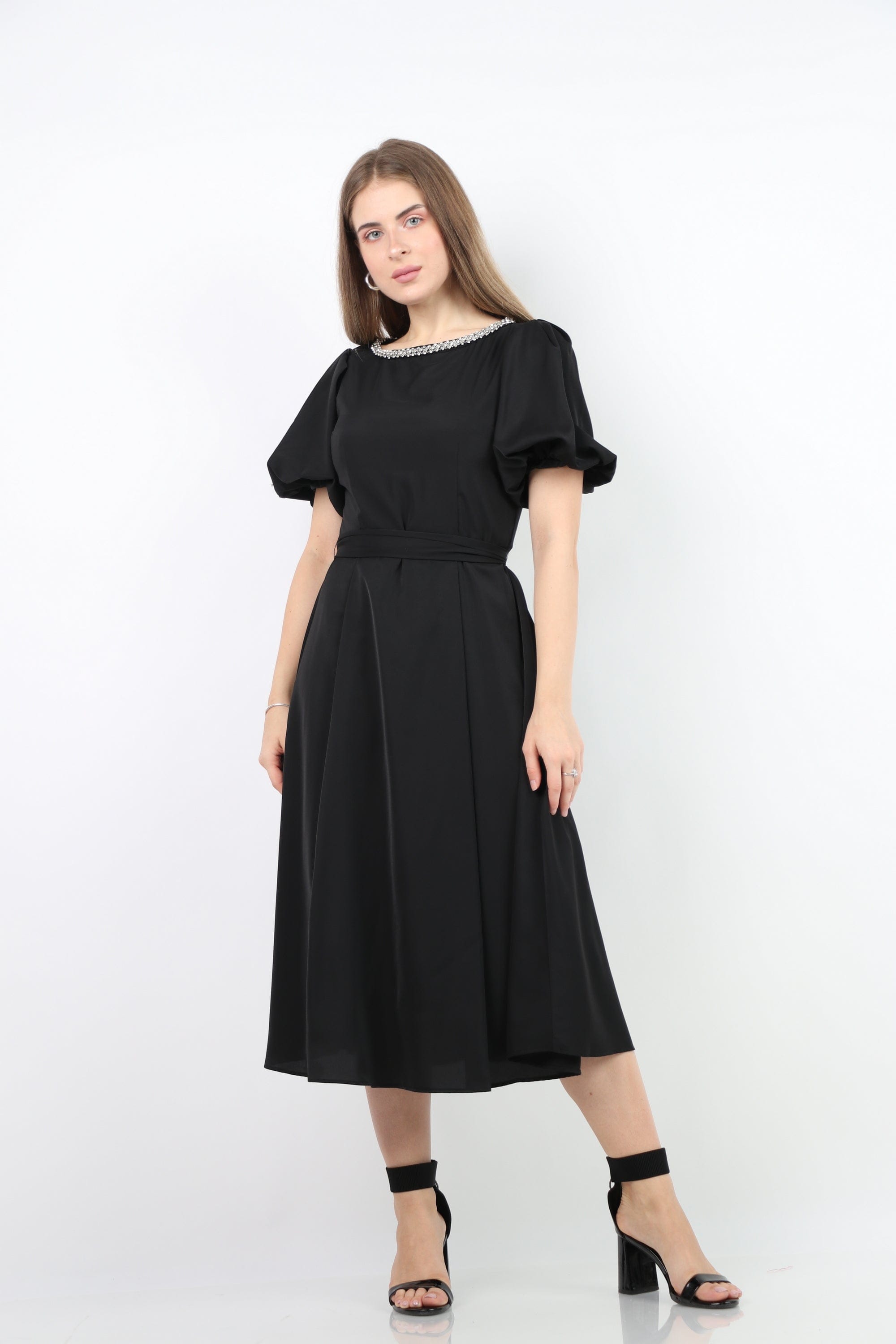 فستان ميدي كم قصير بف مزين بسوار رقبة