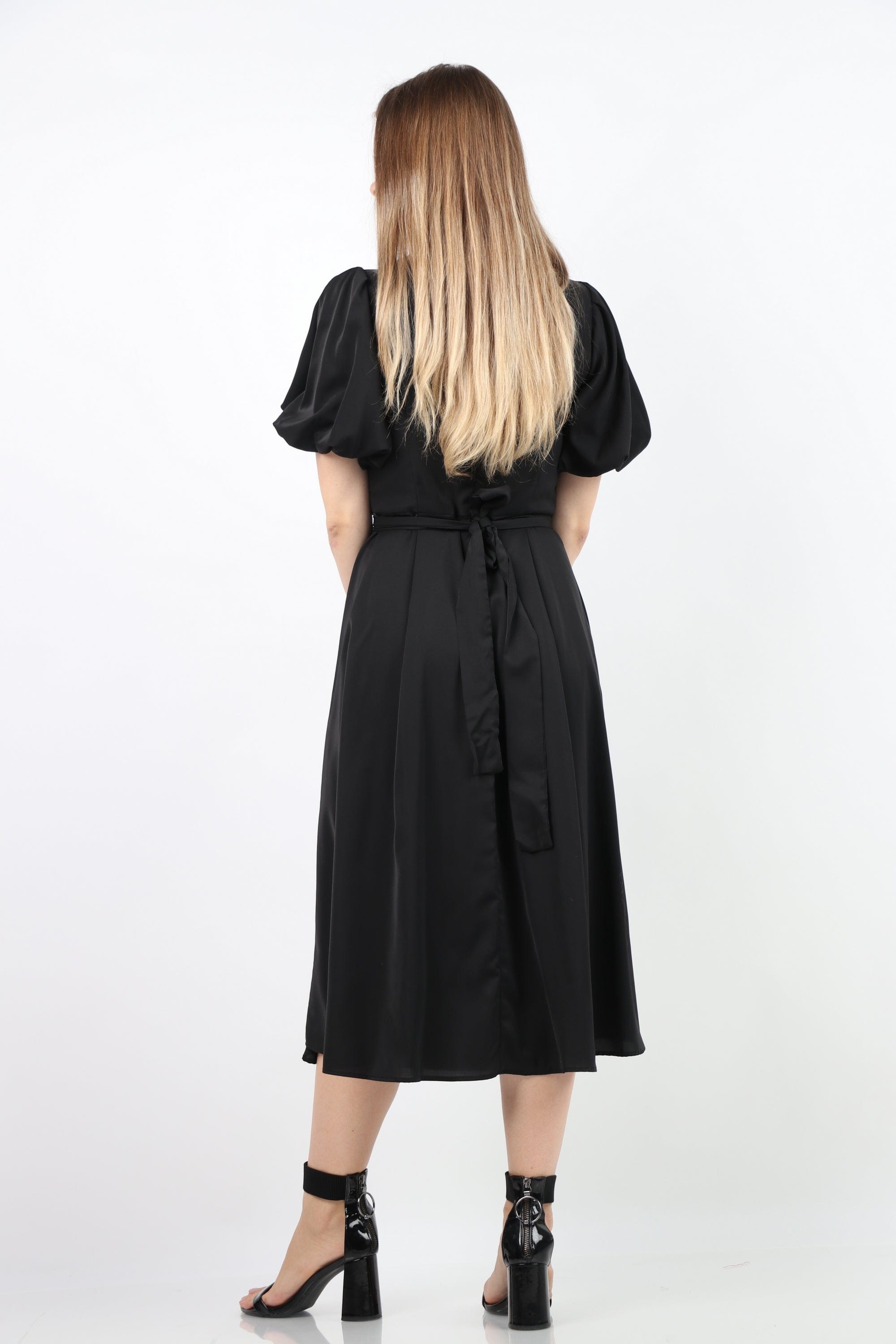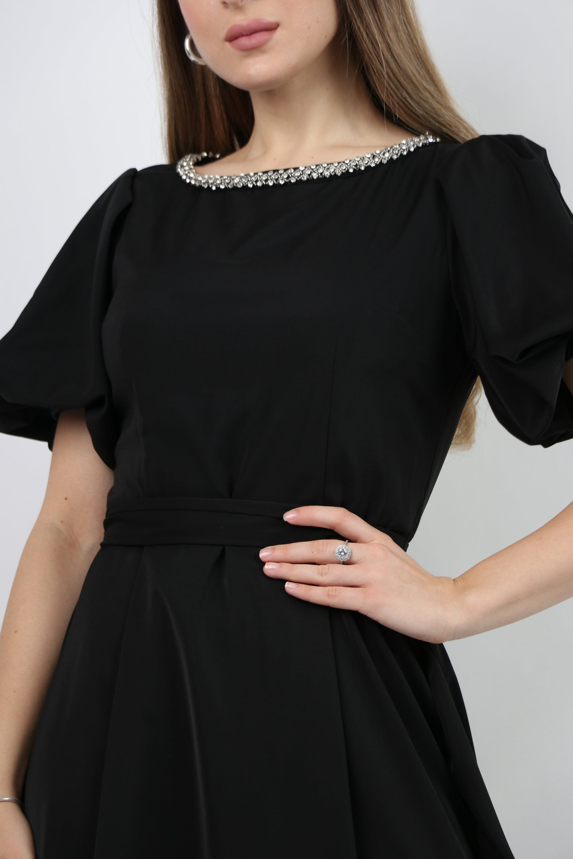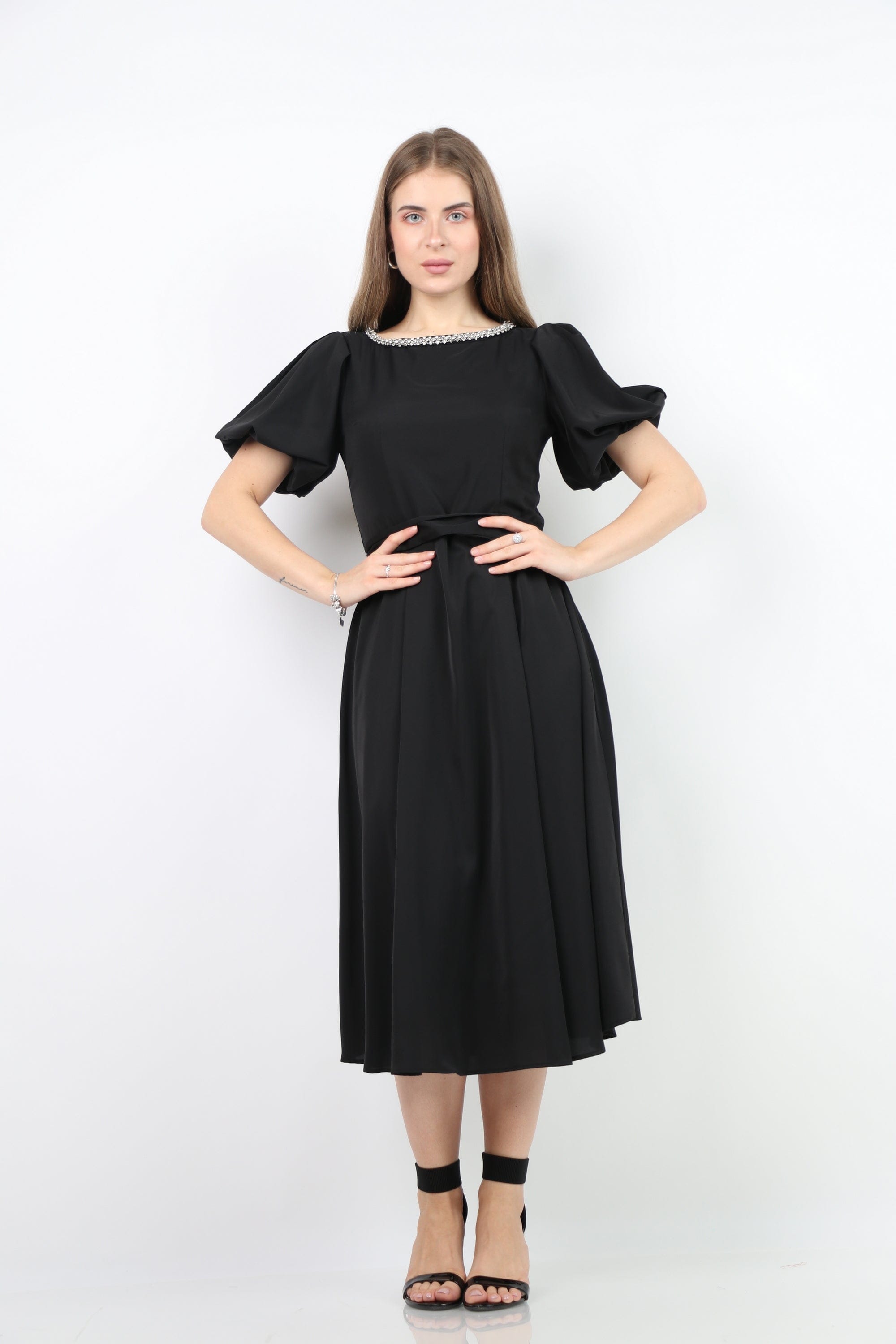 فستان ميدي كم قصير بف مزين بسوار رقبة
