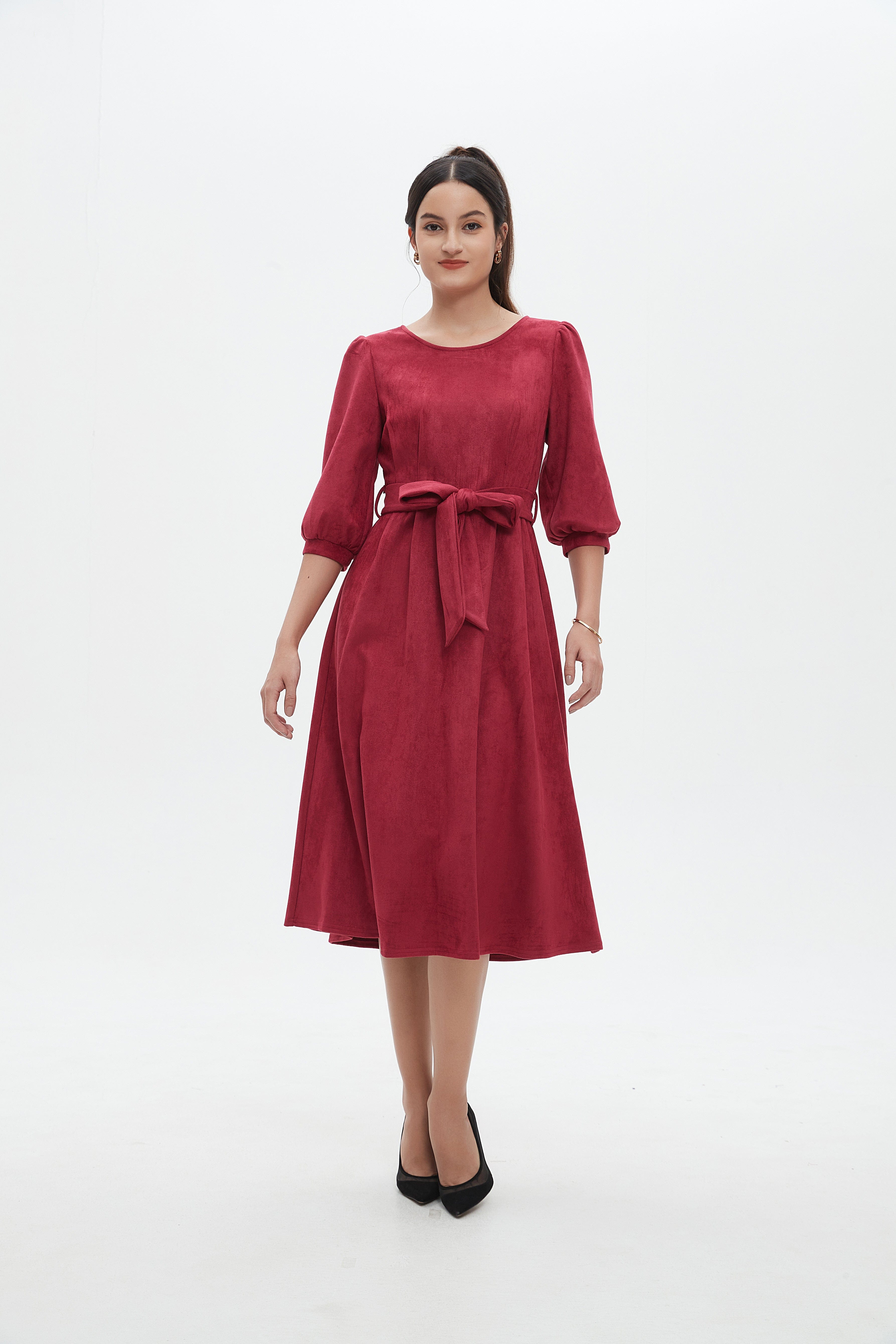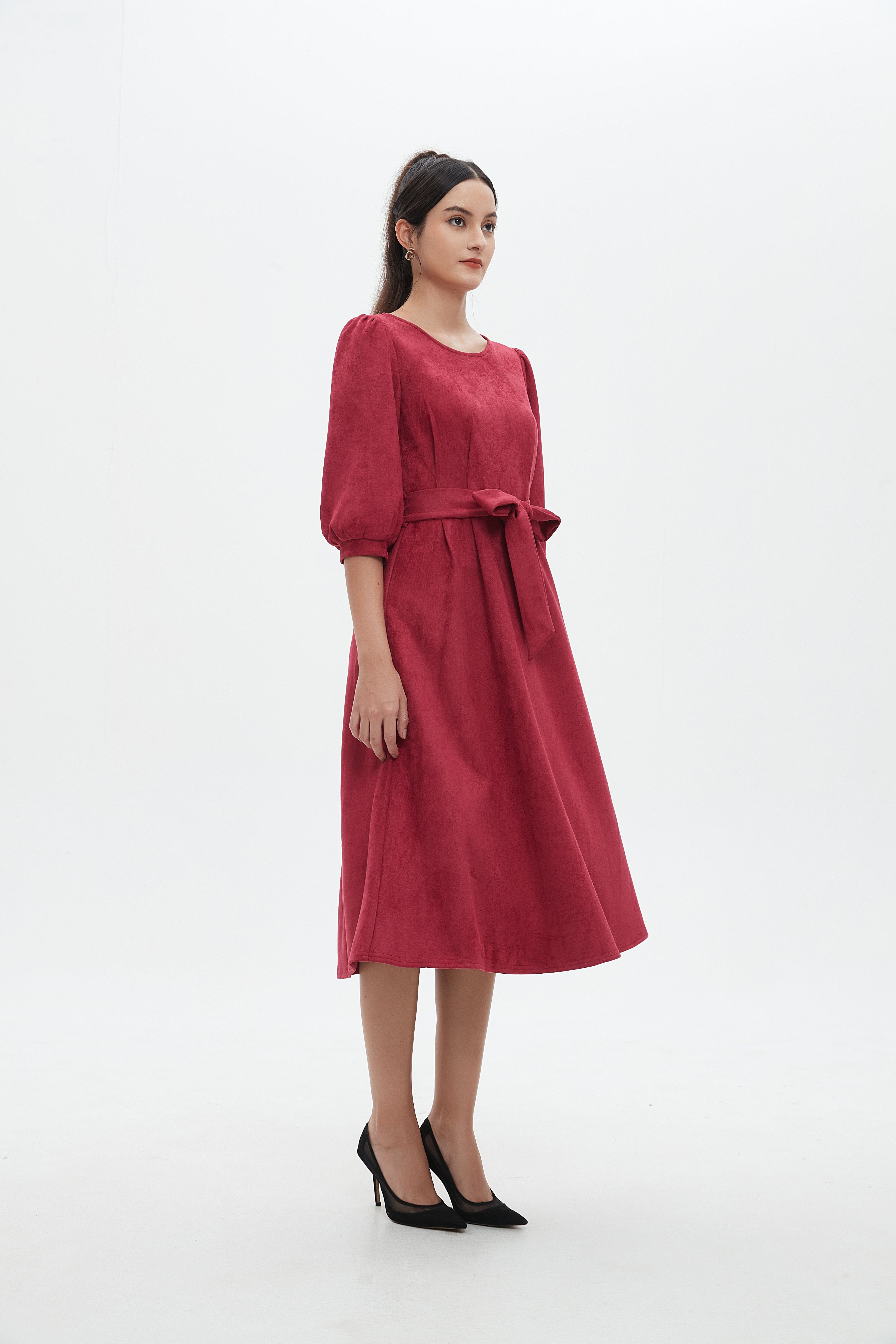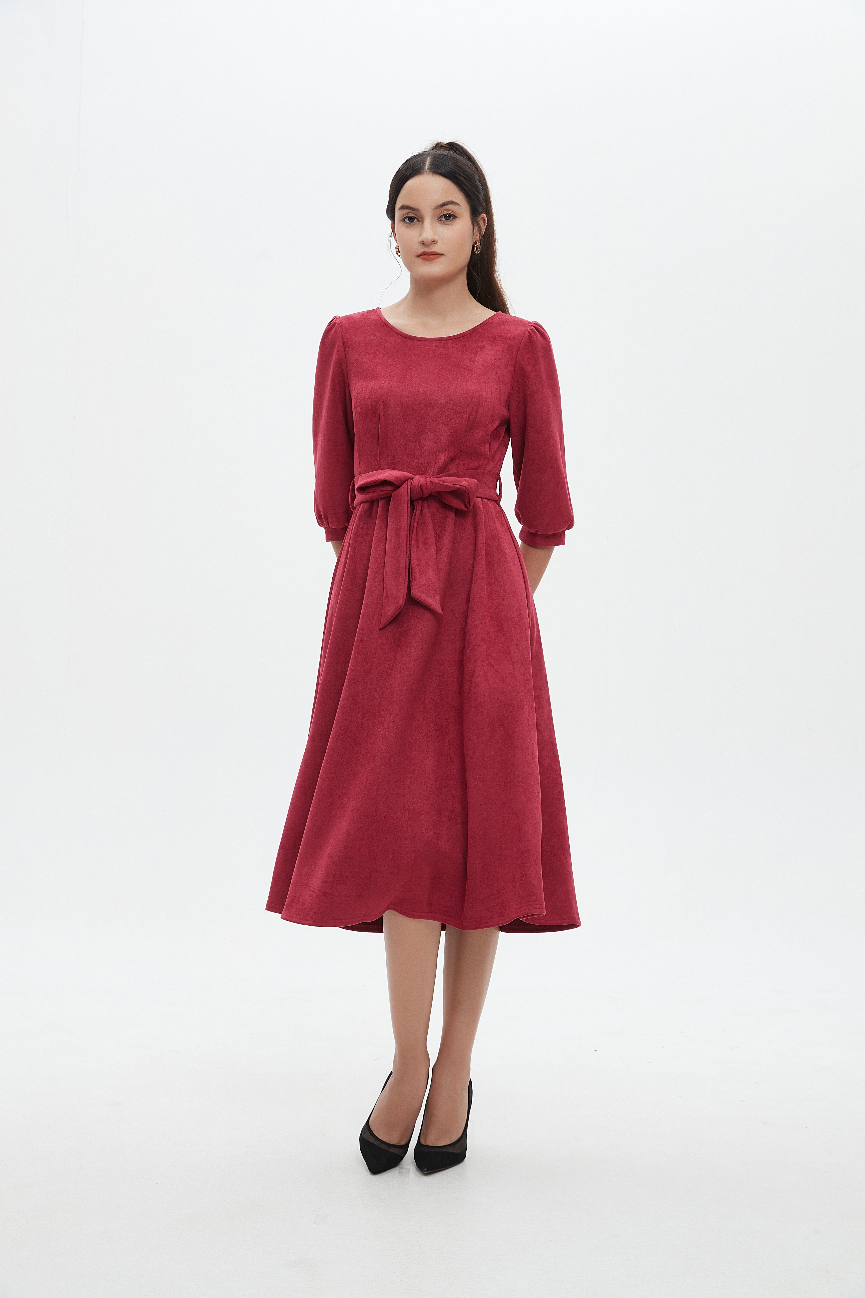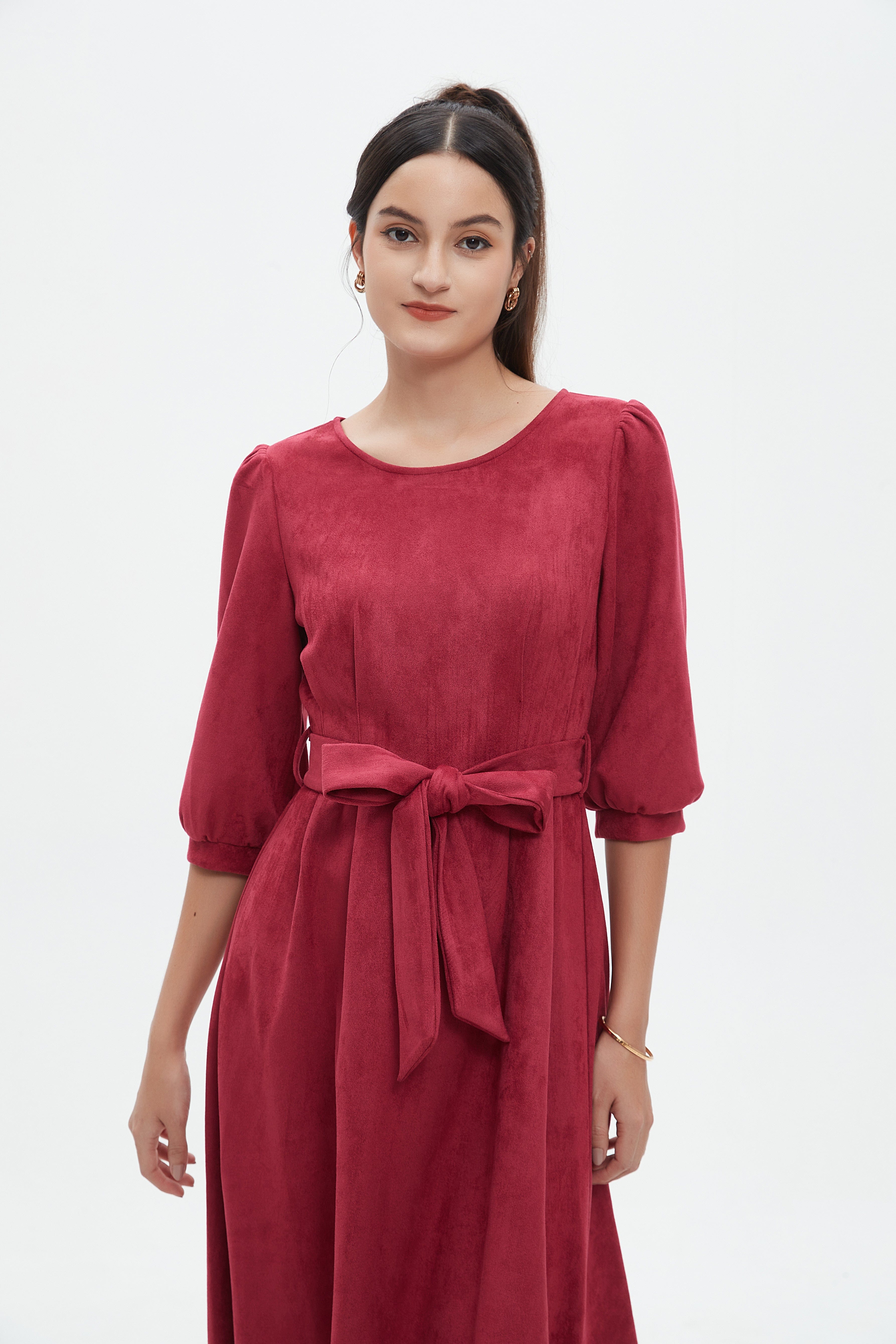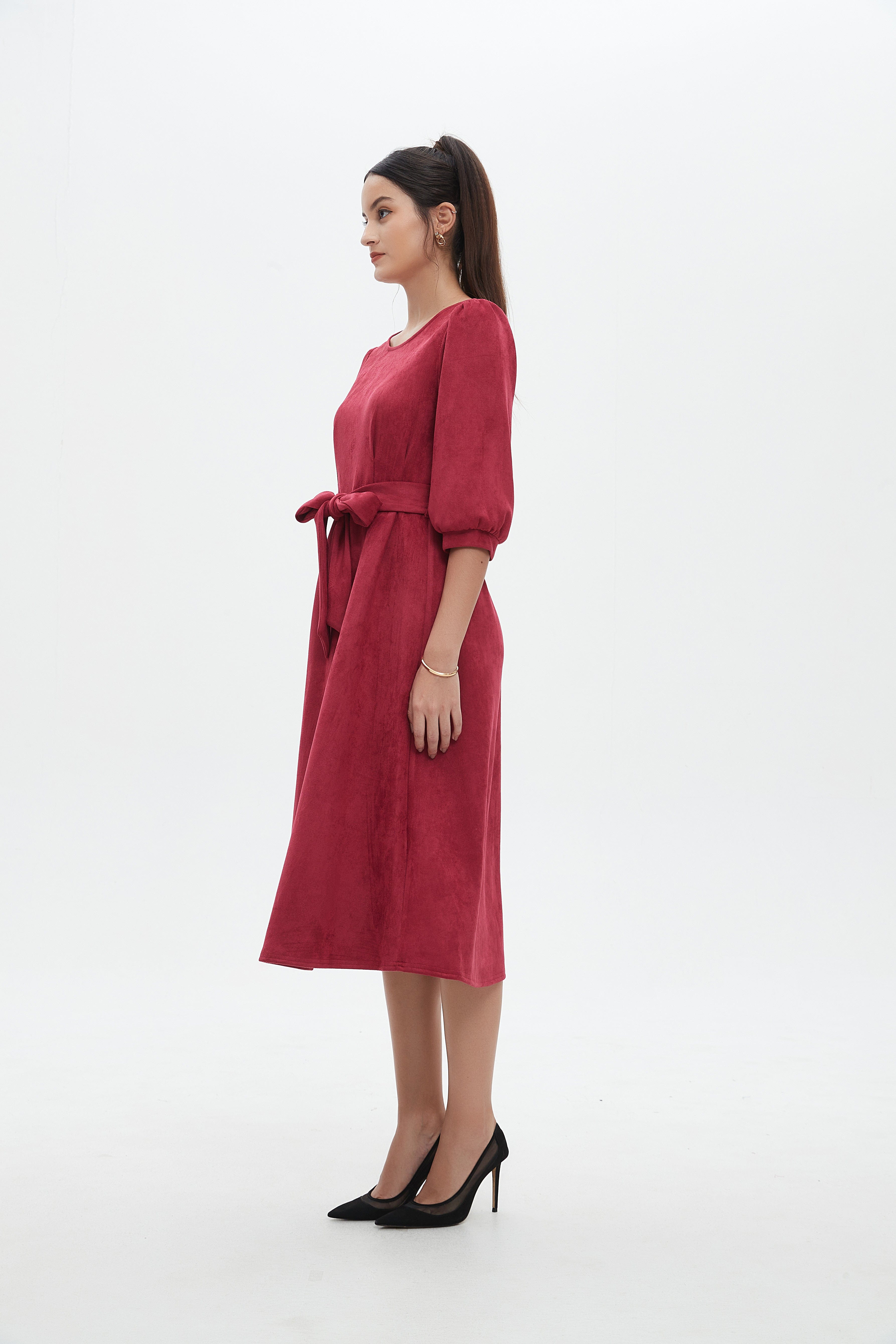 فستان نسائي ميدي 3/4 كم برباط على الخصر سادة