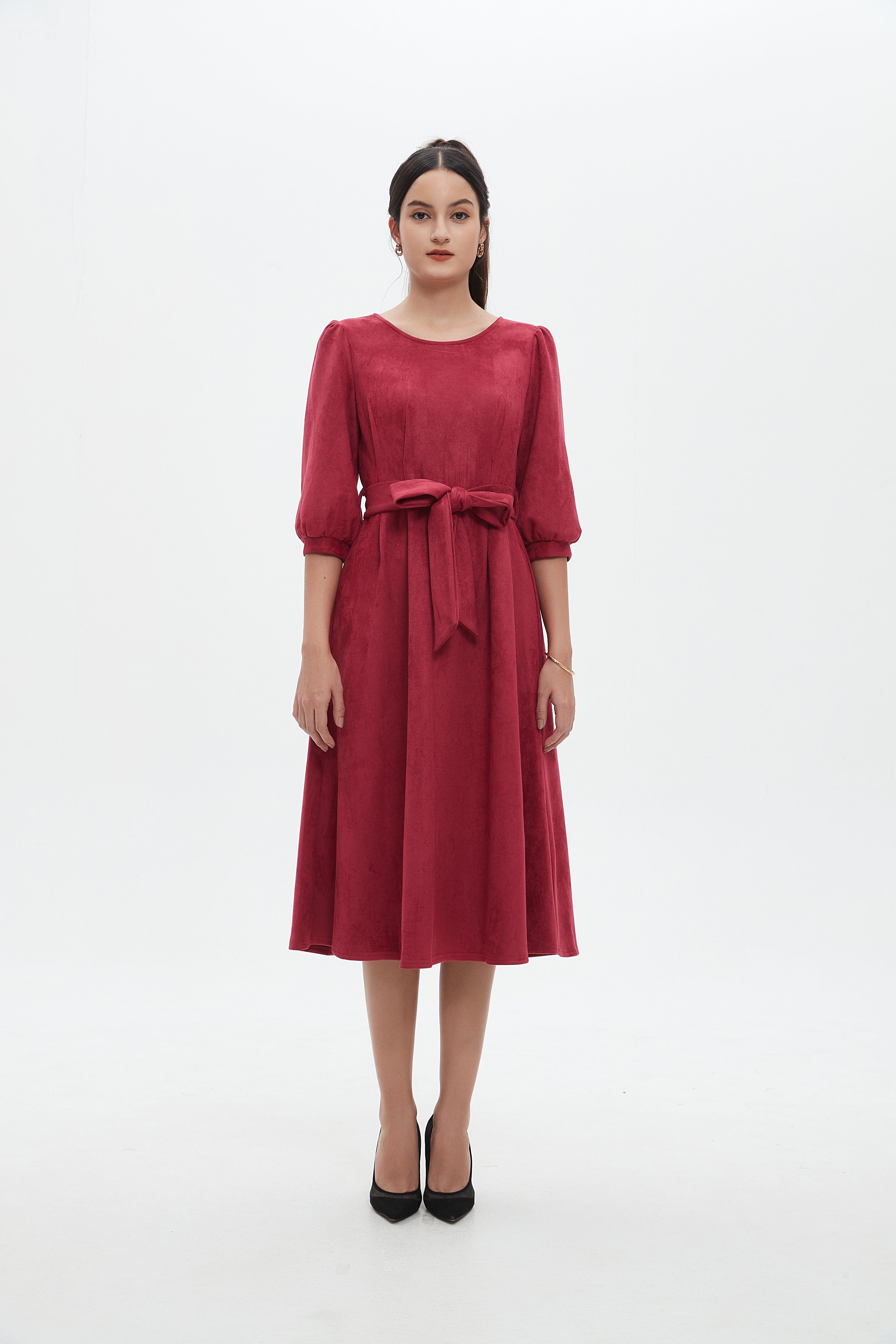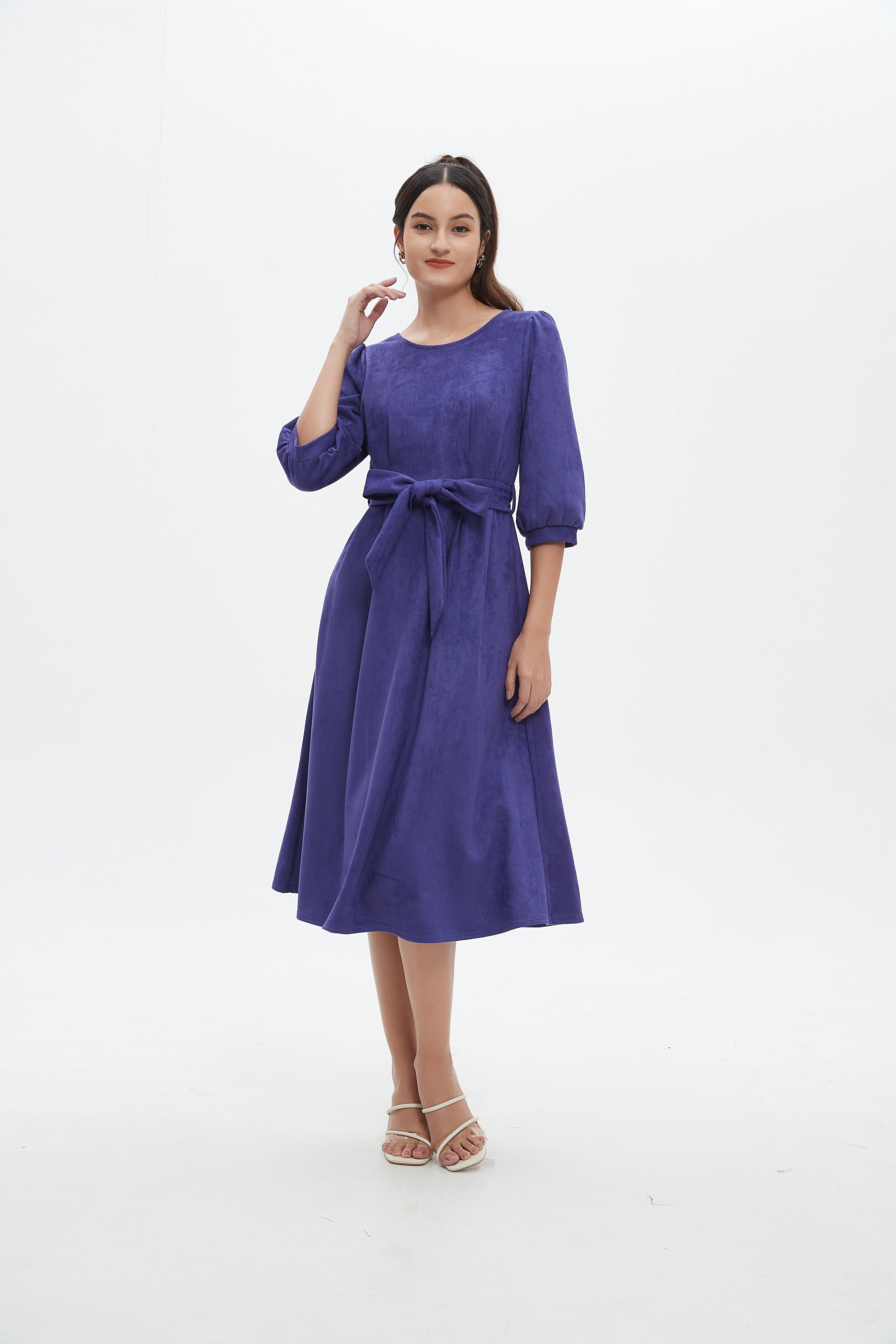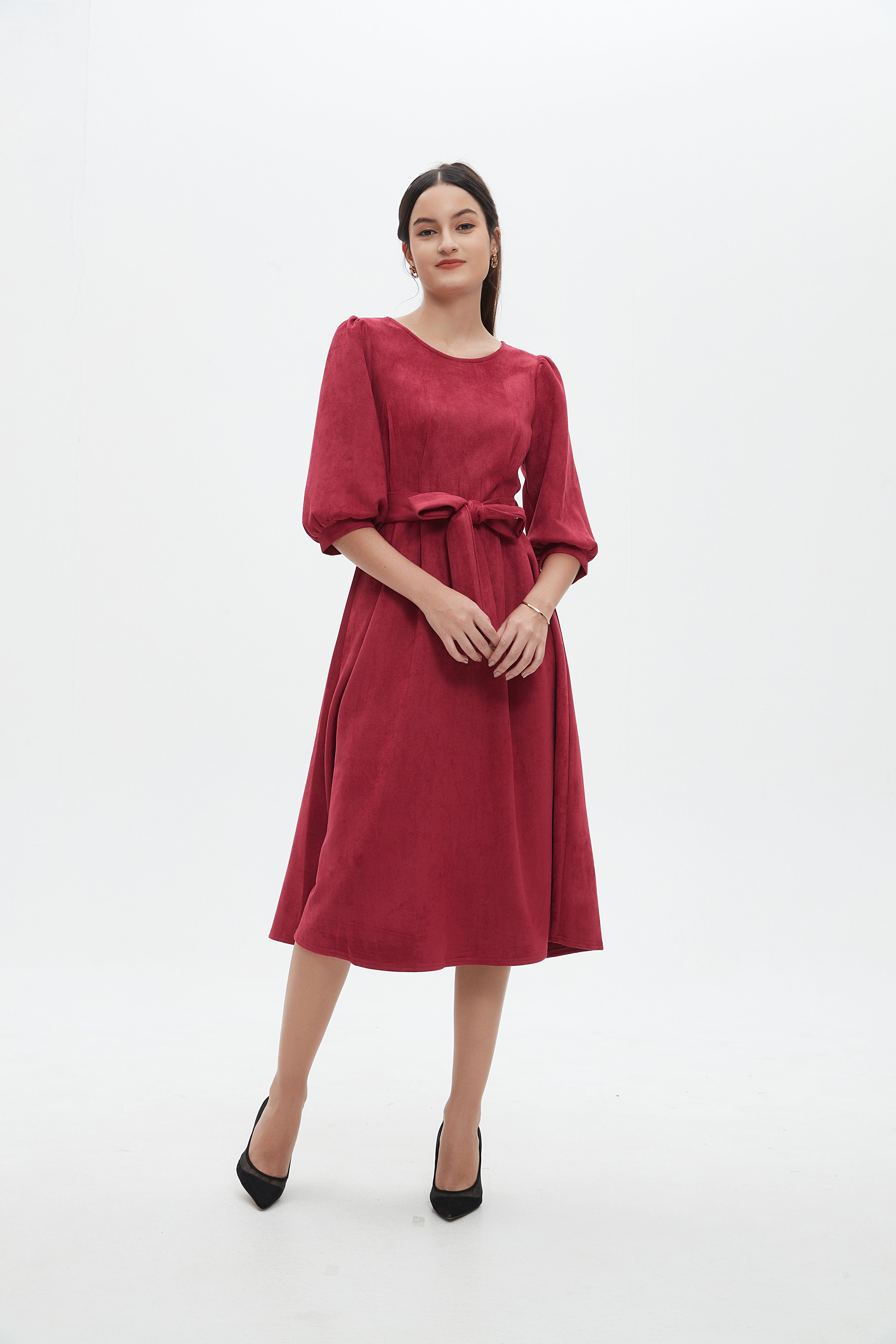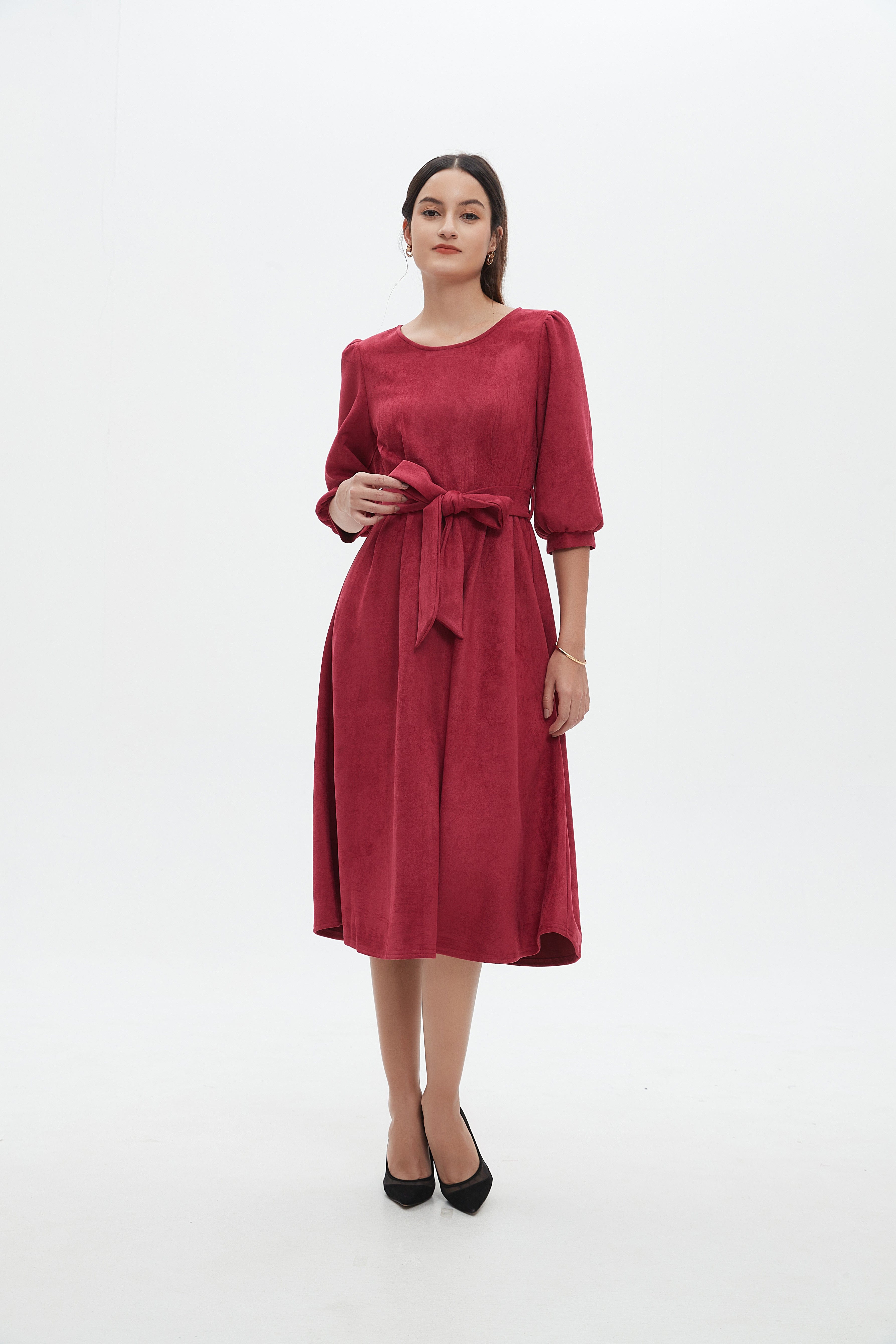 فستان نسائي ميدي 3/4 كم برباط على الخصر سادة