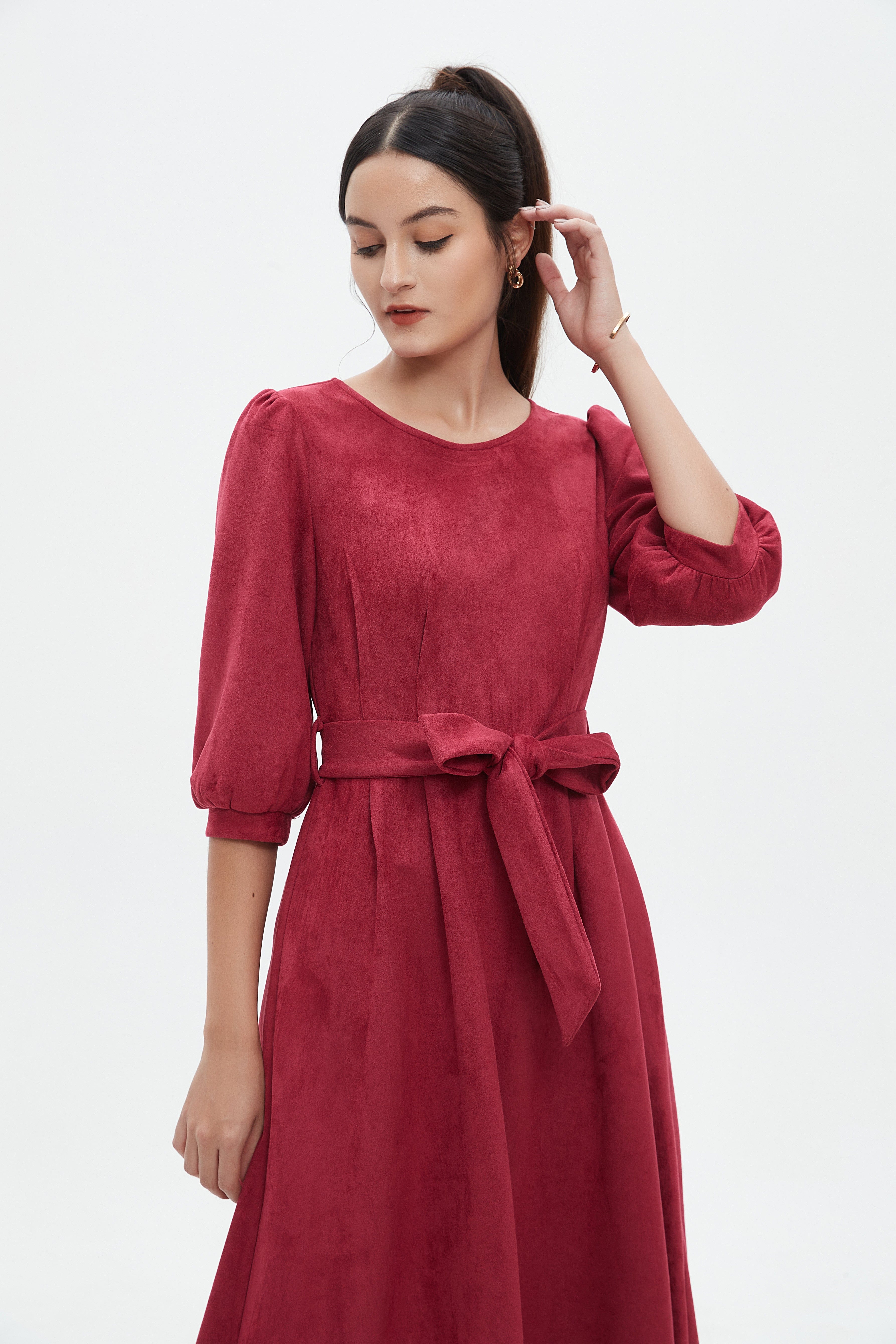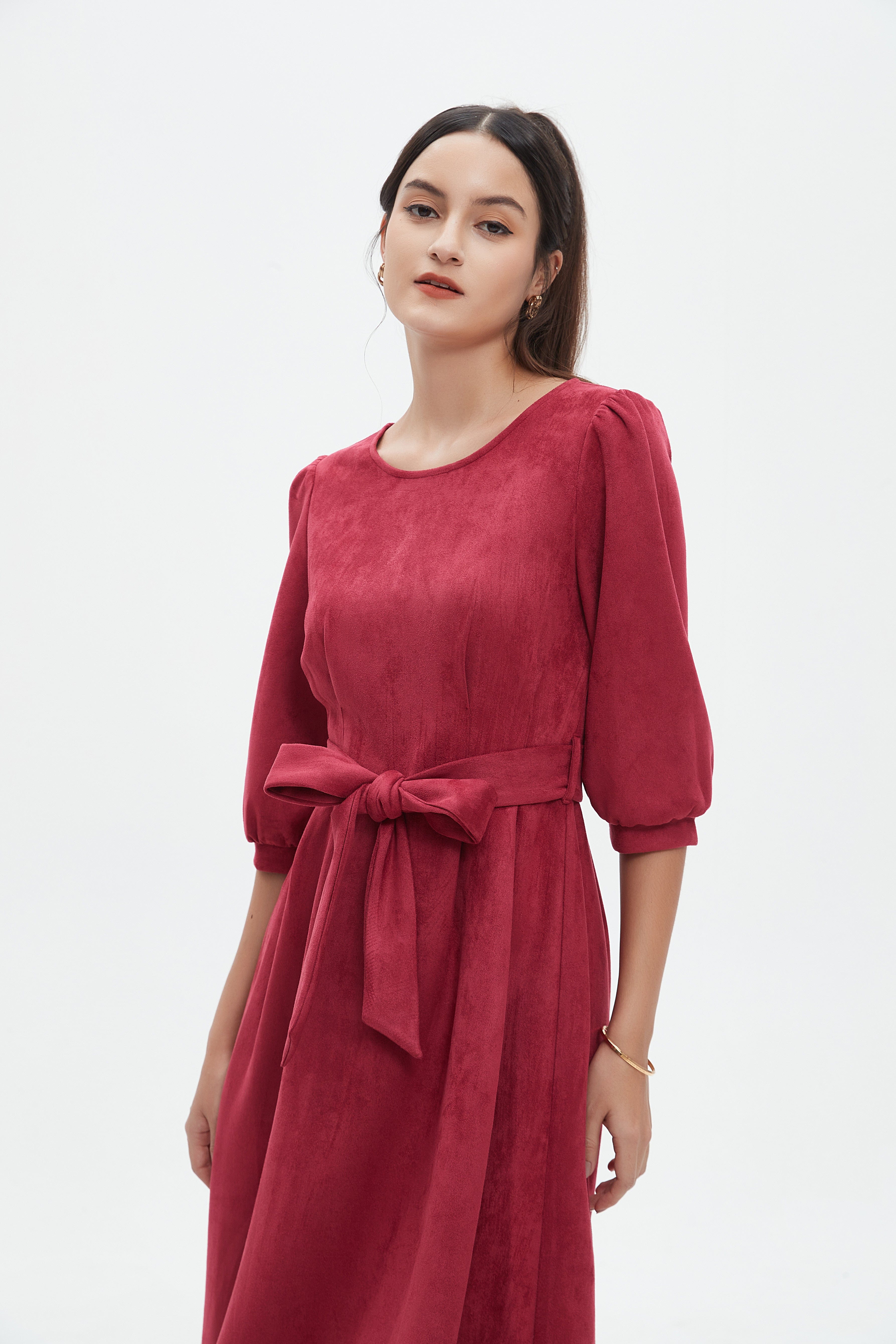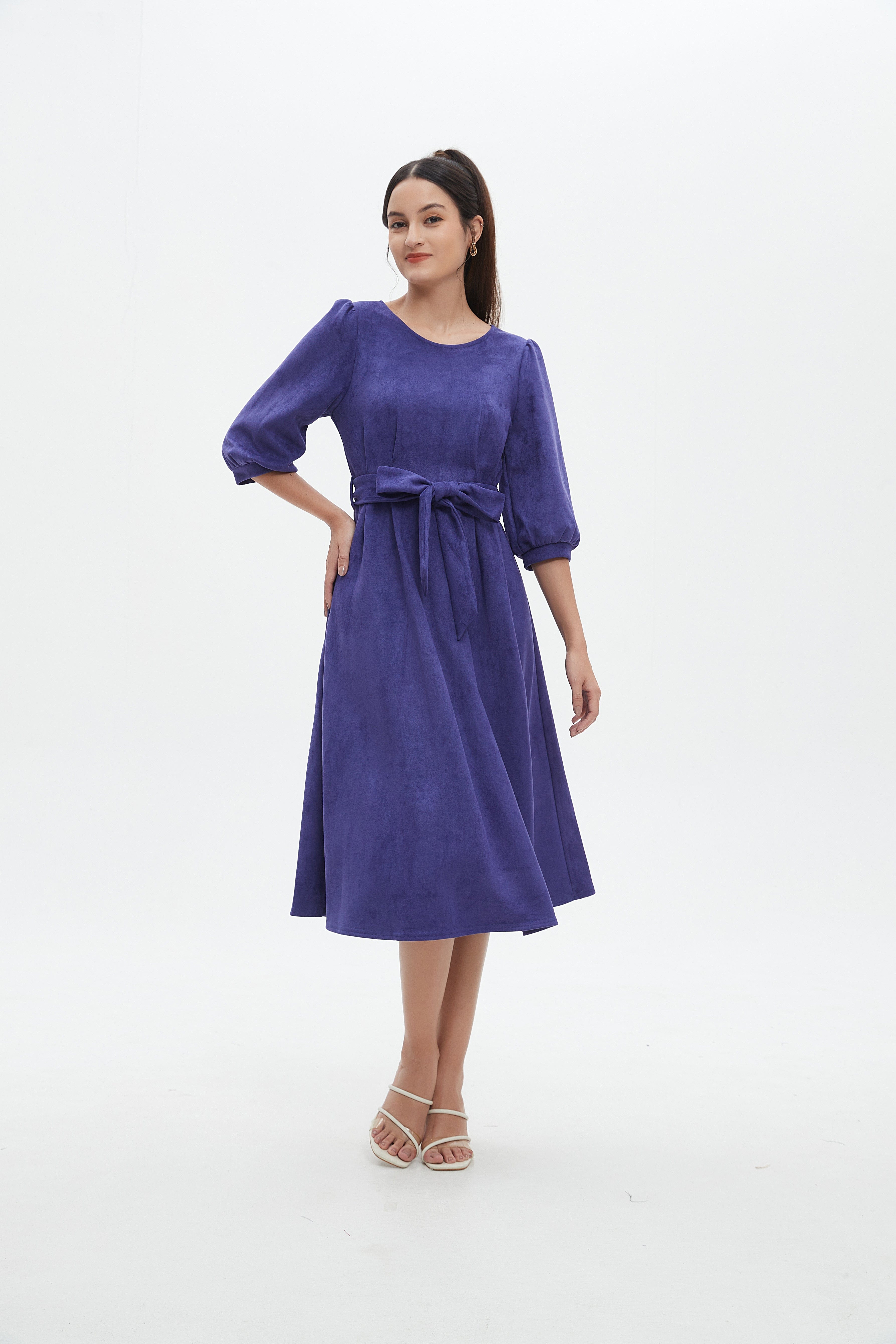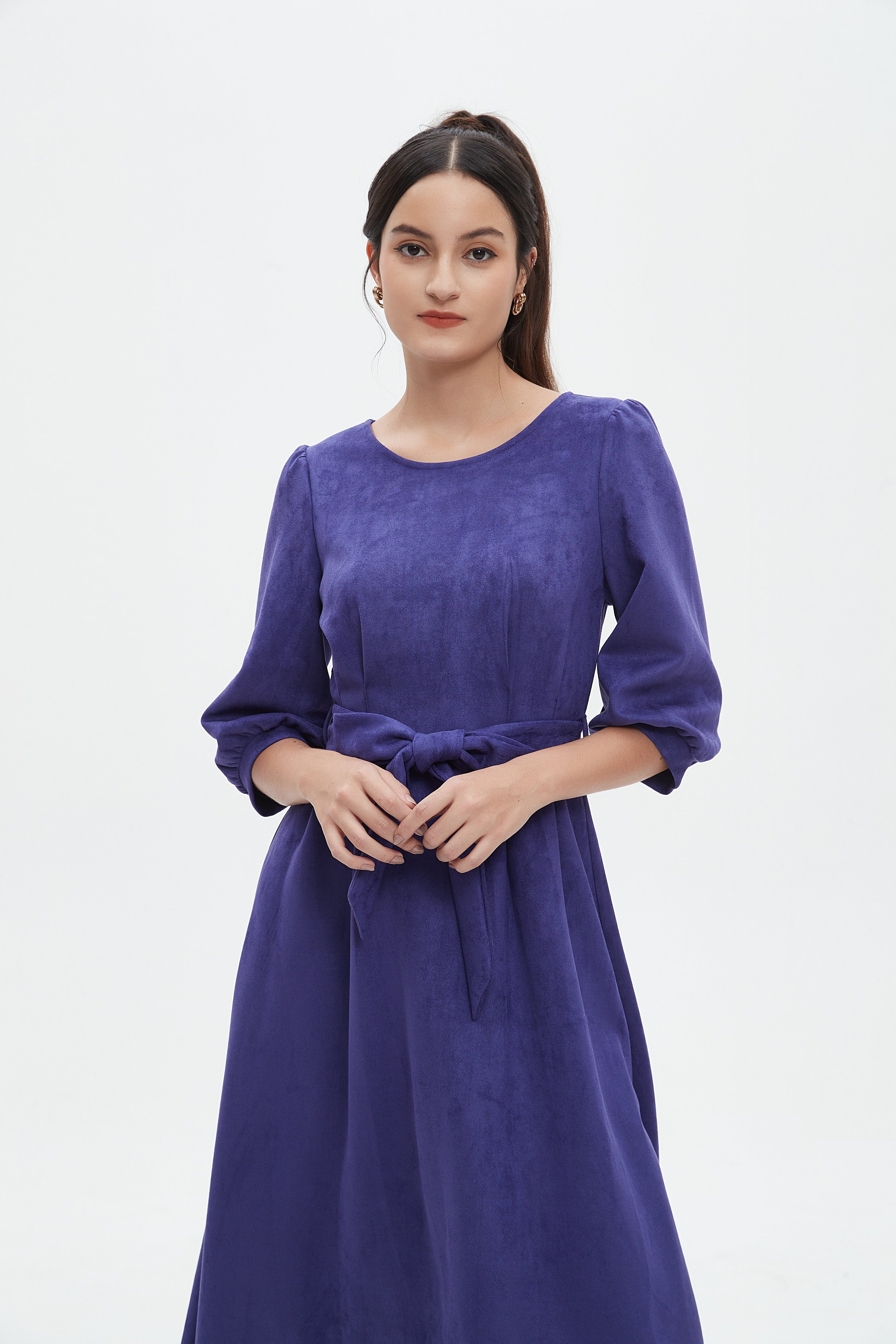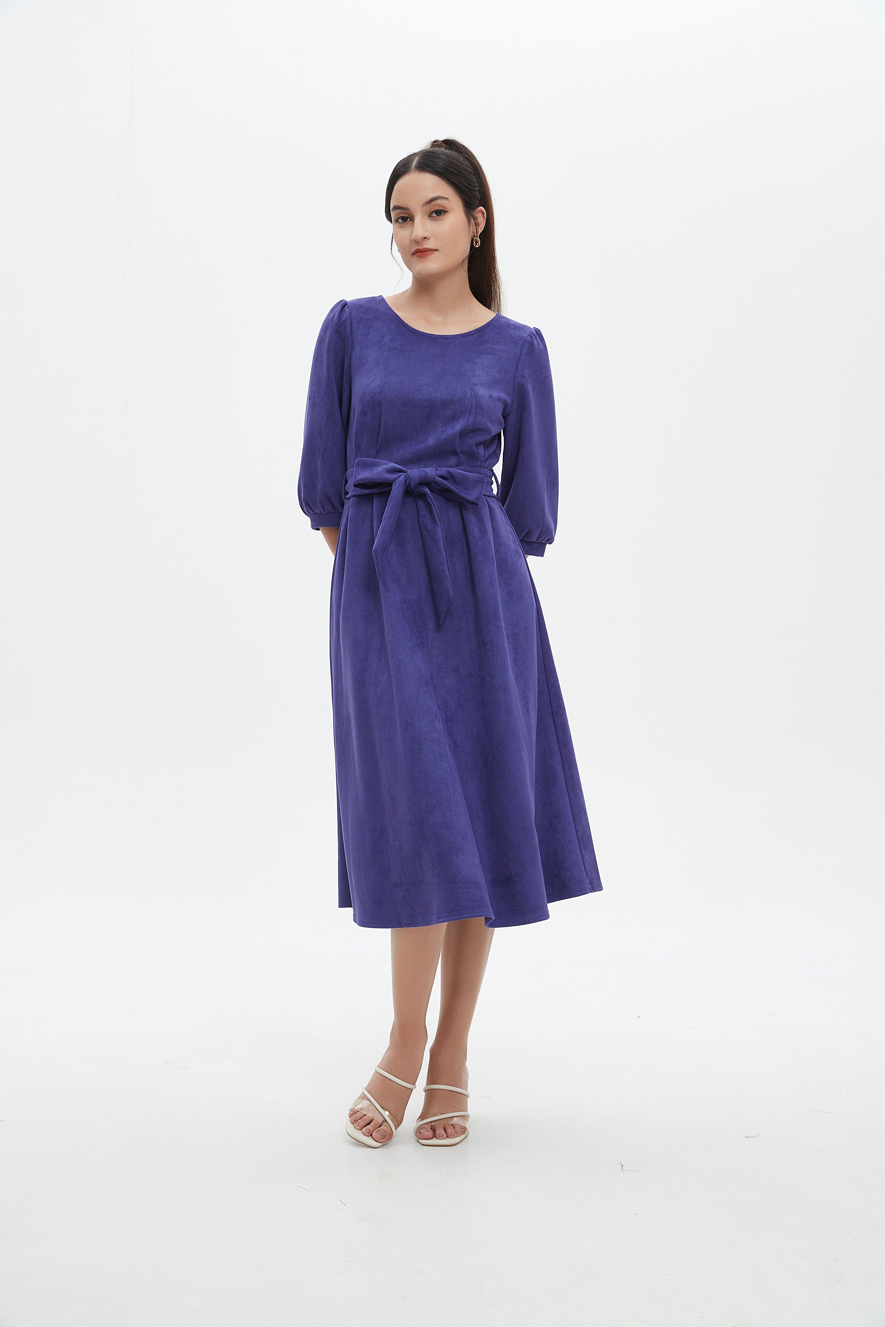فستان نسائي ميدي 3/4 كم برباط على الخصر سادة