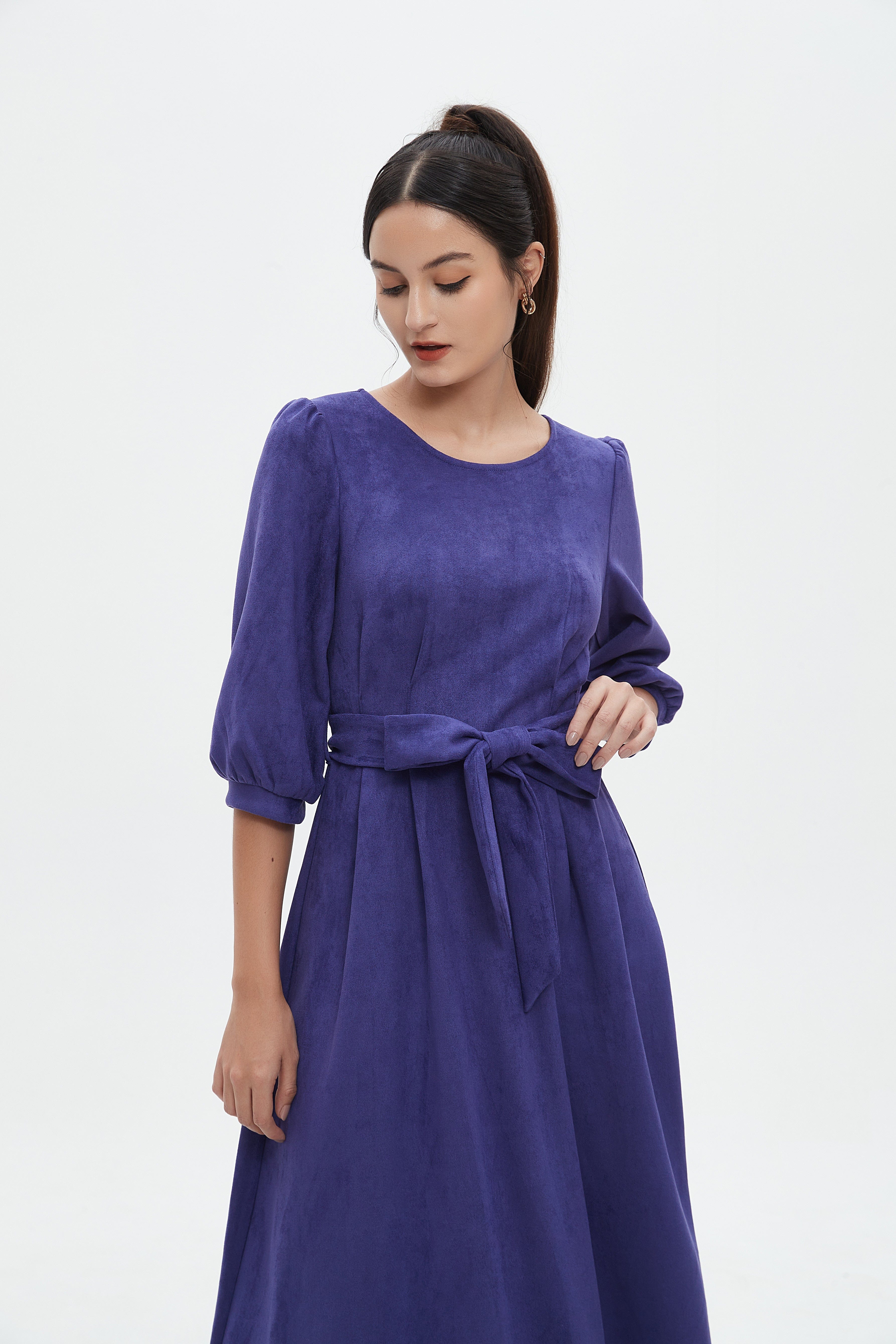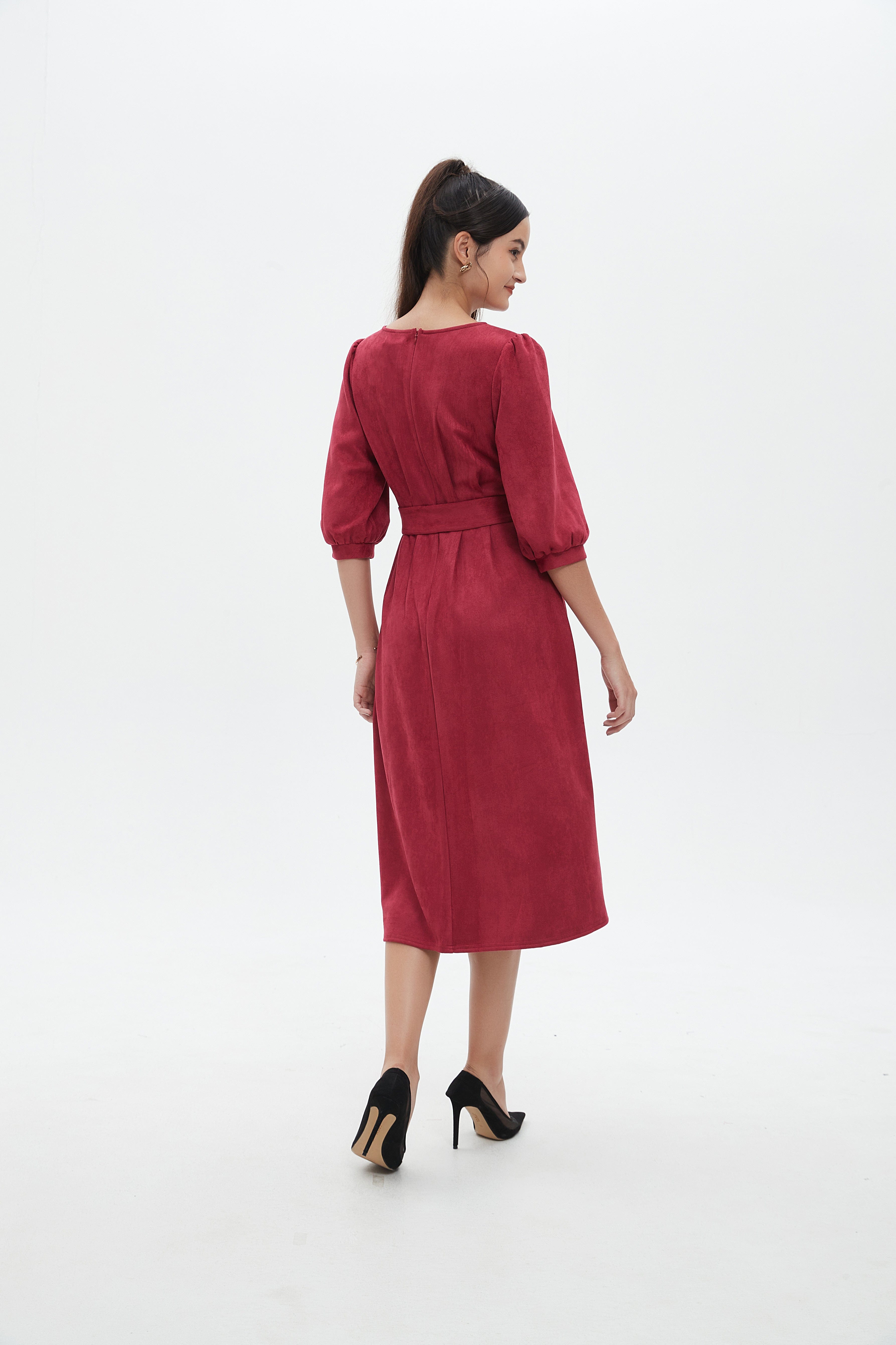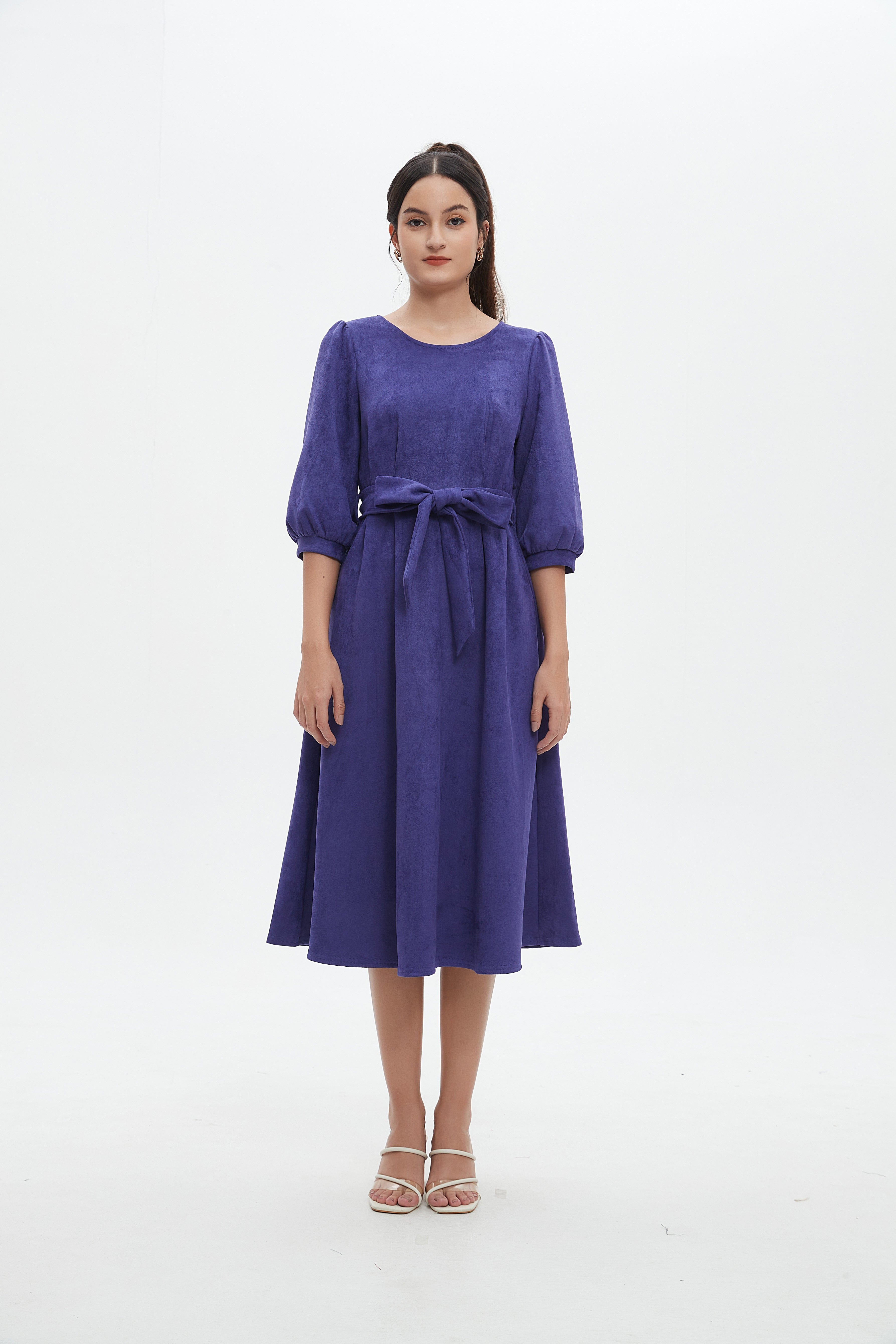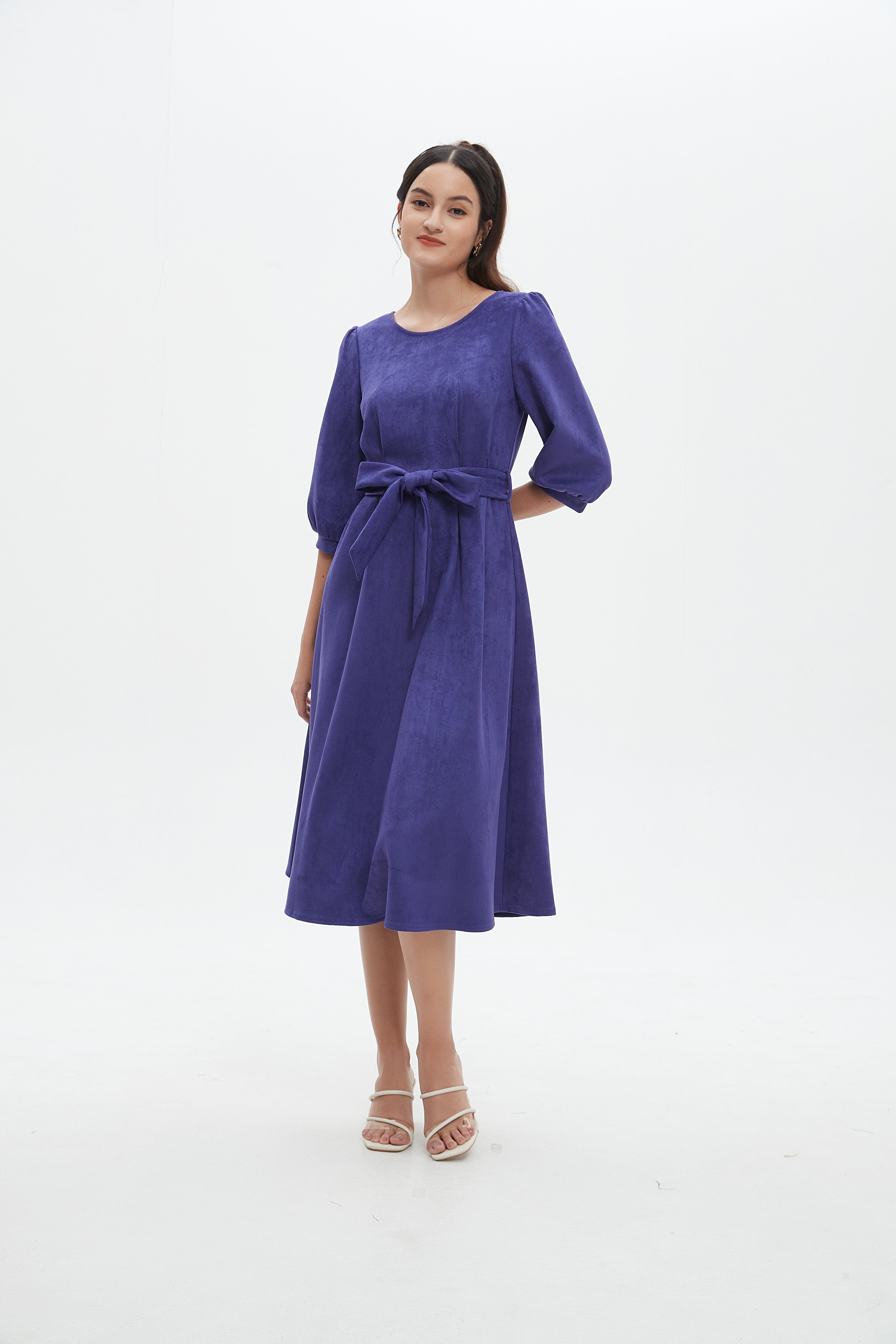 فستان نسائي ميدي 3/4 كم برباط على الخصر سادة