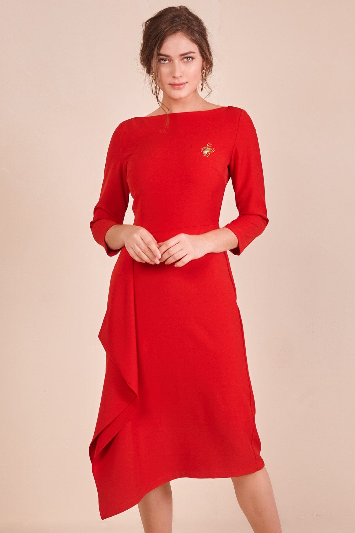 لو تبحثين عن فستان أنيق لطلعاتك المميزة، هذا الفستان الأحمر بقصة A سيعجبك بالتأكيد. خامته الخارجية 95% بوليستر و5% إيلاستين مع بطانة 97% بوليستر و3% إيلاستين، مما يعطي تماسكًا مريحًا وشكلًا يحافظ على القصة. ياقة القارب والأكمام بطول ثلاثة أرباع تضيف لمسة أنثوية كلاسيكية، وطوله الميدي يمنحه أناقة متزنة تناسب المناسبات الرسمية والخروجات الرومانسية. الفستان سادة وبقصة عادية، مغلق ببطانة داخلية وبسحاب خلفي. بدون جيوب وبدون حزام، لذلك ستبرزين القصة النظيفة وخط الخصر الطبيعي. مناسب لكل المواسم وستحبين كيف يتحرك معك أثناء المشي ويمنحك إطلالة أنيقة وبسيطة في آن واحد. اعثري على مقاسك في فاشن السعودية وأضيفي هذه القطعة المتنوعة إلى خزانة ملابسك اليوم.