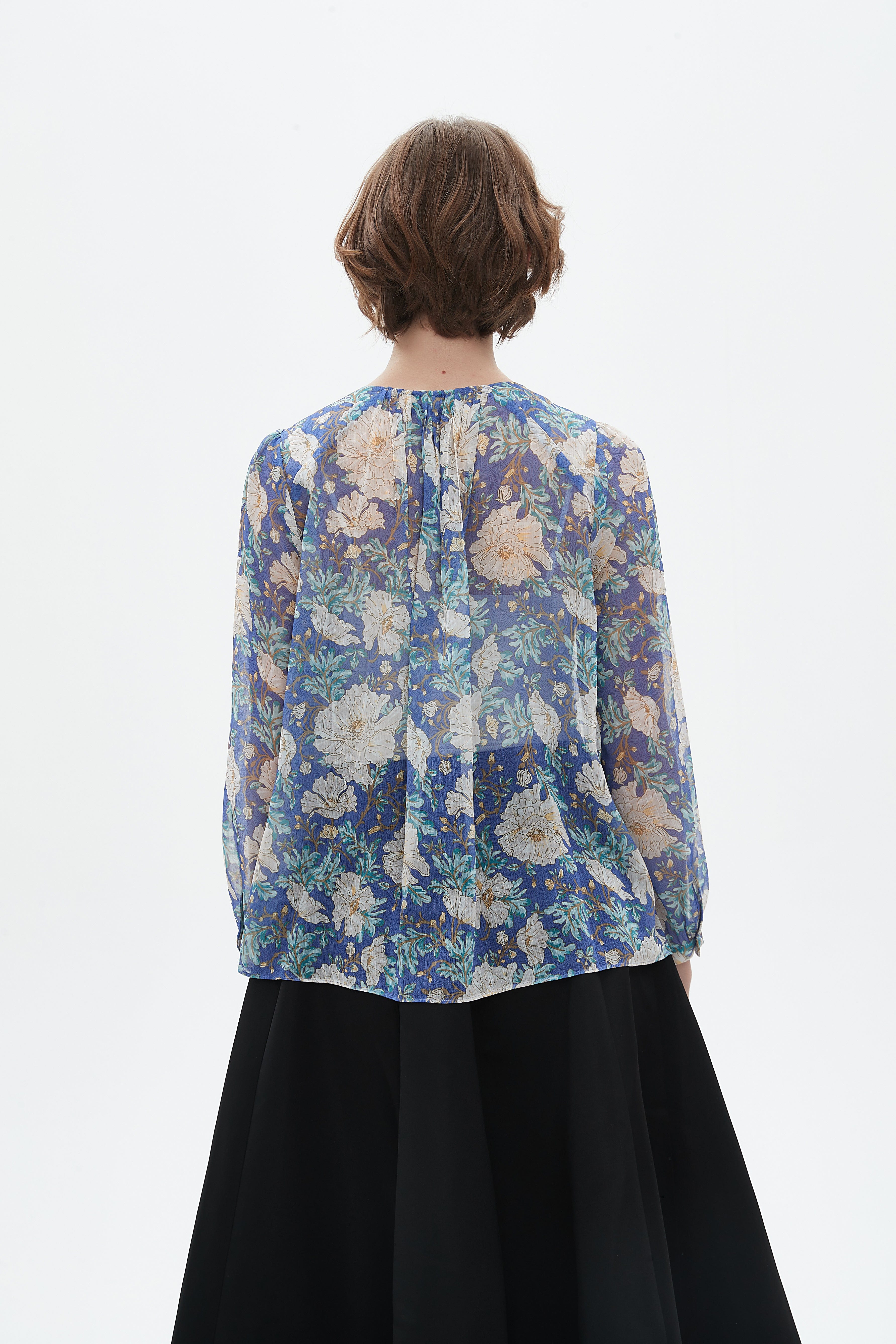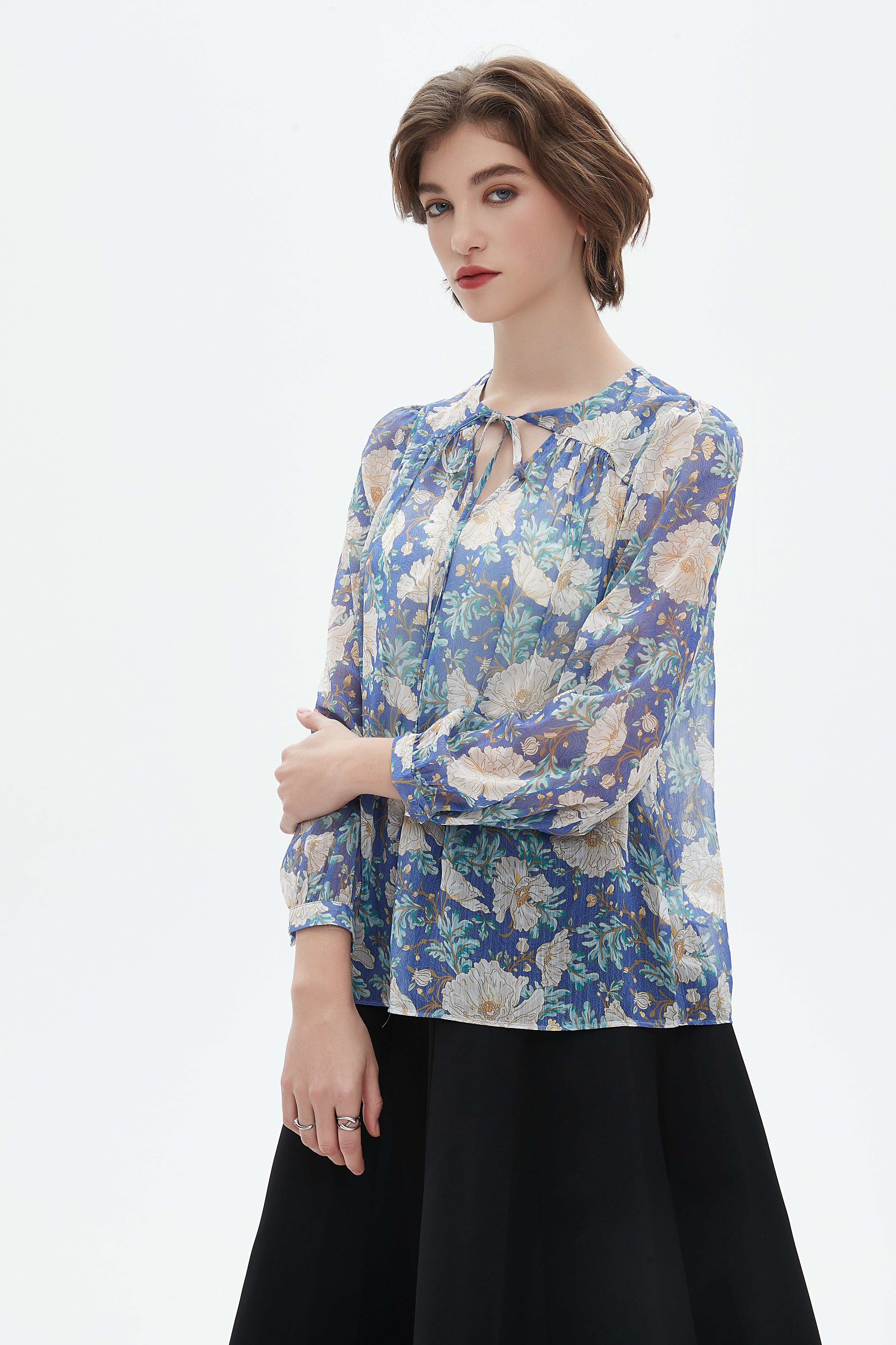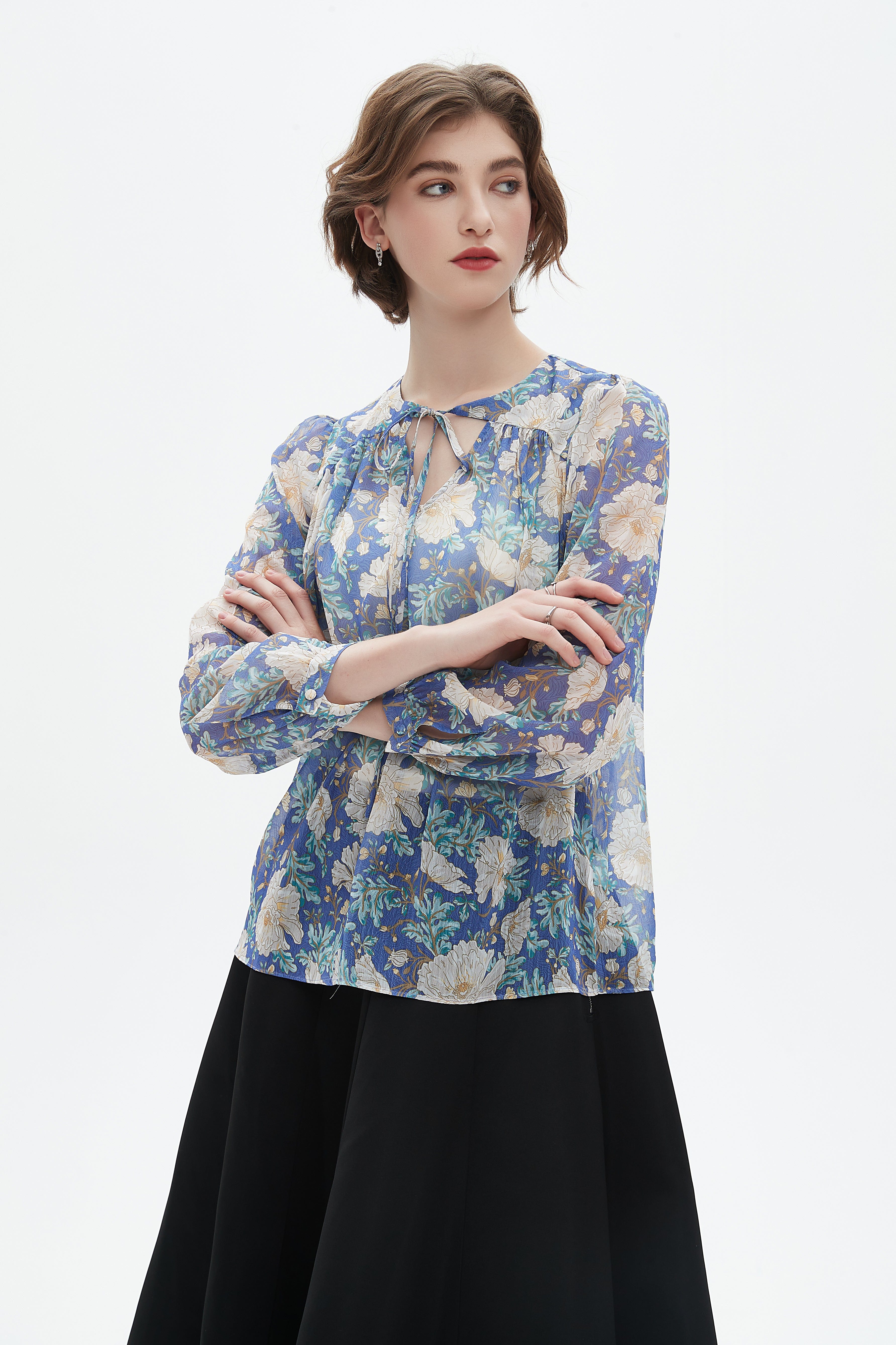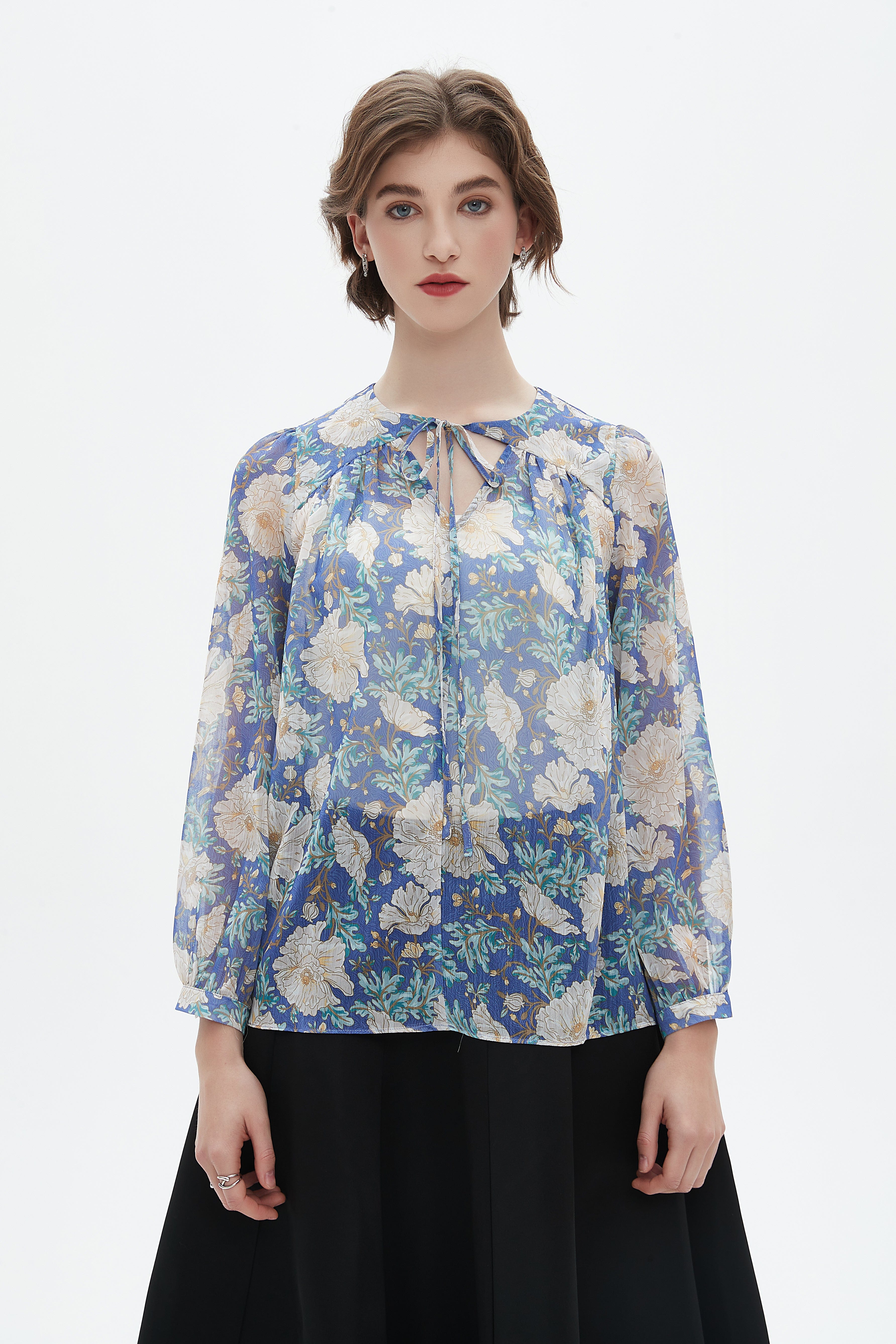 بلوزة نسائية كم طويل بلوزة بطول الخصر مشجرة بتفاصيل شيفون وفتحة رقبة دائرية