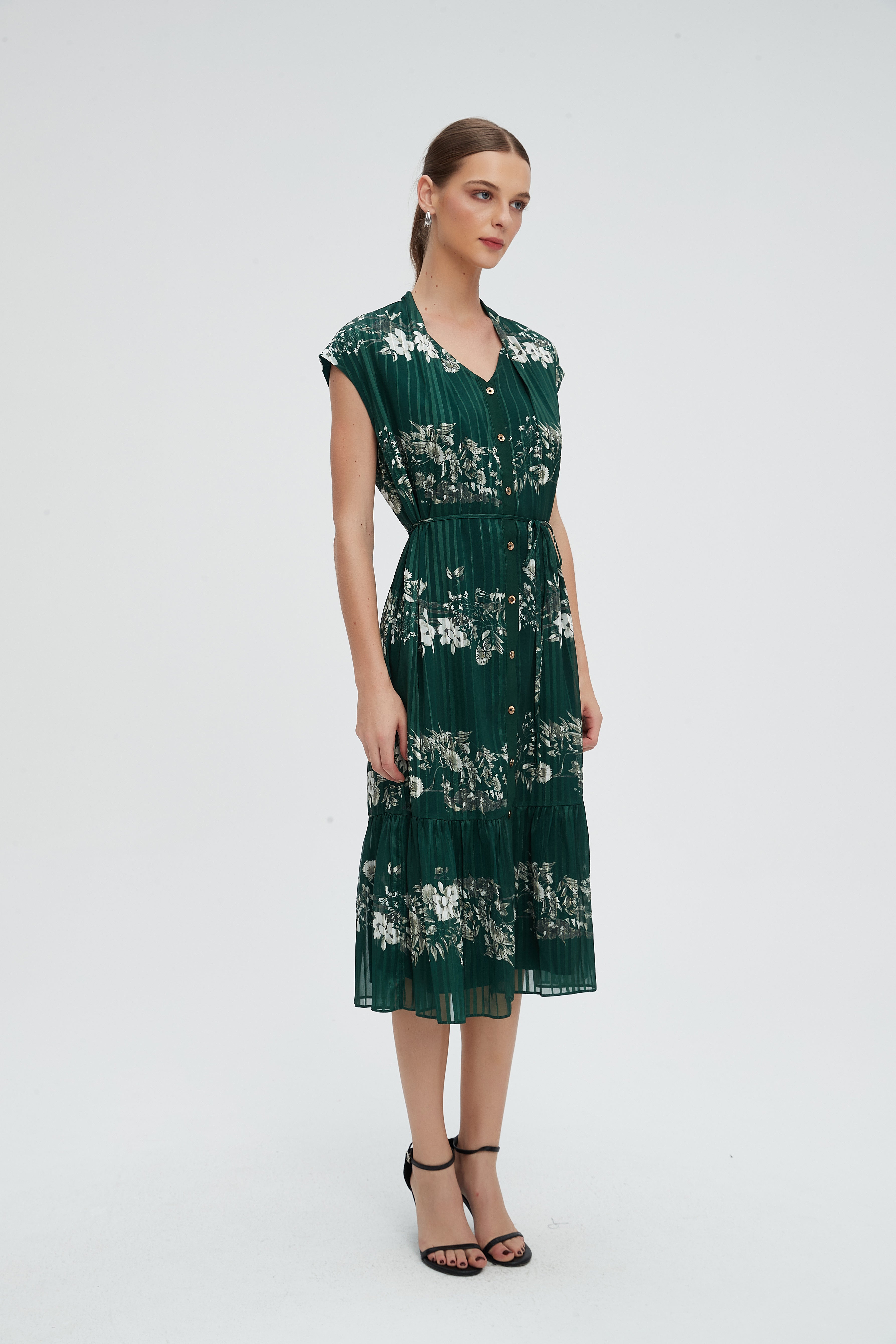 فستان ميدي مورد بدون أكمام وياقة على شكل حرف V