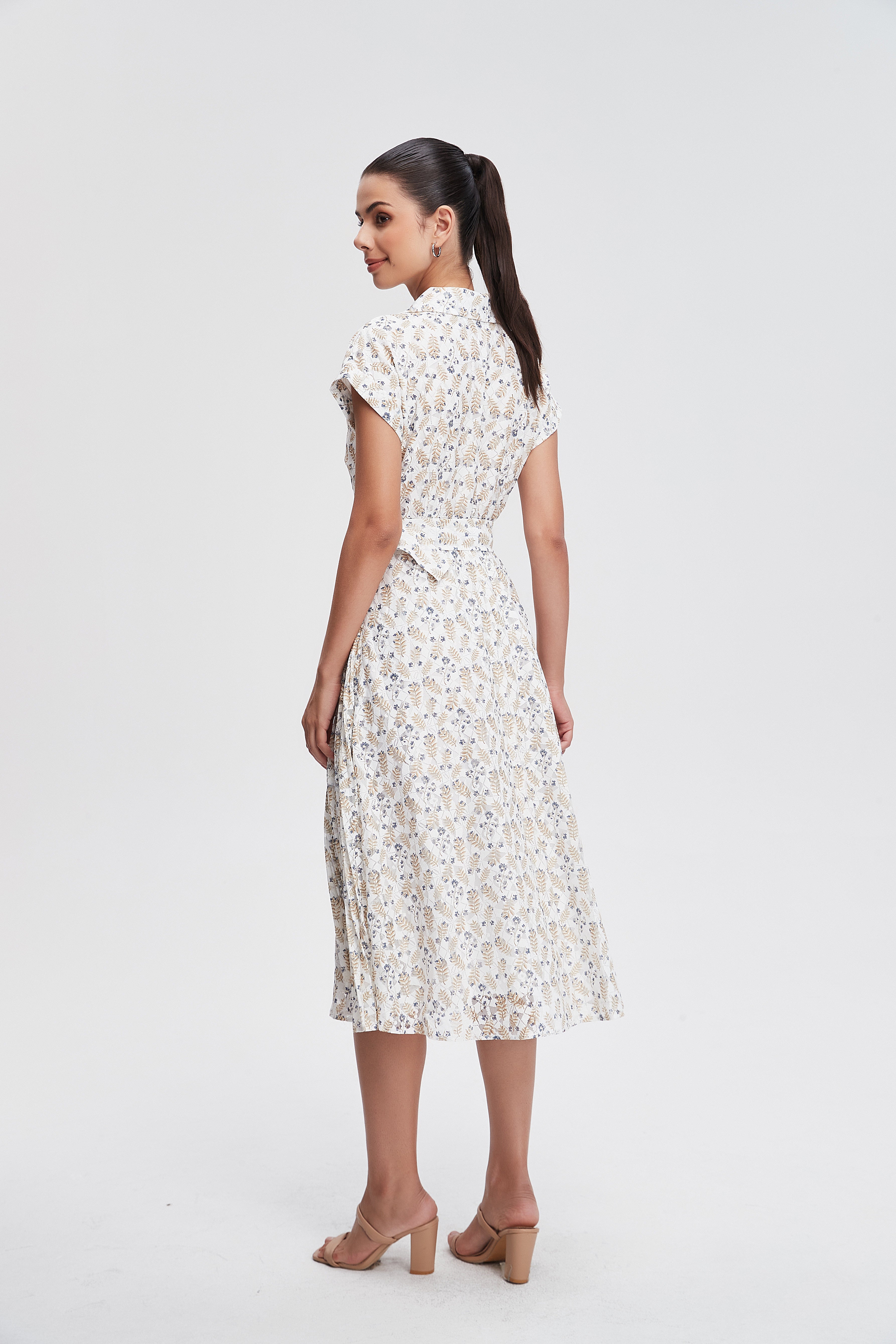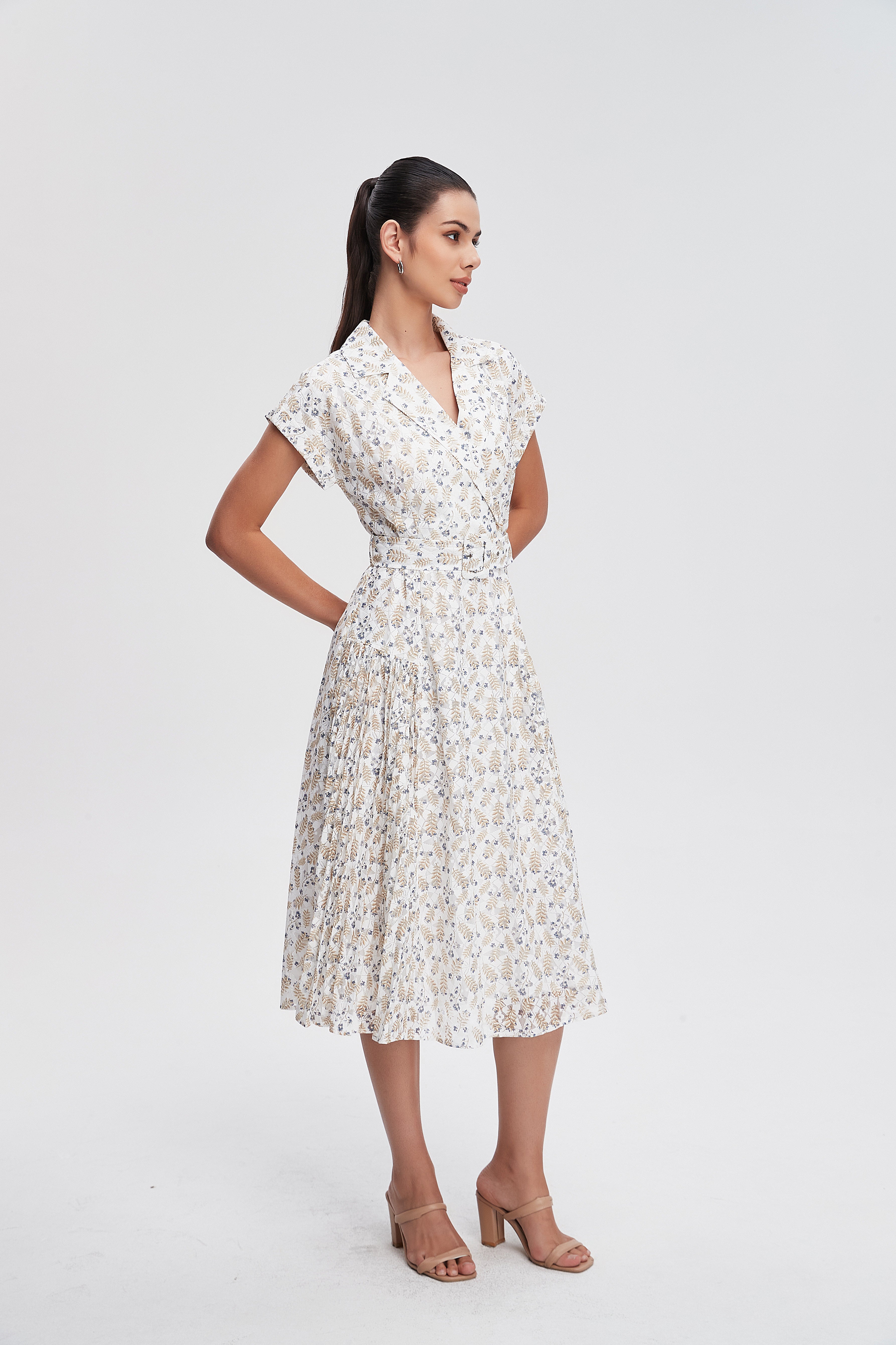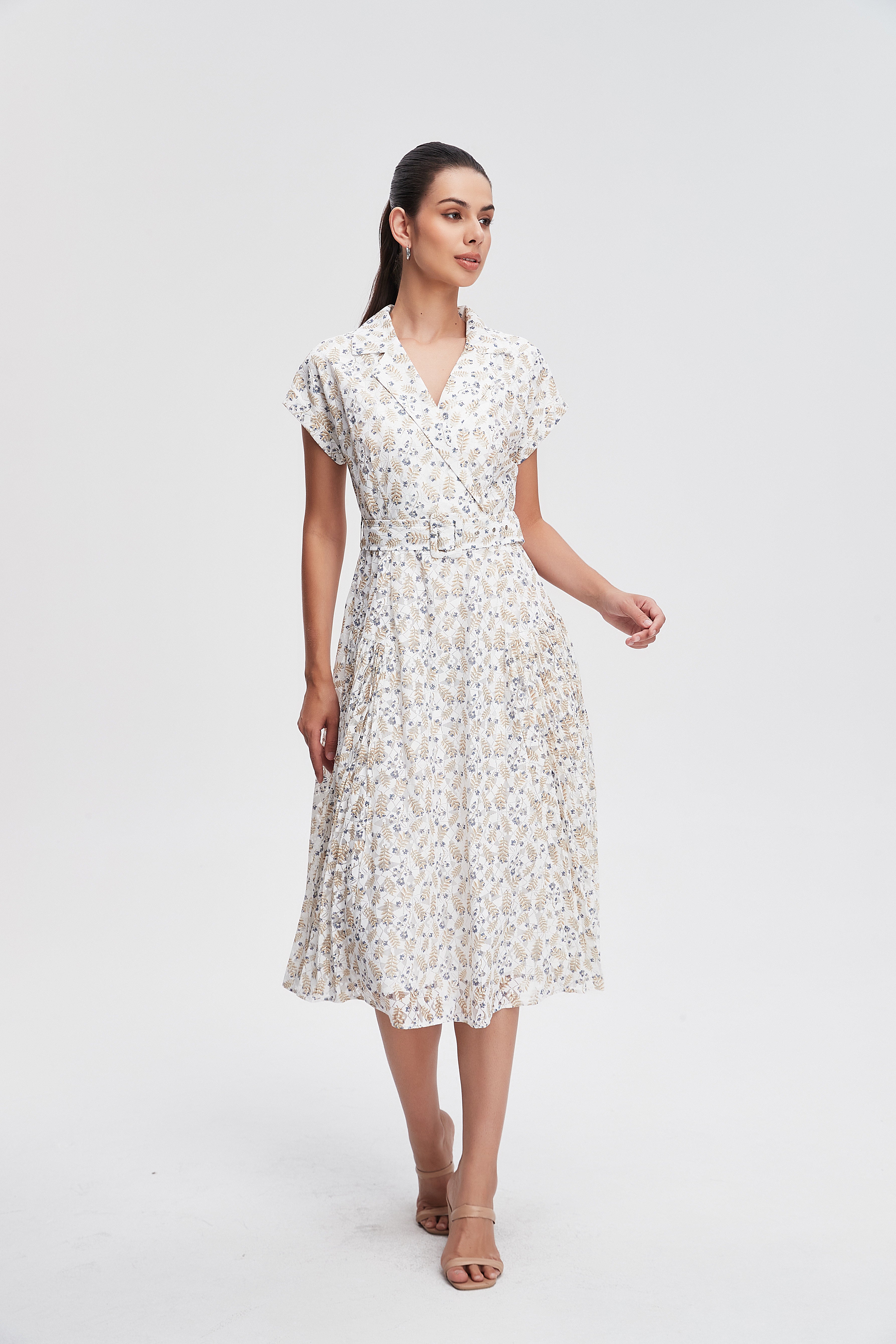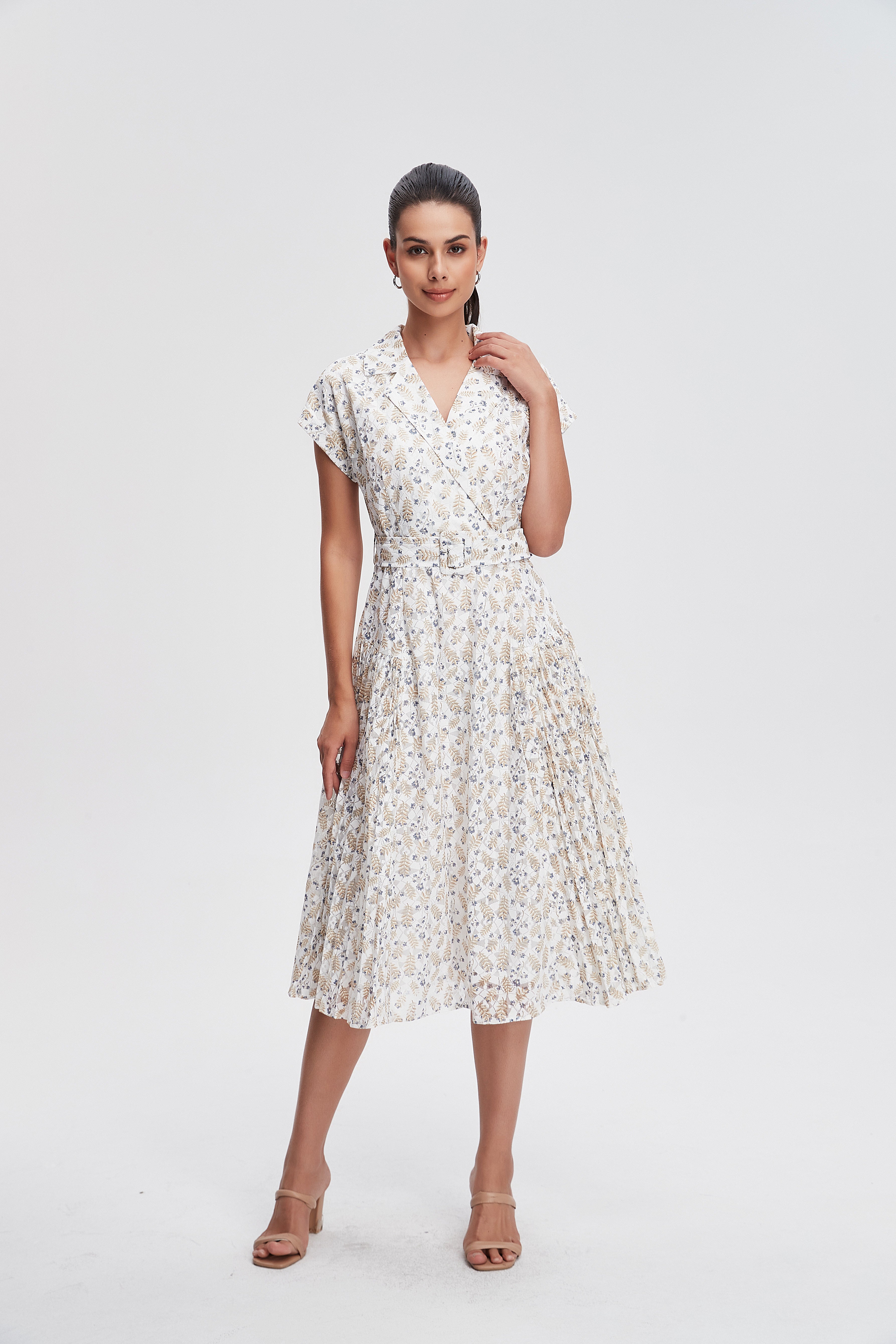 فستان ميدي كم قصير مورد ورقبة على شكل V بحزام عالخصر