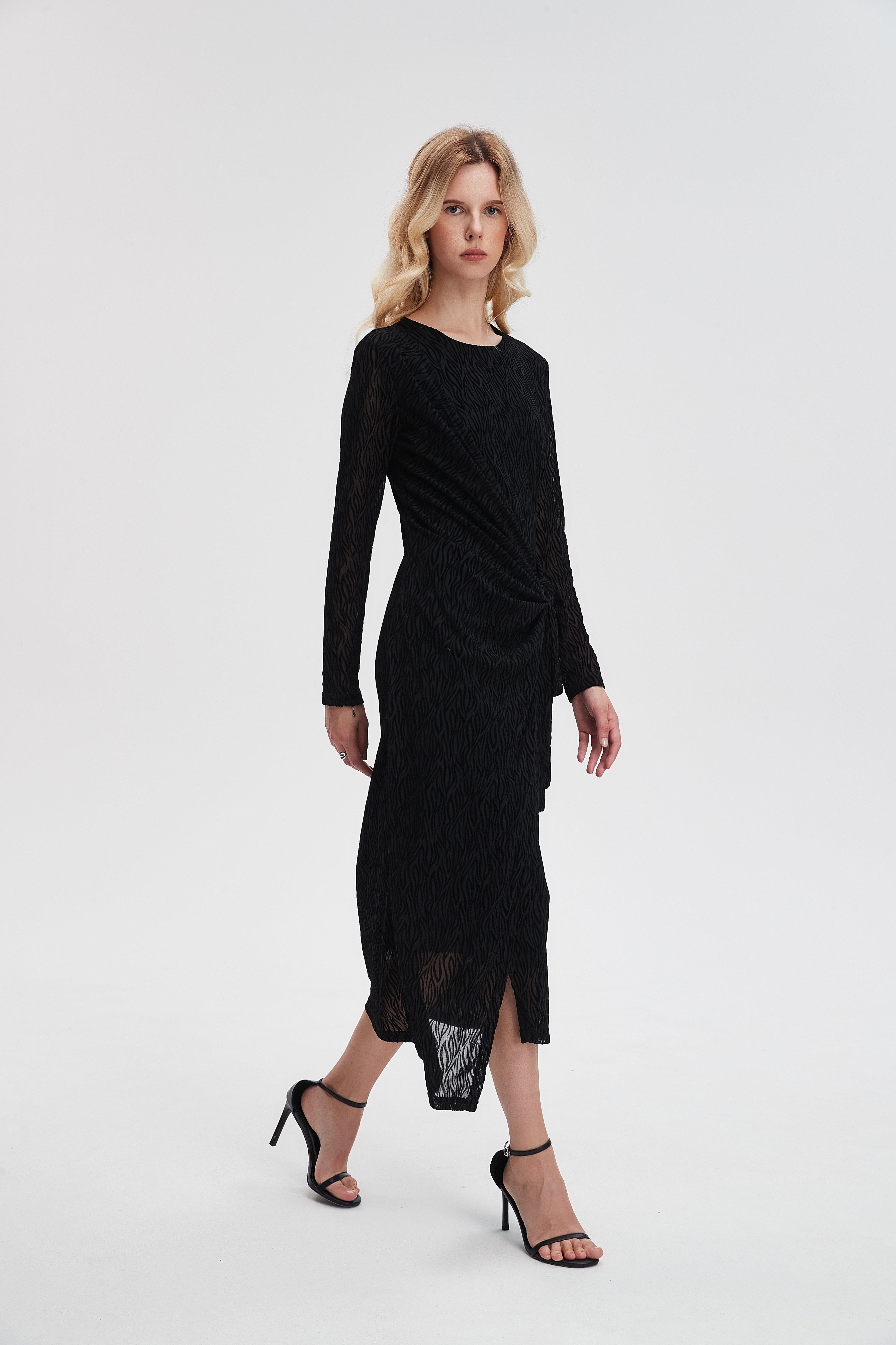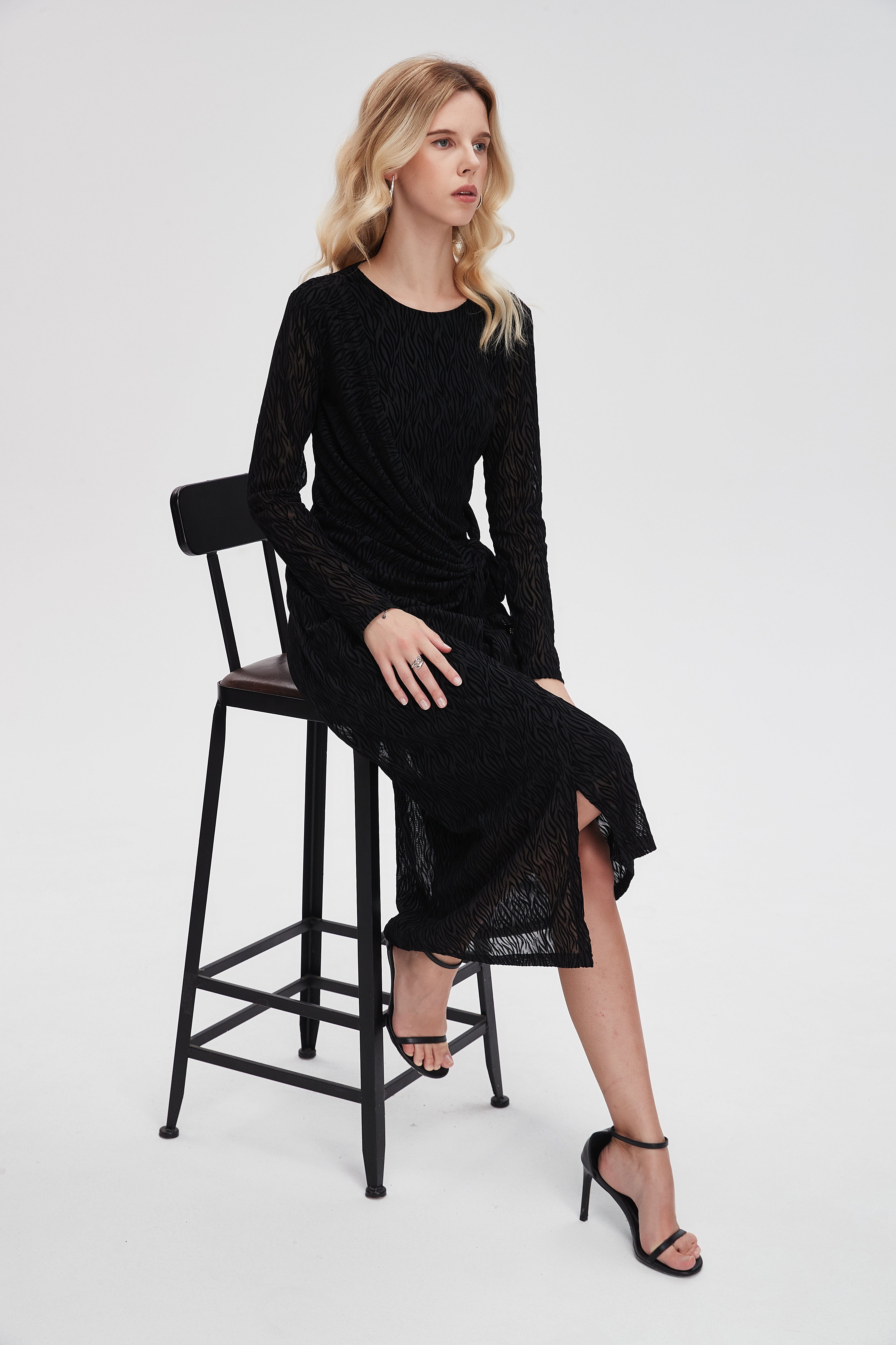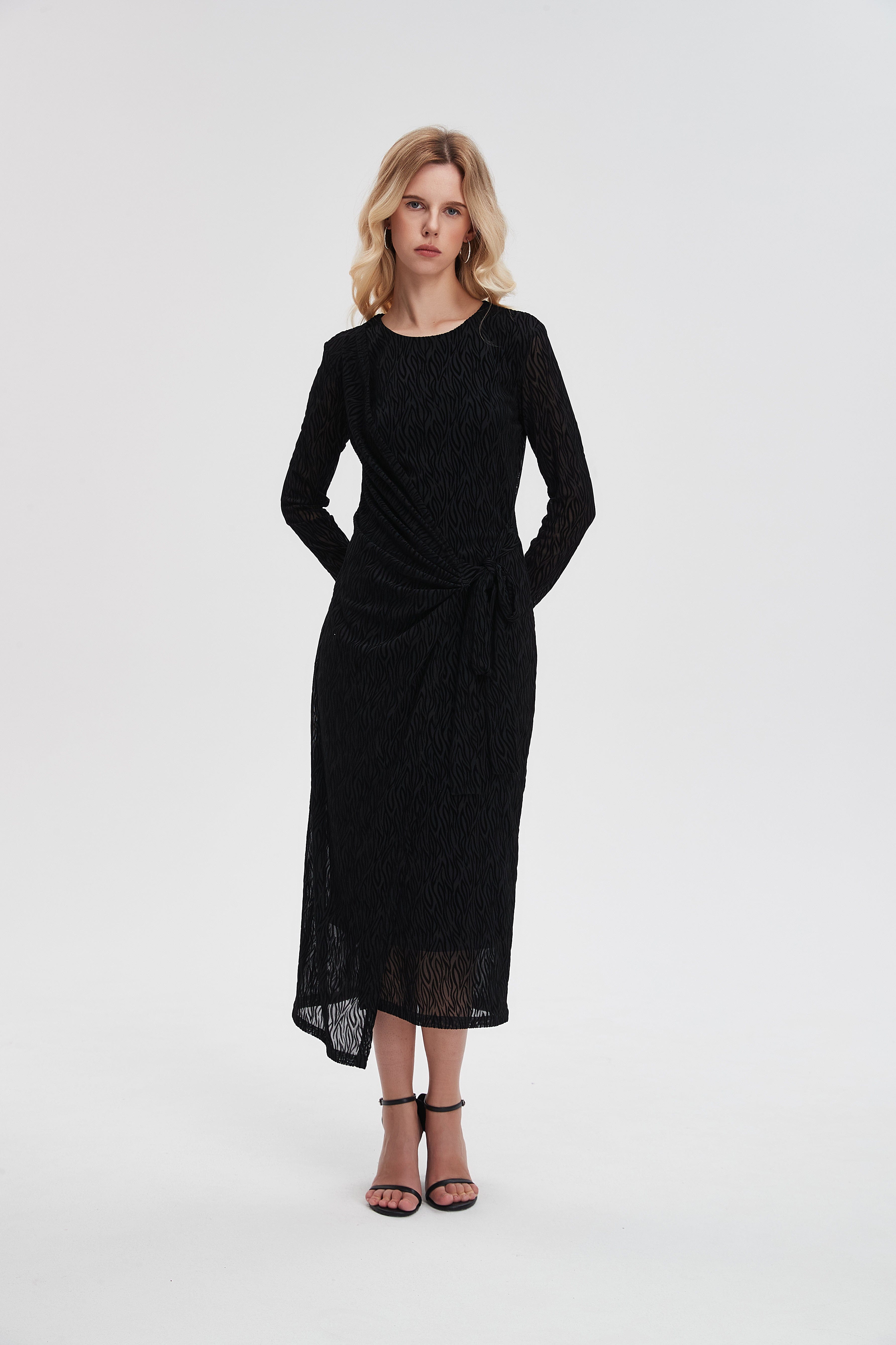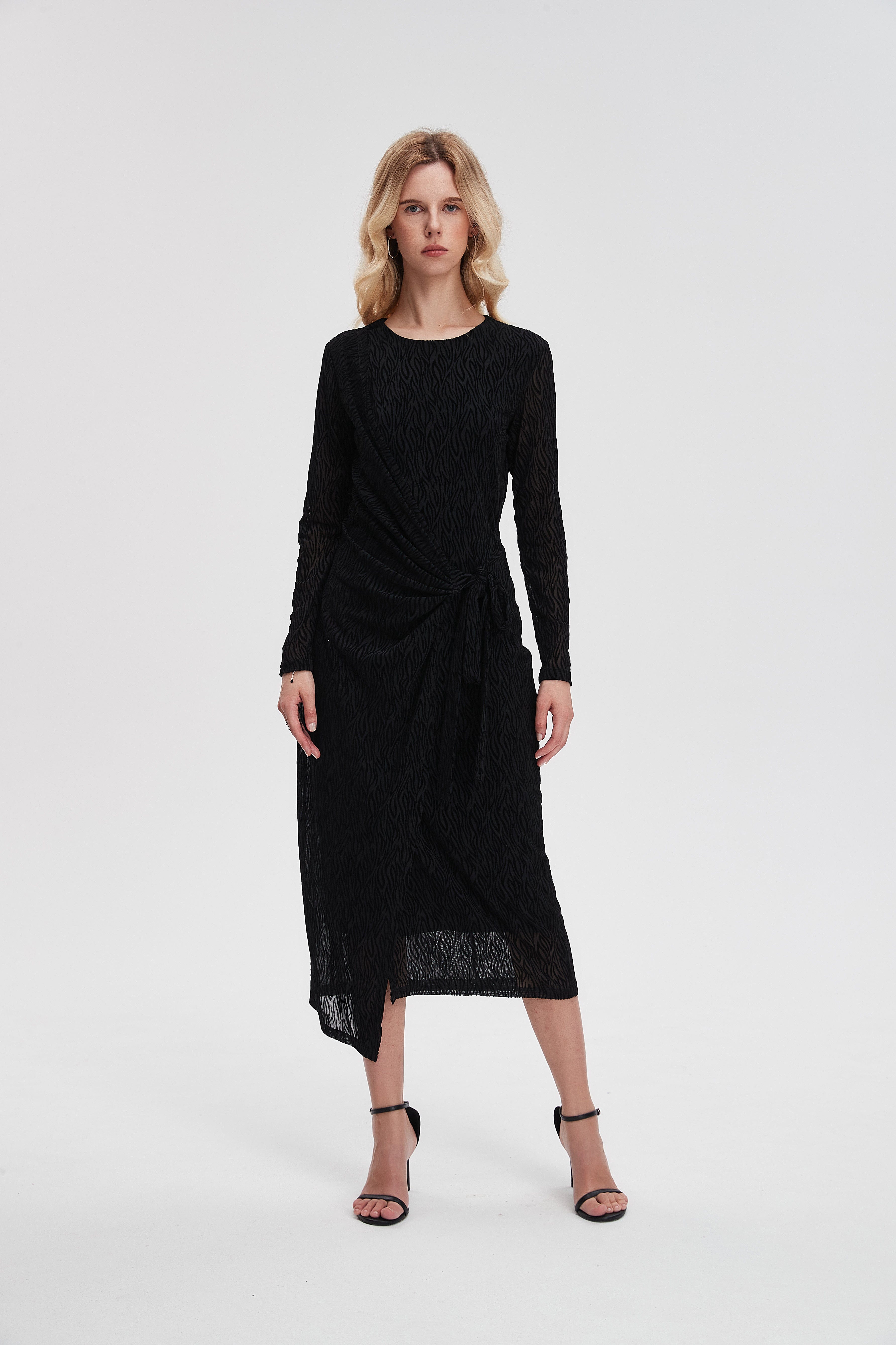 فستان ميدي بأكمام طويله بربطه من الخصر
