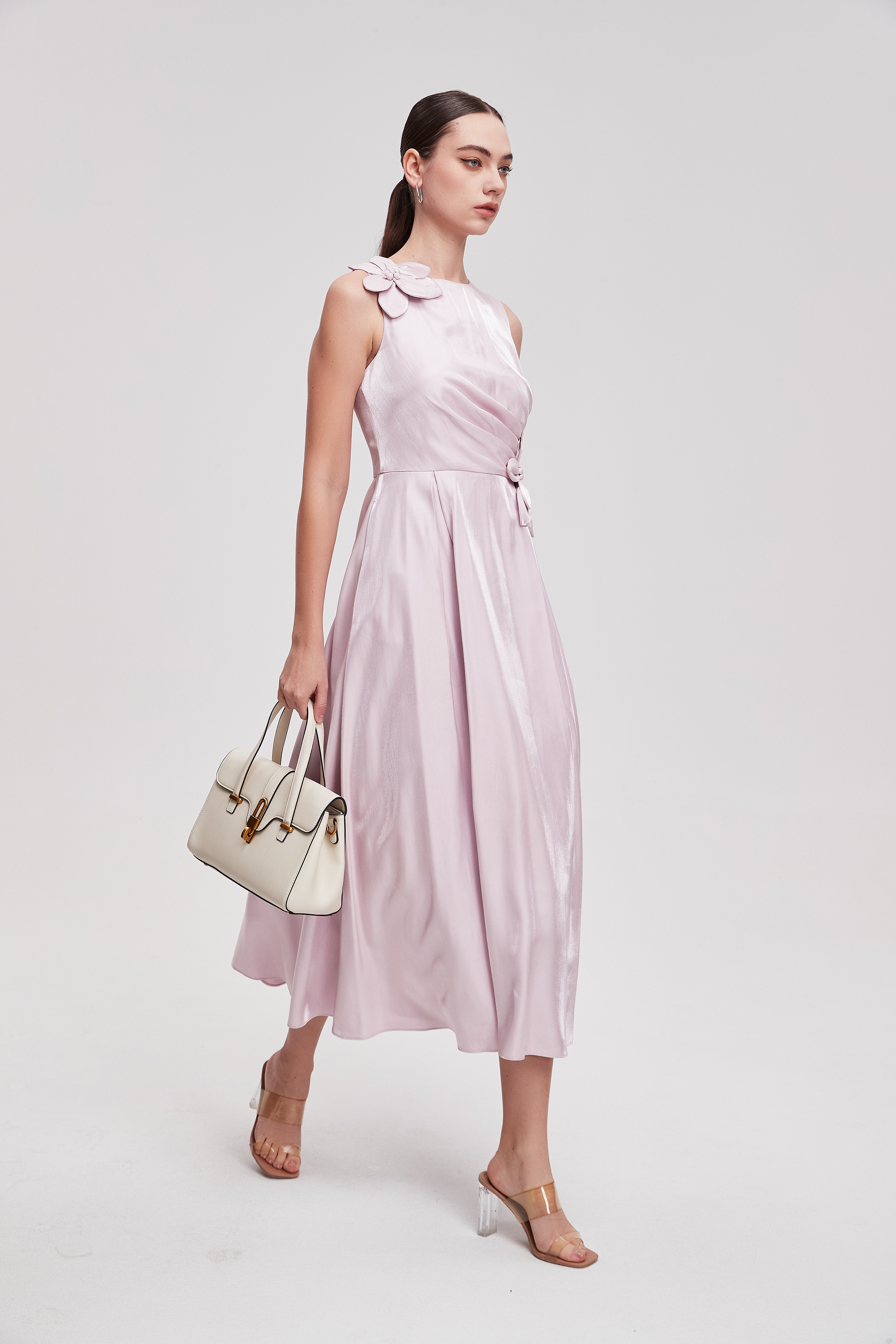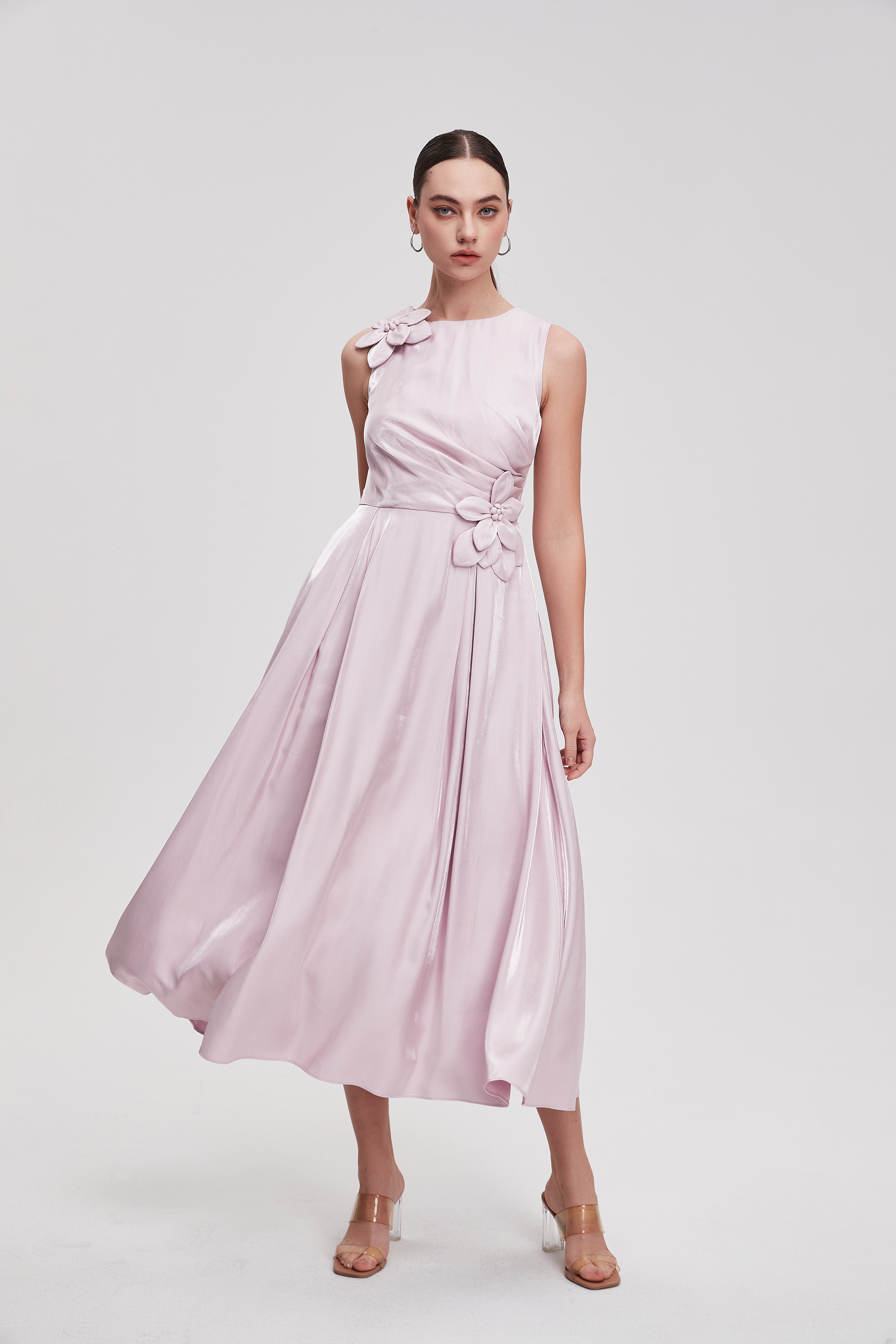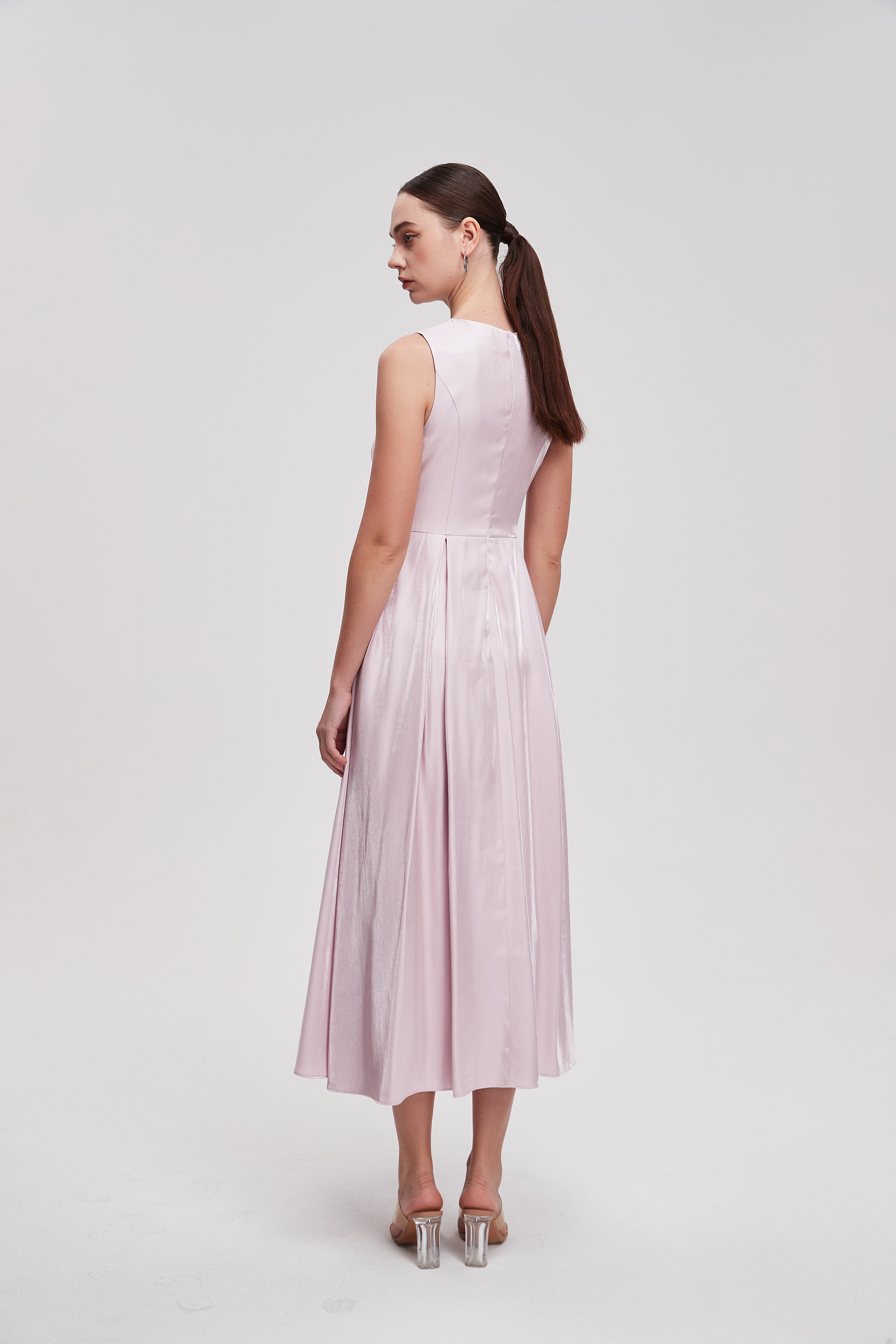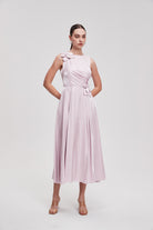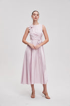 فستان ميدي سادة بدون أكمام بوردة على الخصر